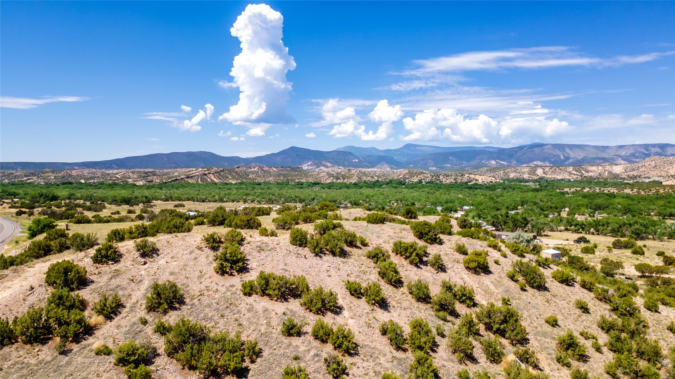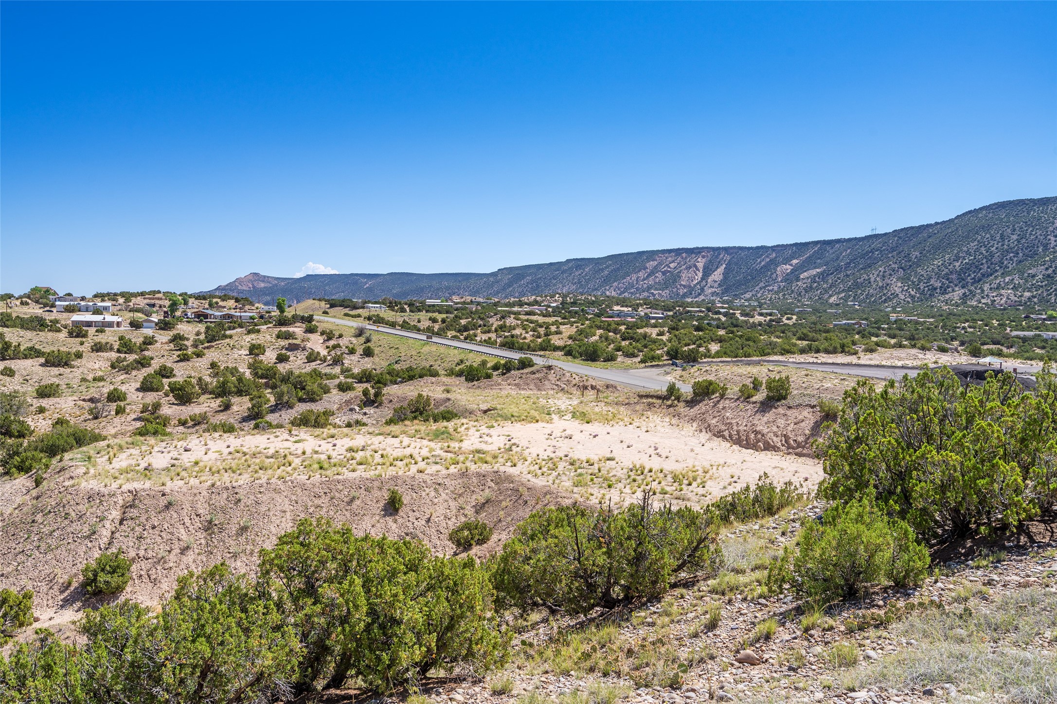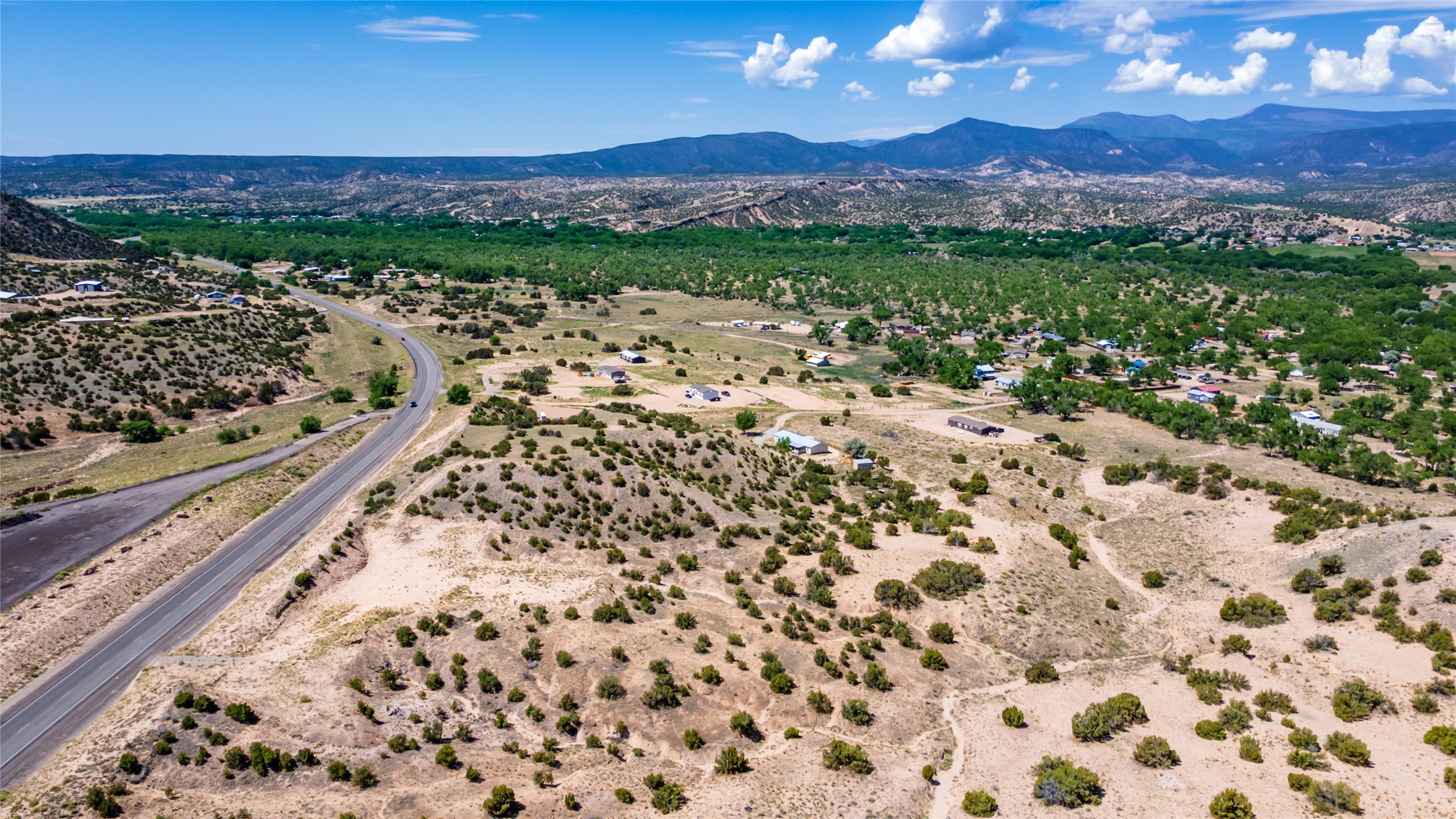 Amazing views without having a bumpy, out of the way trek up a mountain. This kind of opportunity doesn't come very often. Build your dream home, wake up to spectacular sights over the valley, but still have access directly off highway 285, and still feel secluded because of the hills on either side of the entrance which give buffers between home and highway. Perfection! The higher area has already been flattened in preparation for building. This point overlooks arroyos, valleys. and mountain formations. Electricity isn't very far away. Access directly off 285 will make other utilities easier to bring in as well. Not a far commute to Los Alamos. Two lots being sold together for a total of 3.93 acres.