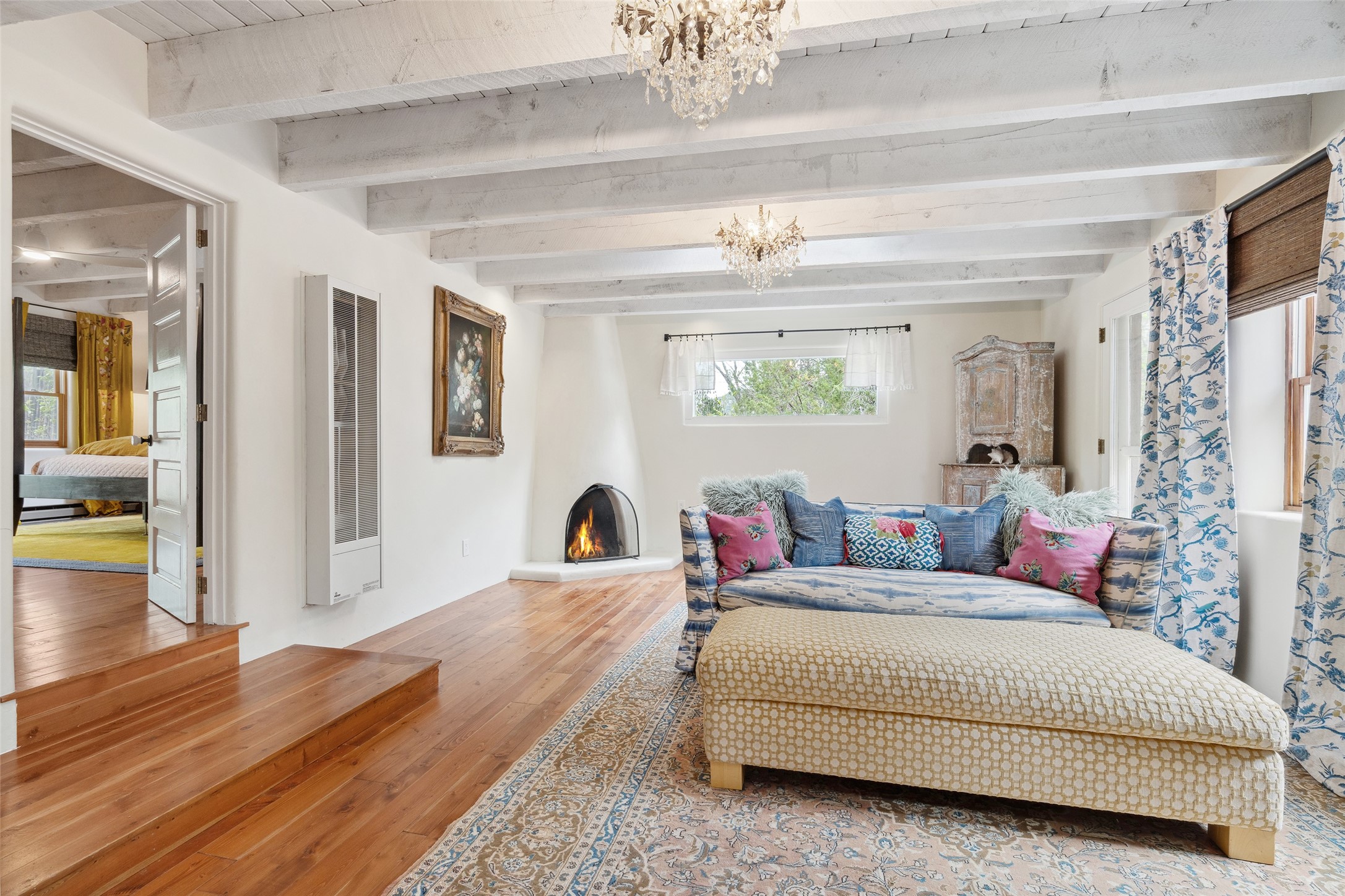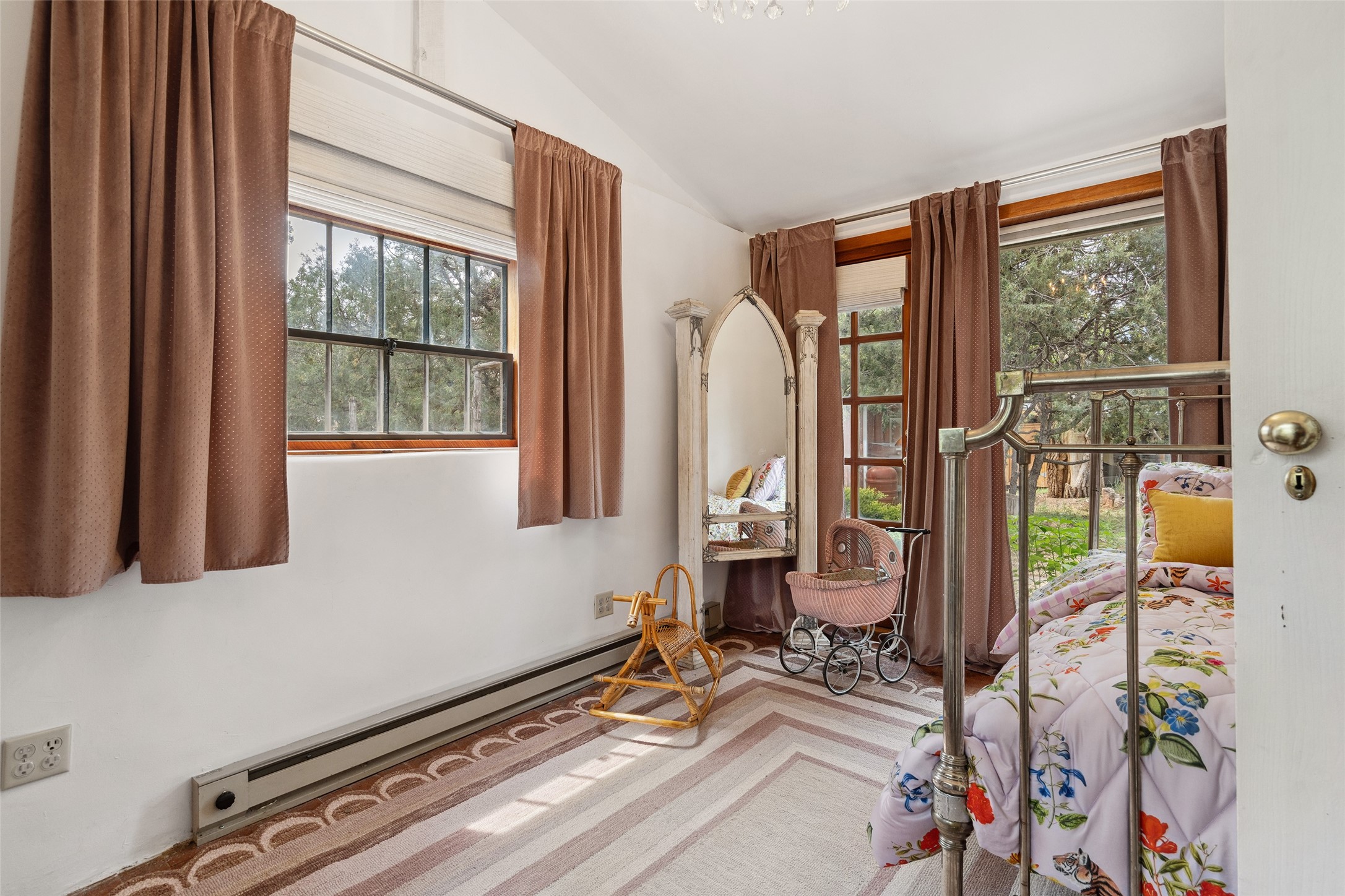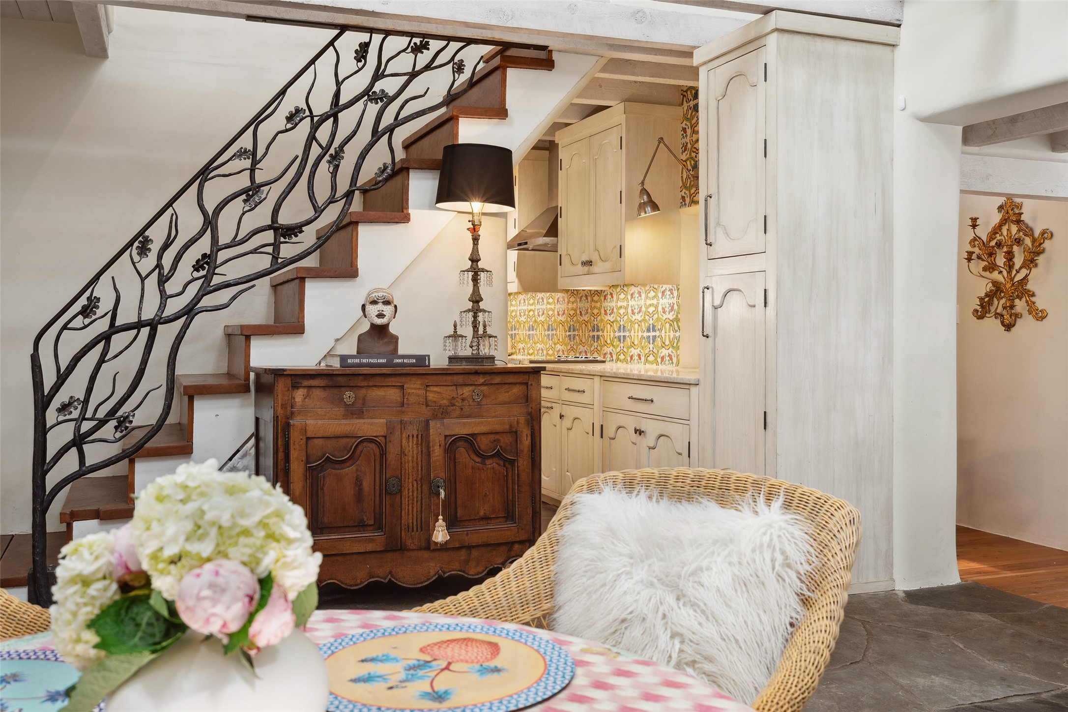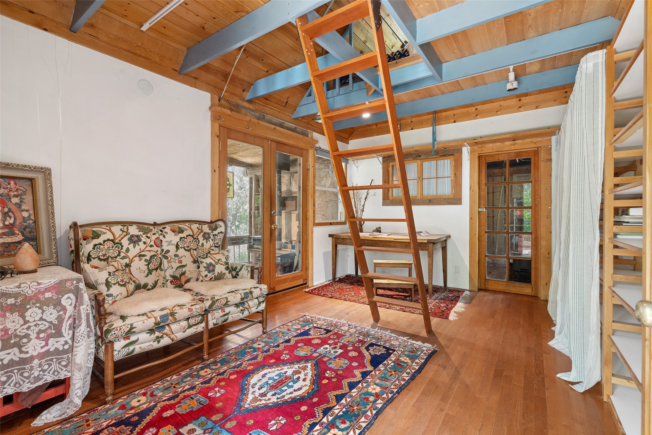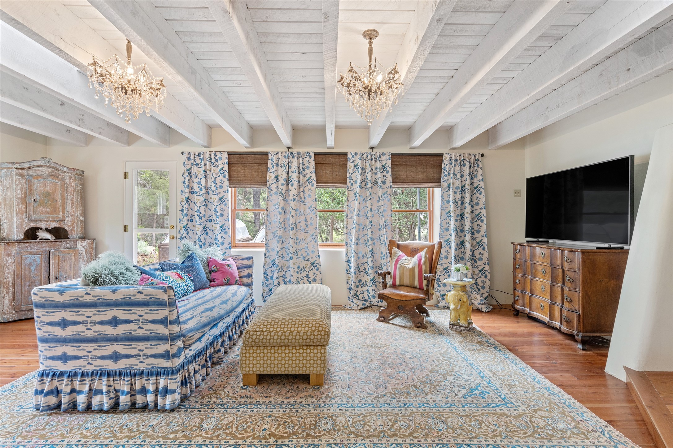 Nature-lover's paradise on 6 Acres- Tucked beneath red rock hills--Cross the bridge from Sibley Road and enter your private sanctuary nestled on six acres of lush, mature land in the serene community of Caoncito. This one-of-a-kind property features a thoughtfully updated three-bedroom, two-bathroom adobe and frame main house that blends timeless charm with modern luxury. Highlights include fully renovated luxury bathrooms and a gourmet kitchen with artisan tile, locally crafted ironwork throughout, and new sustainable wood floors. The home showcases diamond finish plaster and low-VOC finishes, ensuring both beauty and environmental consciousness. The hand-built guest house, perfect for visitors, rental income, or a creative studio, includes a cozy bedroom, bath, kitchenette, and a loft. Attached is a greenhouse for year-round gardening. Outdoors, you'll find a detached carport/shop featuring stonework sourced from the nearby Glorieta Mesa, which doubles as an open-air workspace or additional storage. A traditional underground kiva structure provides a private ceremonial space.The grounds are a horticultural haven with old-growth cottonwoods, pions, and raised garden beds. A private well adds to the property's potential for self-sufficient living. Whether you're a homesteader, gardener, artist, or seeking a peaceful retreat, this property offers the perfect setting.Set in a classic rural NM neighborhood, the house sits on three acres fenced in with coyote fencing, providing safety and privacy. An additional three acres remain wild, with a neighborhood path leading you to public hiking trails and sunset views. Located just 25 minutes from downtown Santa Fe, this tranquil retreat offers the best of both worlds: a private haven with access to the vibrant city. With its artisanal remodel and high desert landscape, this property is an extraordinary opportunity for those seeking comfort, luxury, and self-sufficient living.