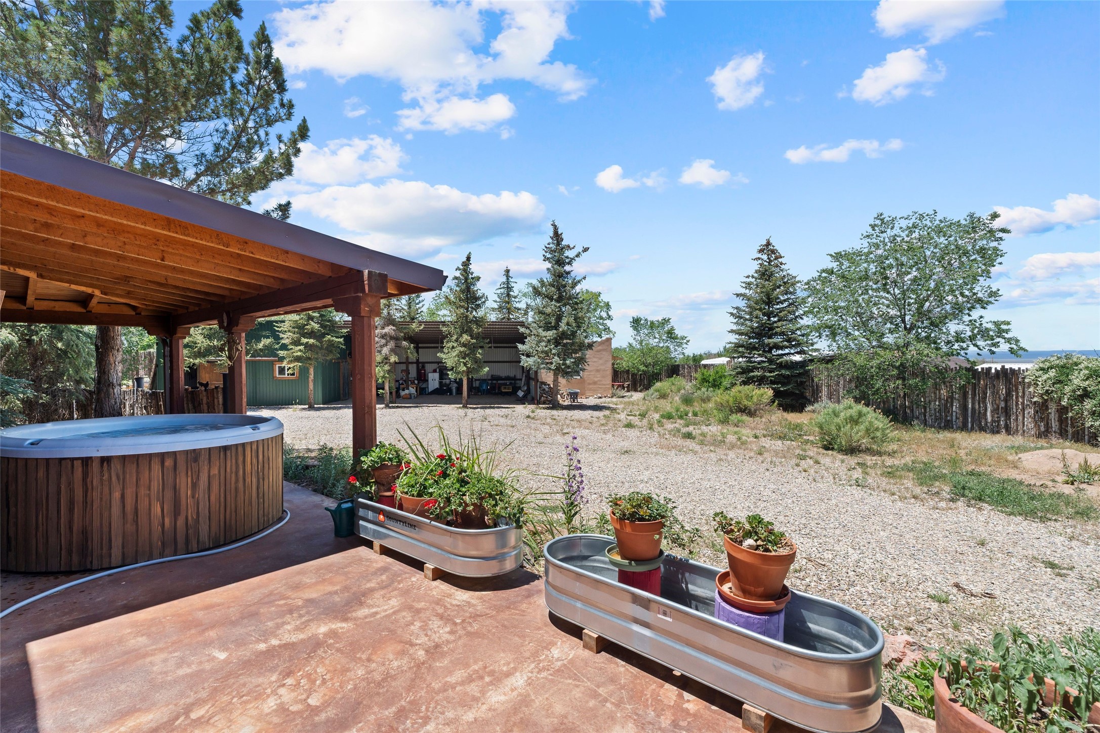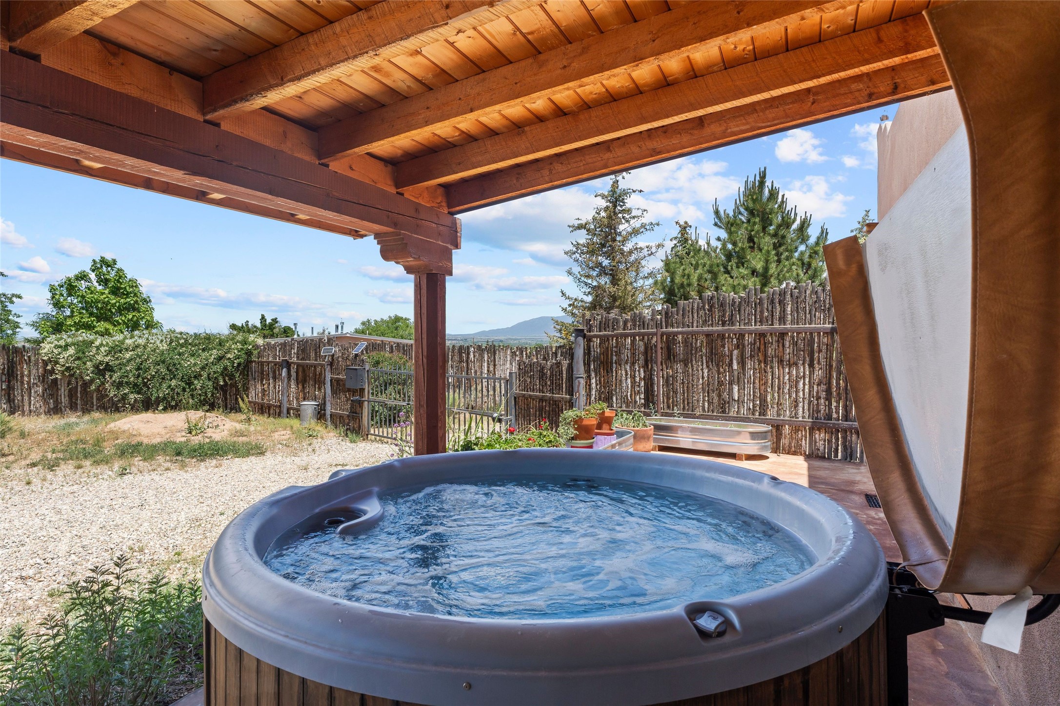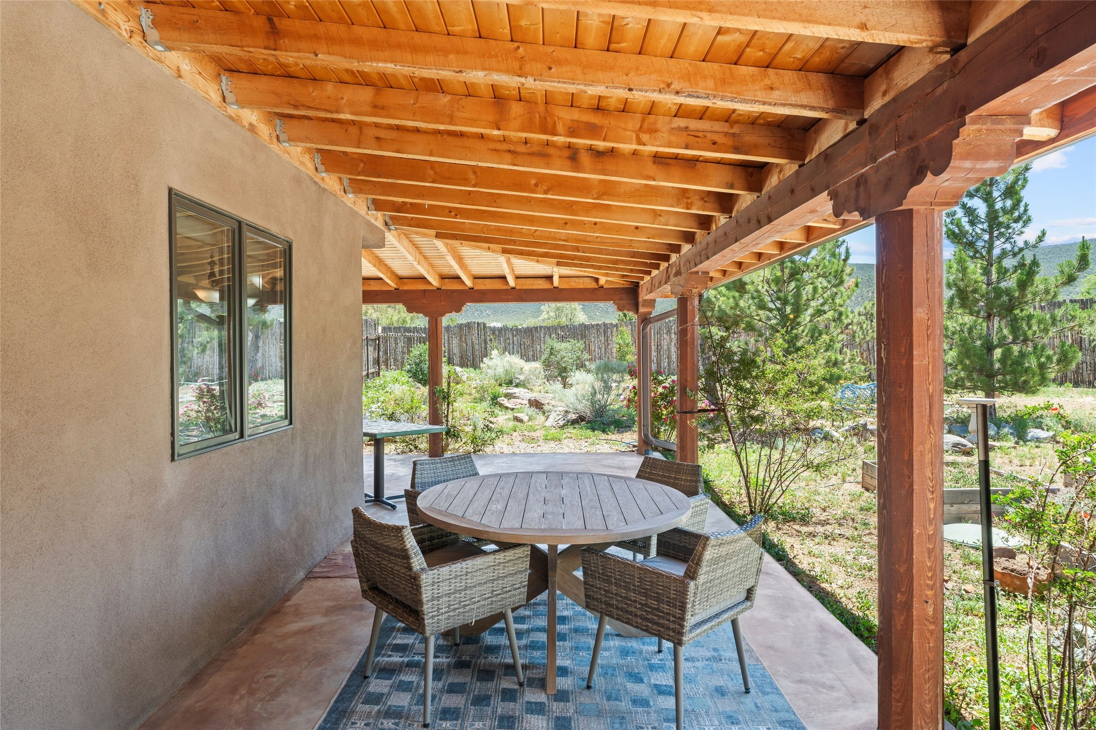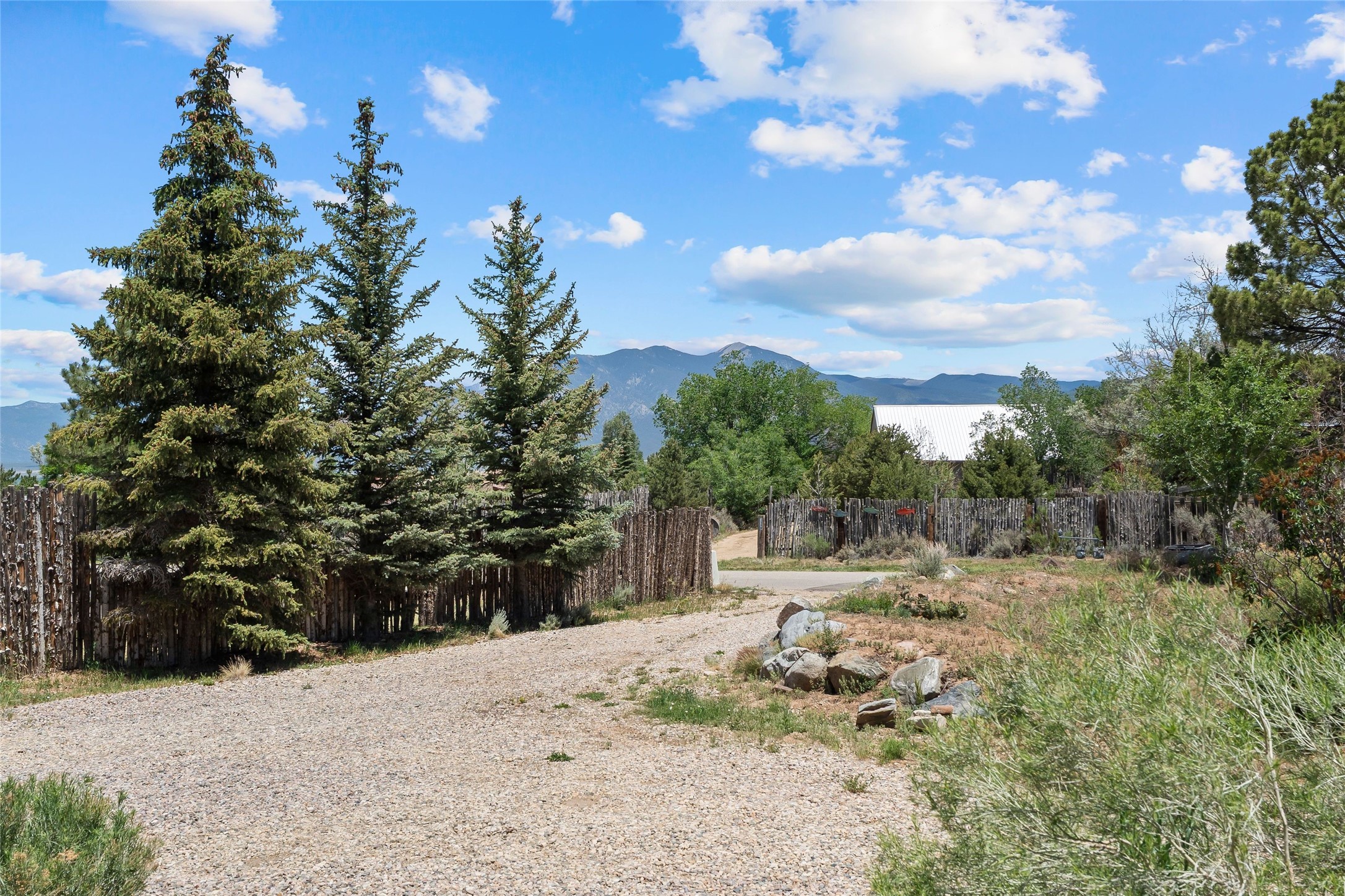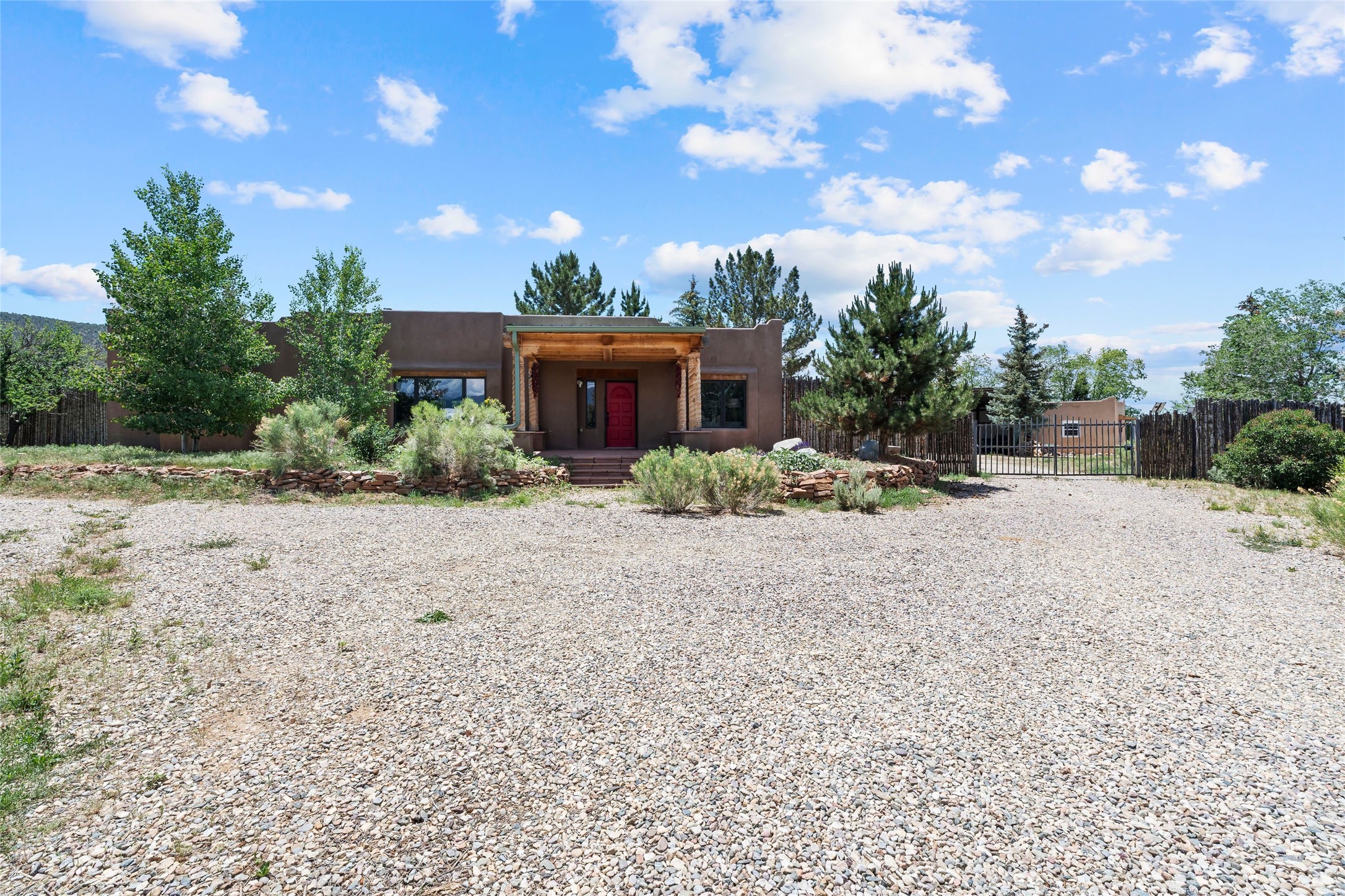 Here's the beautiful setting and property you've been looking for in Taos! An acre with great views and lots of big trees affords wonderful outdoor living, and there's a fabulous huge portal wrapping around the home. The residence is full of charm, light and bright with a very comfortable open floor plan, and the colorfully updated kitchen and bathrooms are quite appealing. The portal offers plenty of space for seating and dining, and it includes your own home spa with a new hot tub and large Finnleo sauna. The bonus is an outbuilding with a big six-car carport, plus two nice workshops, and a small storage/studio area. About three quarters of the lot is enclosed with coyote fencing and an electronically-controlled gate. The property is just a short distance to lots of hiking, biking, or horseback riding trails in the national forest. It's a convenient location close-in, yet with a lovely rural feeling, and the views of Taos Mountain and the Sangre de Cristo foothills are gorgeous!