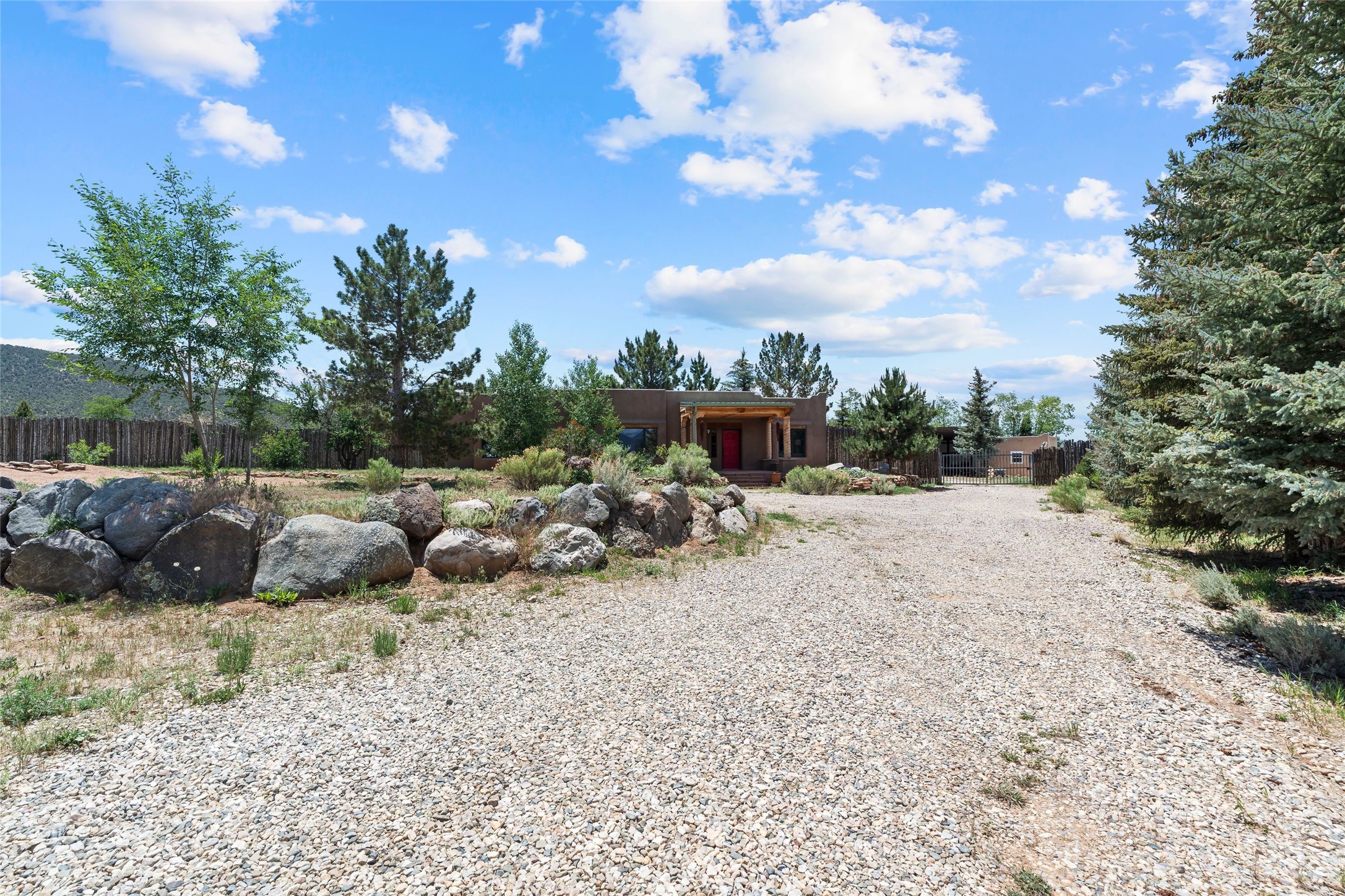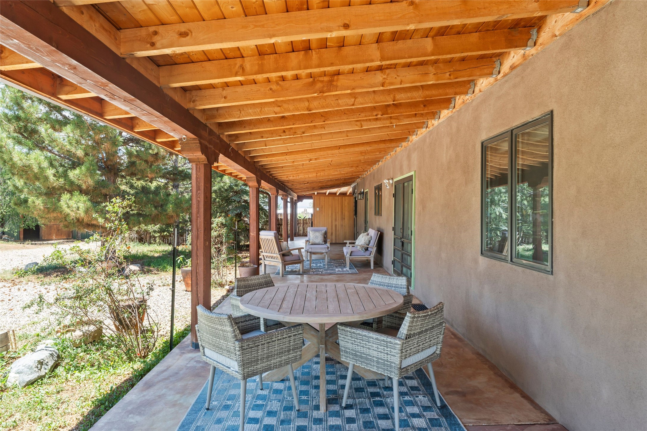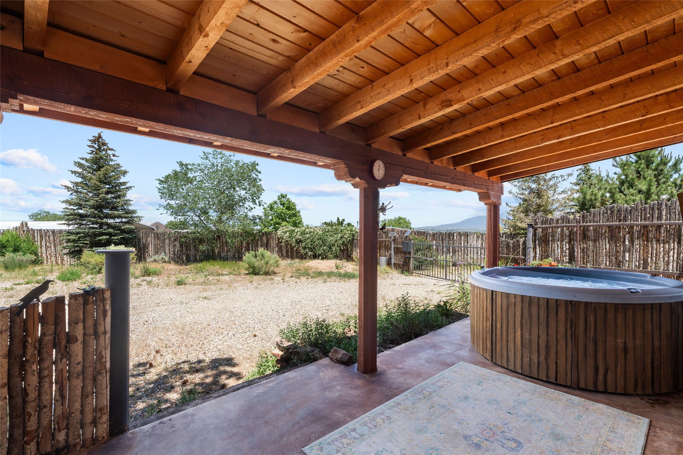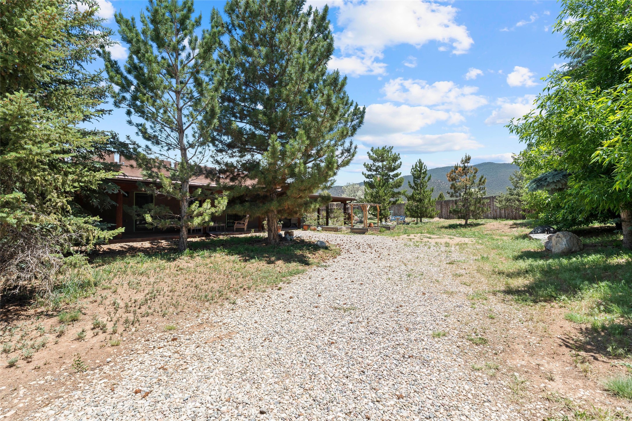 Here's the beautiful setting and property you've been looking for in Taos! An acre with great views and lots of big trees affords wonderful outdoor living, and there's a fabulous huge portal wrapping around the home. The residence is full of charm, light and bright with a very comfortable open floor plan, and the colorfully updated kitchen and bathrooms are quite appealing. The portal offers plenty of space for seating and dining, and it includes your own home spa with a new hot tub and large Finnleo sauna. The bonus is an outbuilding with a big six-car carport, plus two nice workshops, and a small storage/studio area. About three quarters of the lot is enclosed with coyote fencing and an electronically-controlled gate. The property is just a short distance to lots of hiking, biking, or horseback riding trails in the national forest. It's a convenient location close-in, yet with a lovely rural feeling, and the views of Taos Mountain and the Sangre de Cristo foothills are gorgeous!