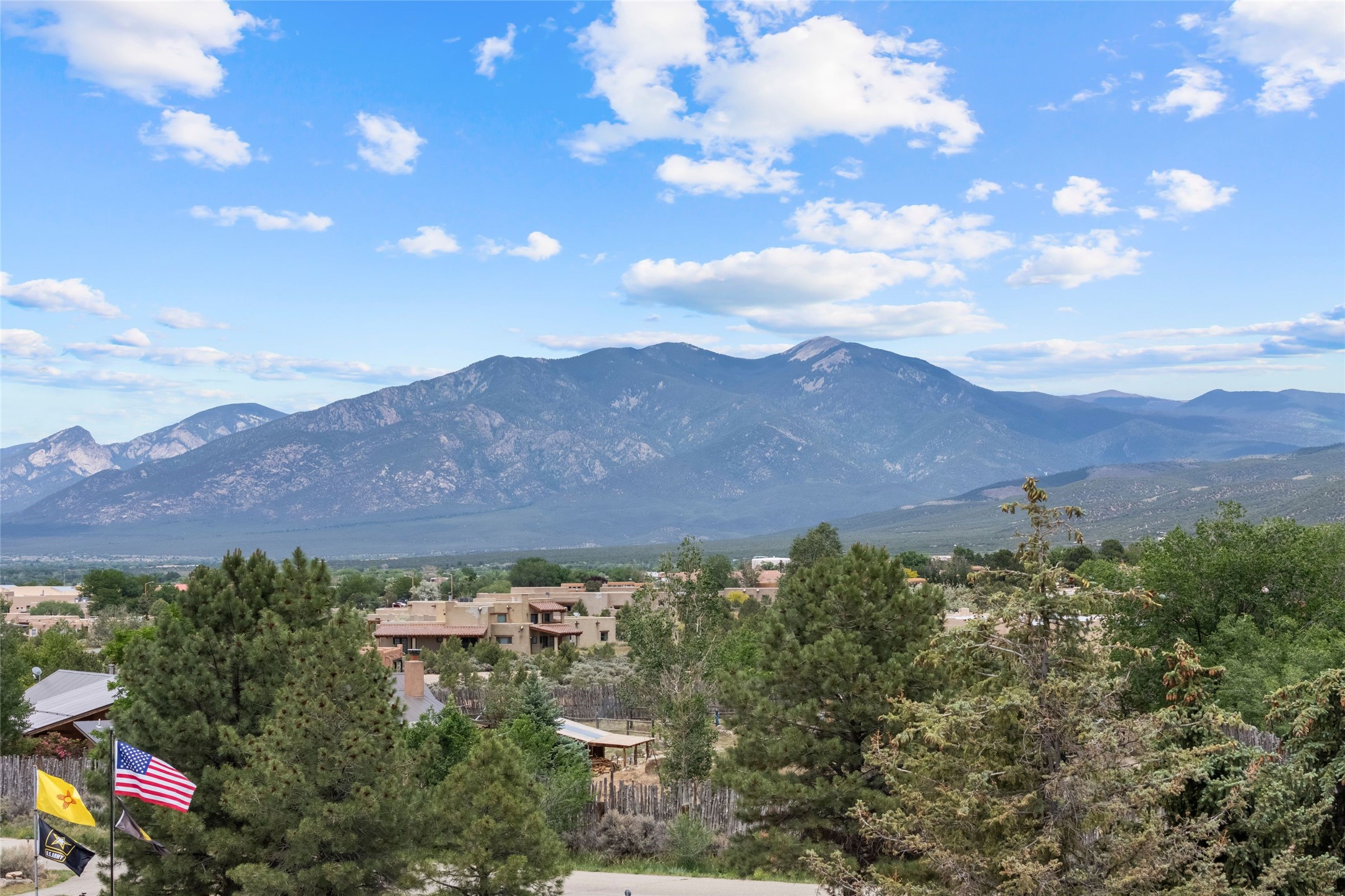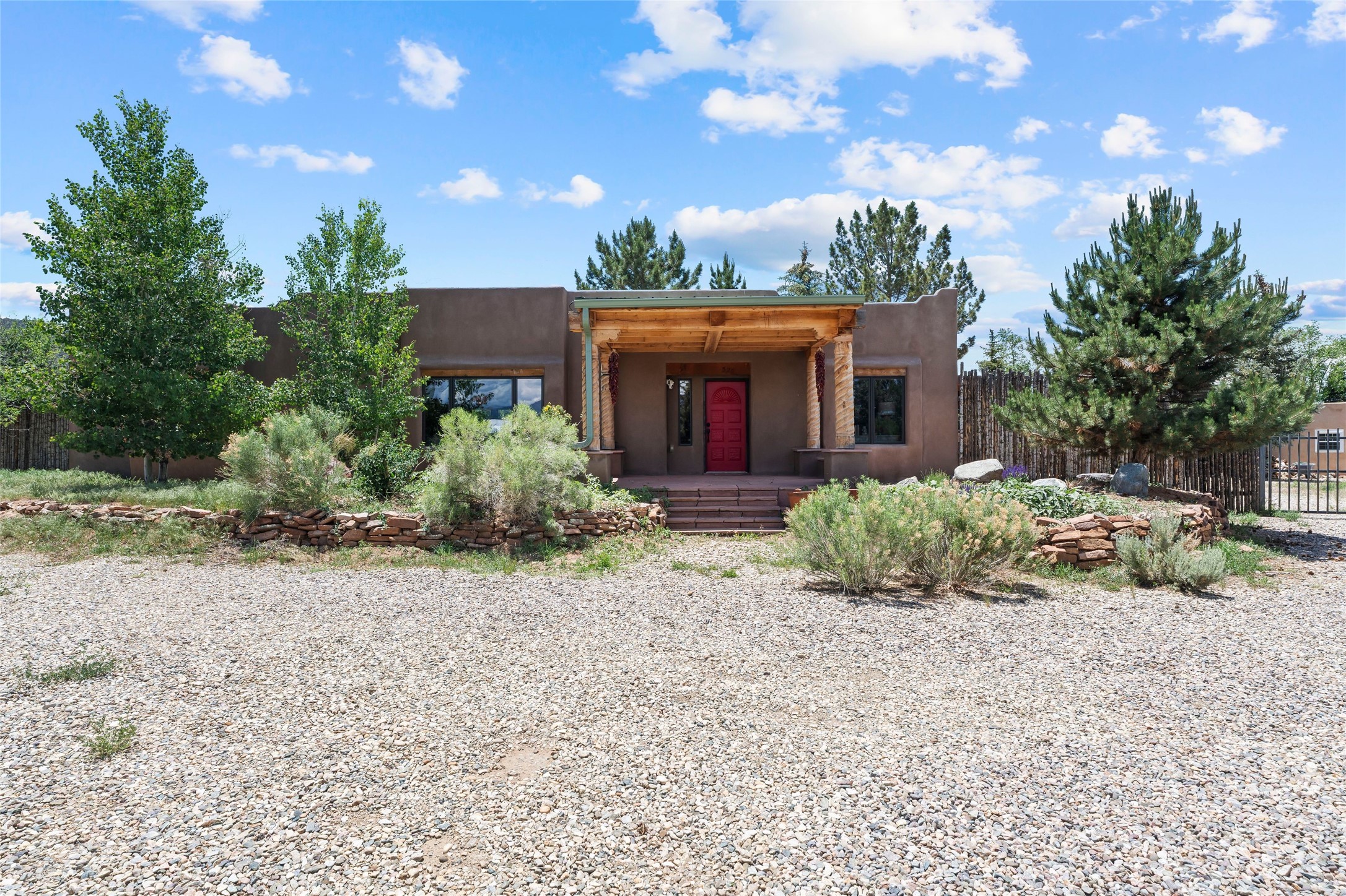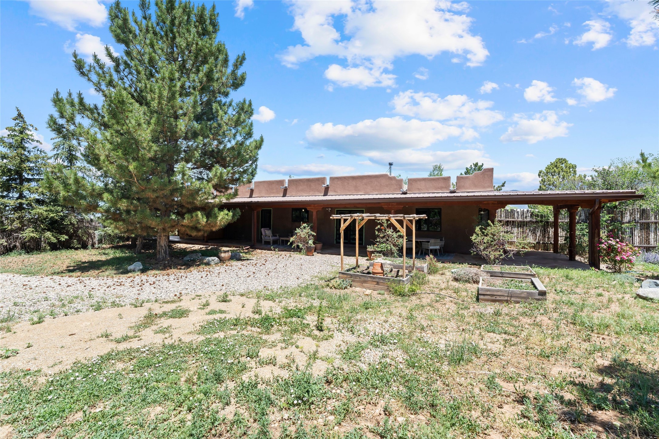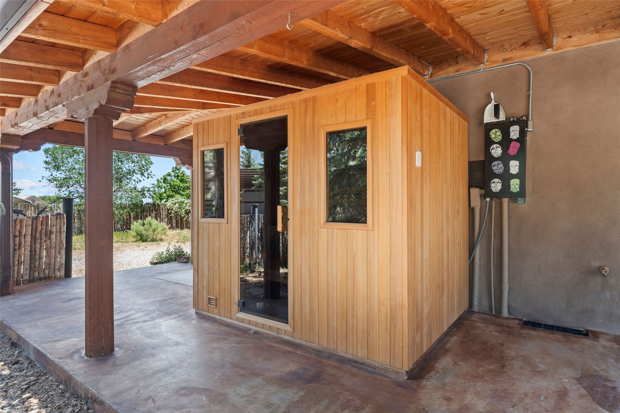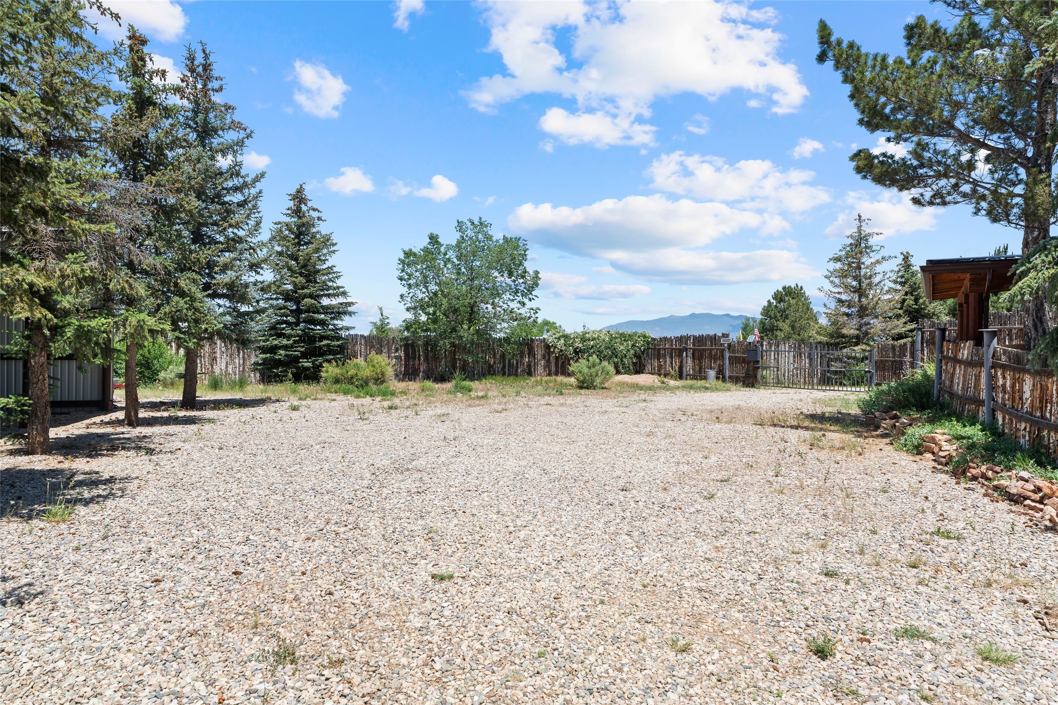 Here's the beautiful setting and property you've been looking for in Taos! An acre with great views and lots of big trees affords wonderful outdoor living, and there's a fabulous huge portal wrapping around the home. The residence is full of charm, light and bright with a very comfortable open floor plan, and the colorfully updated kitchen and bathrooms are quite appealing. The portal offers plenty of space for seating and dining, and it includes your own home spa with a new hot tub and large Finnleo sauna. The bonus is an outbuilding with a big six-car carport, plus two nice workshops, and a small storage/studio area. About three quarters of the lot is enclosed with coyote fencing and an electronically-controlled gate. The property is just a short distance to lots of hiking, biking, or horseback riding trails in the national forest. It's a convenient location close-in, yet with a lovely rural feeling, and the views of Taos Mountain and the Sangre de Cristo foothills are gorgeous!