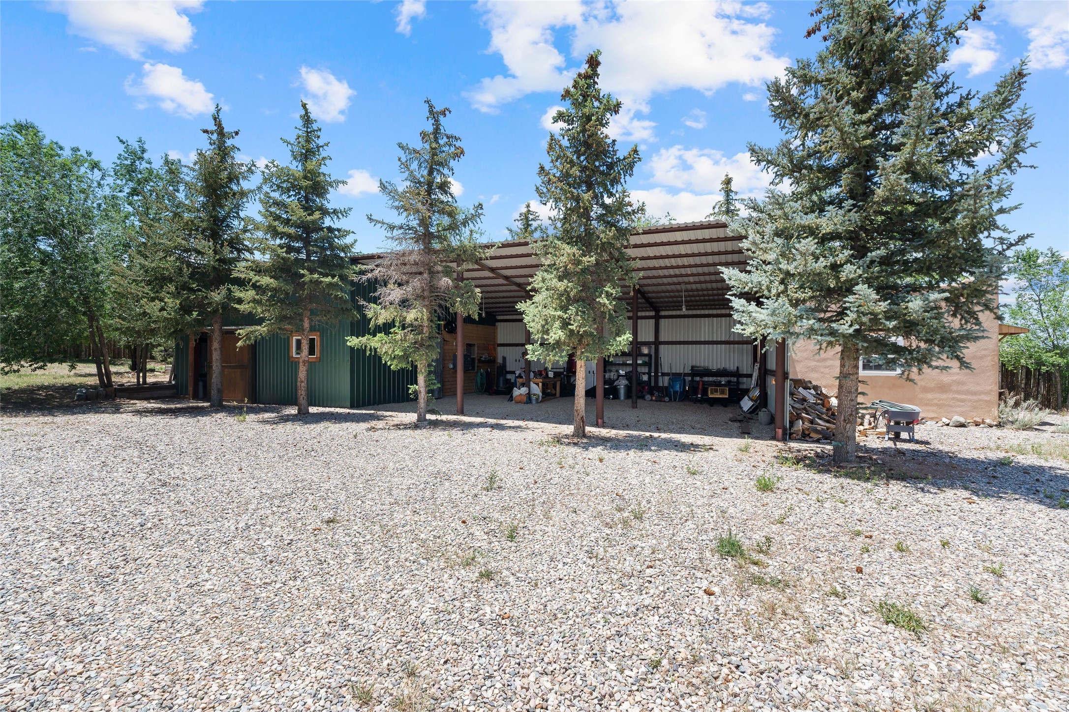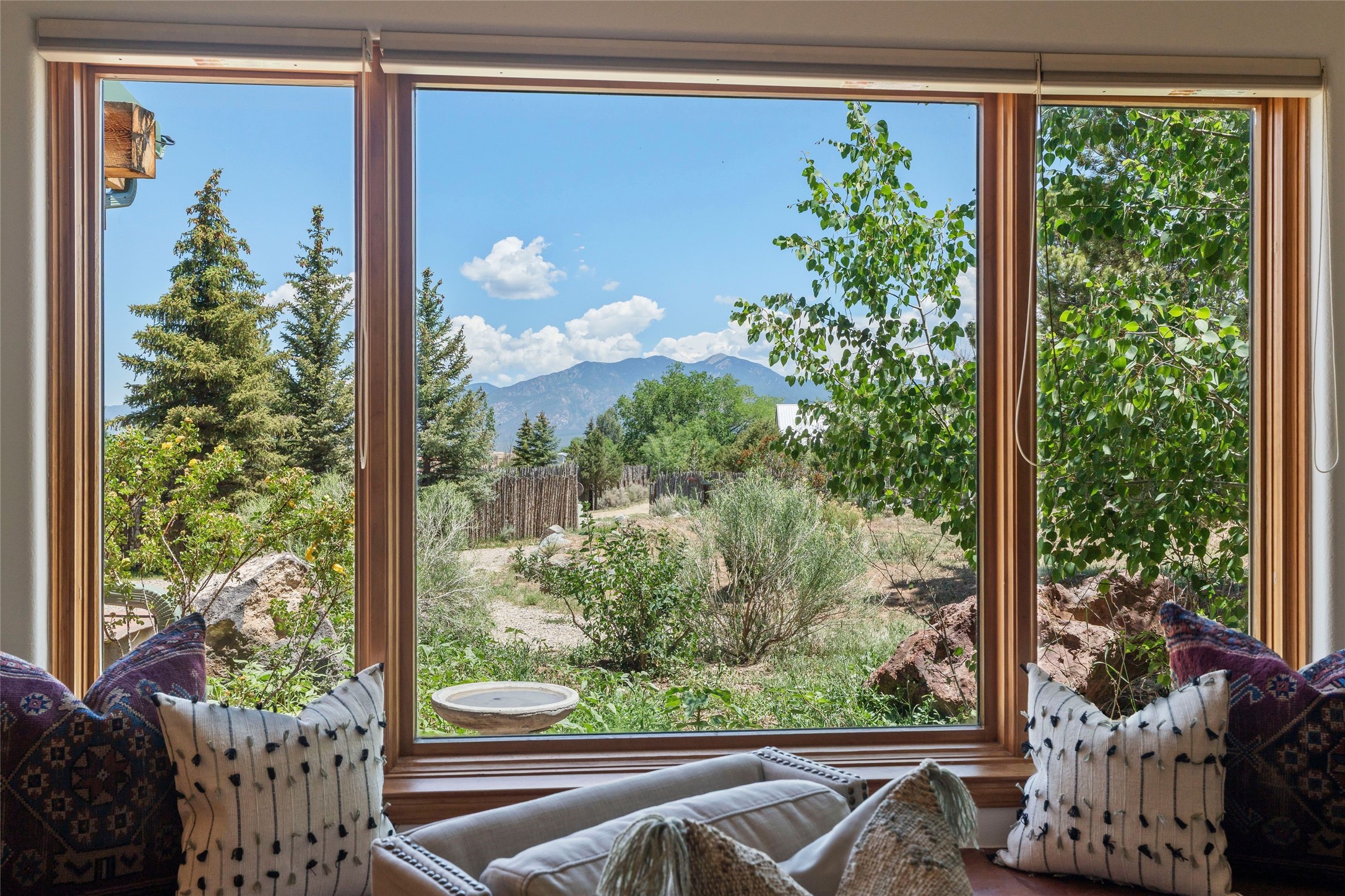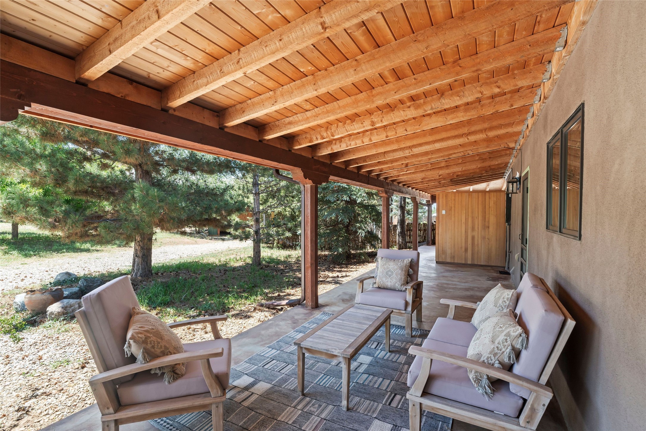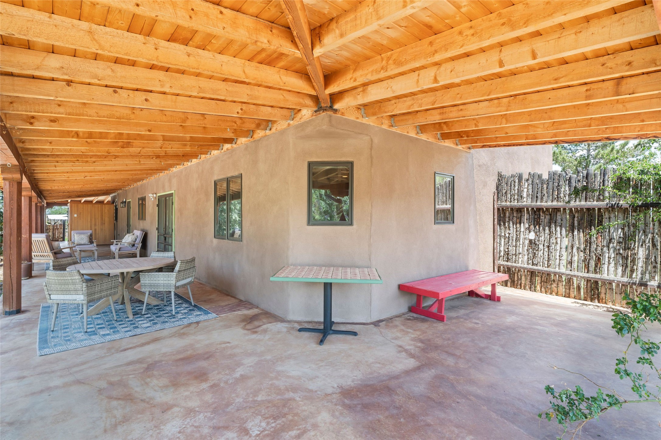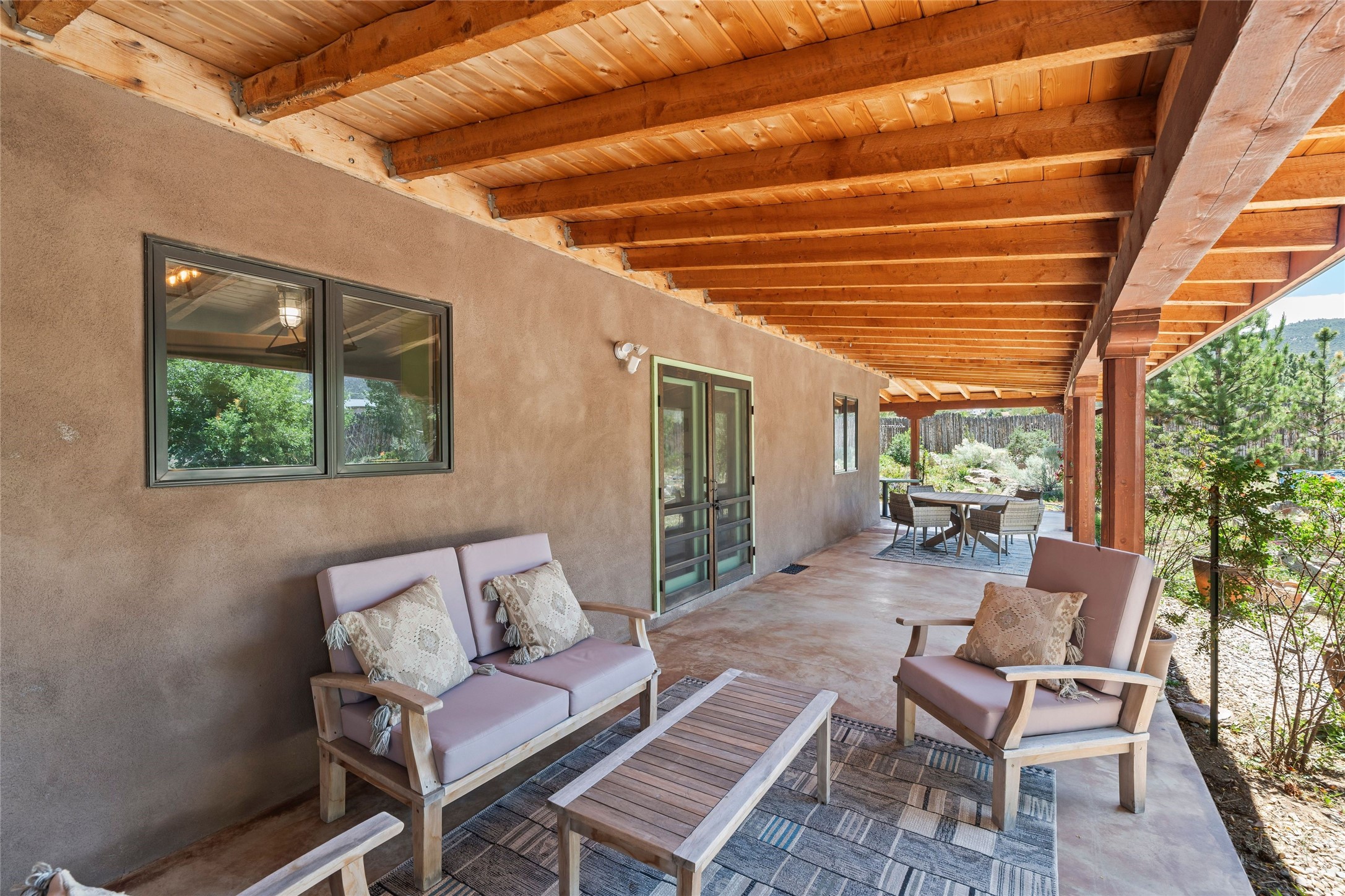 Here's the beautiful setting and property you've been looking for in Taos! An acre with great views and lots of big trees affords wonderful outdoor living, and there's a fabulous huge portal wrapping around the home. The residence is full of charm, light and bright with a very comfortable open floor plan, and the colorfully updated kitchen and bathrooms are quite appealing. The portal offers plenty of space for seating and dining, and it includes your own home spa with a new hot tub and large Finnleo sauna. The bonus is an outbuilding with a big six-car carport, plus two nice workshops, and a small storage/studio area. About three quarters of the lot is enclosed with coyote fencing and an electronically-controlled gate. The property is just a short distance to lots of hiking, biking, or horseback riding trails in the national forest. It's a convenient location close-in, yet with a lovely rural feeling, and the views of Taos Mountain and the Sangre de Cristo foothills are gorgeous!