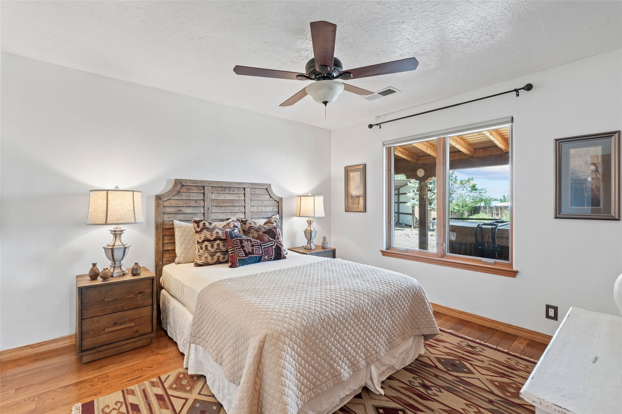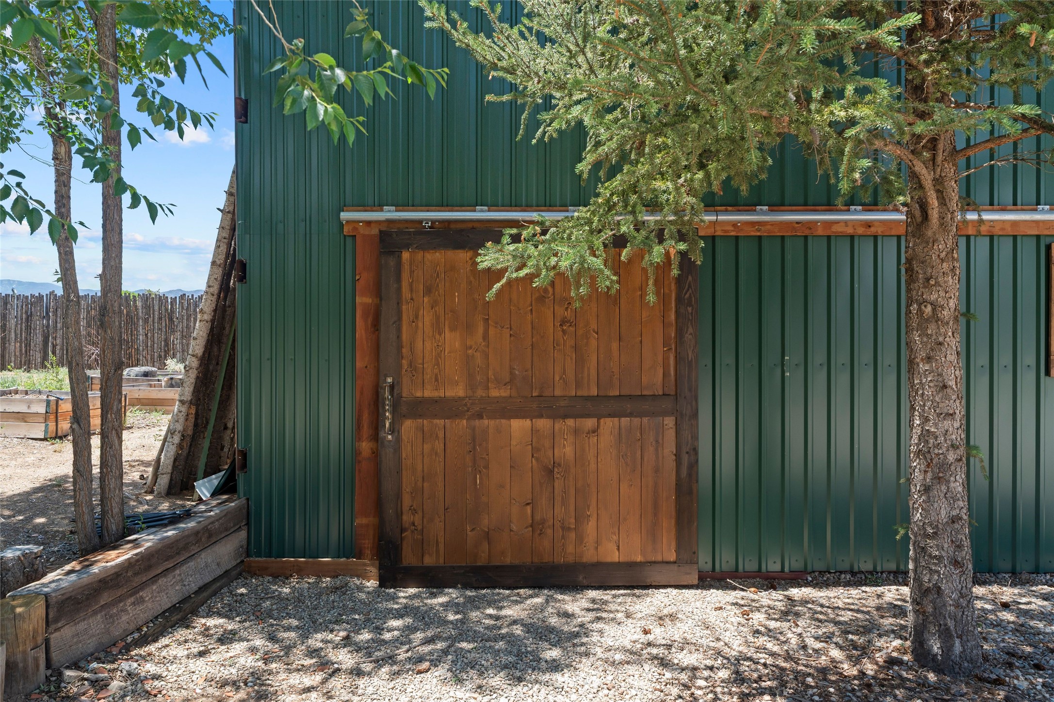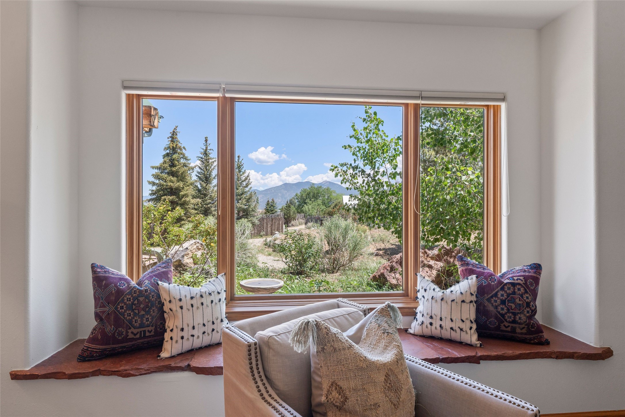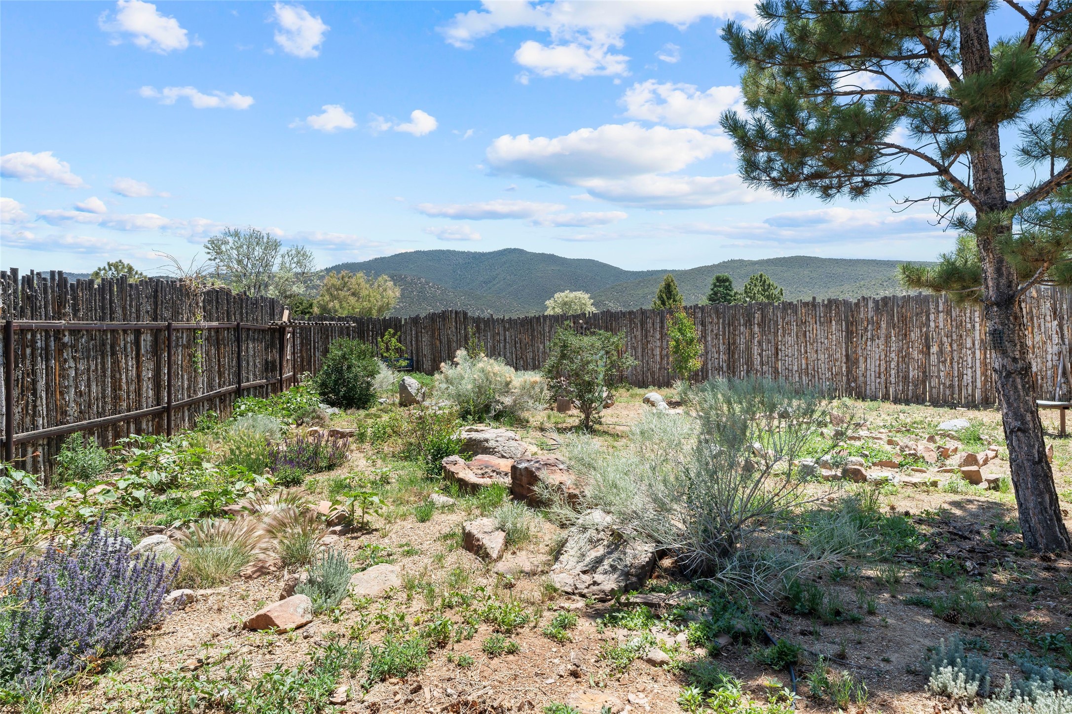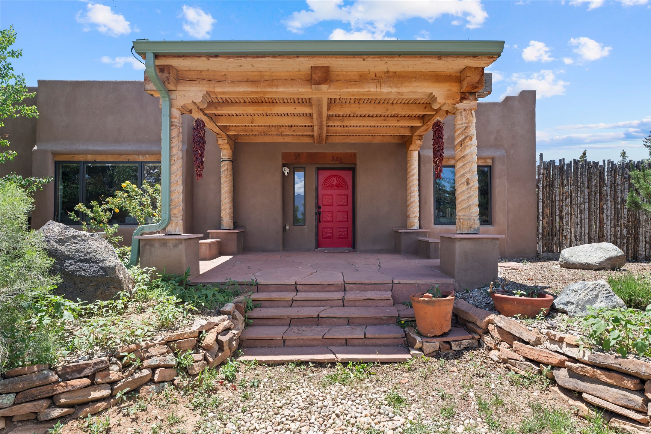 Here's the beautiful setting and property you've been looking for in Taos! An acre with great views and lots of big trees affords wonderful outdoor living, and there's a fabulous huge portal wrapping around the home. The residence is full of charm, light and bright with a very comfortable open floor plan, and the colorfully updated kitchen and bathrooms are quite appealing. The portal offers plenty of space for seating and dining, and it includes your own home spa with a new hot tub and large Finnleo sauna. The bonus is an outbuilding with a big six-car carport, plus two nice workshops, and a small storage/studio area. About three quarters of the lot is enclosed with coyote fencing and an electronically-controlled gate. The property is just a short distance to lots of hiking, biking, or horseback riding trails in the national forest. It's a convenient location close-in, yet with a lovely rural feeling, and the views of Taos Mountain and the Sangre de Cristo foothills are gorgeous!