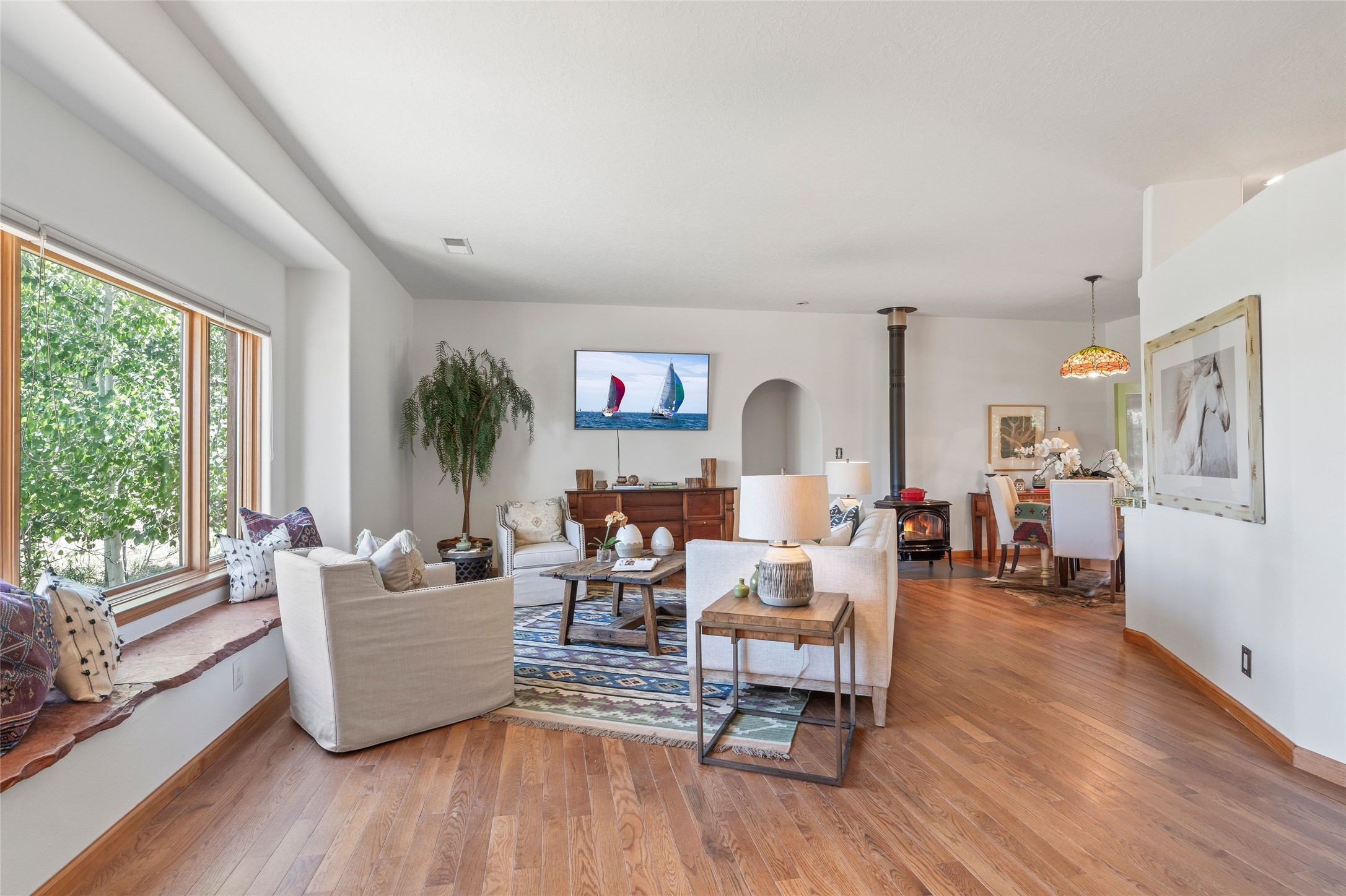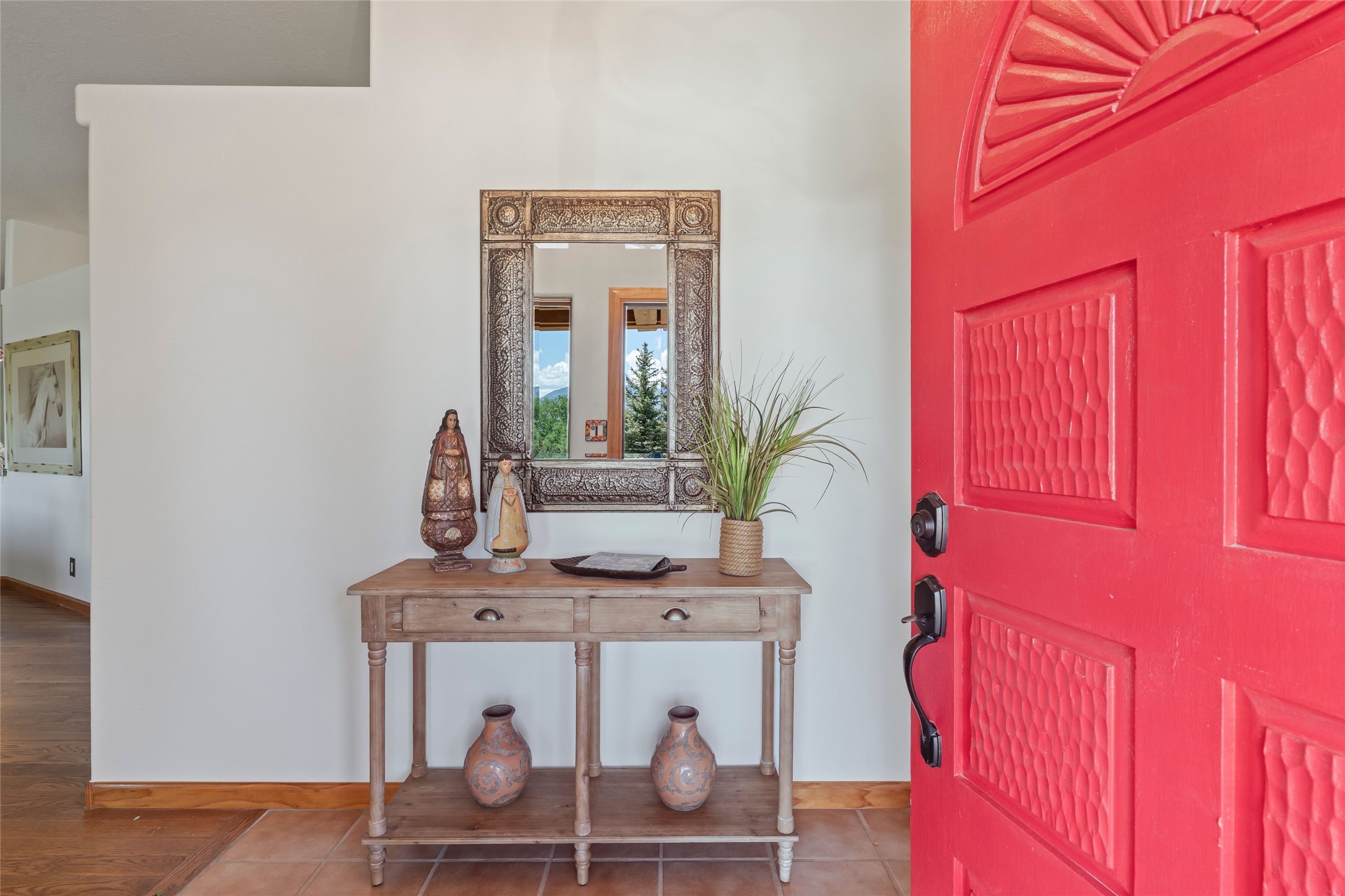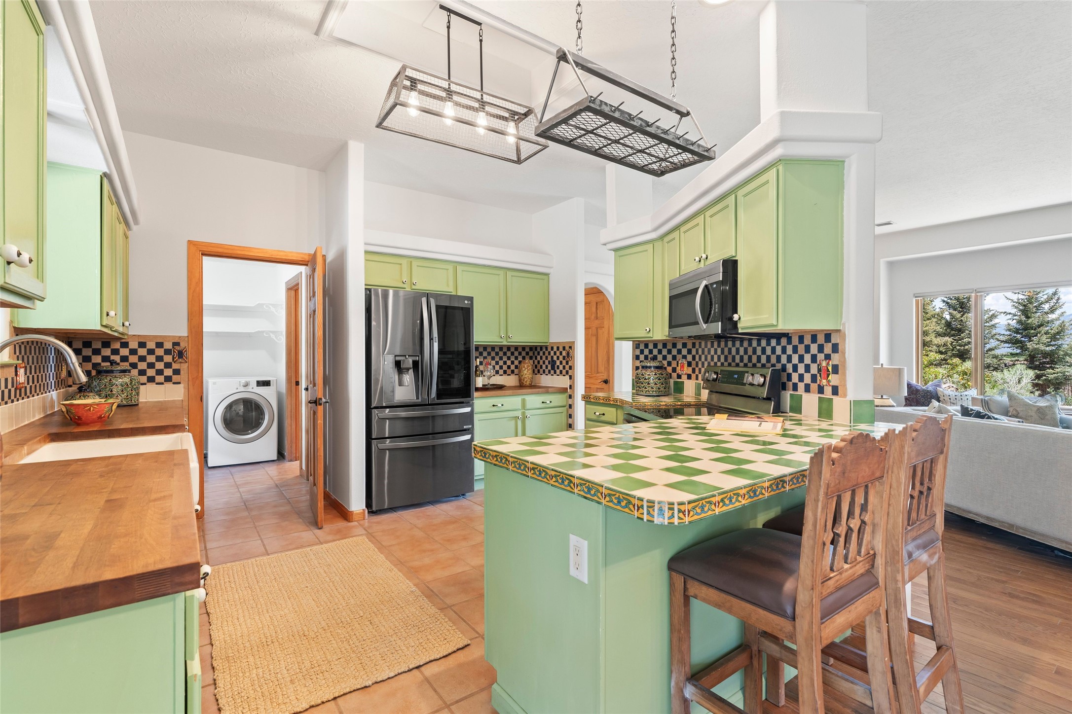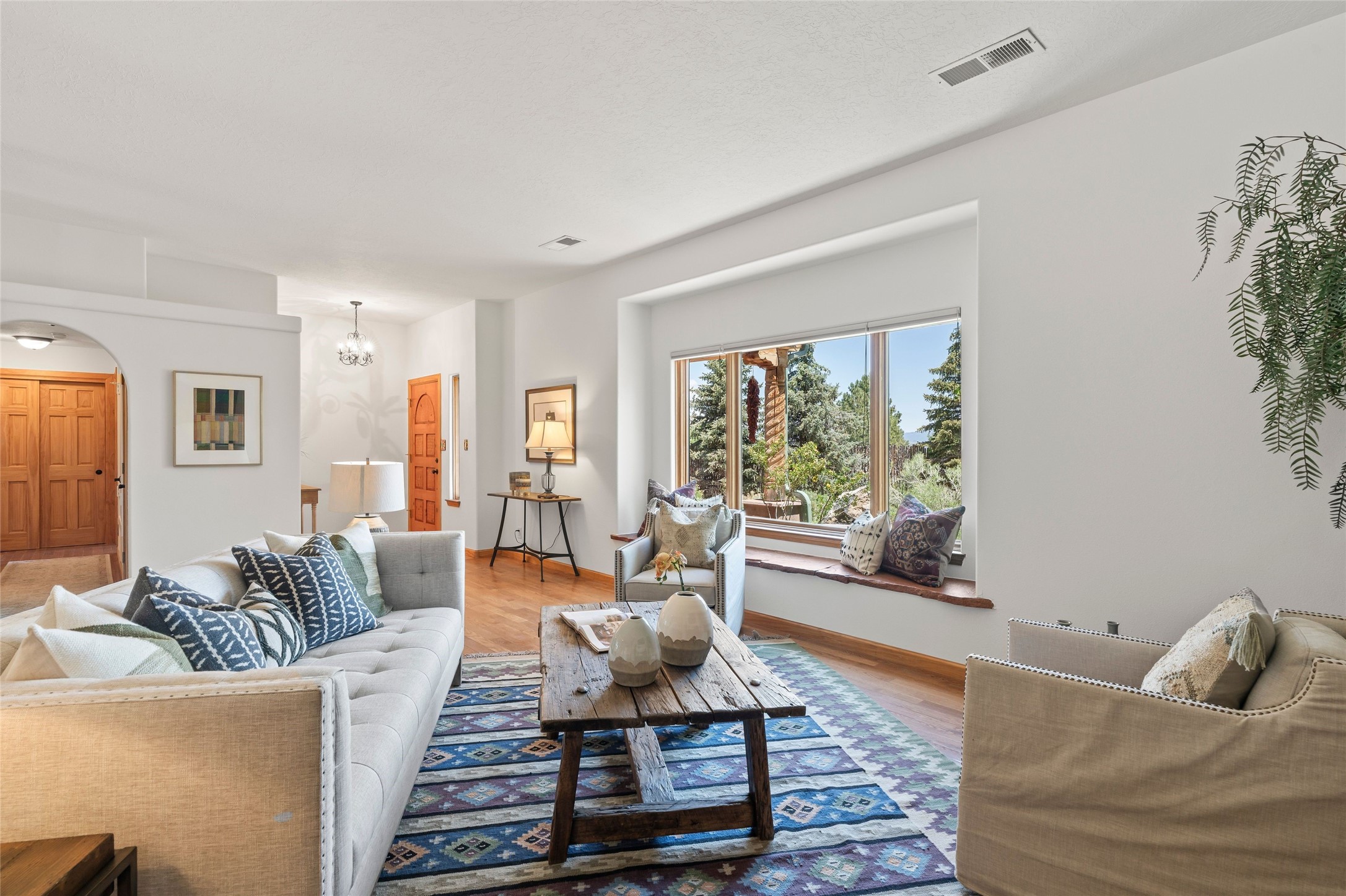 Here's the beautiful setting and property you've been looking for in Taos! An acre with great views and lots of big trees affords wonderful outdoor living, and there's a fabulous huge portal wrapping around the home. The residence is full of charm, light and bright with a very comfortable open floor plan, and the colorfully updated kitchen and bathrooms are quite appealing. The portal offers plenty of space for seating and dining, and it includes your own home spa with a new hot tub and large Finnleo sauna. The bonus is an outbuilding with a big six-car carport, plus two nice workshops, and a small storage/studio area. About three quarters of the lot is enclosed with coyote fencing and an electronically-controlled gate. The property is just a short distance to lots of hiking, biking, or horseback riding trails in the national forest. It's a convenient location close-in, yet with a lovely rural feeling, and the views of Taos Mountain and the Sangre de Cristo foothills are gorgeous!