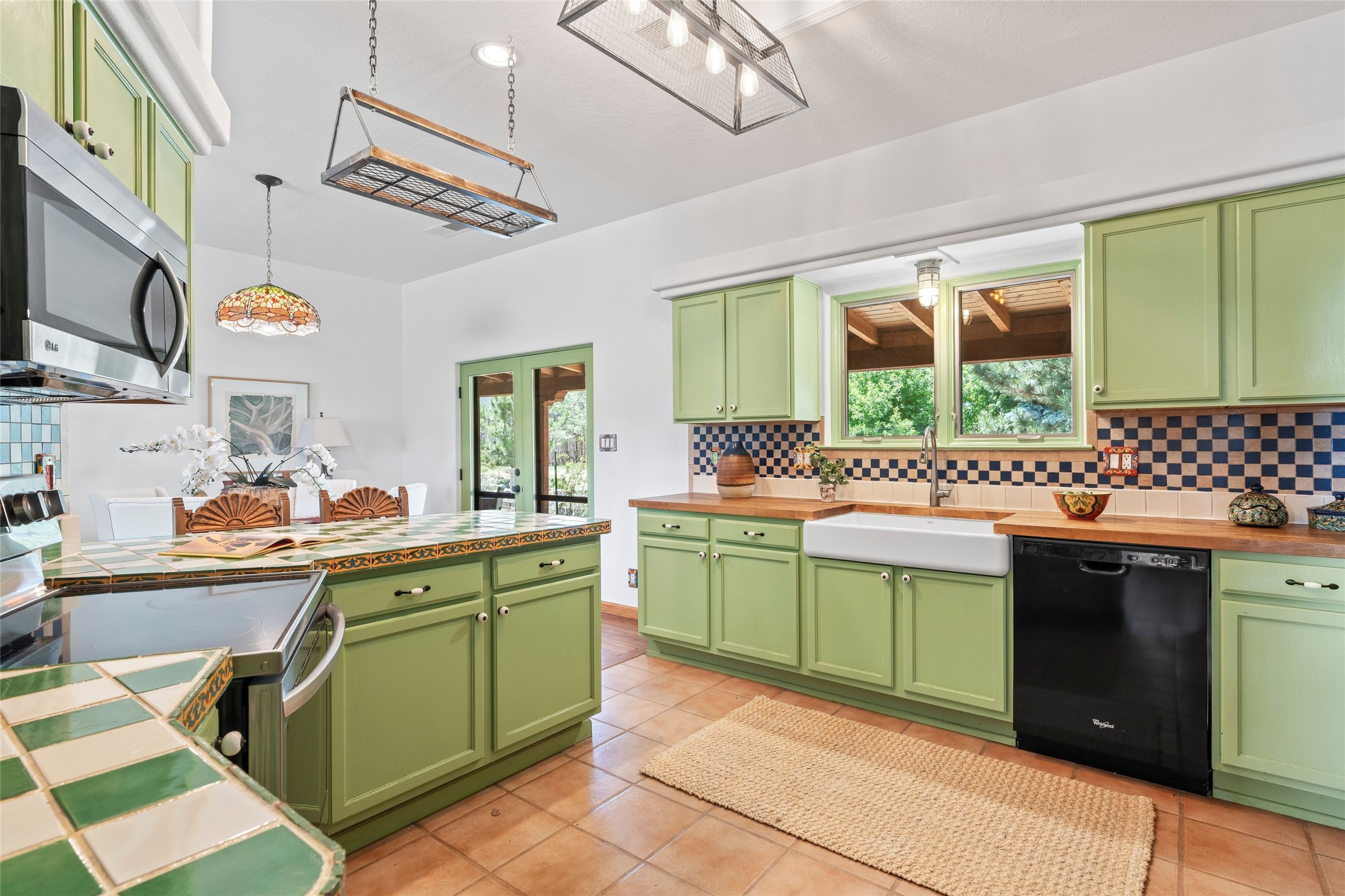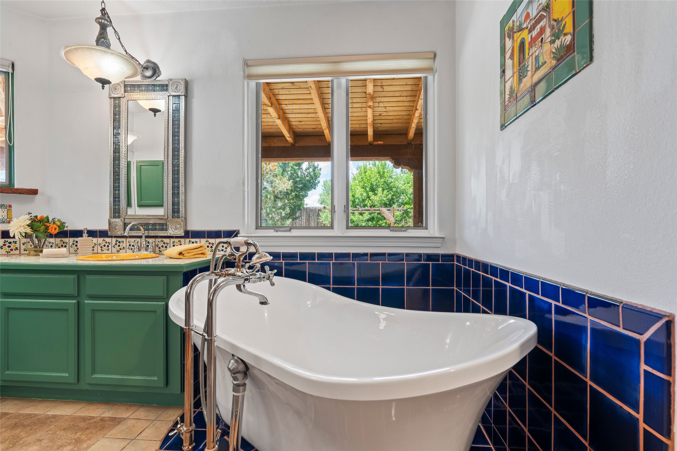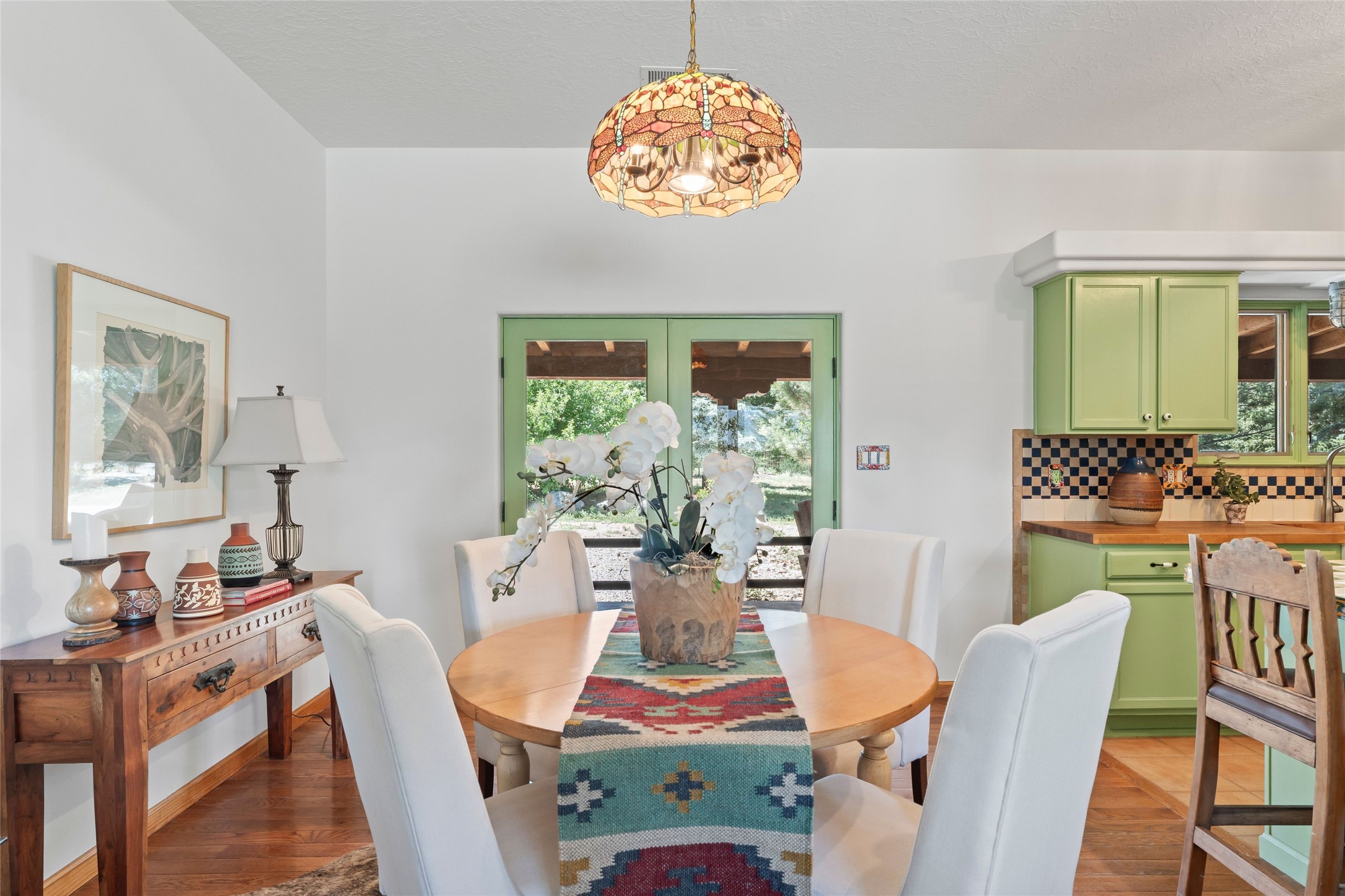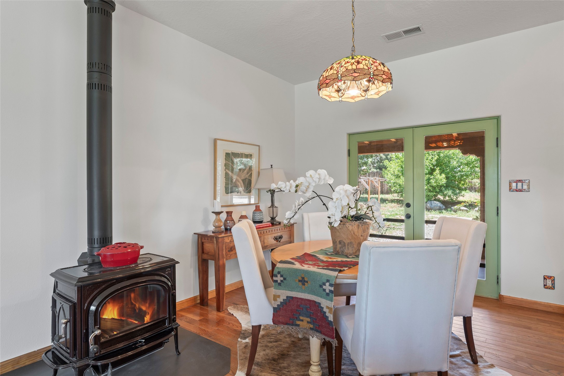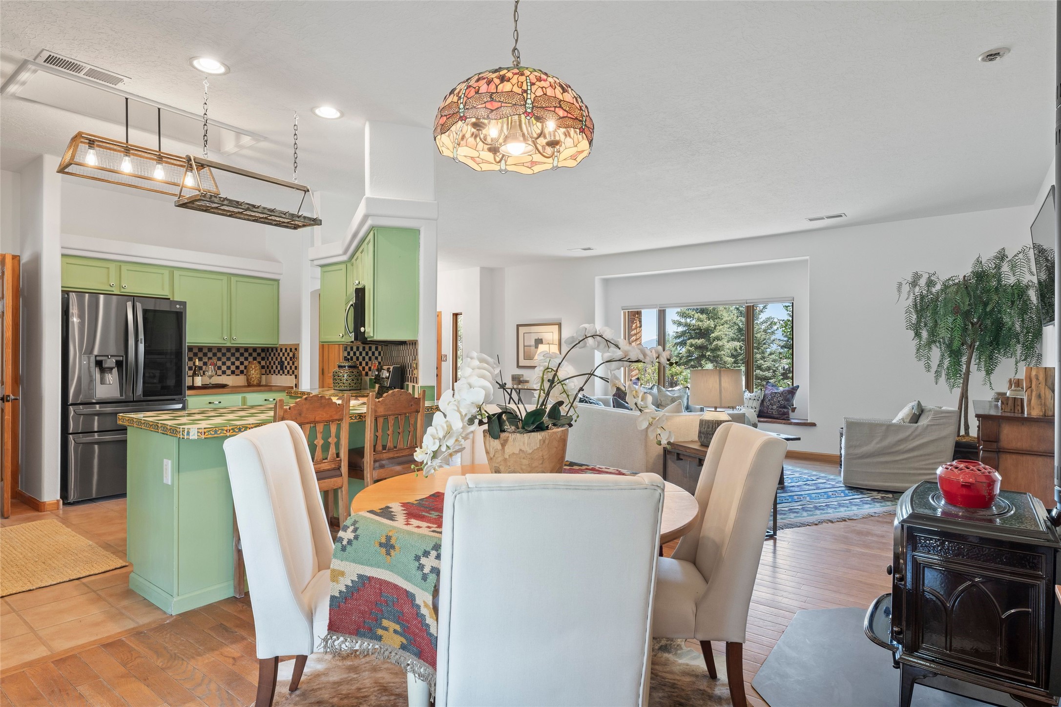 Here's the beautiful setting and property you've been looking for in Taos! An acre with great views and lots of big trees affords wonderful outdoor living, and there's a fabulous huge portal wrapping around the home. The residence is full of charm, light and bright with a very comfortable open floor plan, and the colorfully updated kitchen and bathrooms are quite appealing. The portal offers plenty of space for seating and dining, and it includes your own home spa with a new hot tub and large Finnleo sauna. The bonus is an outbuilding with a big six-car carport, plus two nice workshops, and a small storage/studio area. About three quarters of the lot is enclosed with coyote fencing and an electronically-controlled gate. The property is just a short distance to lots of hiking, biking, or horseback riding trails in the national forest. It's a convenient location close-in, yet with a lovely rural feeling, and the views of Taos Mountain and the Sangre de Cristo foothills are gorgeous!