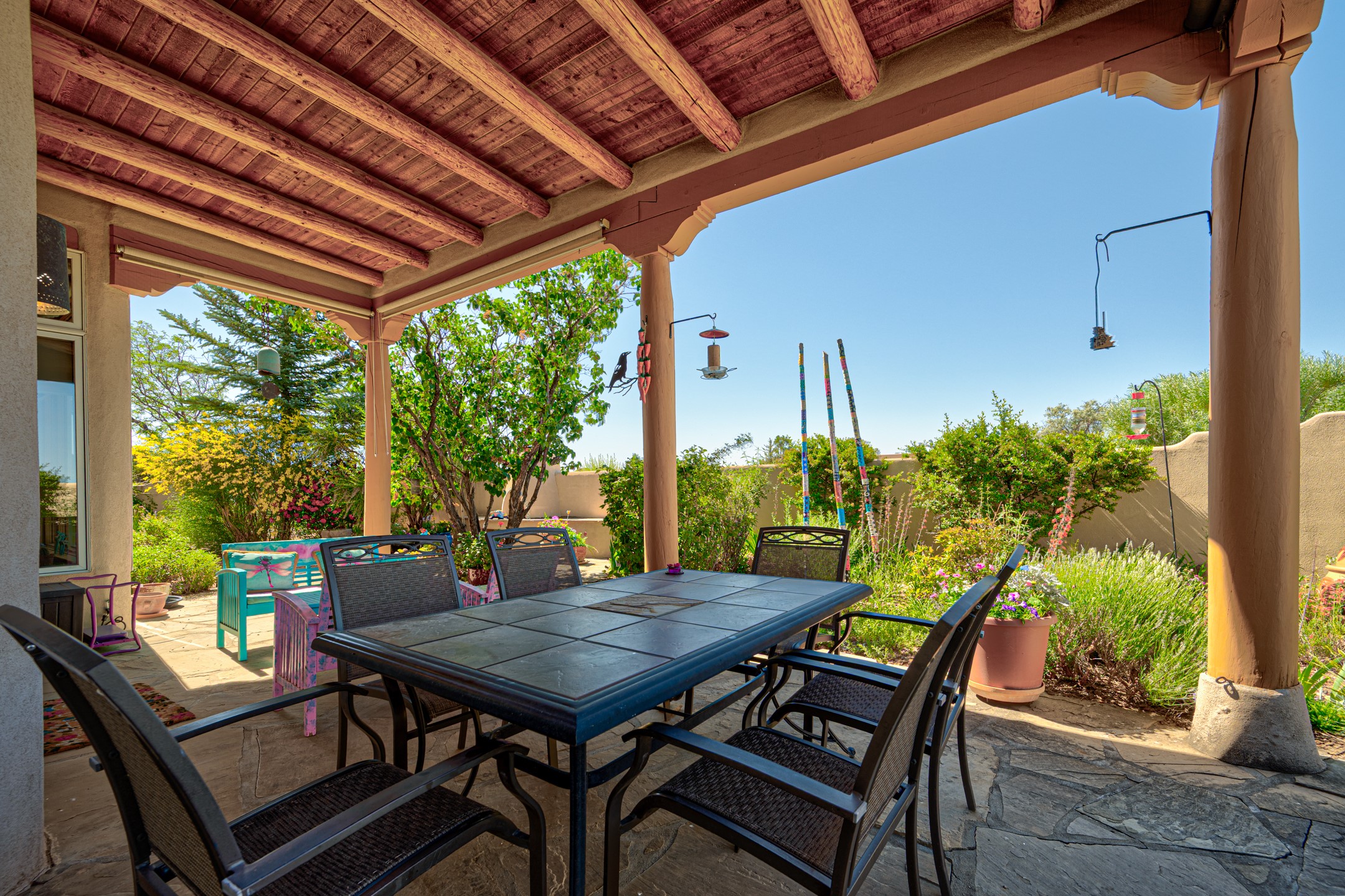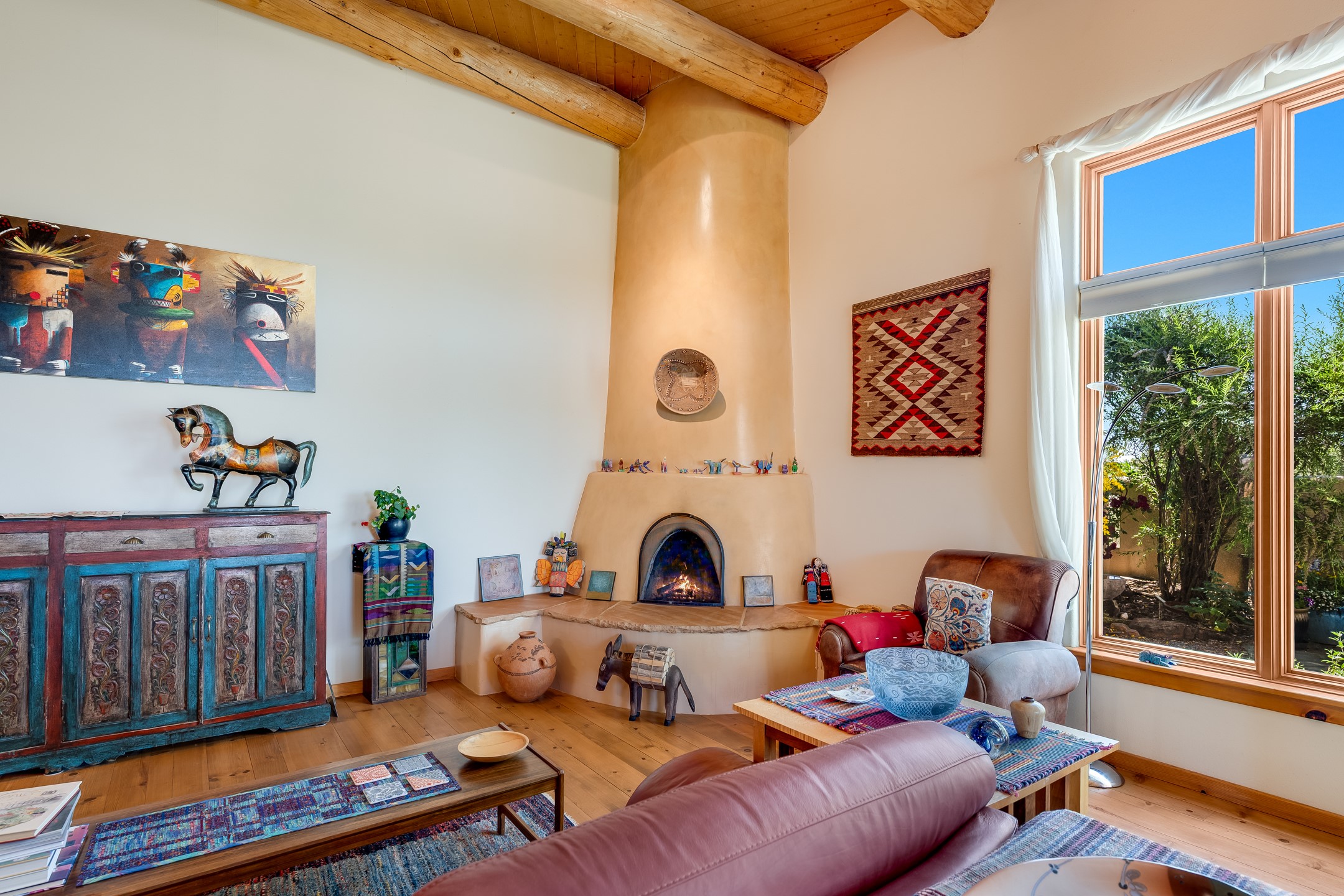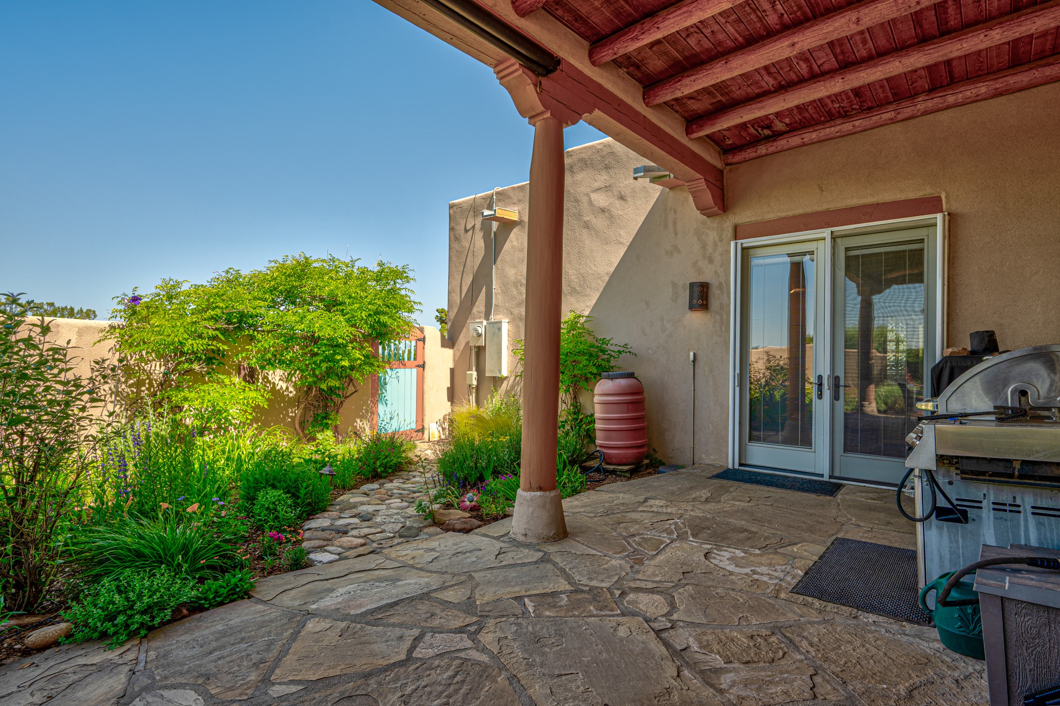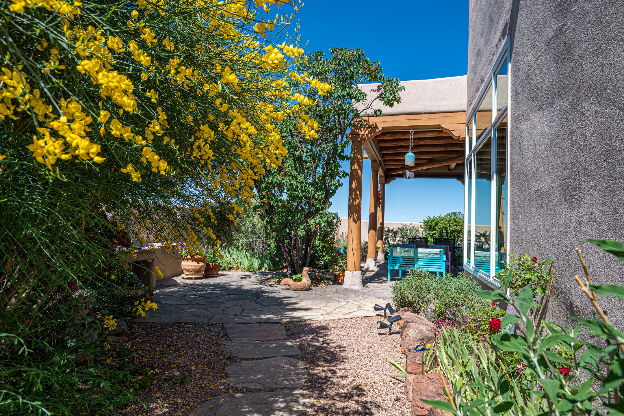 Priced to Sell! Exquisite Eastside Santa Fe 2700 sq.ft home in Eldorado built by Timothy House. Two beautifully landscaped, well established walled gardens create a private oasis on the south, west and north sides offering delightfully colorful views from the long grand 14ft high great room and dining room ceiling with 8ft high Pella windows. French doors lead out onto a large portal and 3 fireplaces including one in the garden for enjoyable outside entertainment. Viga beams, bancos, corbels and nichos add to the Santa Fe ambience and character. A lovely well designed kitchen featuring a large central island, granite counter tops, travertine backsplashes, custom cabinetry and updated appliances. The large owners suite includes a sitting area and kiva fireplace. A new silicone roof was installed in 2023 with a 20 year transferable warranty. A two zone central GFA heating and air-conditioning system on the roof makes for comfortable living year round. The guest area includes a large office which can double as a 3rd bedroom, the Murphy bed is not attached and will not be staying. There is even a secluded area for growing your own veggies. All this with Eldorado amenities close by, local shopping and services only minutes into Santa Fe.