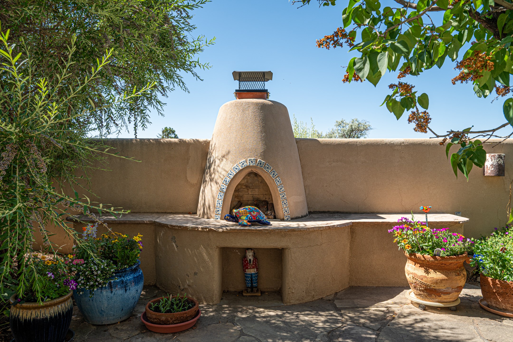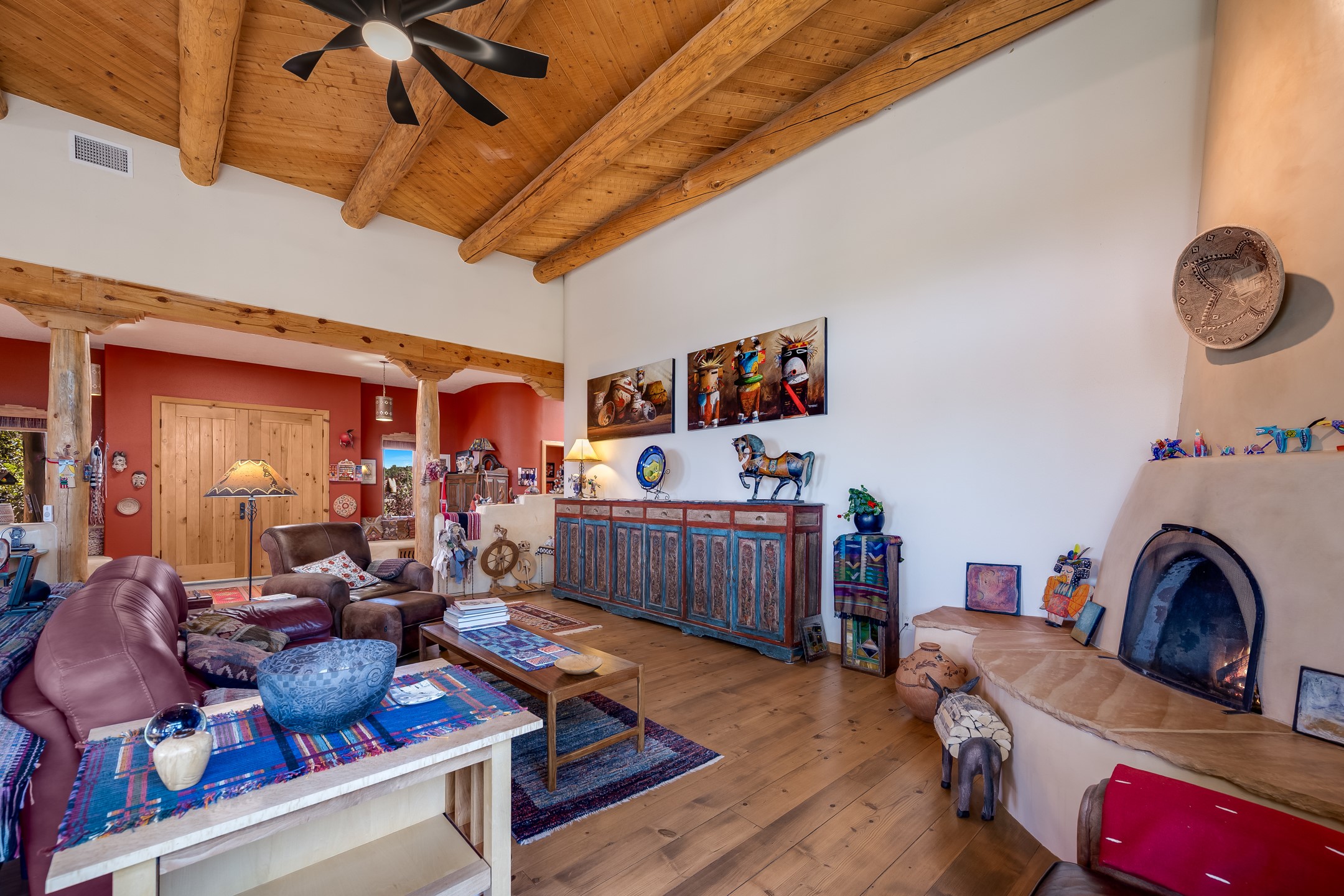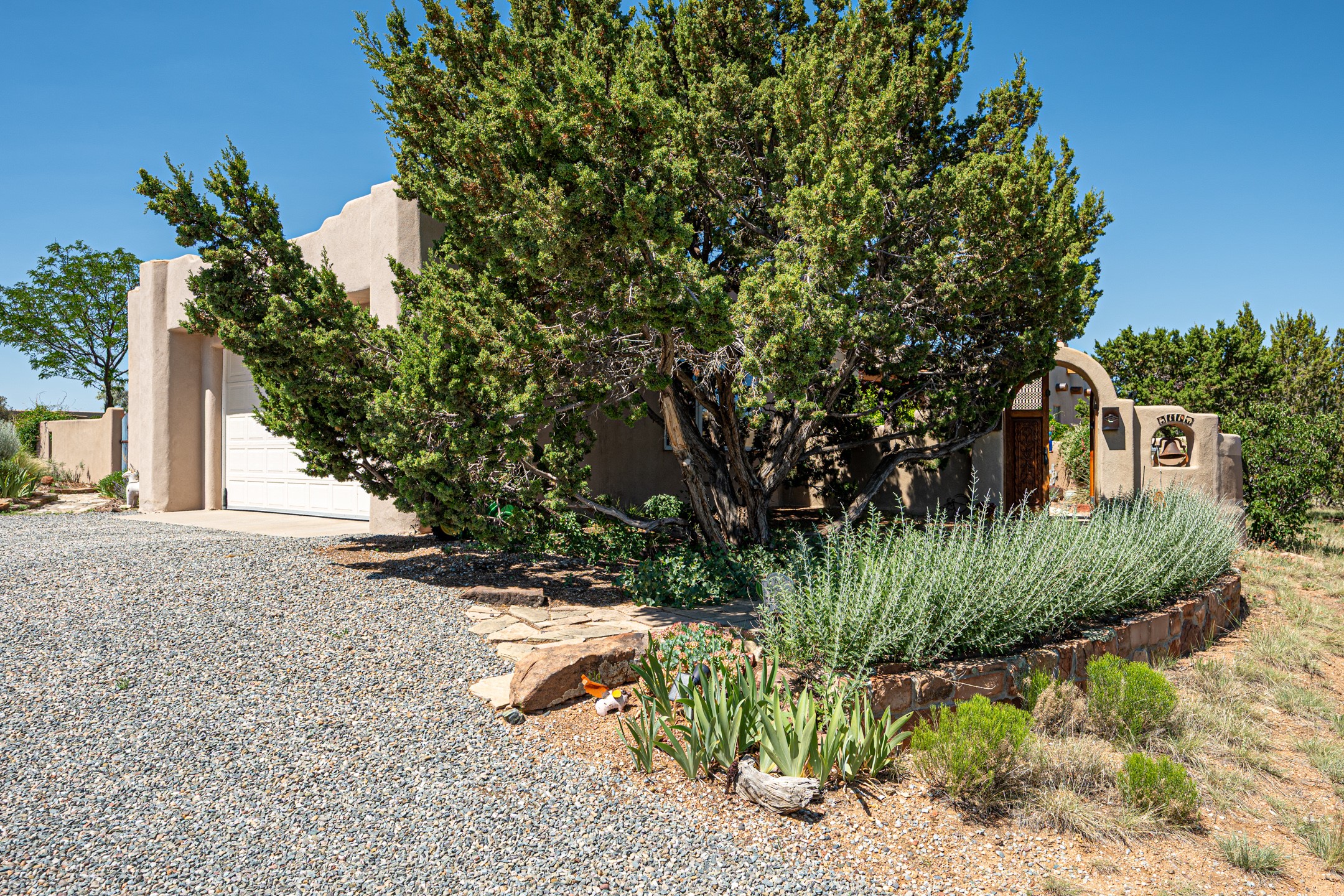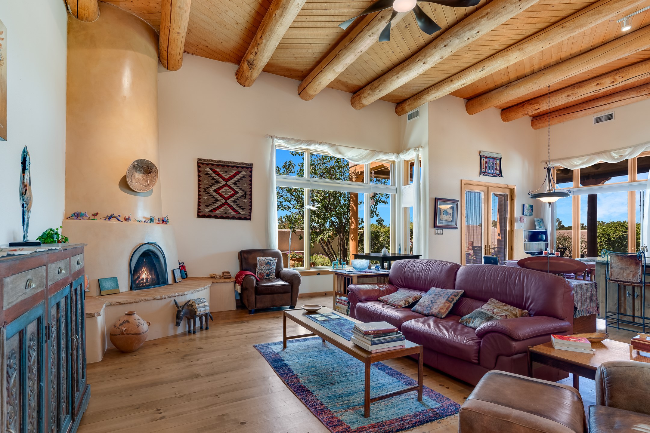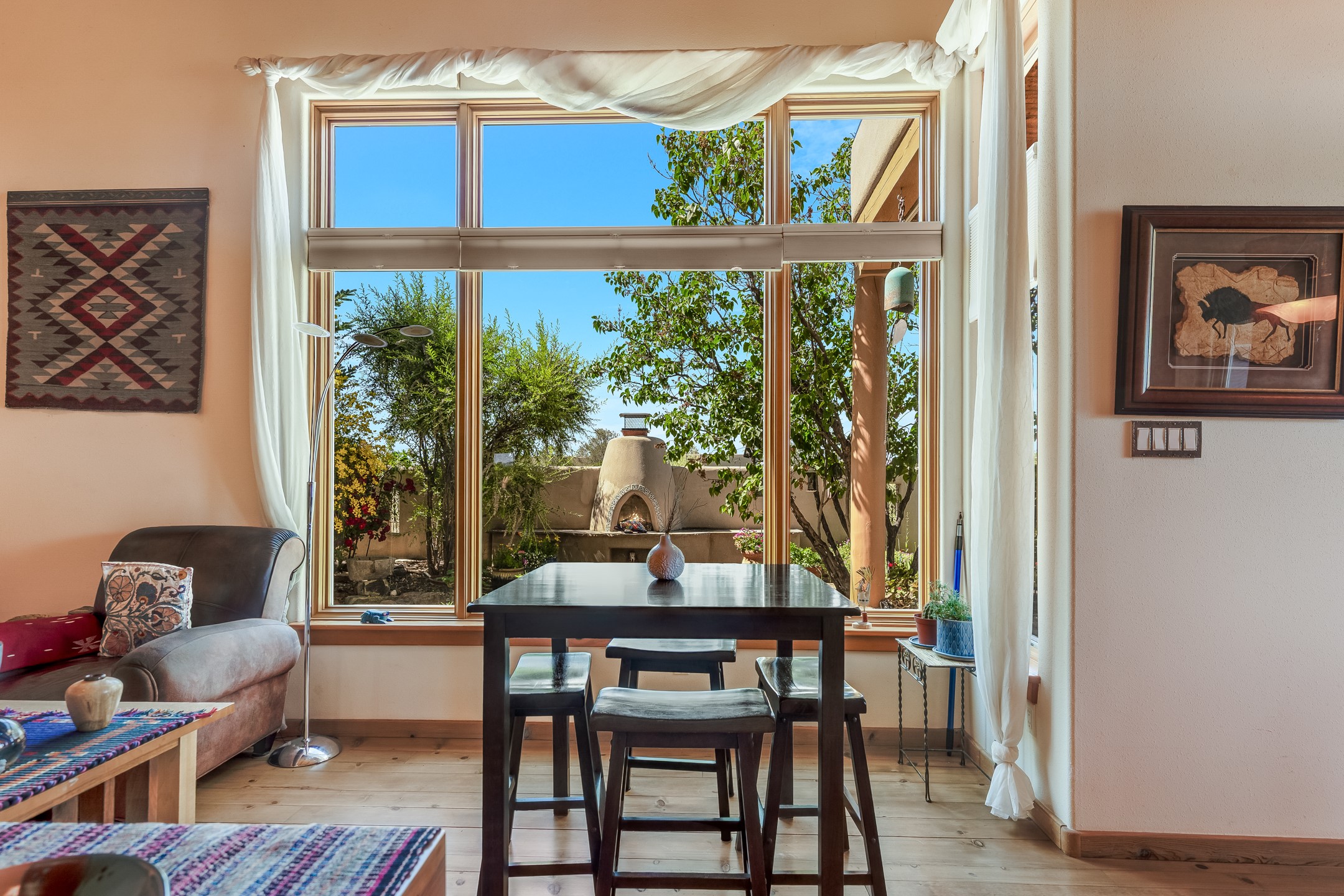 Priced to Sell! Exquisite Eastside Santa Fe 2700 sq.ft home in Eldorado built by Timothy House. Two beautifully landscaped, well established walled gardens create a private oasis on the south, west and north sides offering delightfully colorful views from the long grand 14ft high great room and dining room ceiling with 8ft high Pella windows. French doors lead out onto a large portal and 3 fireplaces including one in the garden for enjoyable outside entertainment. Viga beams, bancos, corbels and nichos add to the Santa Fe ambience and character. A lovely well designed kitchen featuring a large central island, granite counter tops, travertine backsplashes, custom cabinetry and updated appliances. The large owners suite includes a sitting area and kiva fireplace. A new silicone roof was installed in 2023 with a 20 year transferable warranty. A two zone central GFA heating and air-conditioning system on the roof makes for comfortable living year round. The guest area includes a large office which can double as a 3rd bedroom, the Murphy bed is not attached and will not be staying. There is even a secluded area for growing your own veggies. All this with Eldorado amenities close by, local shopping and services only minutes into Santa Fe.