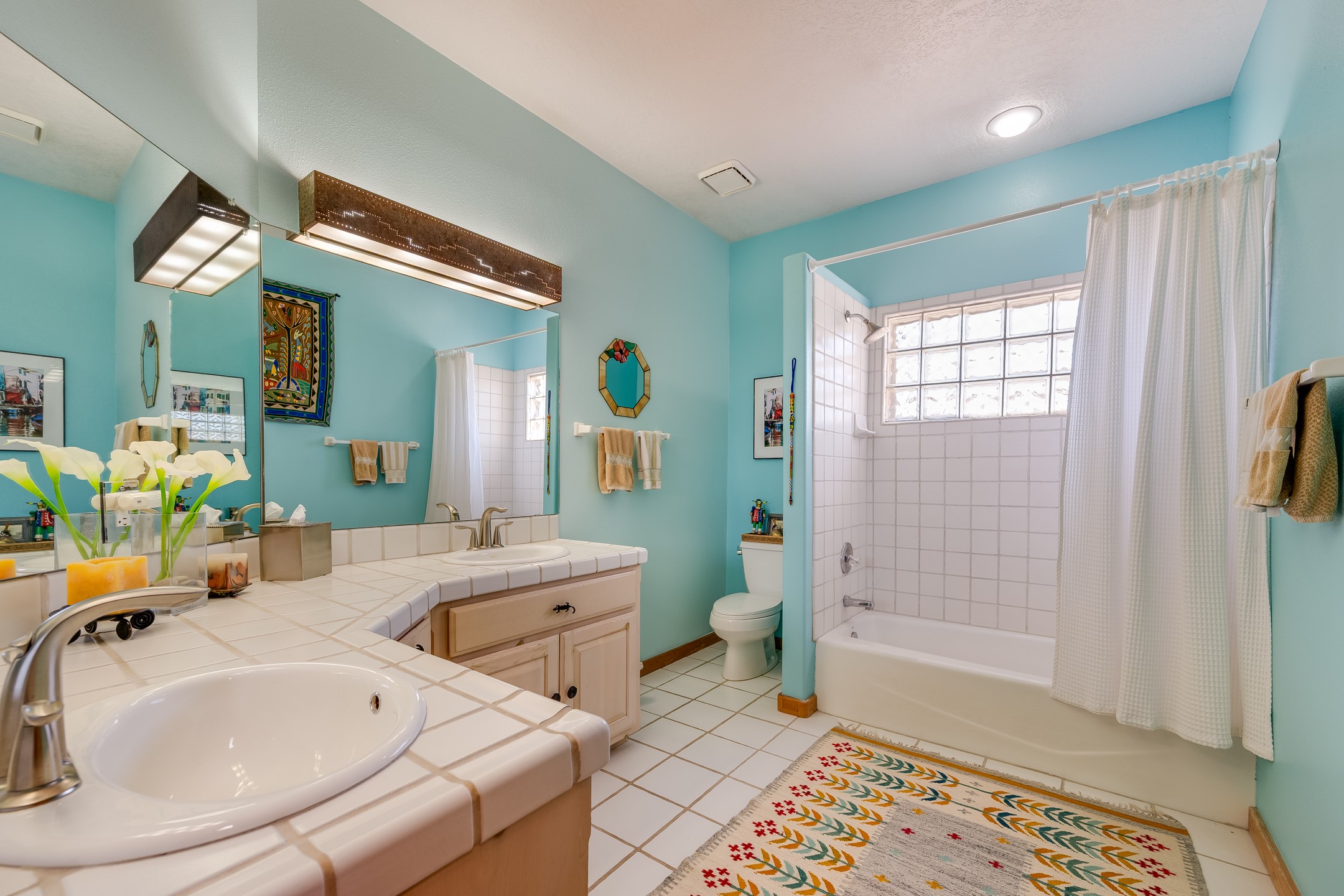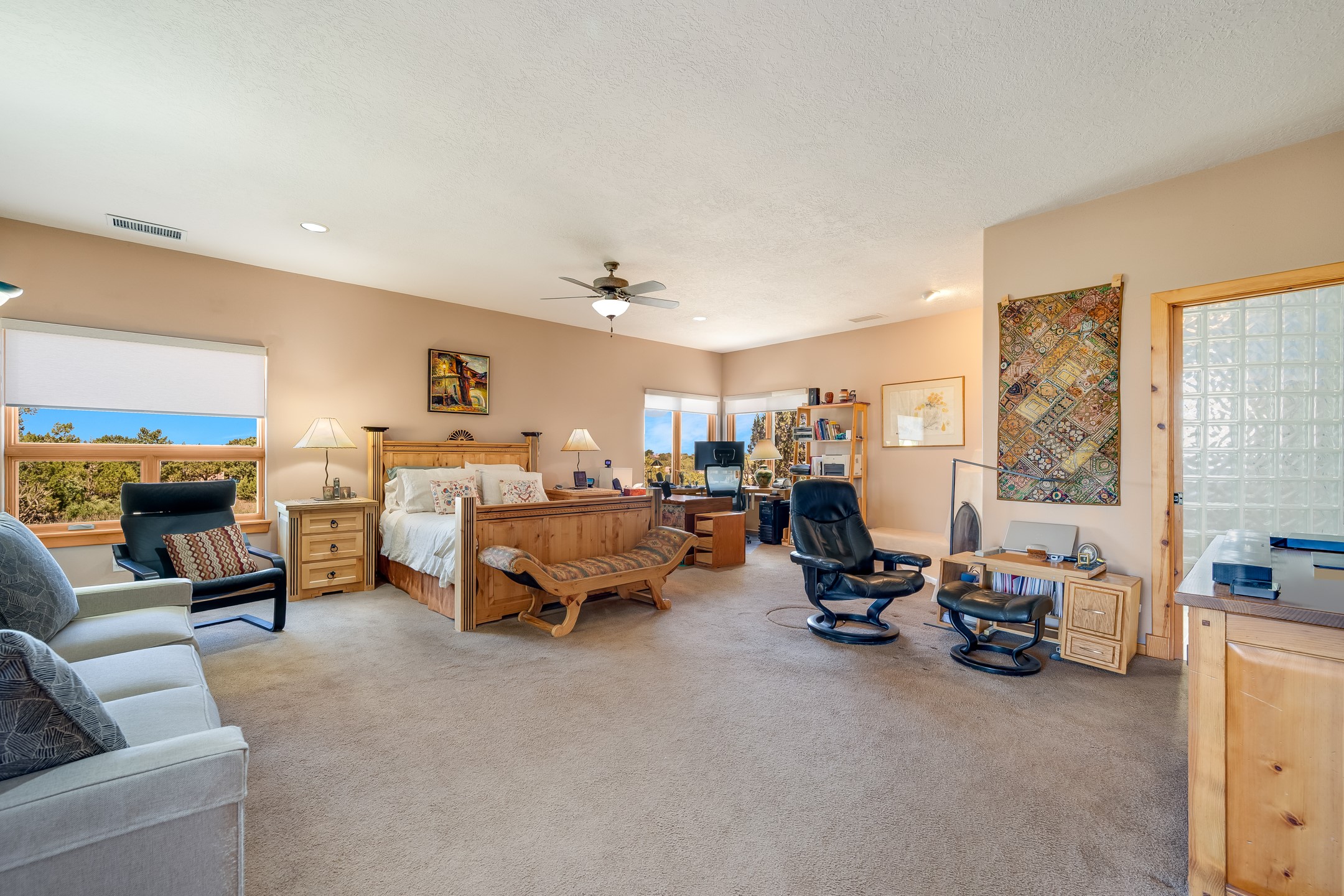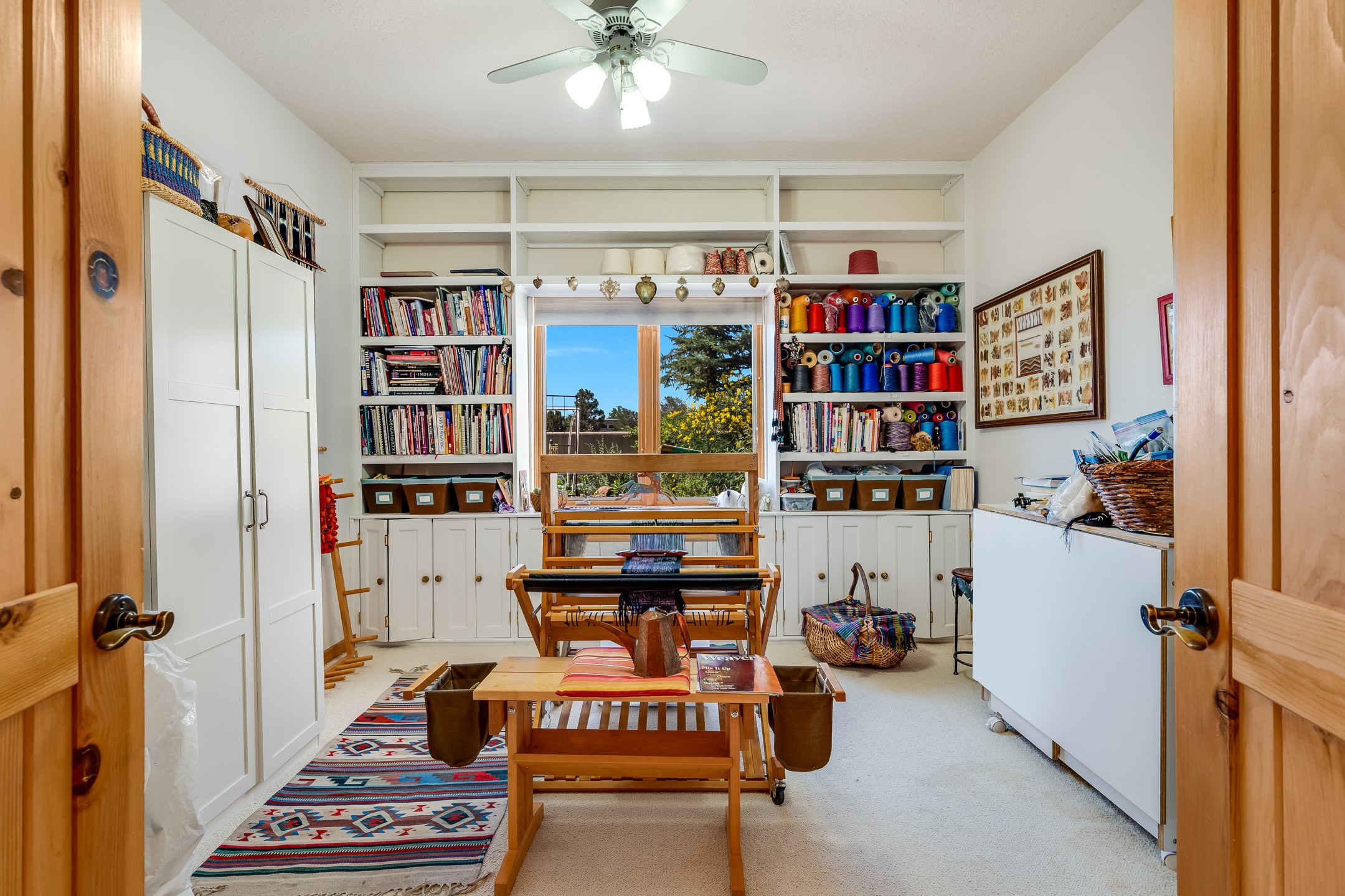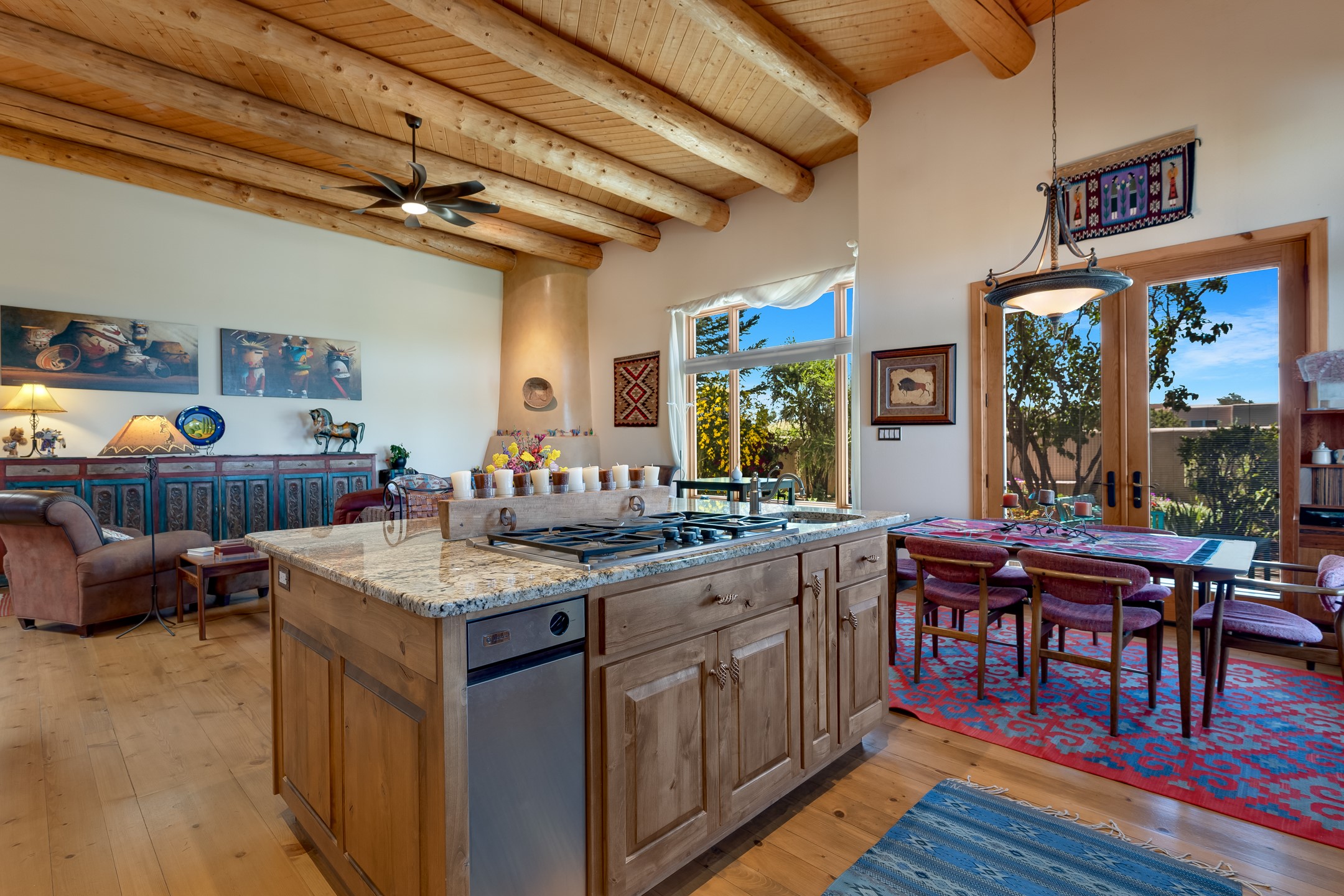 Priced to Sell! Exquisite Eastside Santa Fe 2700 sq.ft home in Eldorado built by Timothy House. Two beautifully landscaped, well established walled gardens create a private oasis on the south, west and north sides offering delightfully colorful views from the long grand 14ft high great room and dining room ceiling with 8ft high Pella windows. French doors lead out onto a large portal and 3 fireplaces including one in the garden for enjoyable outside entertainment. Viga beams, bancos, corbels and nichos add to the Santa Fe ambience and character. A lovely well designed kitchen featuring a large central island, granite counter tops, travertine backsplashes, custom cabinetry and updated appliances. The large owners suite includes a sitting area and kiva fireplace. A new silicone roof was installed in 2023 with a 20 year transferable warranty. A two zone central GFA heating and air-conditioning system on the roof makes for comfortable living year round. The guest area includes a large office which can double as a 3rd bedroom, the Murphy bed is not attached and will not be staying. There is even a secluded area for growing your own veggies. All this with Eldorado amenities close by, local shopping and services only minutes into Santa Fe.