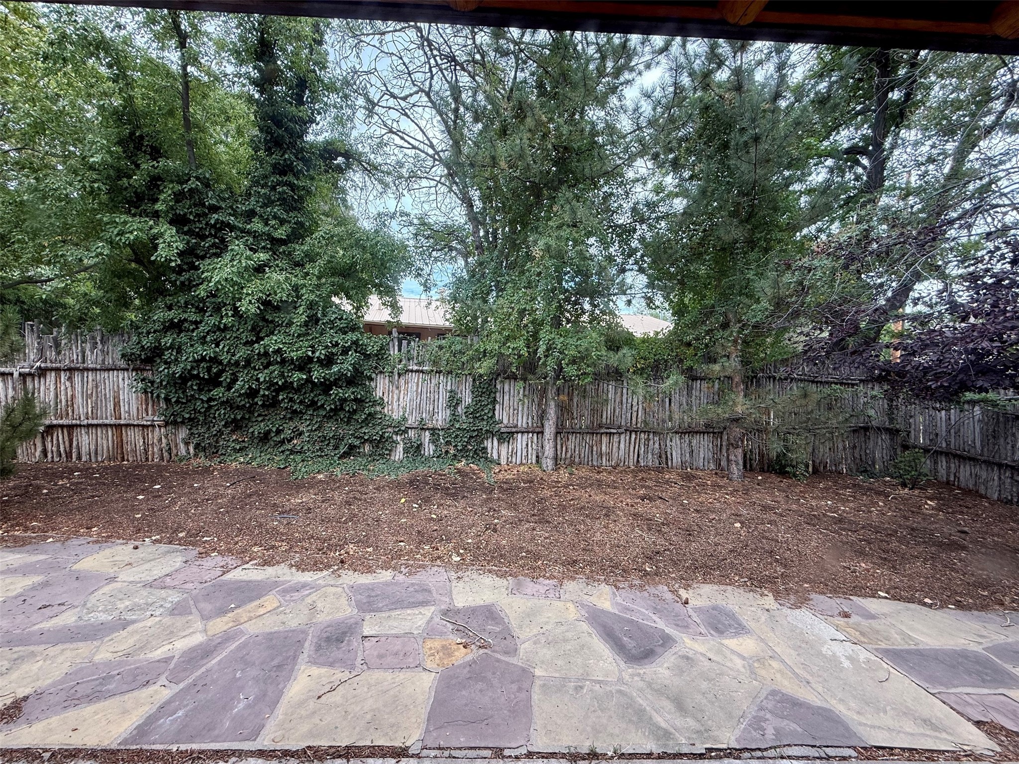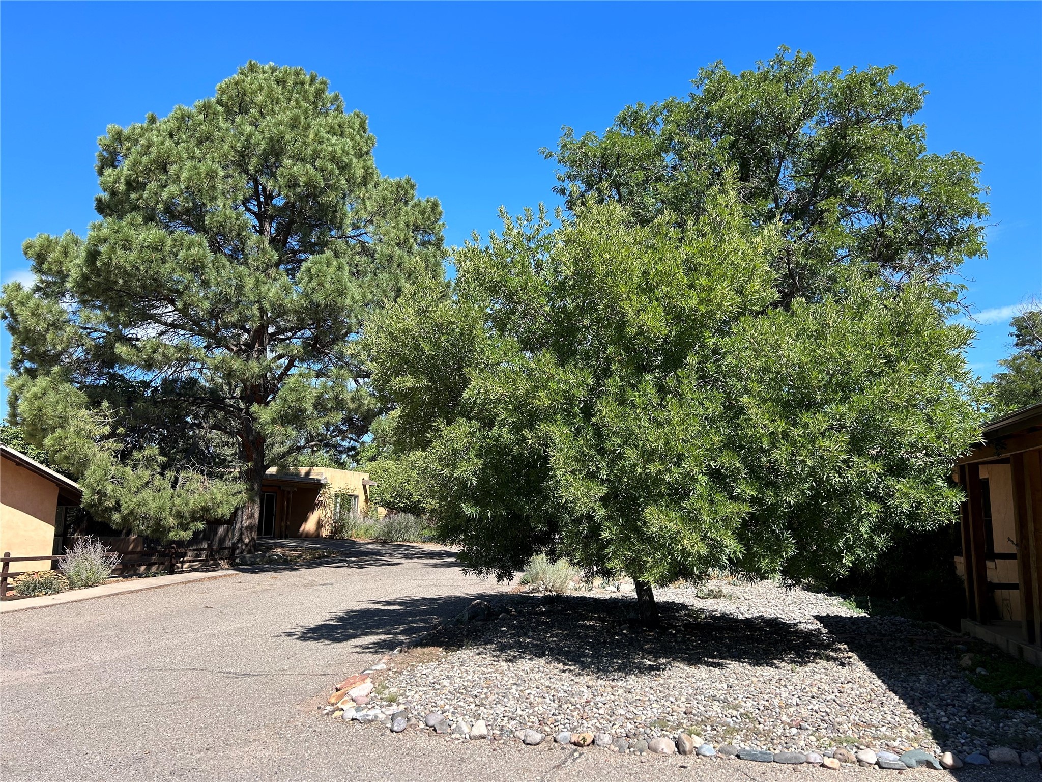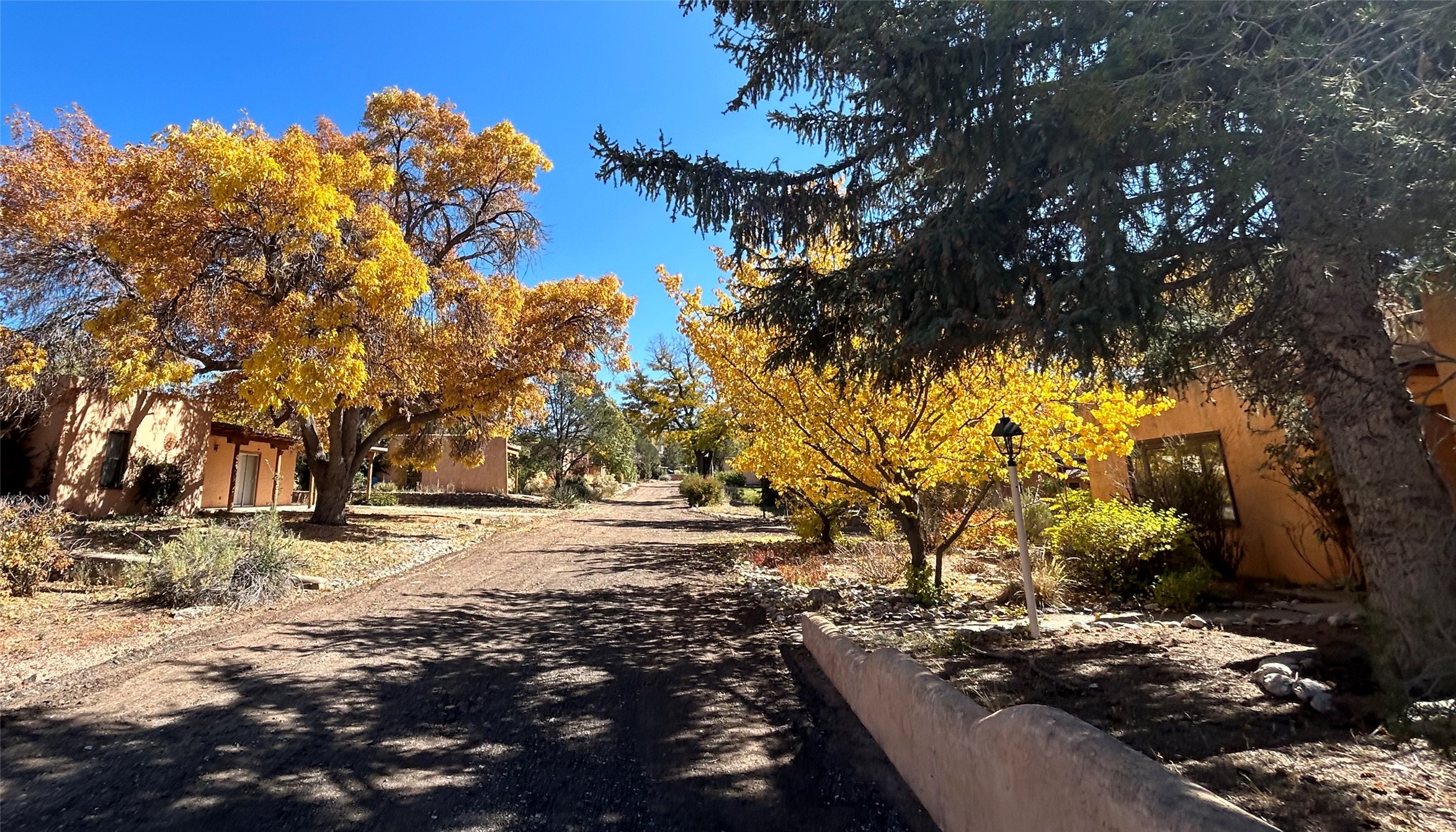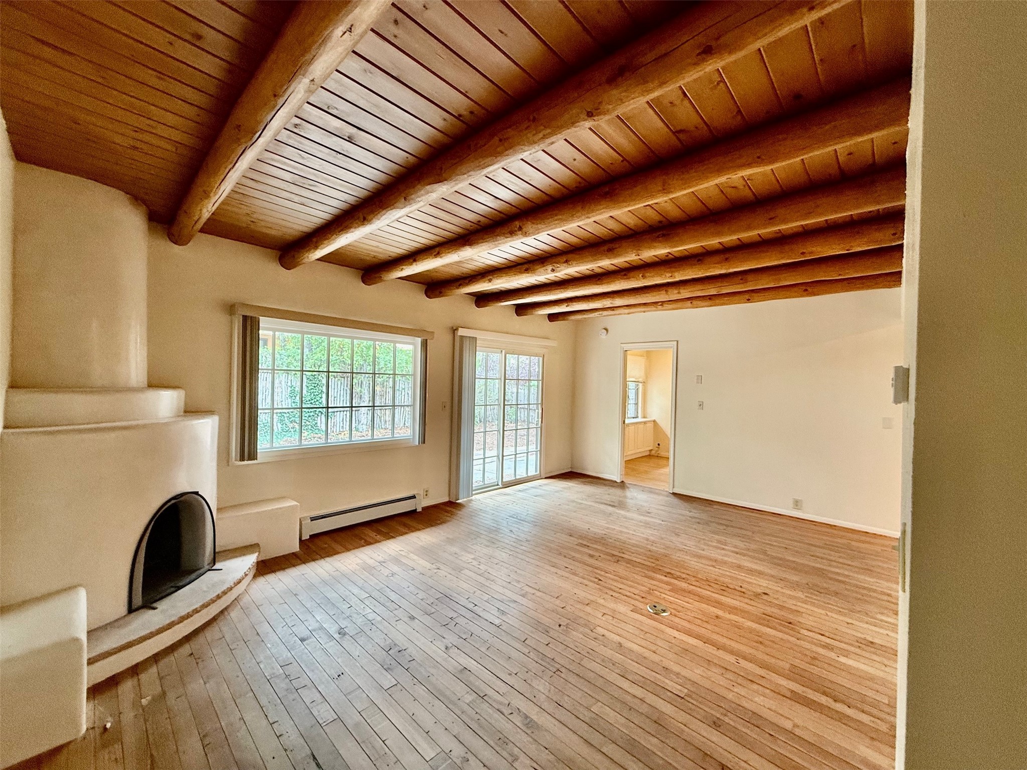 This is one the last of the best. Vigas, wood floors, open living area, with french doors leading out to a fabulous outdoor garden area. Charming living space, gated community, safe and private and only minutes from the Plaza.