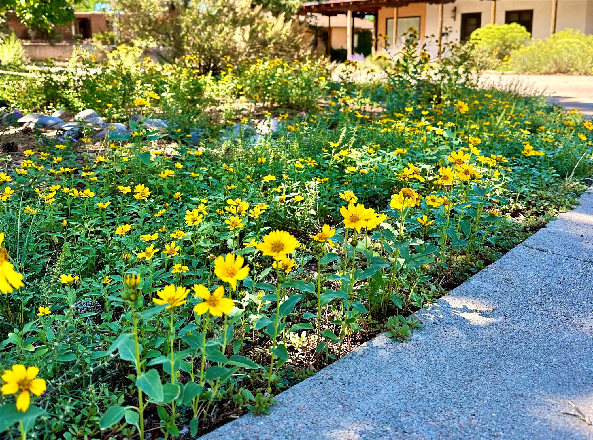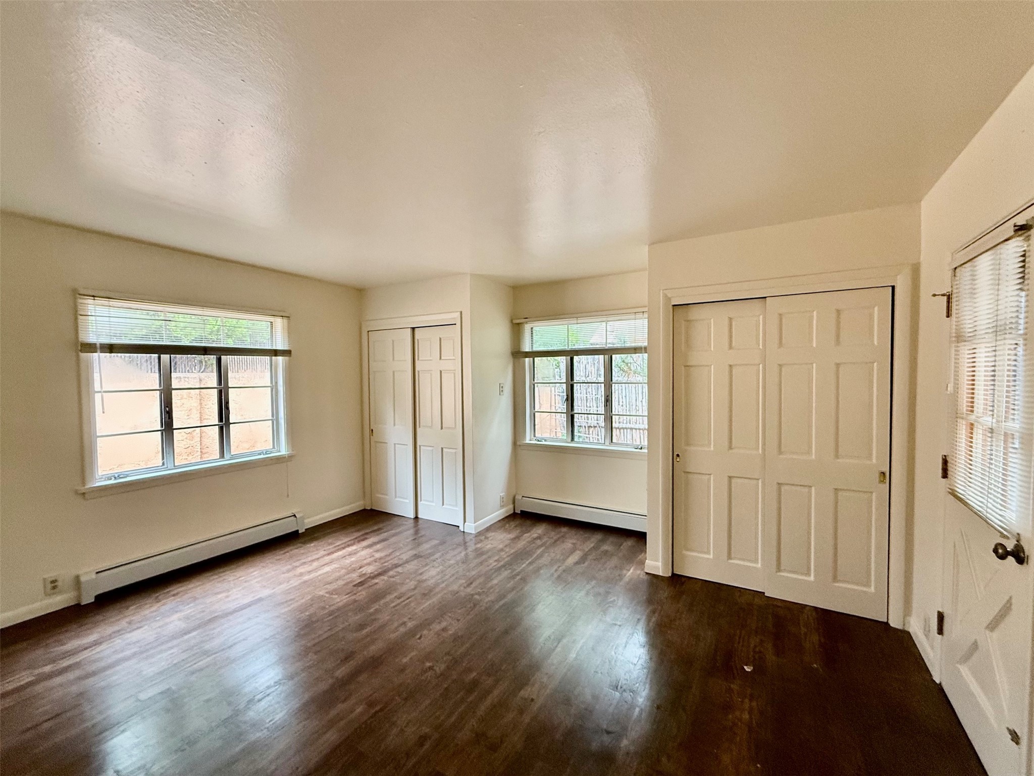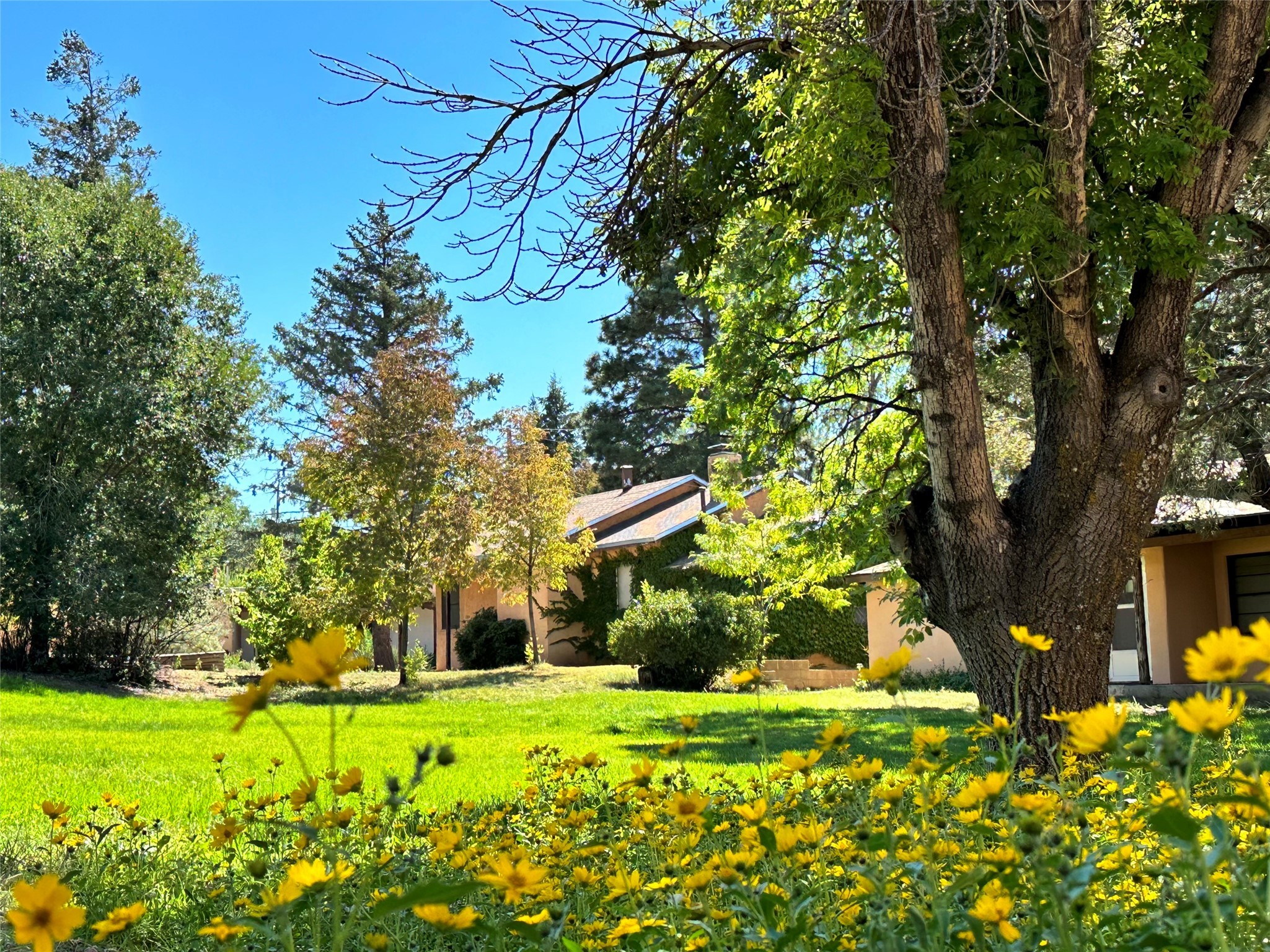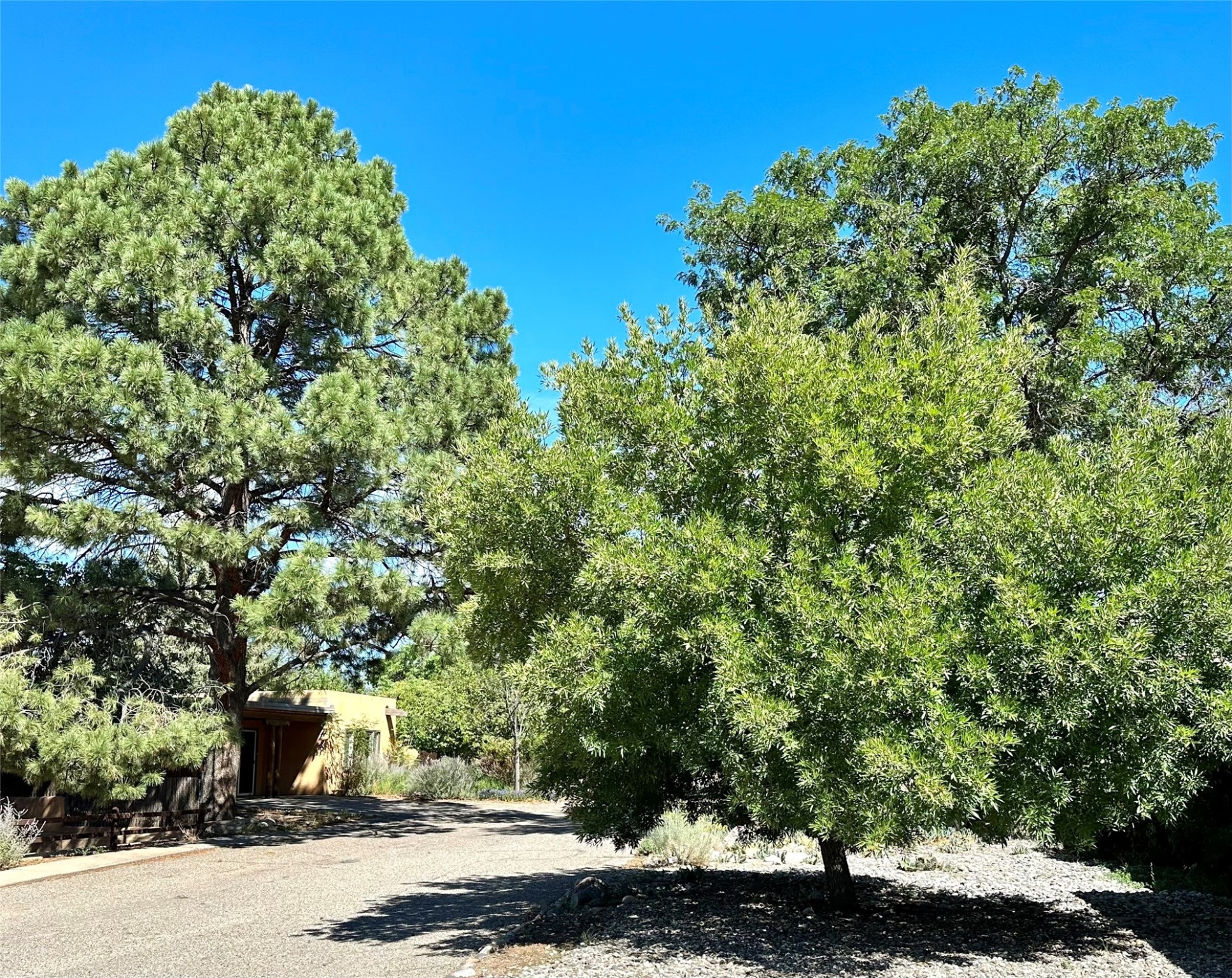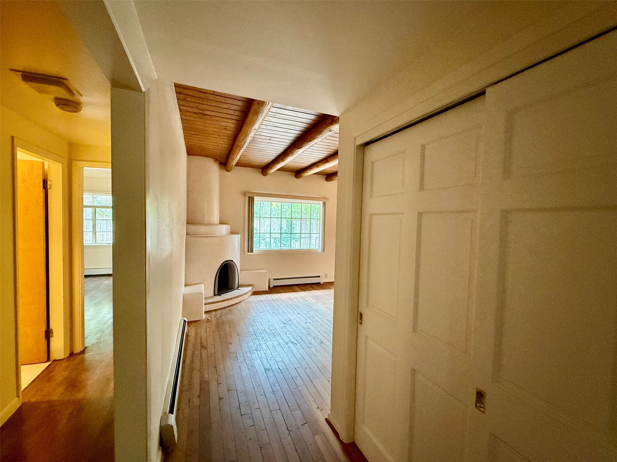 This is one the last of the best. Vigas, wood floors, open living area, with french doors leading out to a fabulous outdoor garden area. Charming living space, gated community, safe and private and only minutes from the Plaza.
