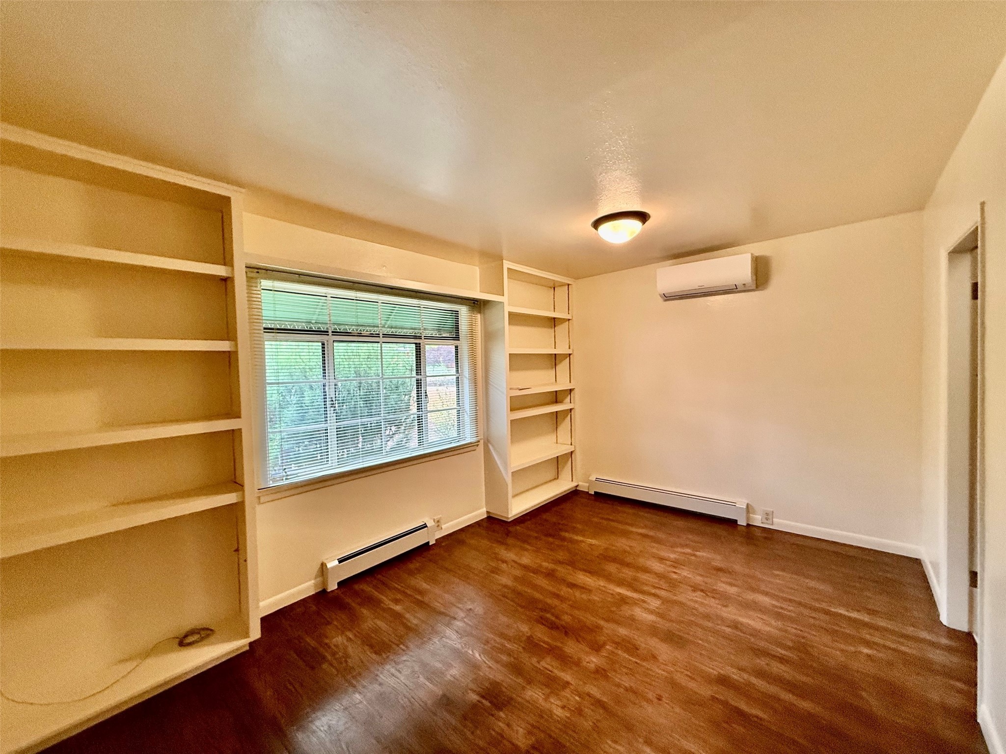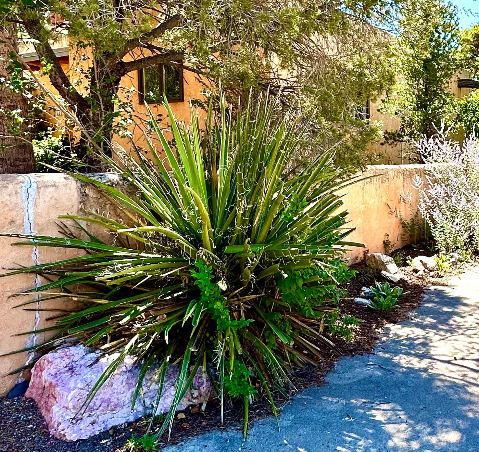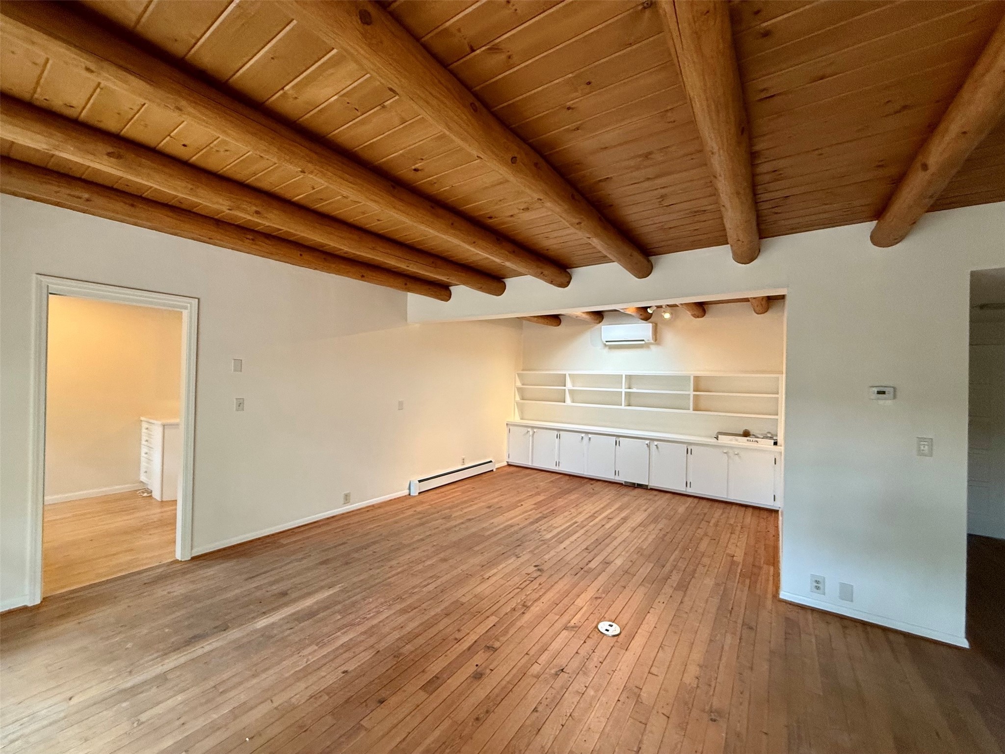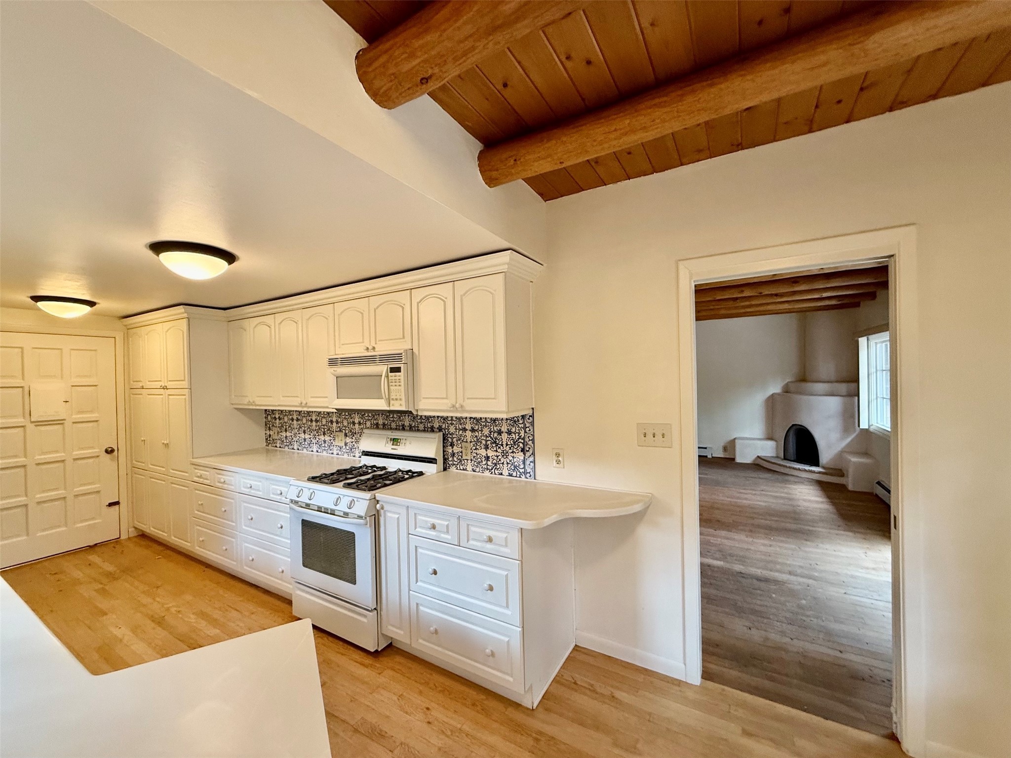 This is one the last of the best. Vigas, wood floors, open living area, with french doors leading out to a fabulous outdoor garden area. Charming living space, gated community, safe and private and only minutes from the Plaza.