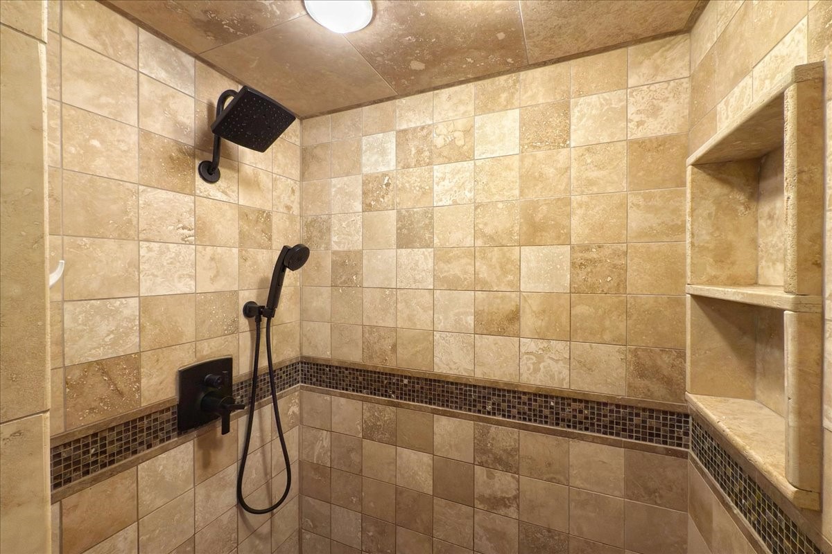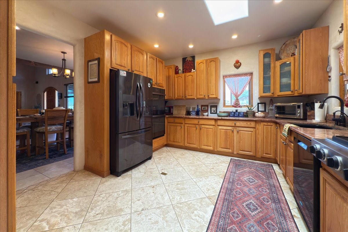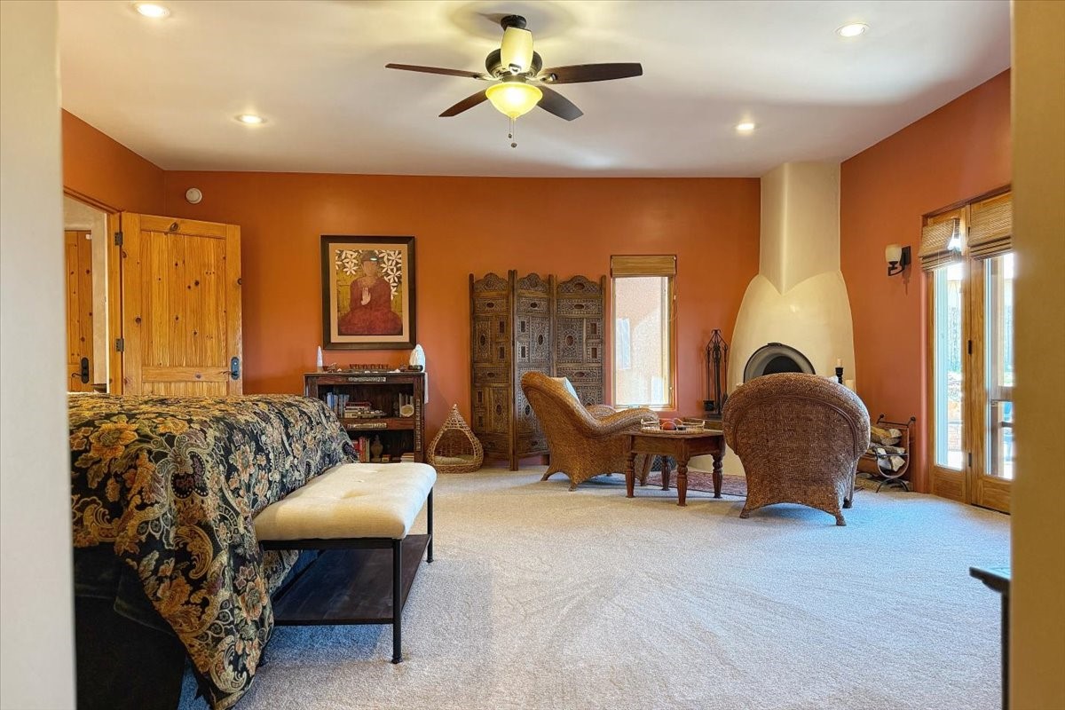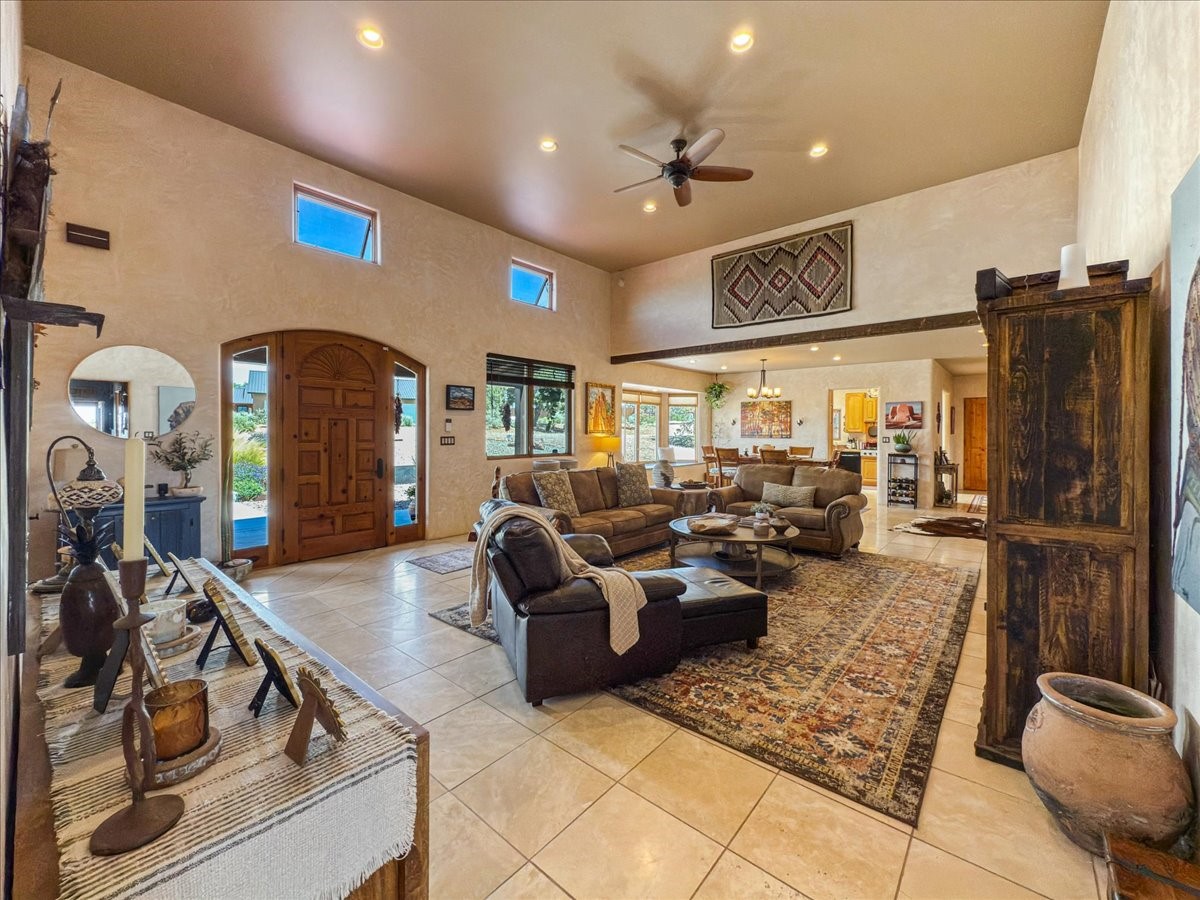 Discover this stunning updated home in the heart of Santa Fe on 1.4 acres of privacy, with Santa Fe touches and no HOA. This exquisite home boasts of natural light and plaster walls, 14' Ft. Ceilings, custom paint throughout, natural stone flooring in living room and kitchen, beautiful kitchen has granite counter tops, 6-burner Jenn Air range, brand newSmart-Double oven, Dual pane windows, updated flooring in every bedroom, all bedrooms have private suites, updated fixtures, two of three tubs are jetted, it's time to relax when you walk into your large primary suite, two separate walk-in closets, Kiva fireplace, each side of the bathroom has custom vessel sinks, separate shower, double doors that will lead you onto the brand new deck, radiant floor heating throughout including heating the garage for those cold nights, 6-zone heating zone, indoor laundry room, tankless water heater, New RO system, New water softener, New stucco 2024 with transferable warranty, propanol roof, stairs that lead you onto the TPO roof above the garage walk on up the stairs enjoy a 360 degree view of Sangre Cristo Mountains, walking and biking trails, new coyote fence and landscaping, new gas fire pit for those cozy nights, new concrete front patio, new screen doors, private well, new well pump, this home offers both luxury and convenience, 10 minutes from the plaza and major shopping. See attached list of upgrades. This home is turnkey and complete. Schedule your private tour today!