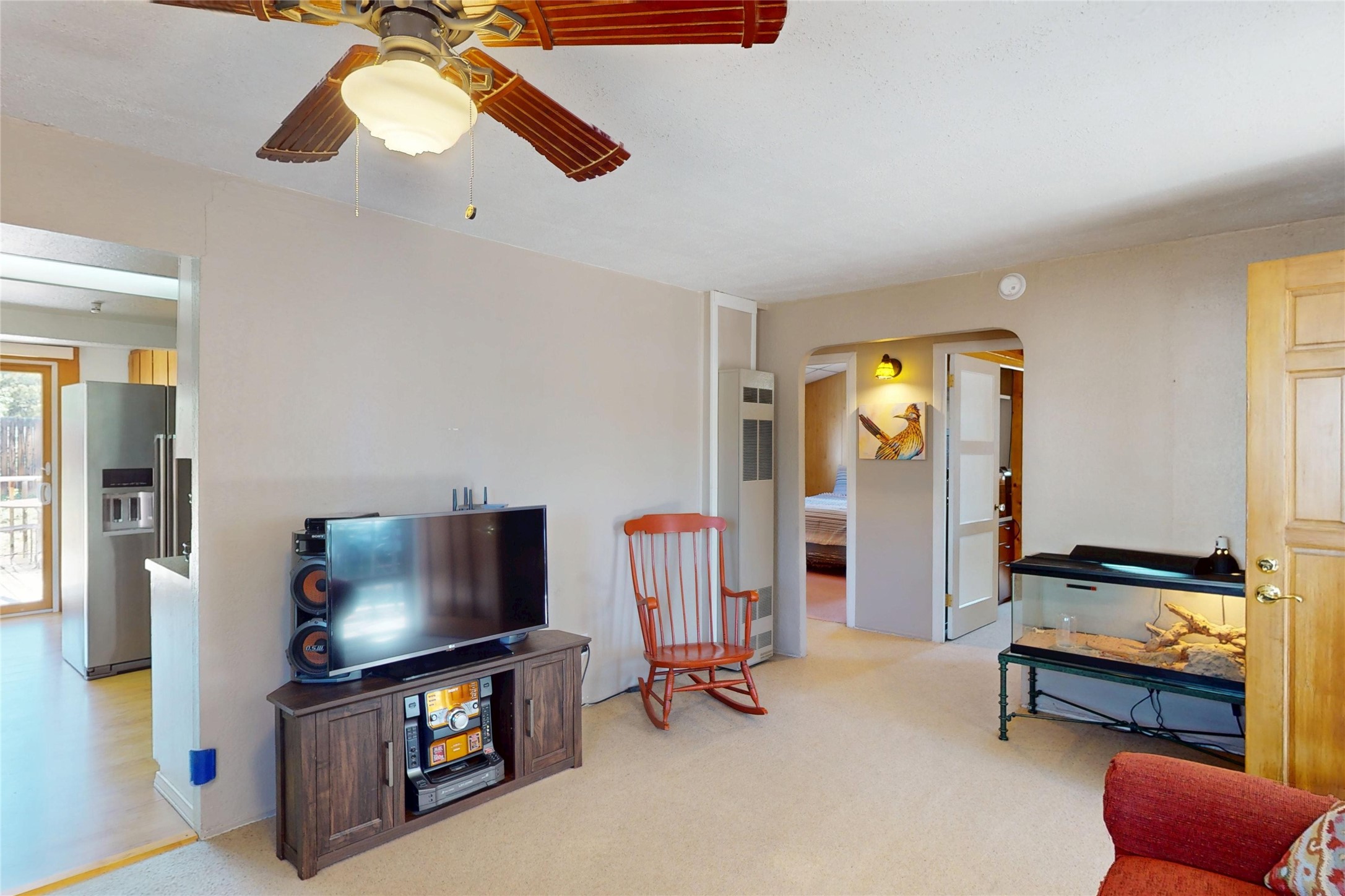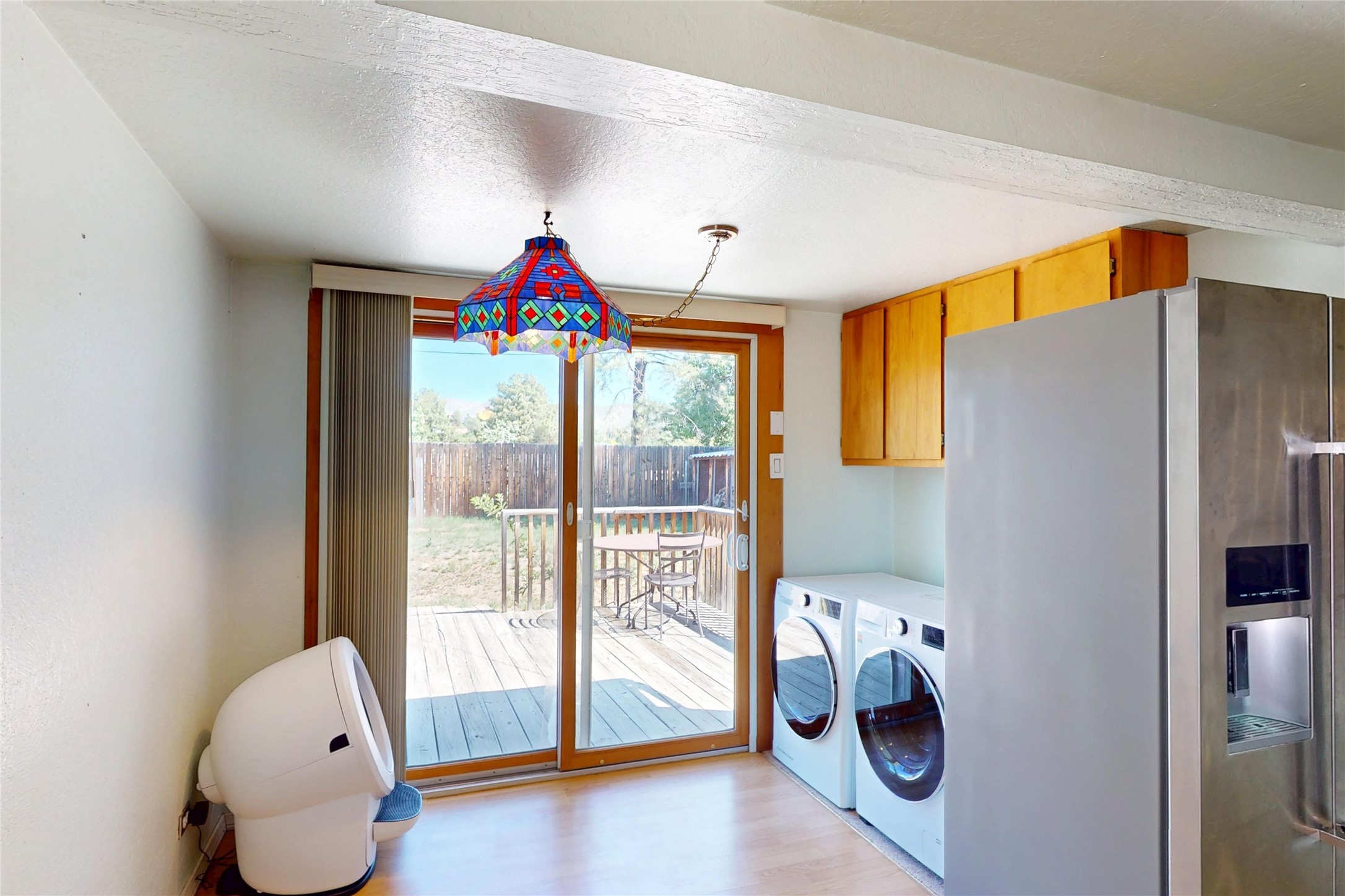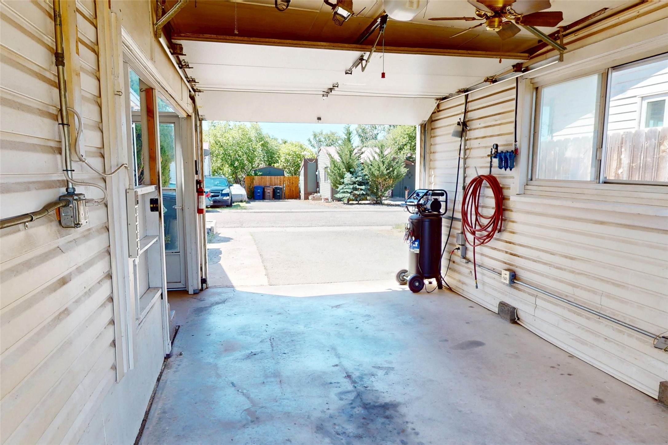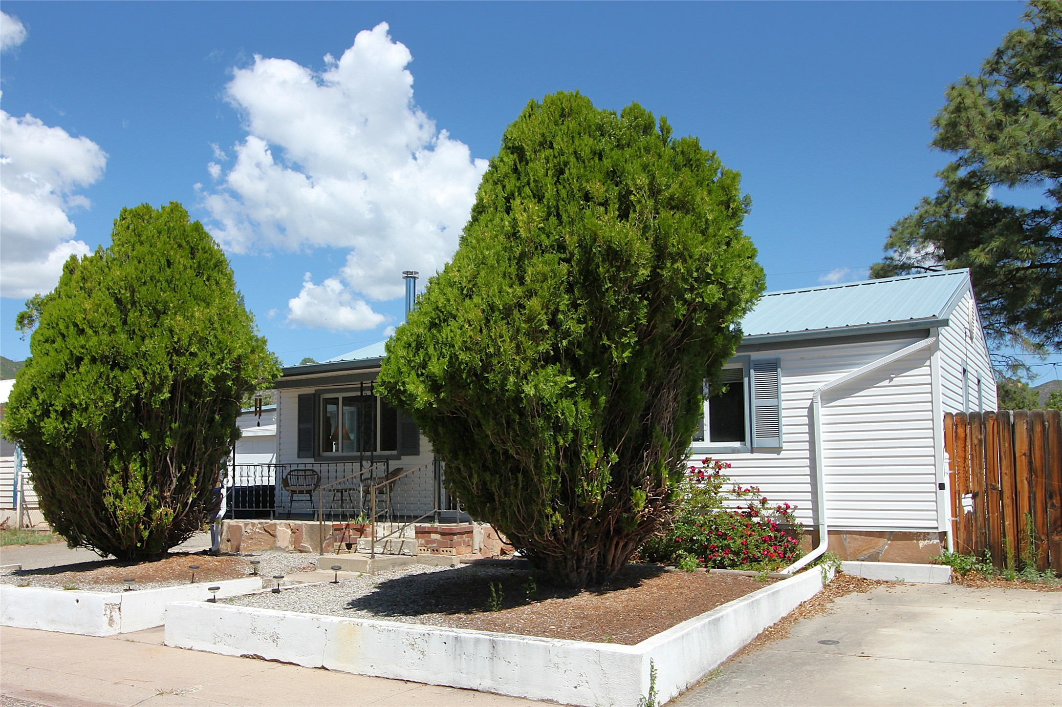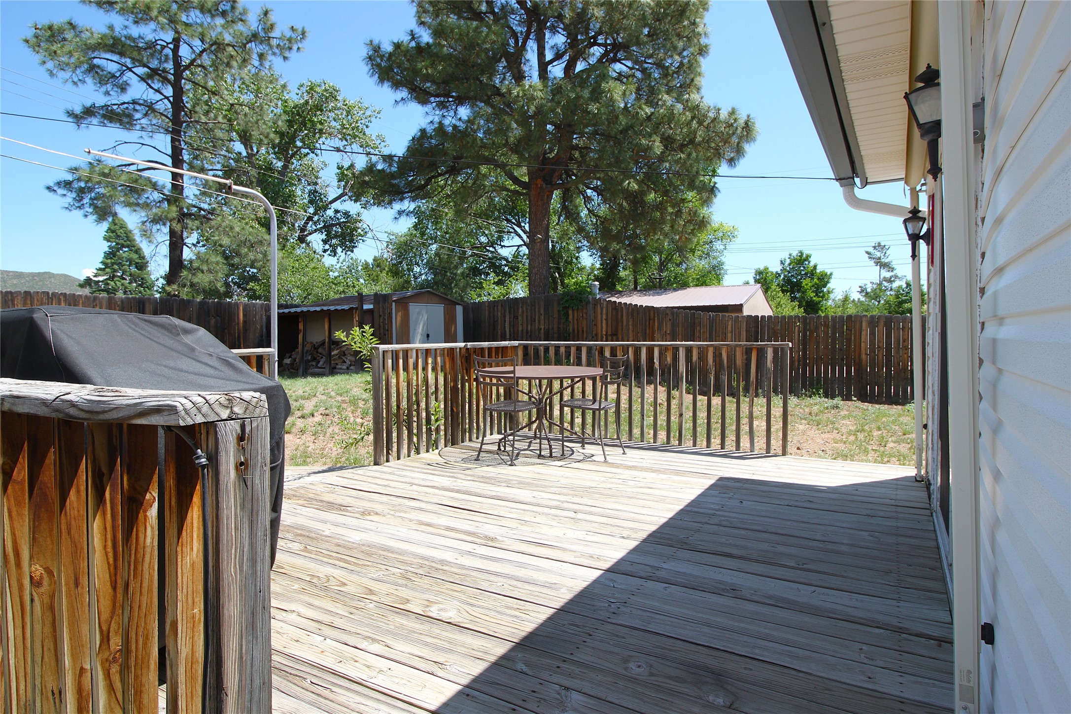 Thoughtfully updated 2-bedroom, 1-bath home, with attached garage, ideally located just minutes from Los Alamos High School, downtown, and LANL. The warm and inviting living area features a wood-burning catalytic stove, wall-mounted heating unit, double-pane windows, and a ceiling fan for year-round comfort. The expanded kitchen offers ample cabinet and counter space, a generous pantry, and a dedicated area for a washer and dryer. Enjoy easy access to the attached garage or go through the sliding glass door to a spacious back deck--perfect for relaxing or entertaining. The deck features mountain views and a retractable awning, extending your living space on sunny days. The fenced backyard provides plenty of room for pets, gardening, or play, and includes a storage shed for added convenience. The bathroom has been tastefully updated, and newer interior doors throughout the home give it a fresh, modern feel. The attached garage includes front and rear garage doors for easy backyard access, and an extra driveway on the side of the home provides additional parking. This home offers comfort, convenience, and modern updates--all in an excellent location. Schedule your showing today!