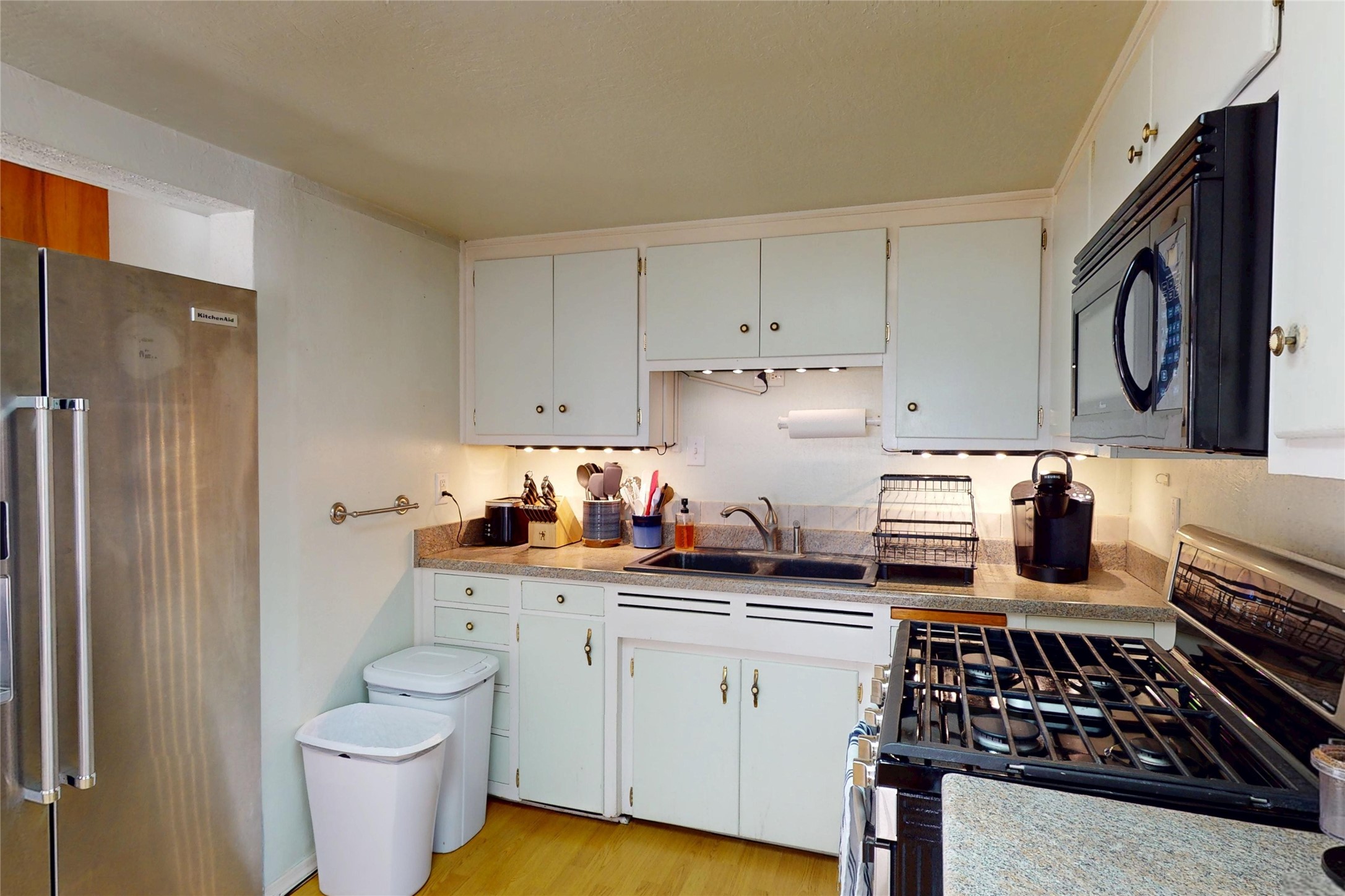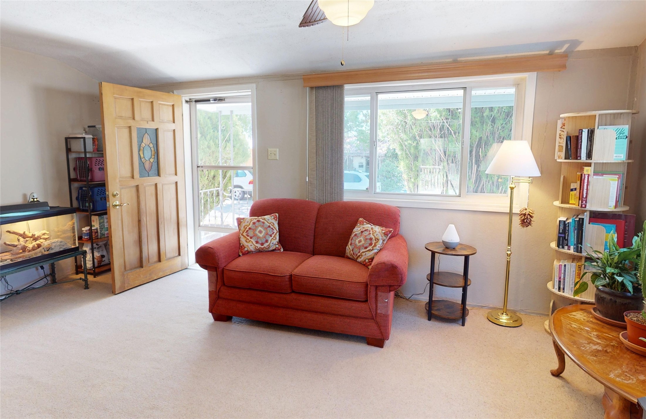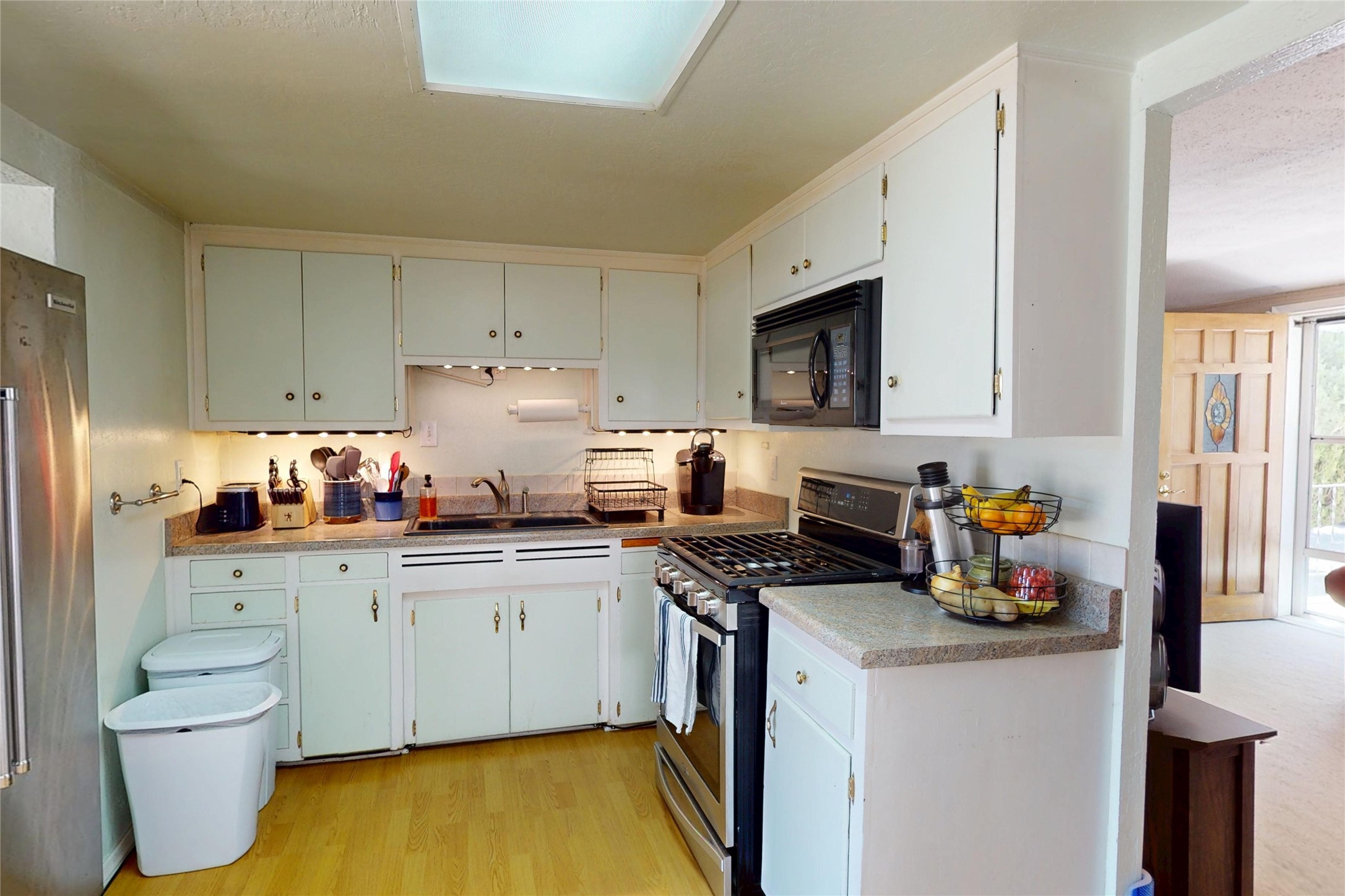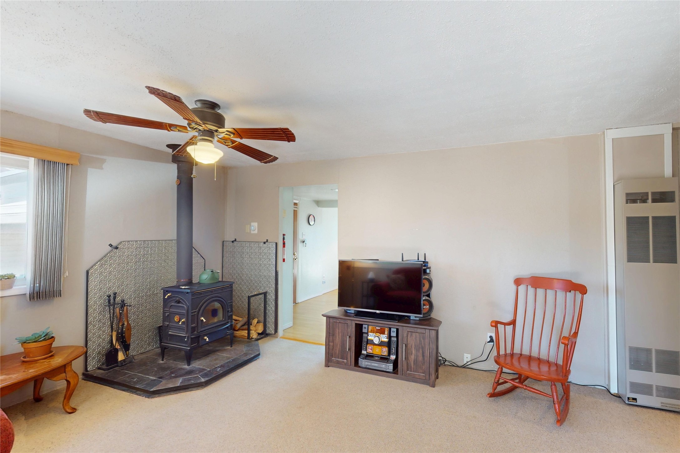 Thoughtfully updated 2-bedroom, 1-bath home, with attached garage, ideally located just minutes from Los Alamos High School, downtown, and LANL. The warm and inviting living area features a wood-burning catalytic stove, wall-mounted heating unit, double-pane windows, and a ceiling fan for year-round comfort. The expanded kitchen offers ample cabinet and counter space, a generous pantry, and a dedicated area for a washer and dryer. Enjoy easy access to the attached garage or go through the sliding glass door to a spacious back deck--perfect for relaxing or entertaining. The deck features mountain views and a retractable awning, extending your living space on sunny days. The fenced backyard provides plenty of room for pets, gardening, or play, and includes a storage shed for added convenience. The bathroom has been tastefully updated, and newer interior doors throughout the home give it a fresh, modern feel. The attached garage includes front and rear garage doors for easy backyard access, and an extra driveway on the side of the home provides additional parking. This home offers comfort, convenience, and modern updates--all in an excellent location. Schedule your showing today!