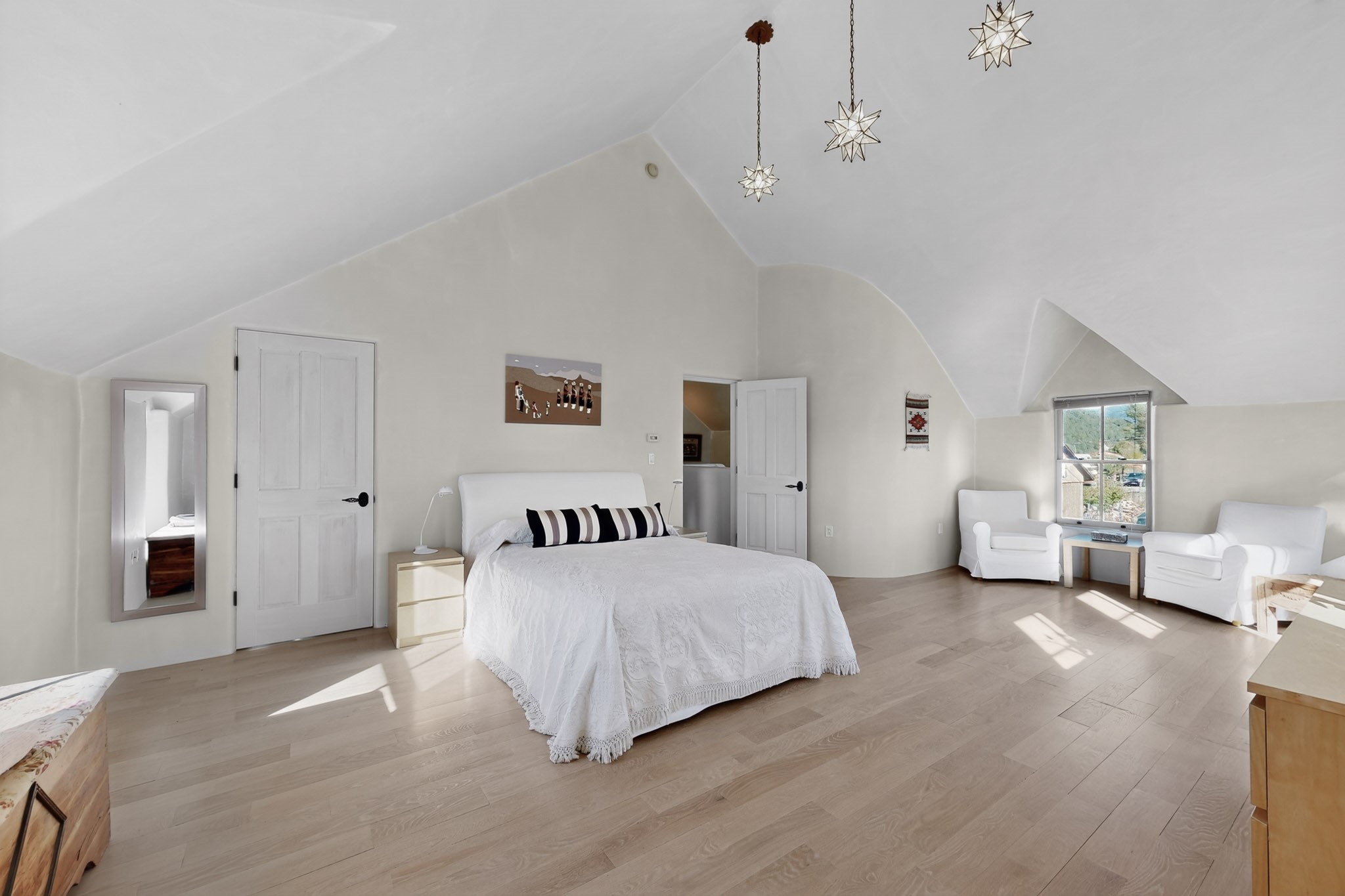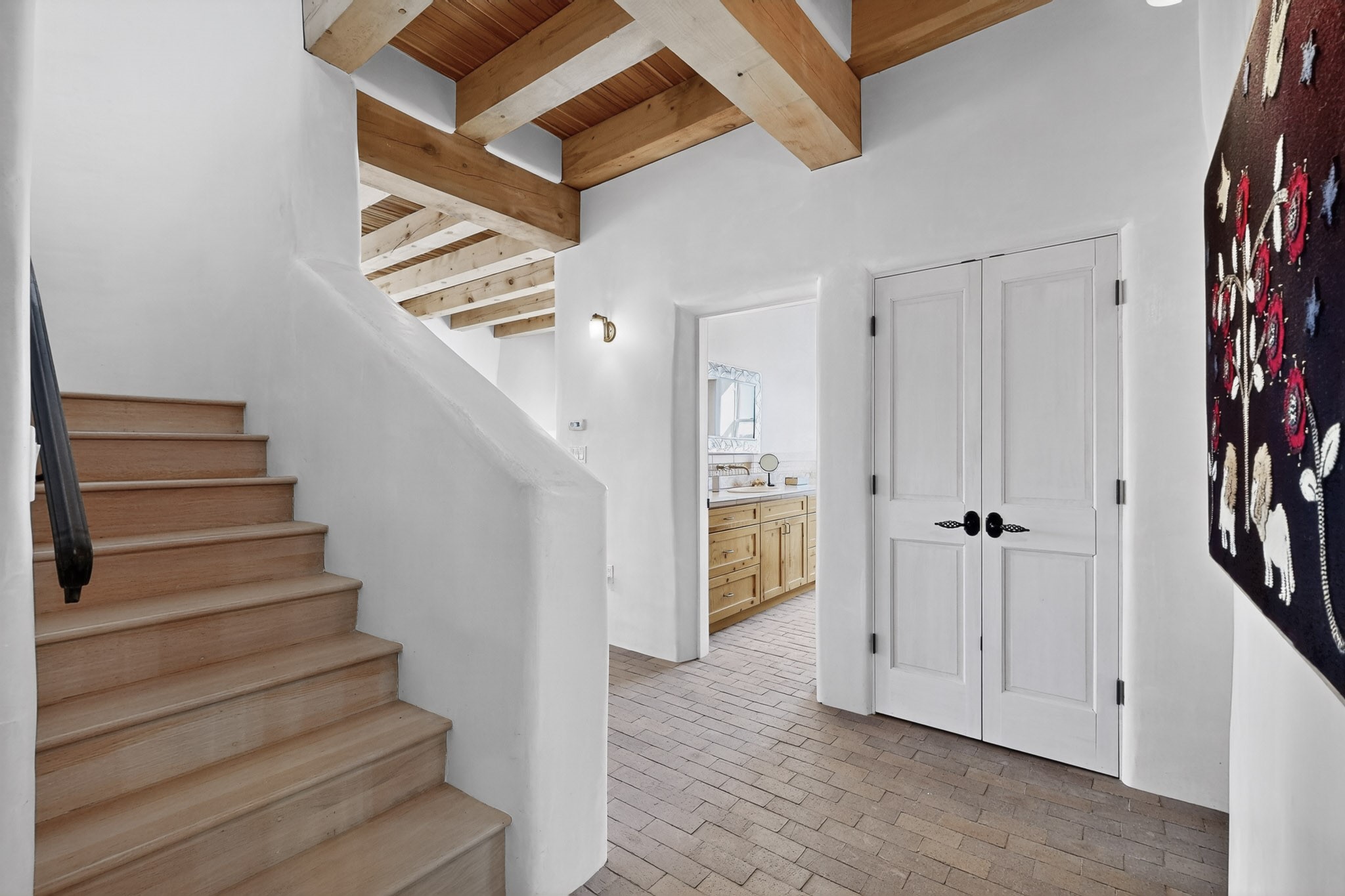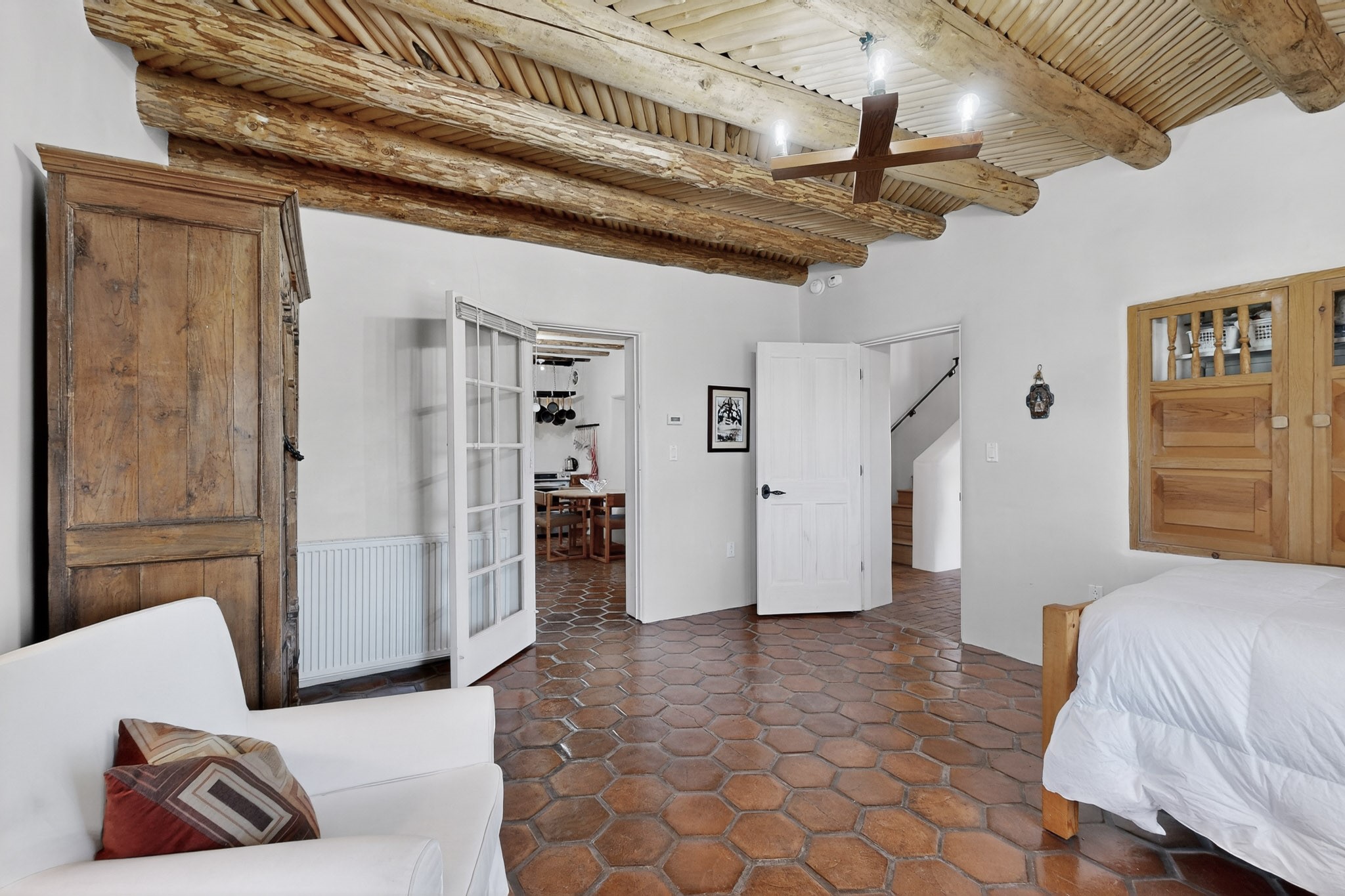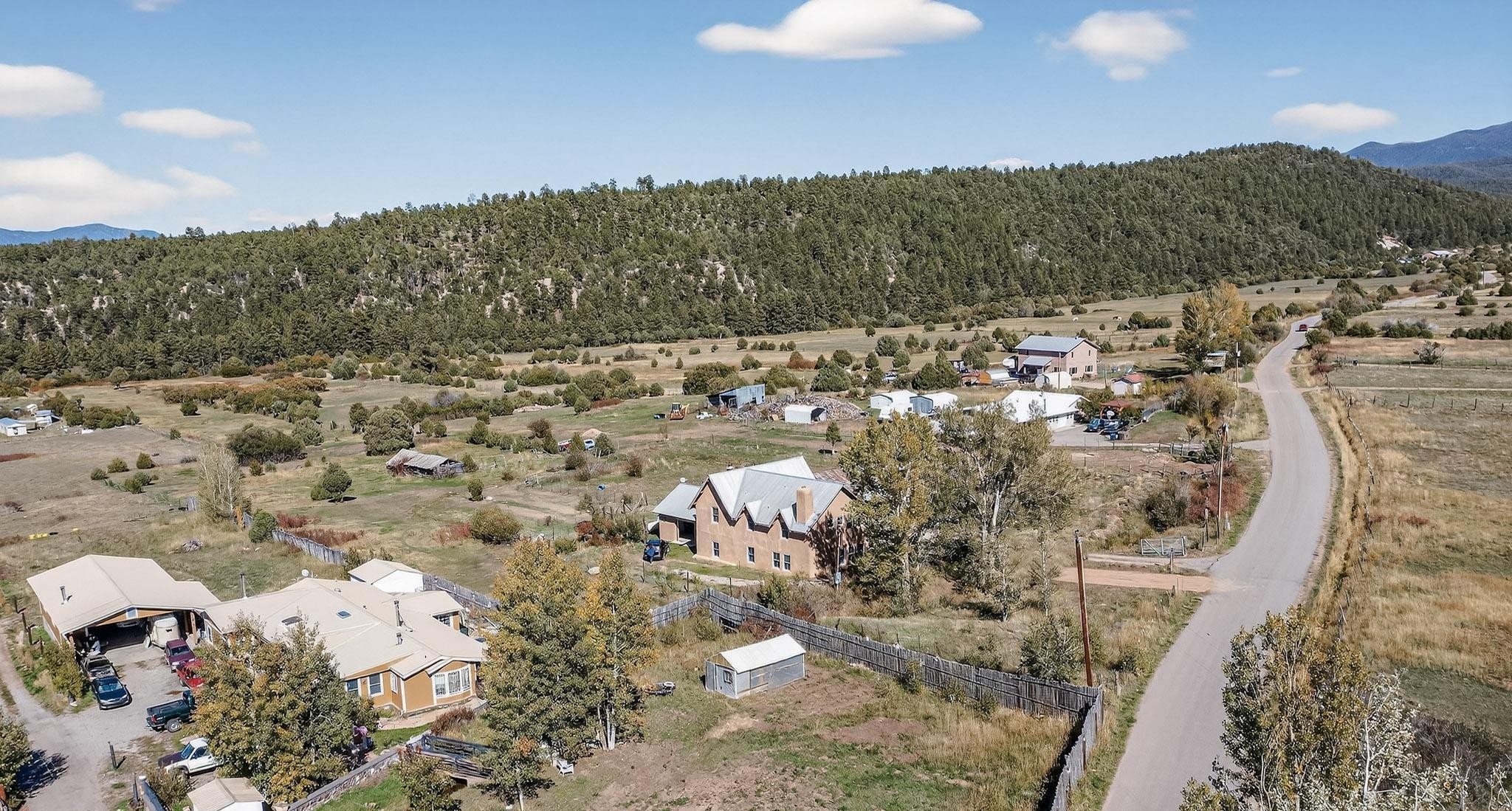 This custom-built Adobe home has spectacular views and easy access on 3.28 acresof premium irrigated land!Offering peace and privacy just minutes from the heart of Truchas, NM, this homeis rich in historyand character. The current owners thoughtfully expanded the original footprintof anadobe farmhouse while preserving the historic details authentic character and solid structure. Three large bedrooms, two upstairs and one on the main level are light, bright and airy. The two updated bathrooms feature walk-in showers, with a soaking tub upstairsand aprivate sauna downstairs for comfort andrelaxation. Features includehandcrafted plaster wallswith nichos,vigas, beams,soaring high ceilingsand gabled windows. Thebrick, saltillo,and white oak flooringwith radiant heat creates warmth and authenticity while aclassic kiva fireplace anchors the living space. . With community water supplemented by valuable ditch rights,the fully fencedpastures are well-suited for horses or small-scale farmingand an old log barn in the pasturespeaks to the history of the land and offers flexible use for storage and animals. Set against the backdrop of the Truchas Peaks, this distinctive Southwestern adobe retreat enjoys beautiful views of the mountainsand surrounding hillsides. The oversized garage offers additionalroom for a workshop with attic storage above. If you are seeking a horse property, a mountain getaway, or a full-time residence that embodies the charm of Northern New Mexicothis home is not to be missed!
