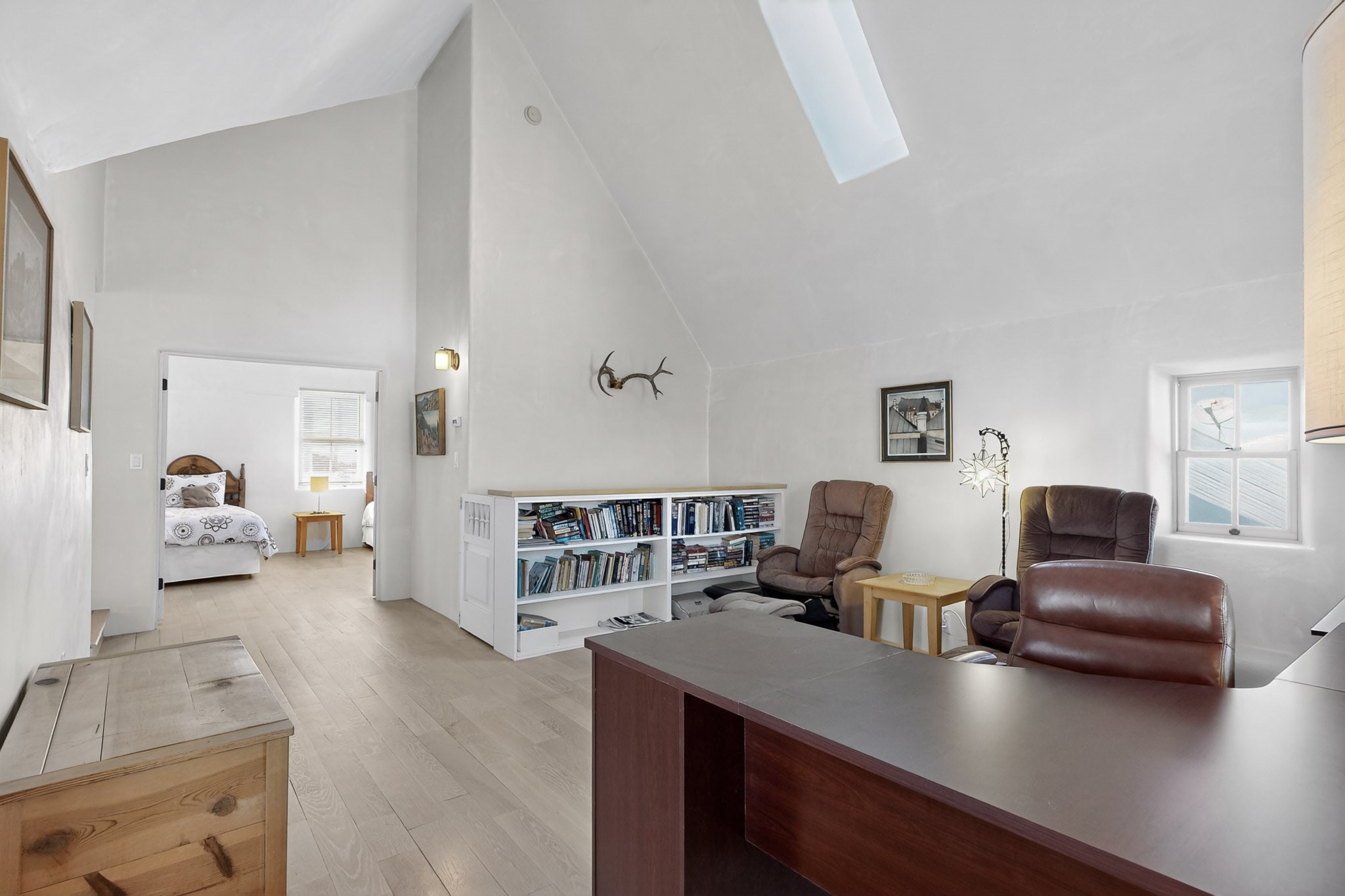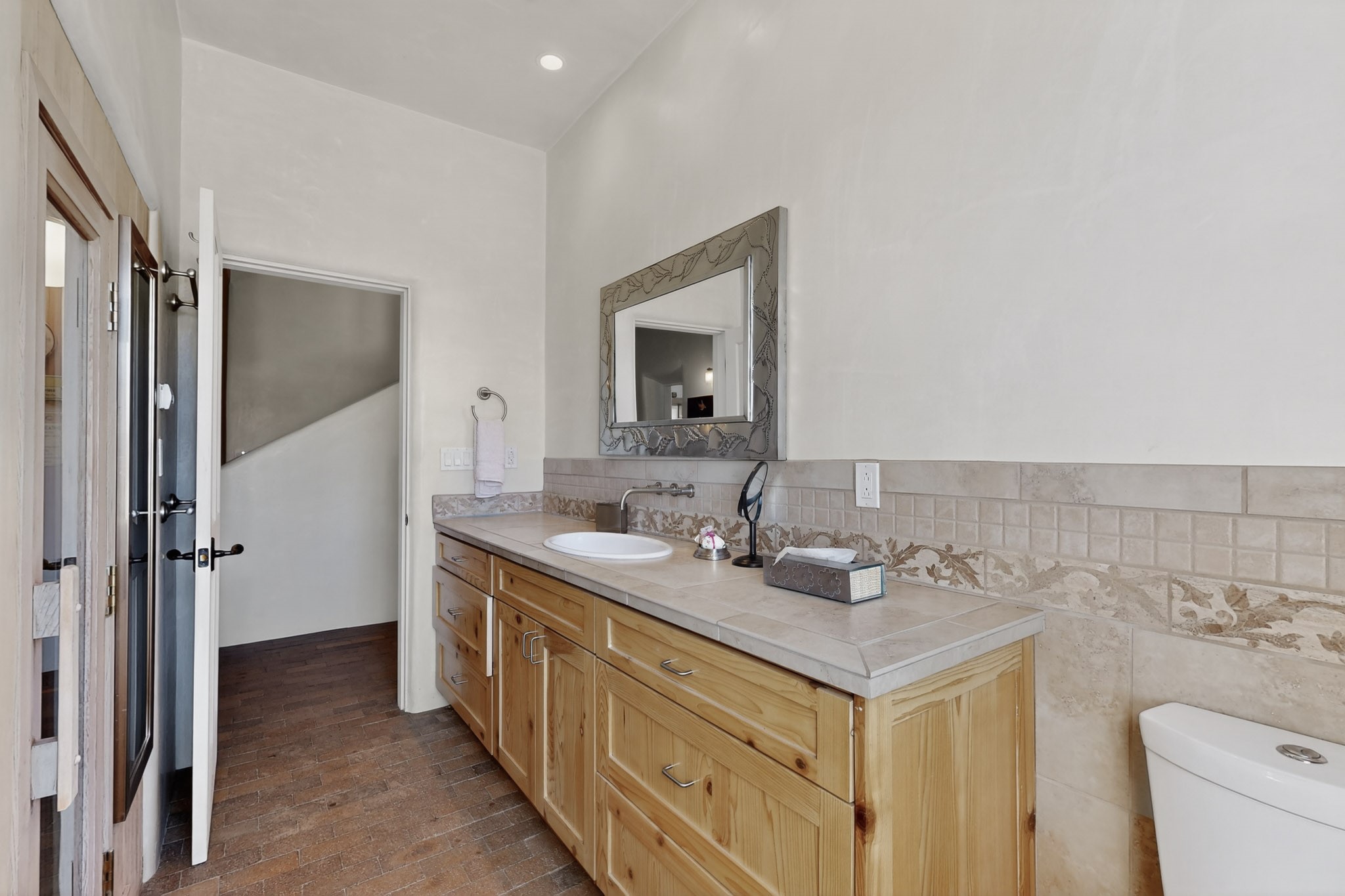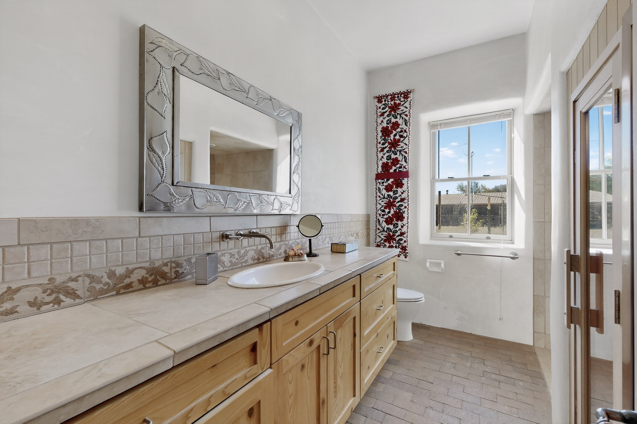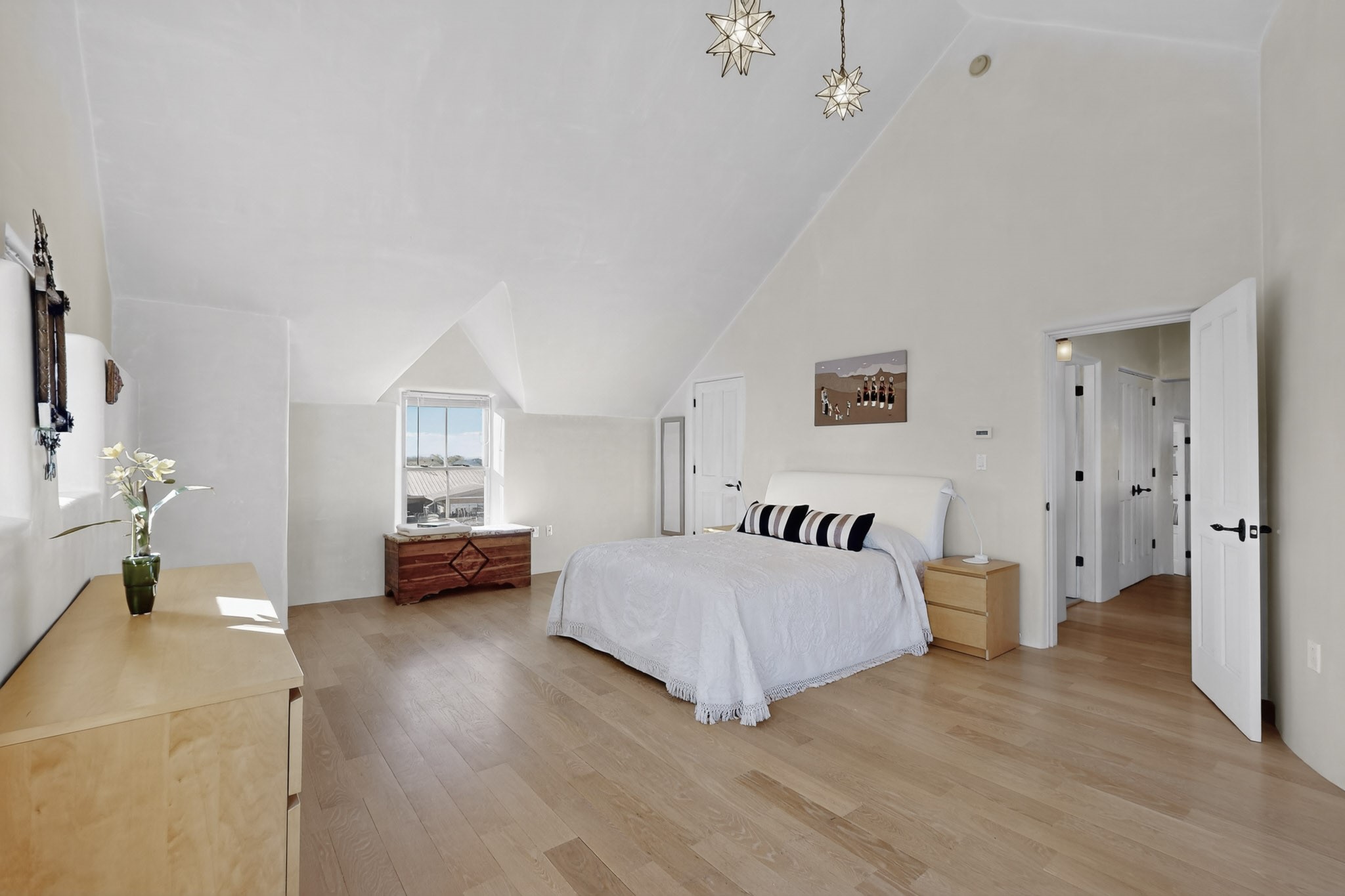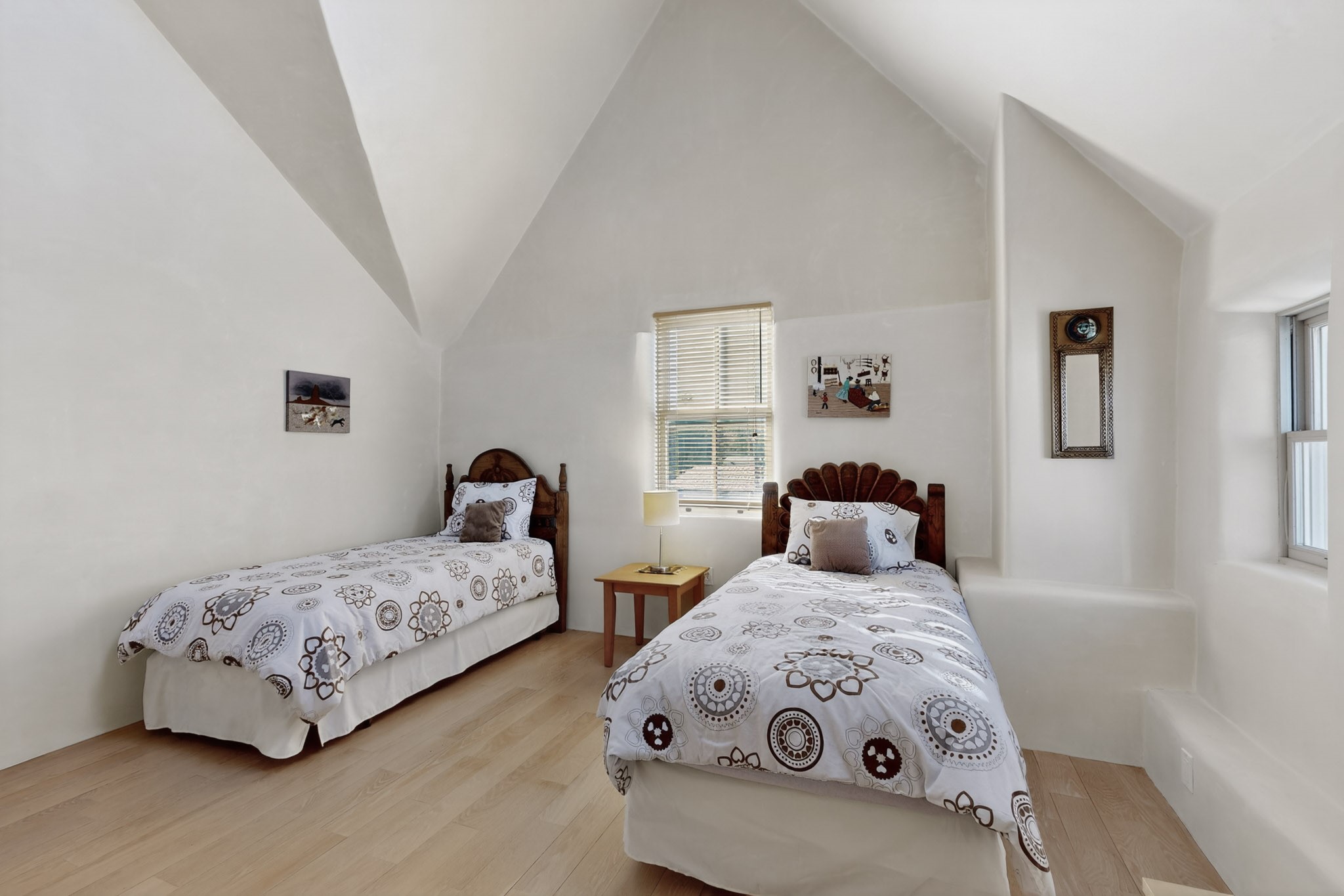This custom-built Adobe home has spectacular views and easy access on 3.28 acresof premium irrigated land!Offering peace and privacy just minutes from the heart of Truchas, NM, this homeis rich in historyand character. The current owners thoughtfully expanded the original footprintof anadobe farmhouse while preserving the historic details authentic character and solid structure. Three large bedrooms, two upstairs and one on the main level are light, bright and airy. The two updated bathrooms feature walk-in showers, with a soaking tub upstairsand aprivate sauna downstairs for comfort andrelaxation. Features includehandcrafted plaster wallswith nichos,vigas, beams,soaring high ceilingsand gabled windows. Thebrick, saltillo,and white oak flooringwith radiant heat creates warmth and authenticity while aclassic kiva fireplace anchors the living space. . With community water supplemented by valuable ditch rights,the fully fencedpastures are well-suited for horses or small-scale farmingand an old log barn in the pasturespeaks to the history of the land and offers flexible use for storage and animals. Set against the backdrop of the Truchas Peaks, this distinctive Southwestern adobe retreat enjoys beautiful views of the mountainsand surrounding hillsides. The oversized garage offers additionalroom for a workshop with attic storage above. If you are seeking a horse property, a mountain getaway, or a full-time residence that embodies the charm of Northern New Mexicothis home is not to be missed!