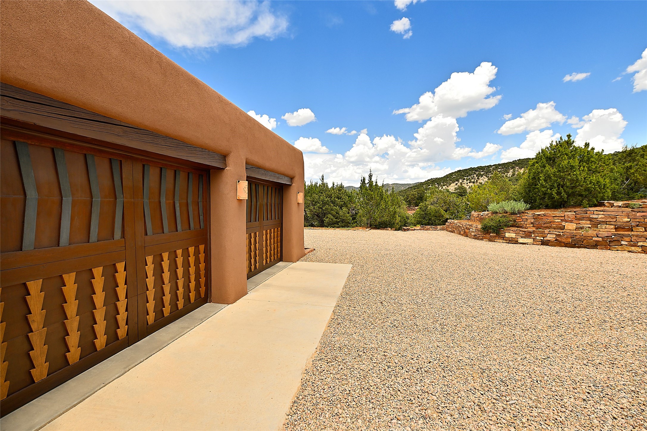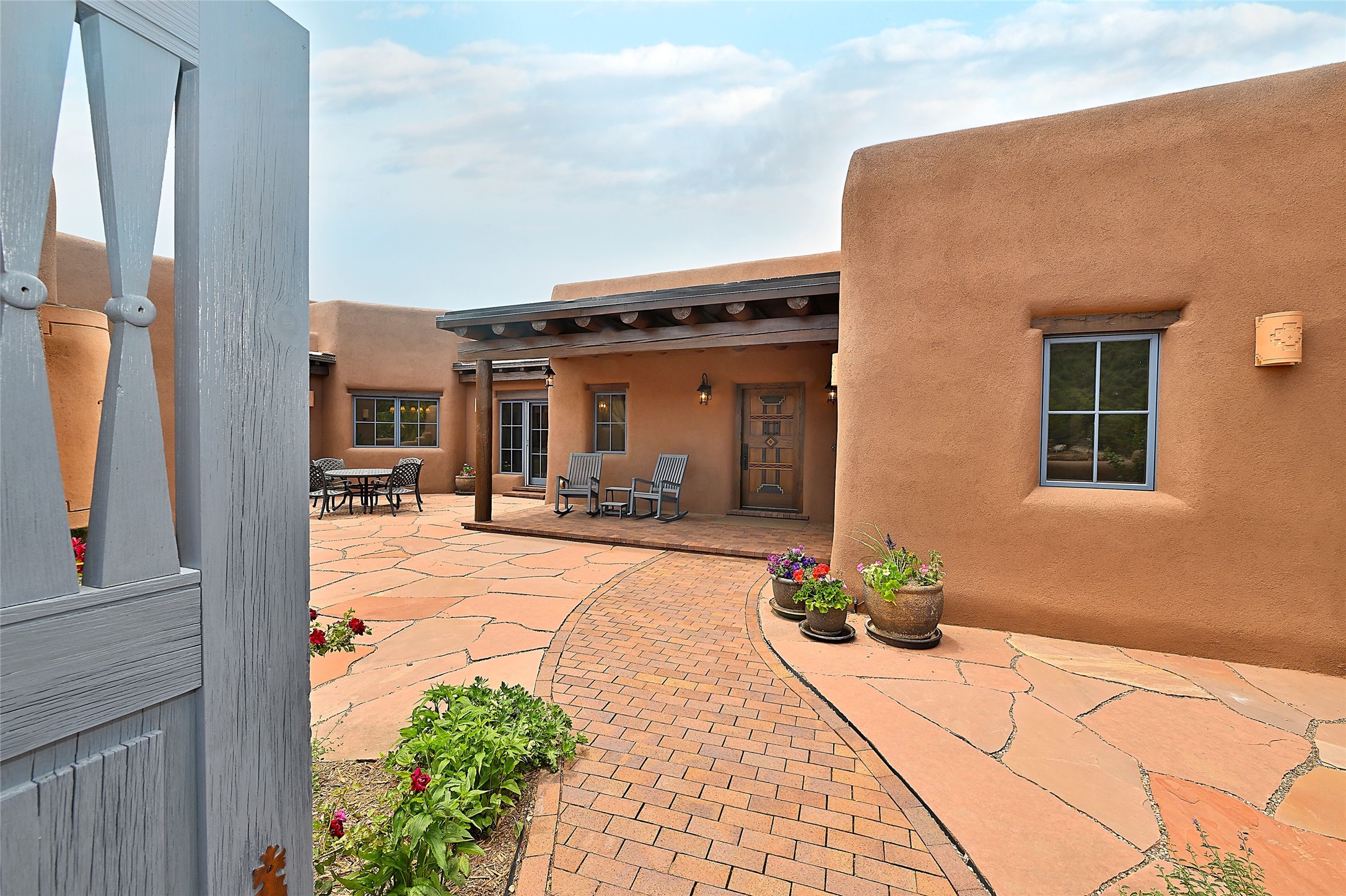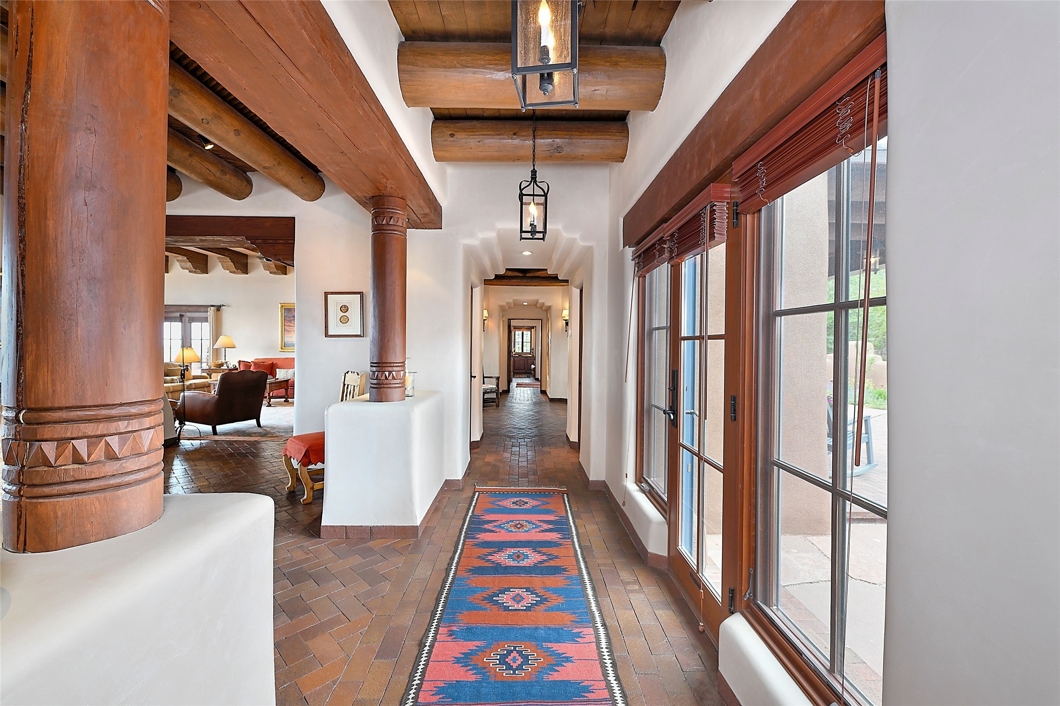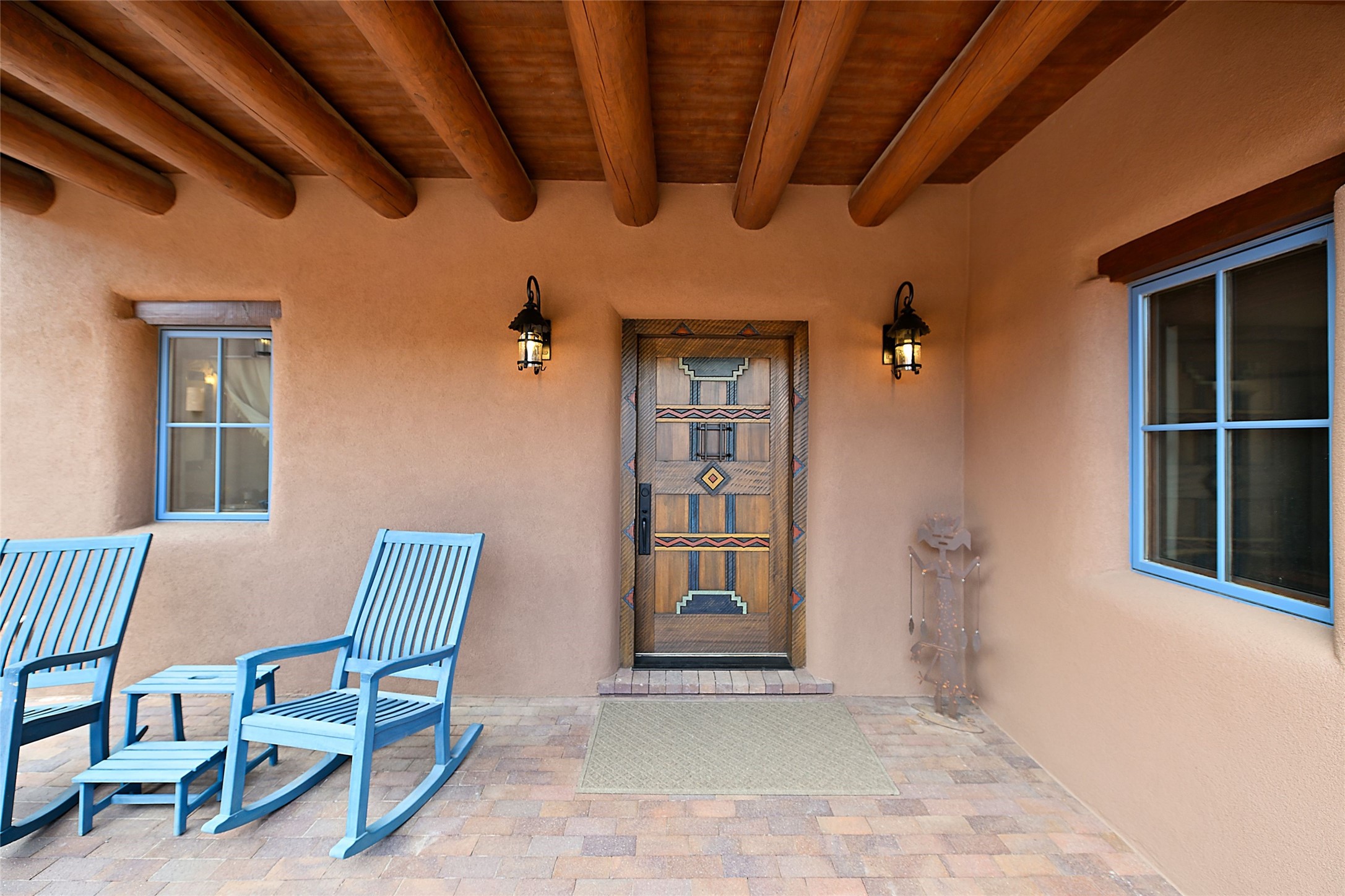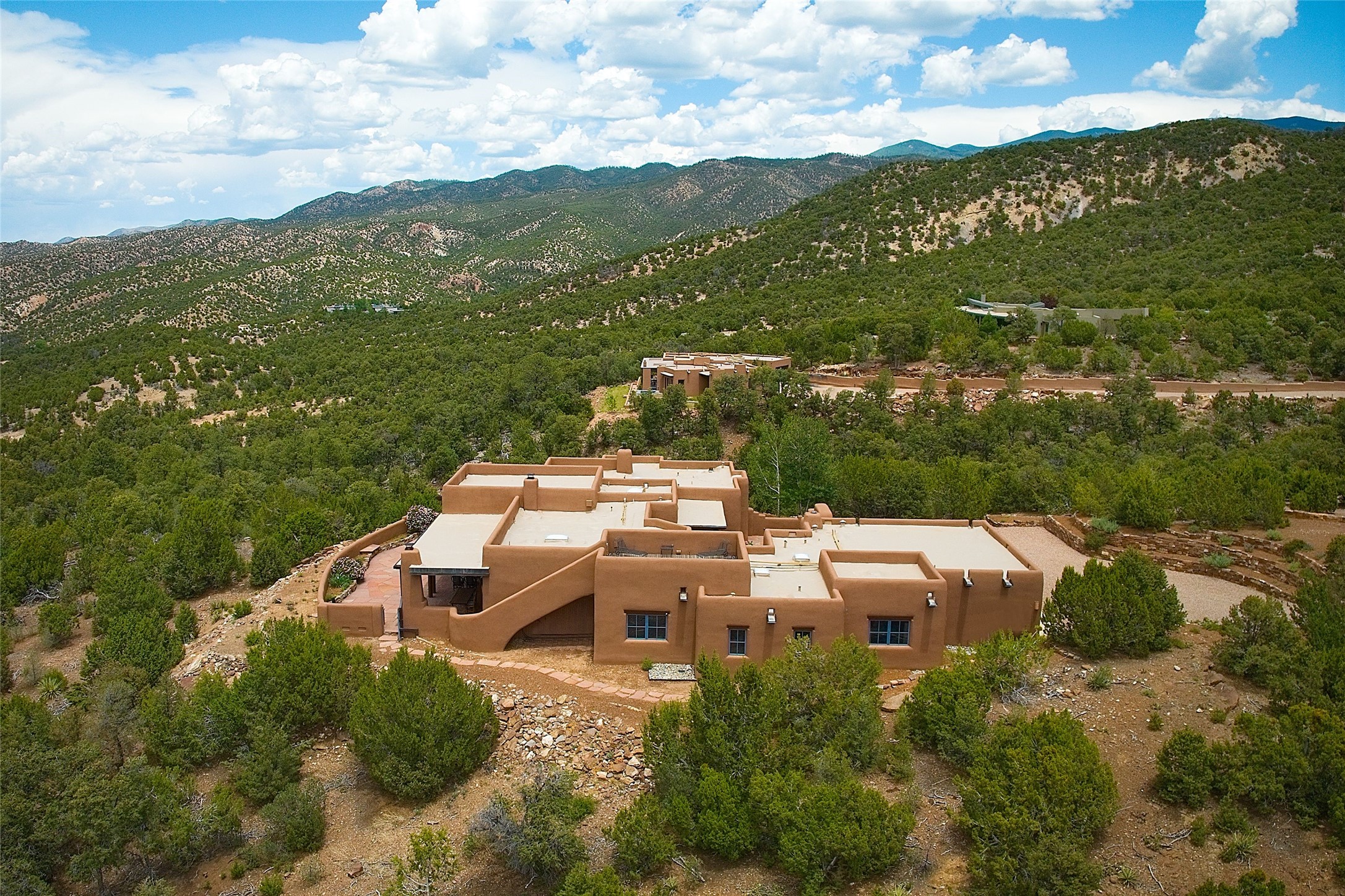 A true masterpiece of Spanish Pueblo architecture, this exceptional residence in Bishop's Lodge Hills is a stunning collaboration between acclaimed architect Ed Boniface and master builder Will Prull. Designed and constructed in 2007 for the current owner, with meticulous attention to detail, this home seamlessly blends traditional craftsmanship with modern luxury, all while capturing commanding views of the surrounding mountains and breathtaking sunsets. Upon entering the foyer, guests are enveloped in a space inspired by the sacred geometry of a Navajo Hogan, setting the tone for the rich architectural heritage woven throughout the home. The grand living room boasts soaring beamed ceilings supported by hand-carved corbels, while a striking fireplace design--borrowed from ancient traditions--serves as a warm and welcoming focal point. The formal dining area opens gracefully onto the Grand Portal, which leads to an expansive rooftop deck, offering panoramic vistas that define Santa Fe's unparalleled beauty. The chef's kitchen is a showpiece of authenticity and elegance, featuring antiqued custom cabinetry, classic tile countertops and custom carved backsplashes, and top-of-the-line Viking Stainless appliances. At its heart sits a black walnut-topped center island--both functional and visually stunning--complemented by an adjacent breakfast room that overlooks the walled entry courtyard, creating an intimate space for morning gatherings. The luxurious primary suite is a retreat unto itself, complete with a charming gas Kiva fireplace, two spa-like baths, and two walk-in closets. A separate office, situated within the primary wing, provides the perfect setting for focus and creativity. On the opposite wing, comfortable guest suites ensure privacy and tranquility, making this home an ideal sanctuary for both residents and visitors alike. Every aspect of this home's design and construction reflects an extraordinary commitment to craftsmanship, authenticity, and architectural excellence.