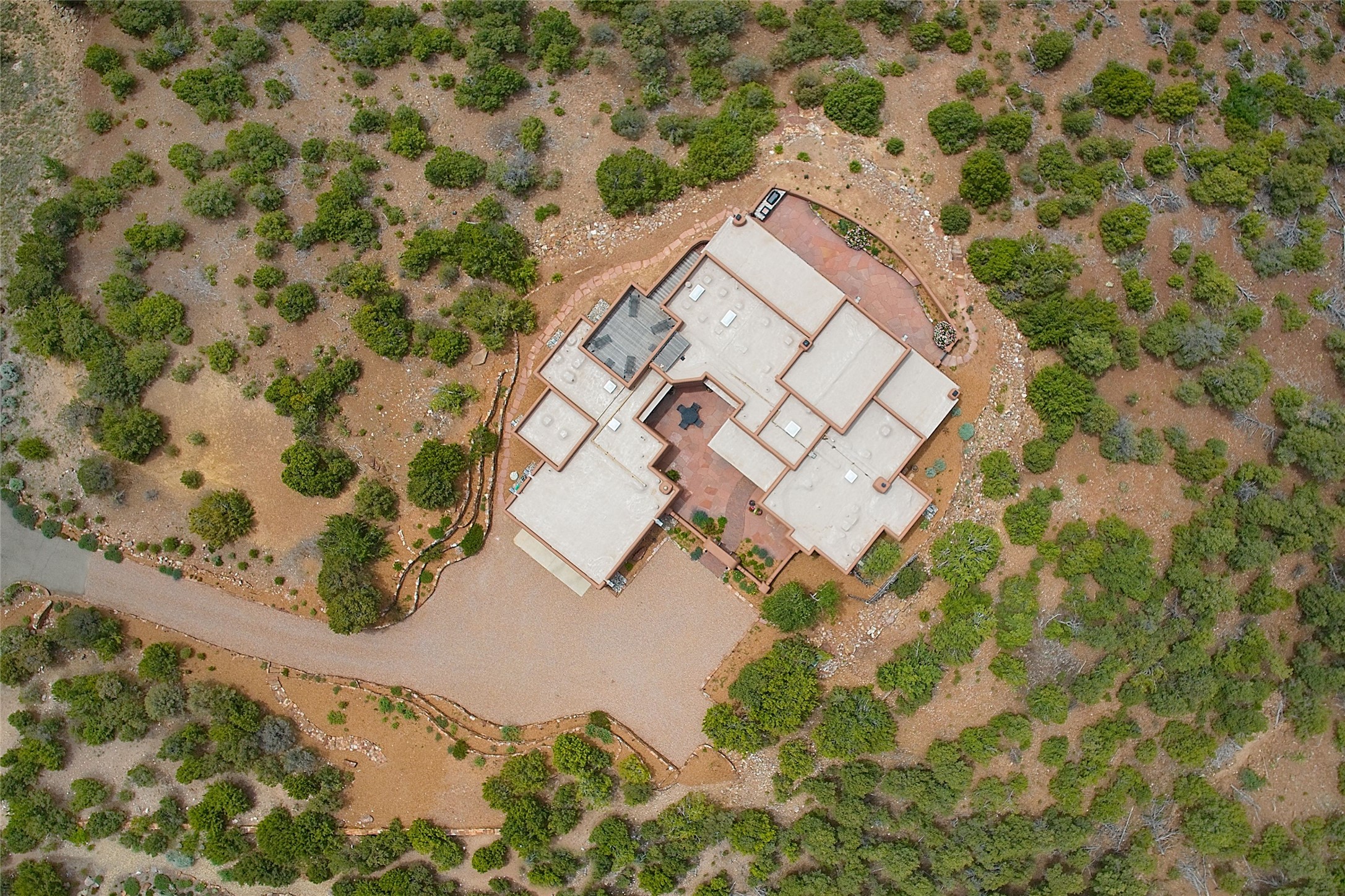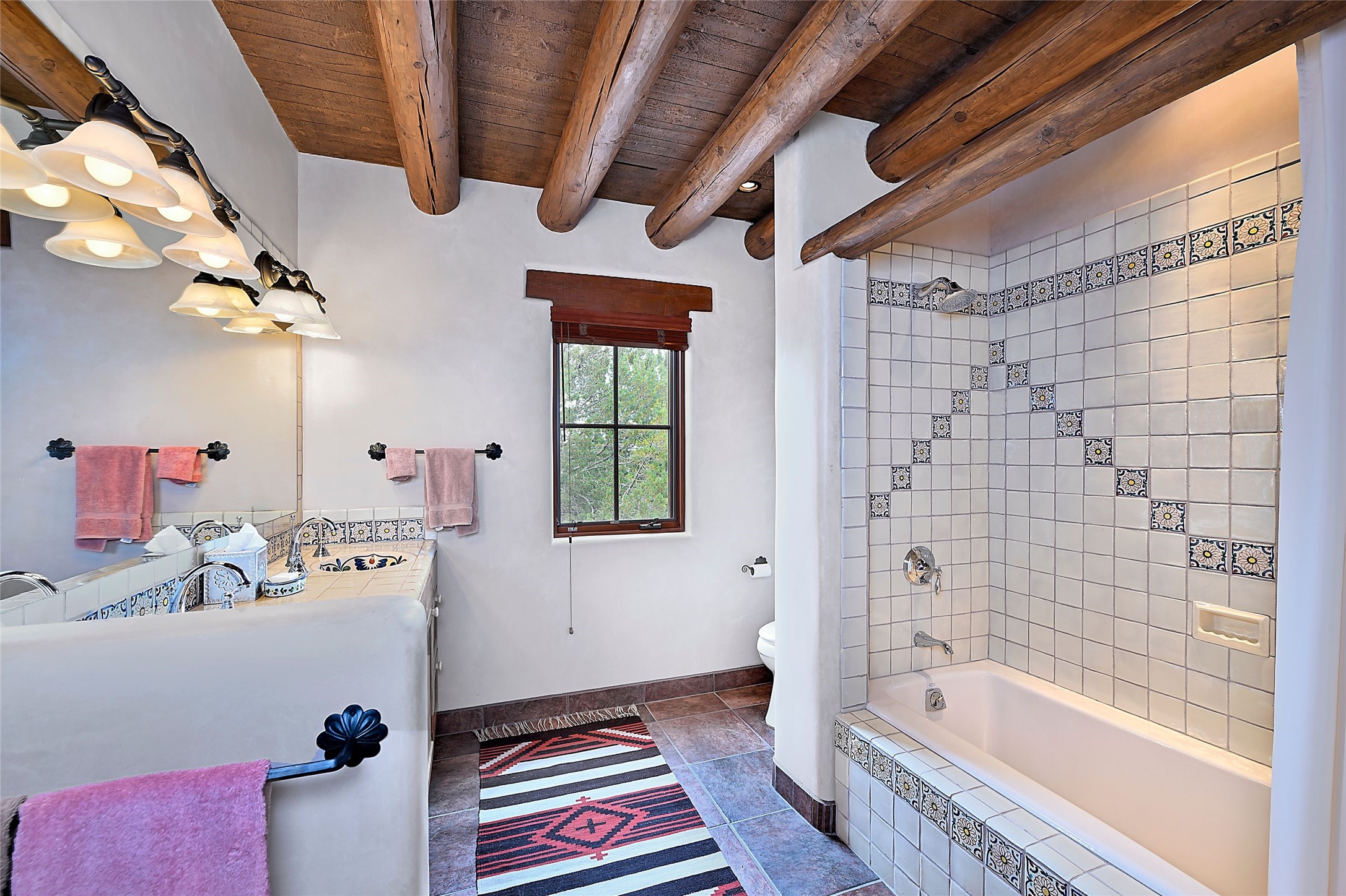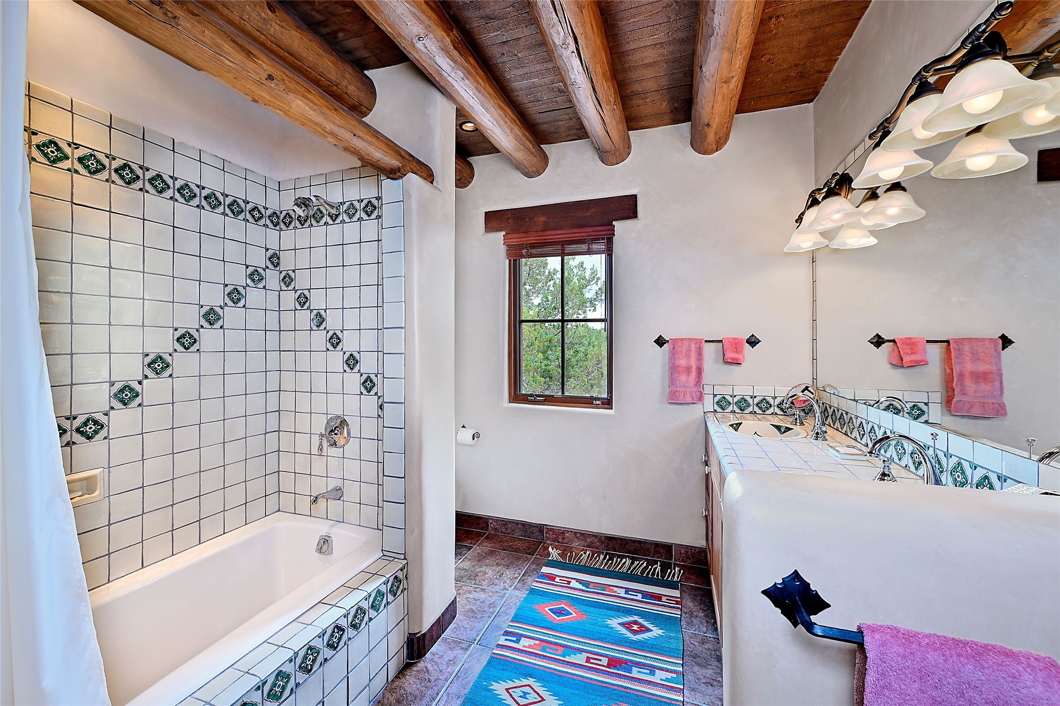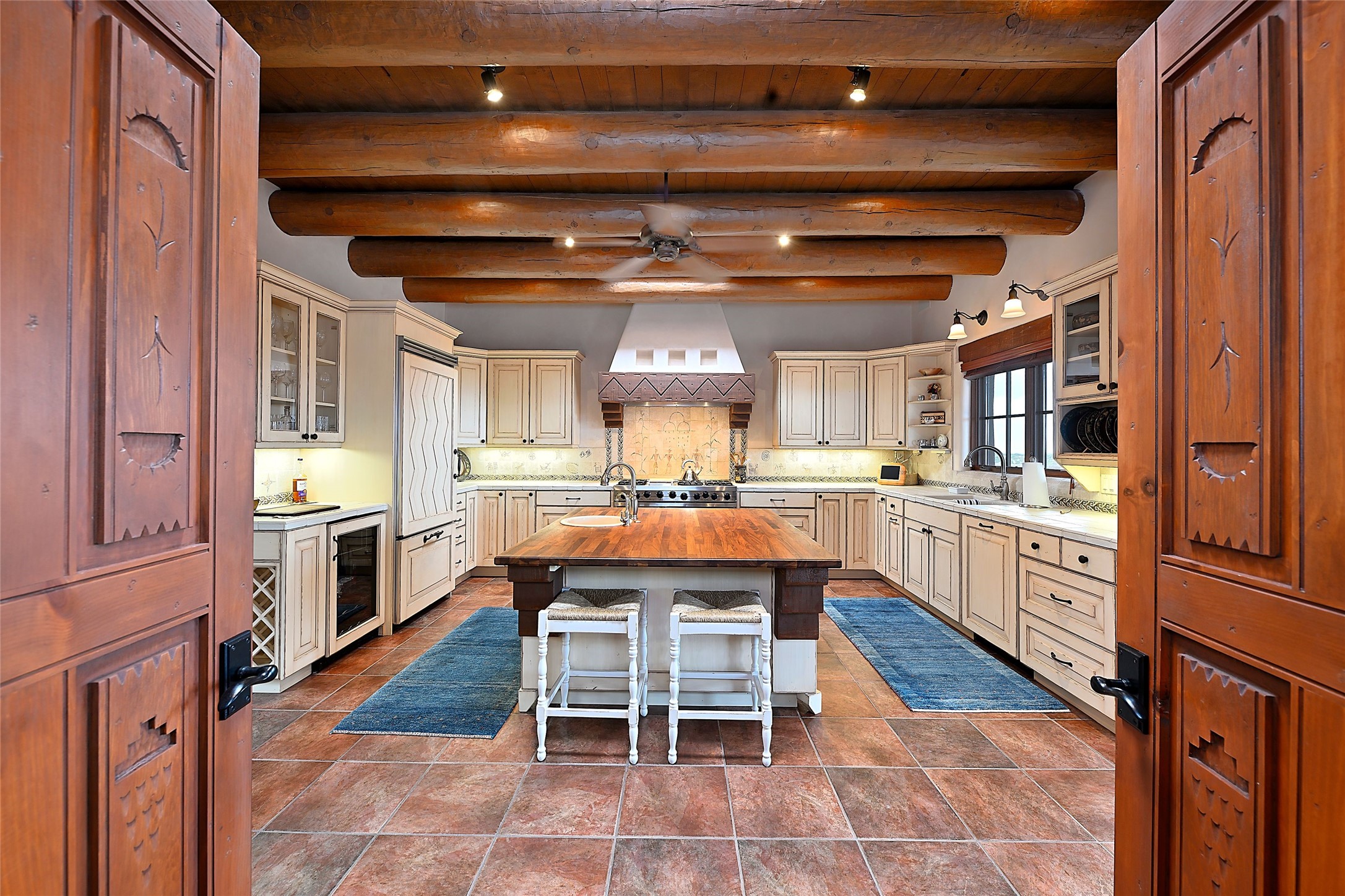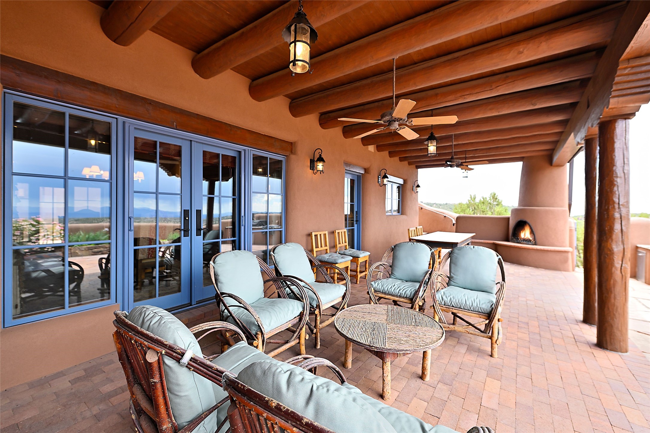 A true masterpiece of Spanish Pueblo architecture, this exceptional residence in Bishop's Lodge Hills is a stunning collaboration between acclaimed architect Ed Boniface and master builder Will Prull. Designed and constructed in 2007 for the current owner, with meticulous attention to detail, this home seamlessly blends traditional craftsmanship with modern luxury, all while capturing commanding views of the surrounding mountains and breathtaking sunsets. Upon entering the foyer, guests are enveloped in a space inspired by the sacred geometry of a Navajo Hogan, setting the tone for the rich architectural heritage woven throughout the home. The grand living room boasts soaring beamed ceilings supported by hand-carved corbels, while a striking fireplace design--borrowed from ancient traditions--serves as a warm and welcoming focal point. The formal dining area opens gracefully onto the Grand Portal, which leads to an expansive rooftop deck, offering panoramic vistas that define Santa Fe's unparalleled beauty. The chef's kitchen is a showpiece of authenticity and elegance, featuring antiqued custom cabinetry, classic tile countertops and custom carved backsplashes, and top-of-the-line Viking Stainless appliances. At its heart sits a black walnut-topped center island--both functional and visually stunning--complemented by an adjacent breakfast room that overlooks the walled entry courtyard, creating an intimate space for morning gatherings. The luxurious primary suite is a retreat unto itself, complete with a charming gas Kiva fireplace, two spa-like baths, and two walk-in closets. A separate office, situated within the primary wing, provides the perfect setting for focus and creativity. On the opposite wing, comfortable guest suites ensure privacy and tranquility, making this home an ideal sanctuary for both residents and visitors alike. Every aspect of this home's design and construction reflects an extraordinary commitment to craftsmanship, authenticity, and architectural excellence.