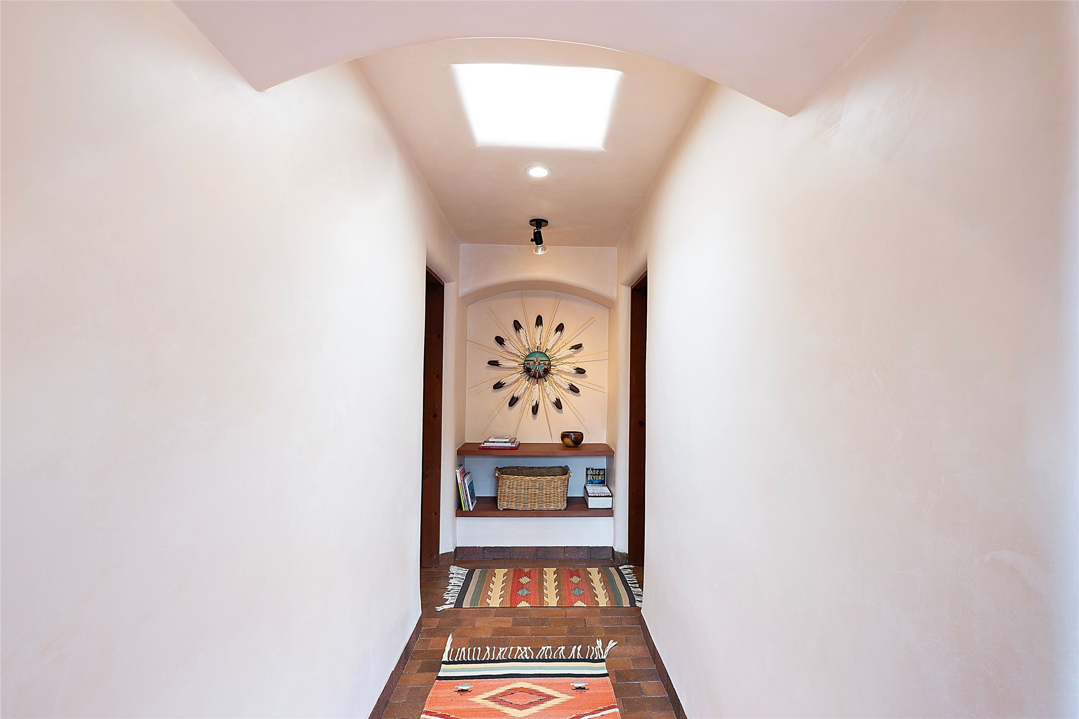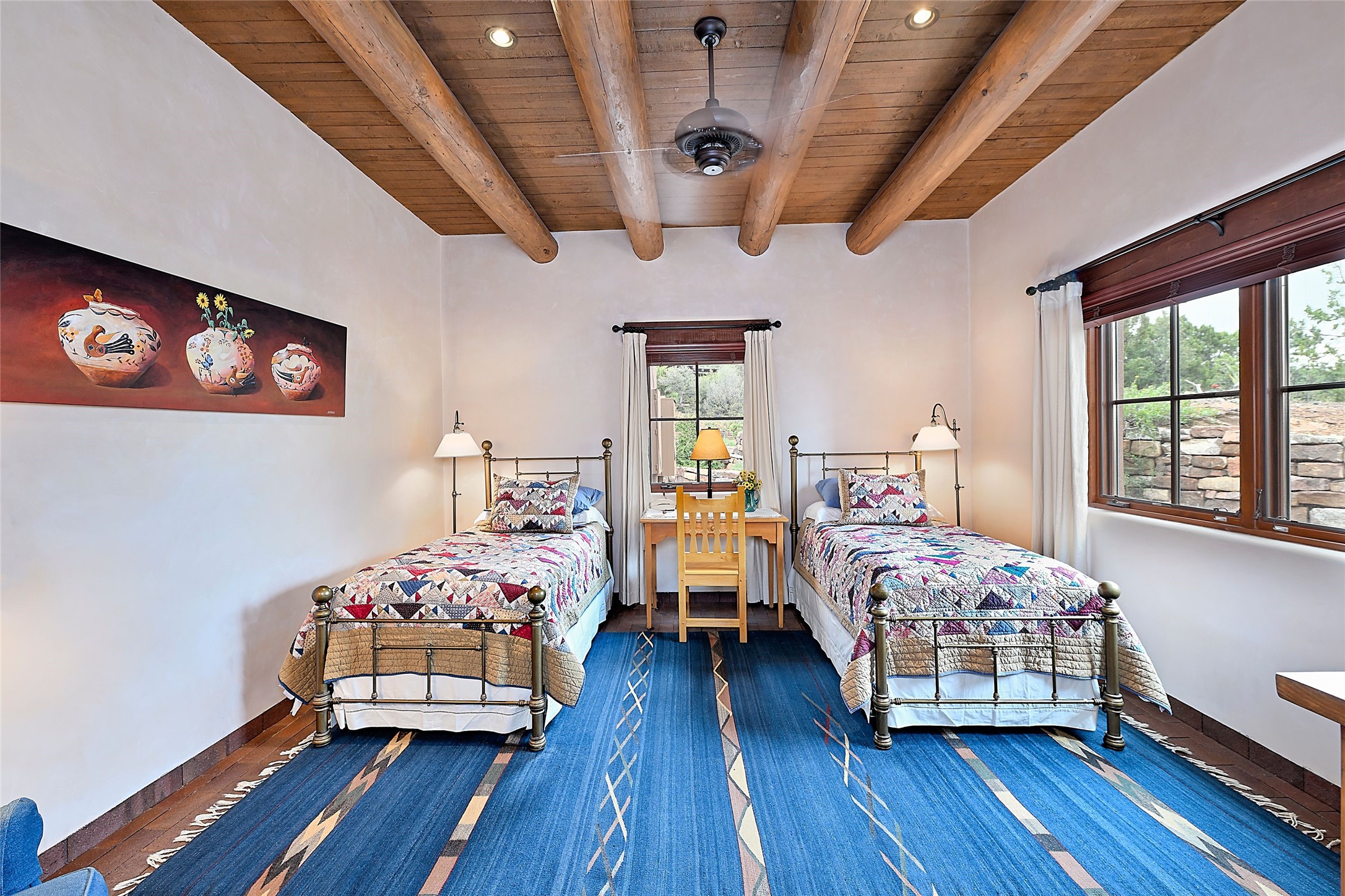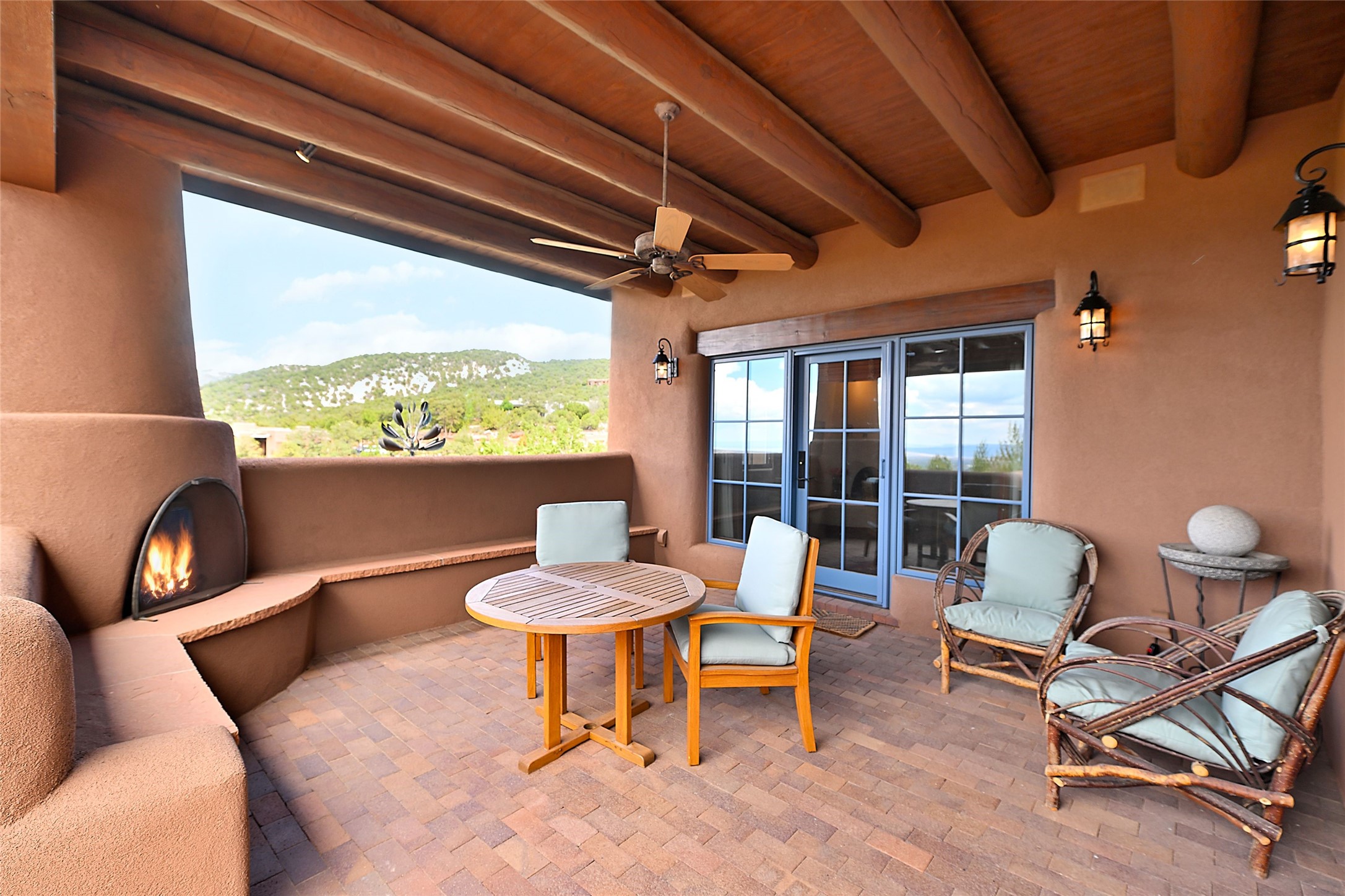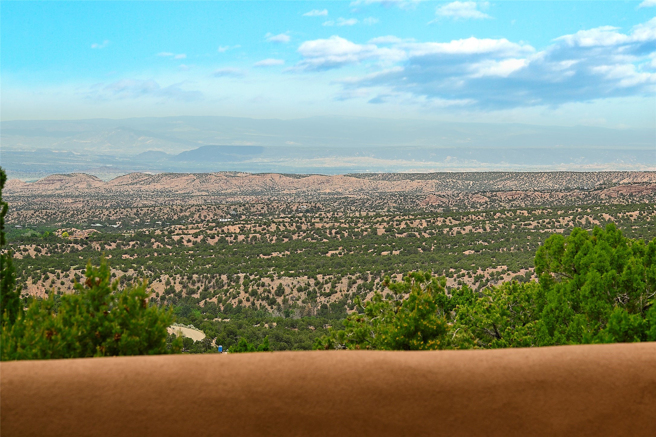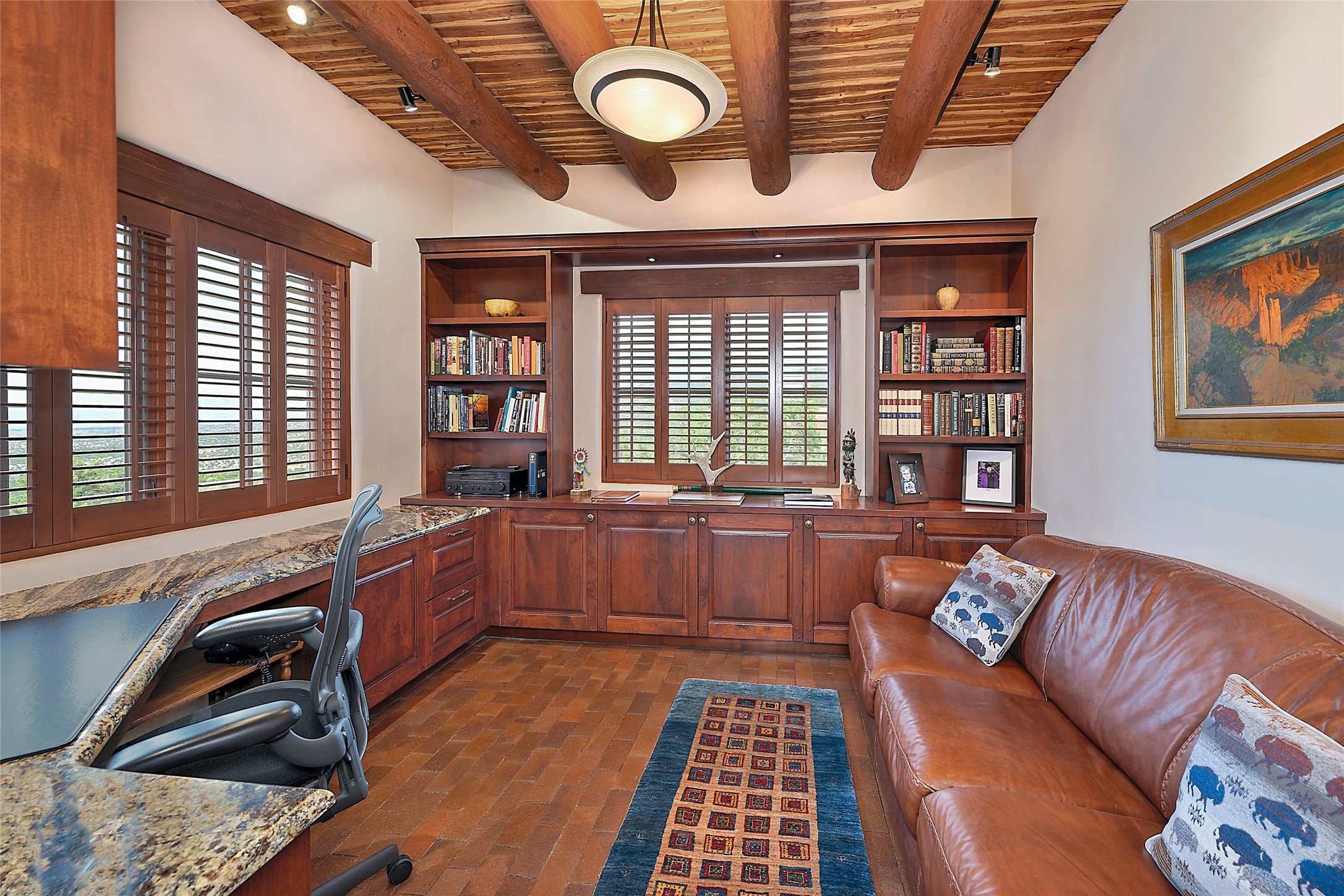 A true masterpiece of Spanish Pueblo architecture, this exceptional residence in Bishop's Lodge Hills is a stunning collaboration between acclaimed architect Ed Boniface and master builder Will Prull. Designed and constructed in 2007 for the current owner, with meticulous attention to detail, this home seamlessly blends traditional craftsmanship with modern luxury, all while capturing commanding views of the surrounding mountains and breathtaking sunsets. Upon entering the foyer, guests are enveloped in a space inspired by the sacred geometry of a Navajo Hogan, setting the tone for the rich architectural heritage woven throughout the home. The grand living room boasts soaring beamed ceilings supported by hand-carved corbels, while a striking fireplace design--borrowed from ancient traditions--serves as a warm and welcoming focal point. The formal dining area opens gracefully onto the Grand Portal, which leads to an expansive rooftop deck, offering panoramic vistas that define Santa Fe's unparalleled beauty. The chef's kitchen is a showpiece of authenticity and elegance, featuring antiqued custom cabinetry, classic tile countertops and custom carved backsplashes, and top-of-the-line Viking Stainless appliances. At its heart sits a black walnut-topped center island--both functional and visually stunning--complemented by an adjacent breakfast room that overlooks the walled entry courtyard, creating an intimate space for morning gatherings. The luxurious primary suite is a retreat unto itself, complete with a charming gas Kiva fireplace, two spa-like baths, and two walk-in closets. A separate office, situated within the primary wing, provides the perfect setting for focus and creativity. On the opposite wing, comfortable guest suites ensure privacy and tranquility, making this home an ideal sanctuary for both residents and visitors alike. Every aspect of this home's design and construction reflects an extraordinary commitment to craftsmanship, authenticity, and architectural excellence.