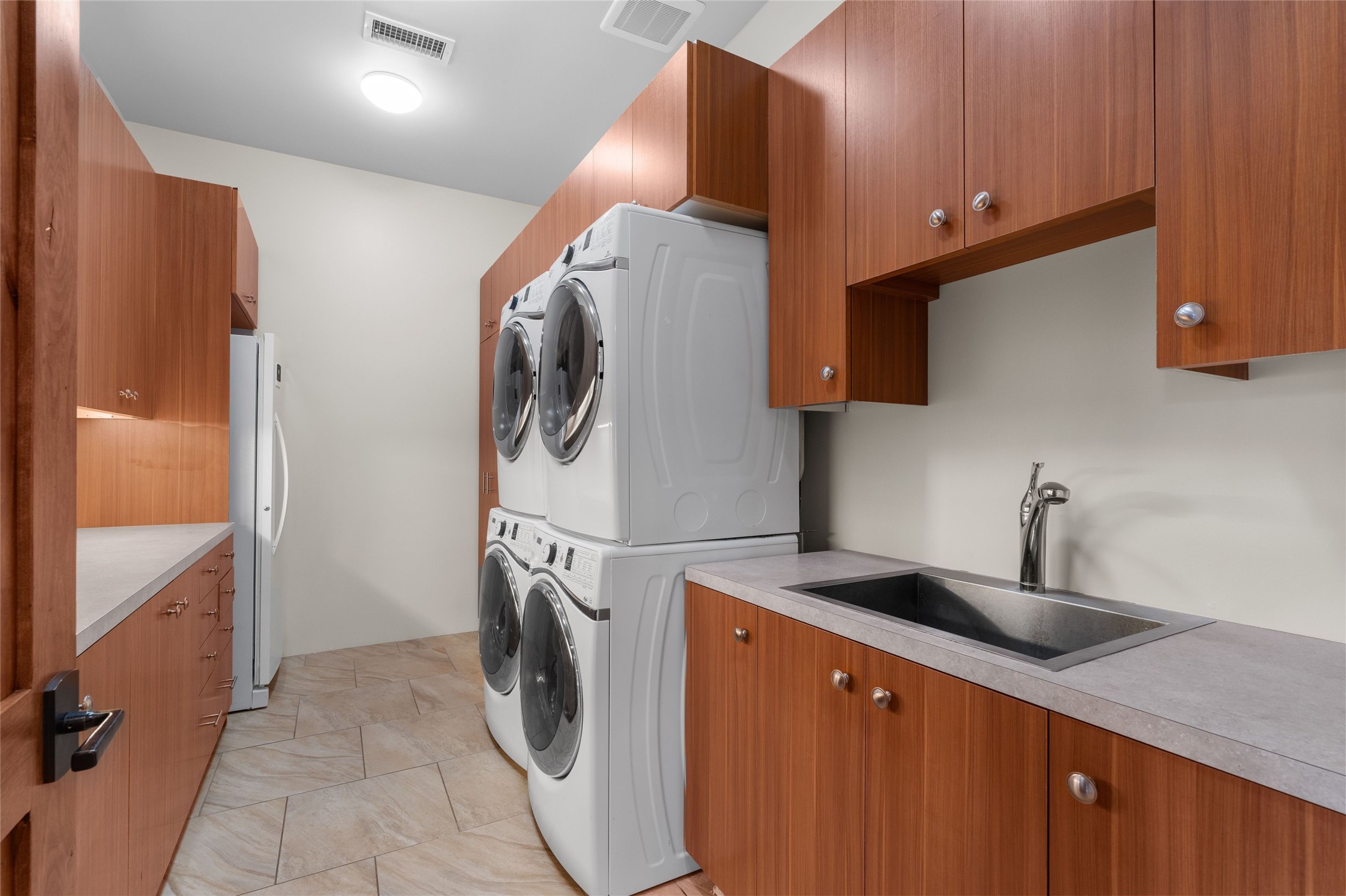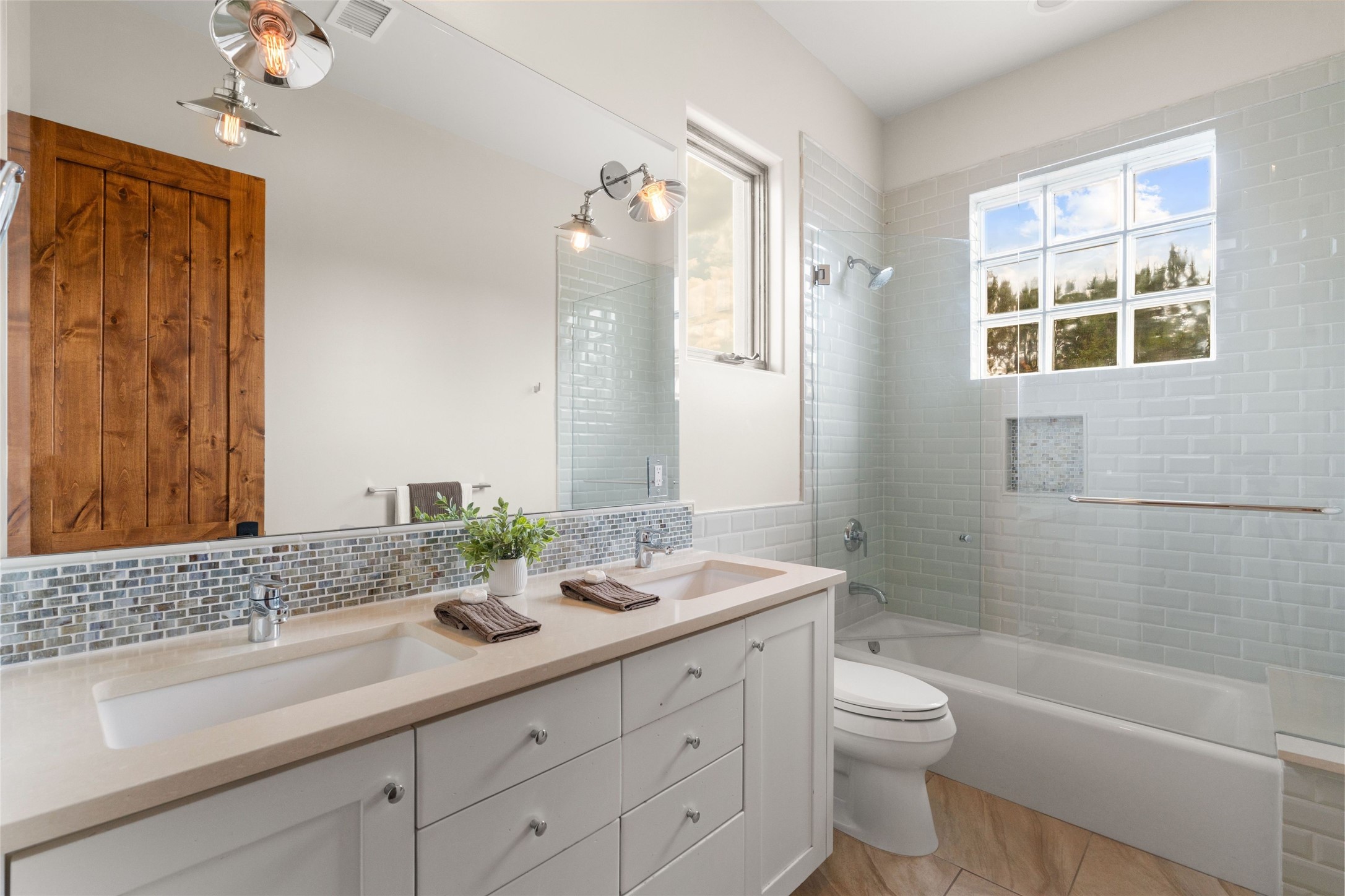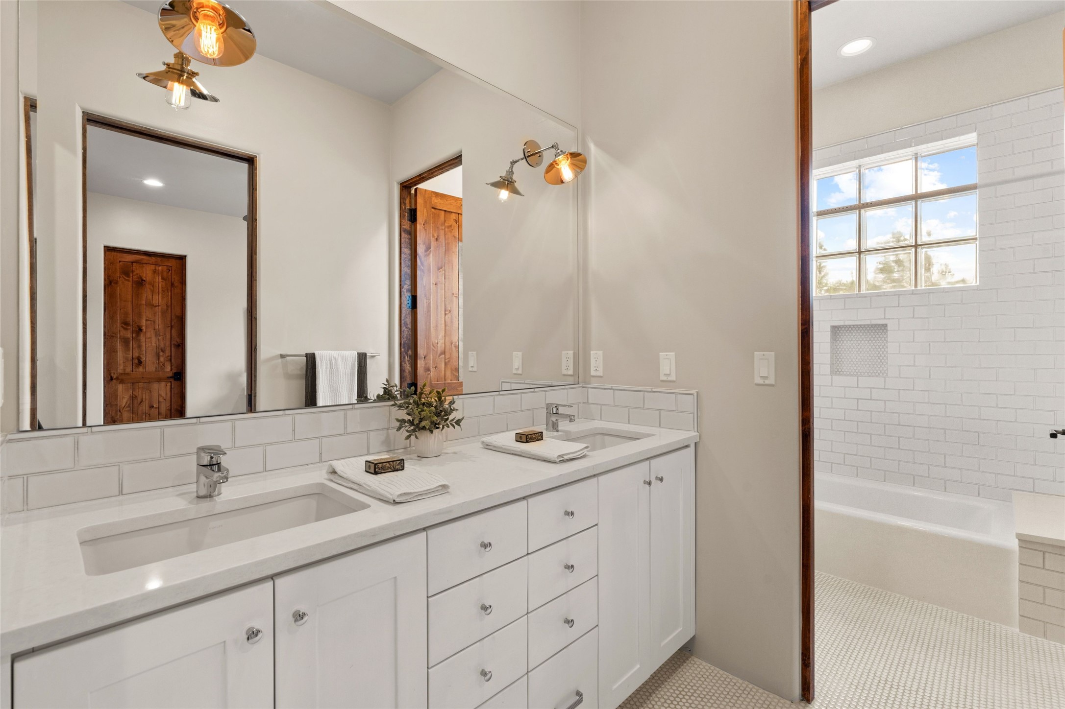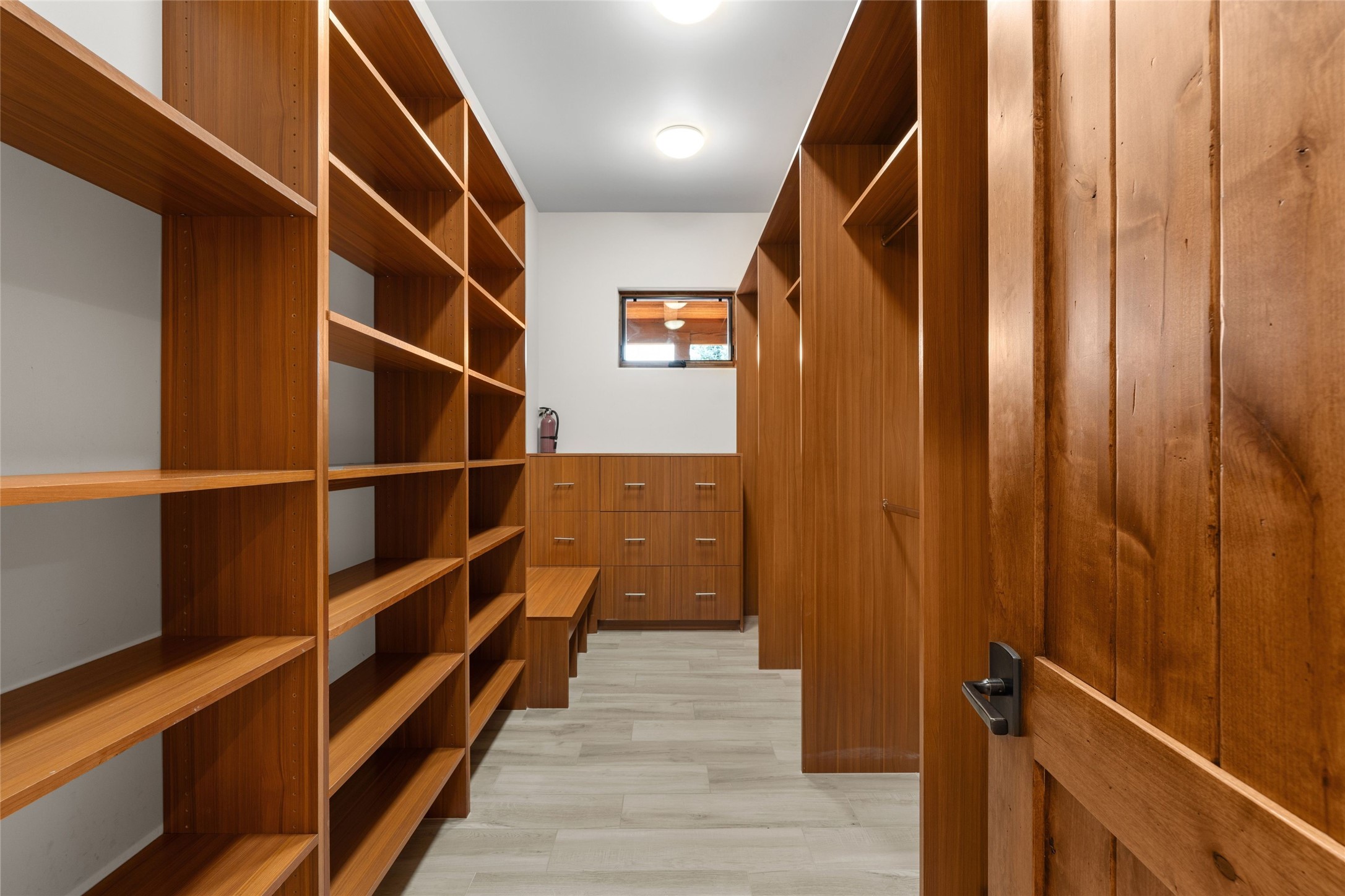 Northern New Mexican style 5-bedroom, 4.5-bath custom-built 5,200 sq. ft. home spanning over 2.5 acres offers panoramic 180-degree views that stretch from the majestic Sangre de Cristo Mountains to the captivating Badlands and Los Alamos.Positioned at the end of a private, gated drive and surrounded by an 8-foot-high coyote fence, this residence is a true entertainer's delight. The open floor plan flows effortlessly into spacious covered and uncovered patios, ideal for hosting both intimate gatherings and grand celebrations. Crafted by Driscoll Construction in 2015, the home showcases bespoke design elements, including custom solid wood doors, white oak flooring, and elegant plaster walls throughout the common areas and primary suite. Enjoy the warmth of three fireplaces, including one on the expansive 1,500 sq. ft. portal, where you can relish both sunrise and sunset vistas.The gourmet kitchen invites culinary creativity with its generous center island, clerestory windows, premium appliances, and double dishwashers. Prioritize wellness with a primary bath steam shower, a 300 sq. ft. gym, an outdoor 6-person sauna, a vegetable garden on drip irrigation, and a fully enclosed chicken coop.Additional highlights include a pitched metal roof, an oversized 3-car garage, photovoltaic solar energy, and rainwater harvesting. Recent upgrades in 2023 encompass new stucco, water filtration, a dog run, and an outdoor grill. Enjoy convenient access to downtown Santa Fe, all while embracing the serene beauty of this exceptional property.