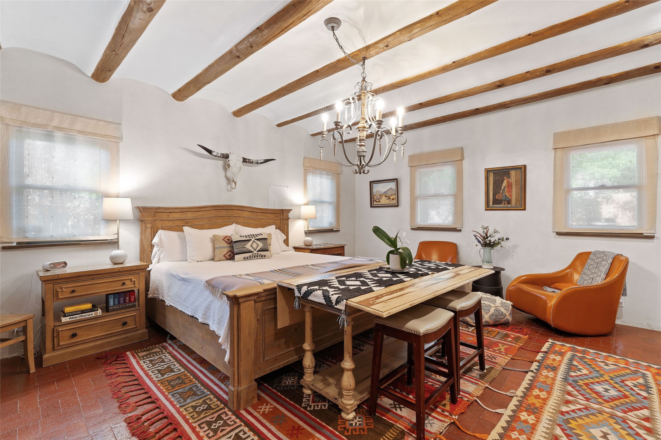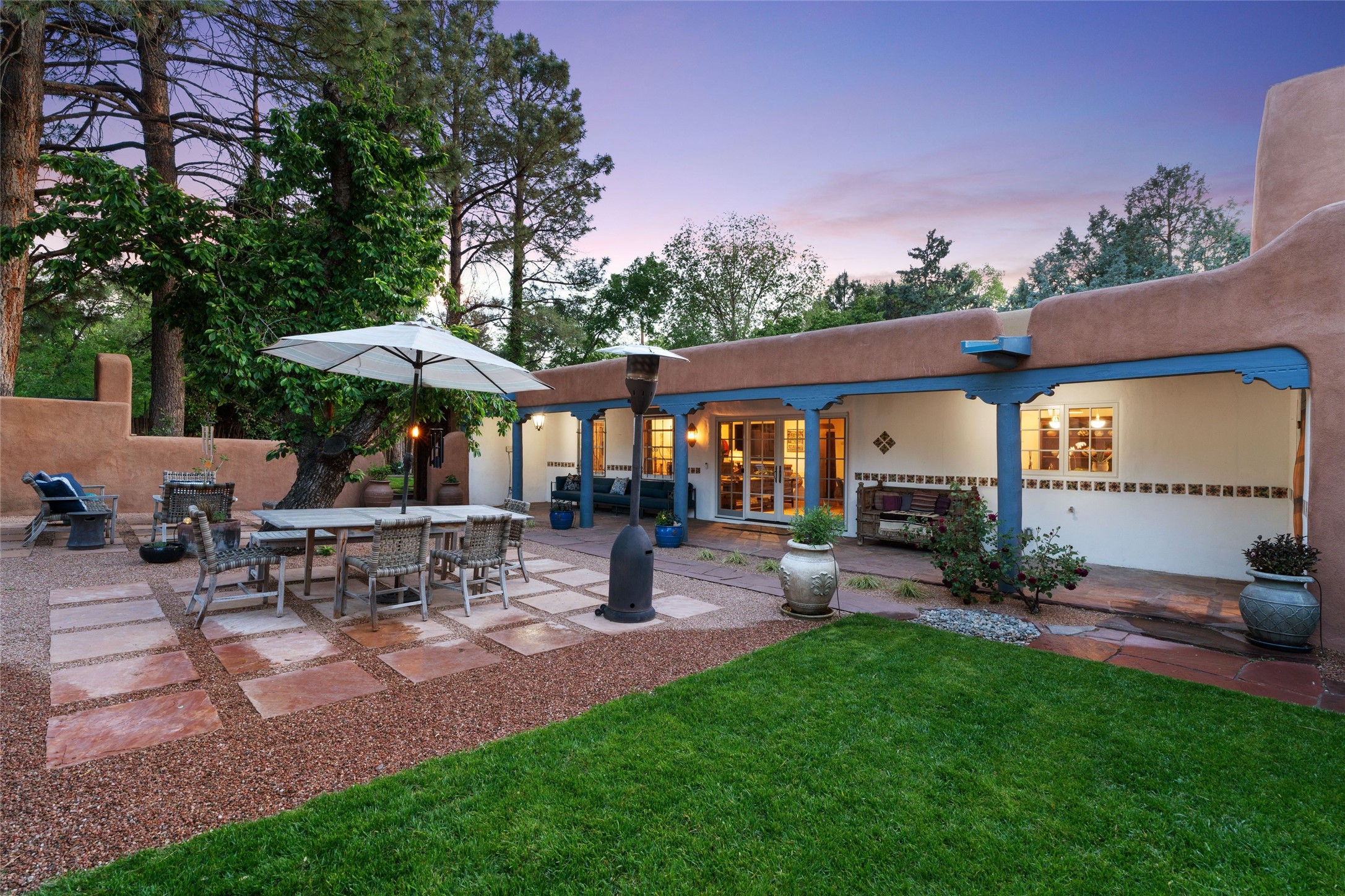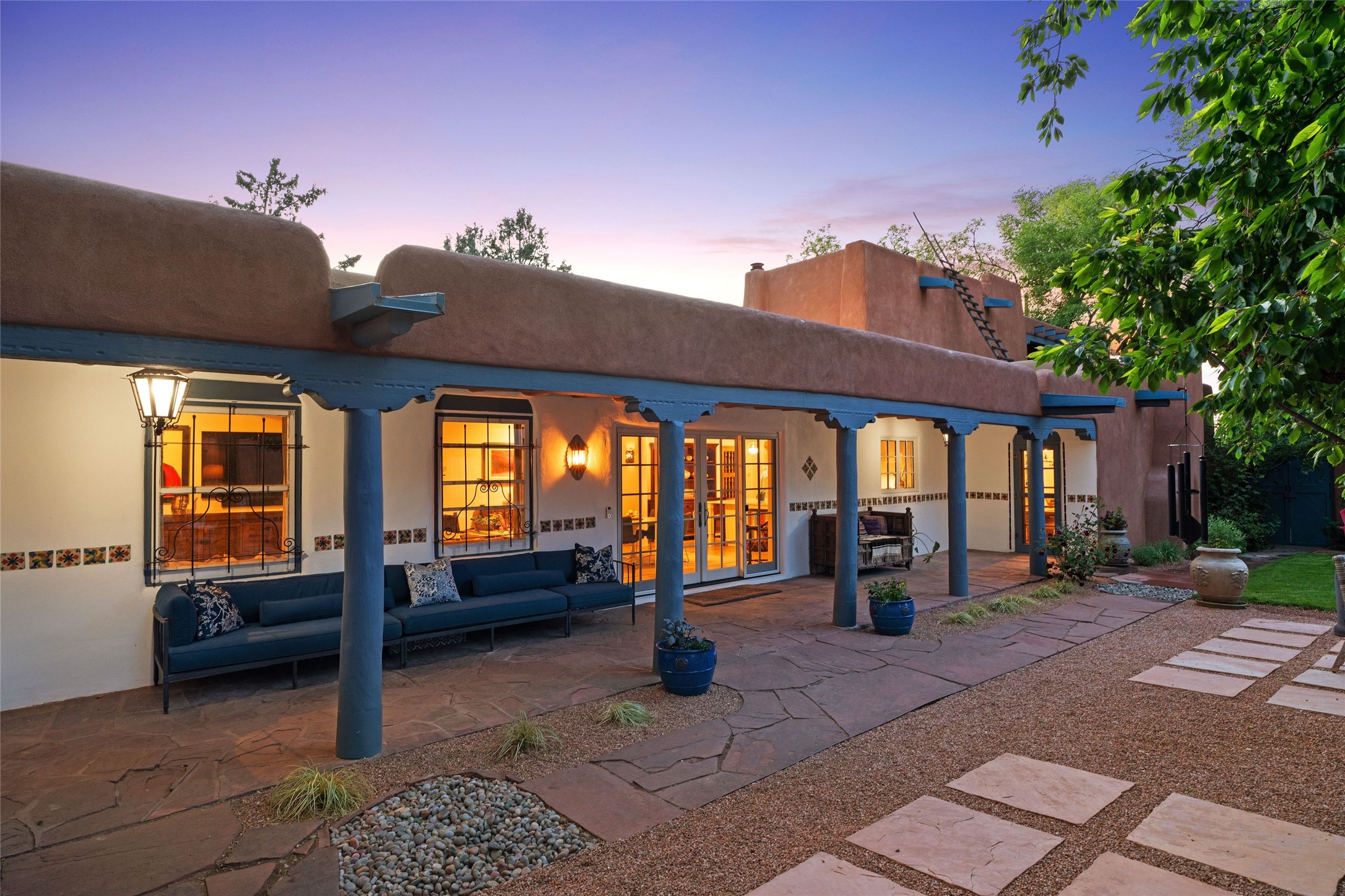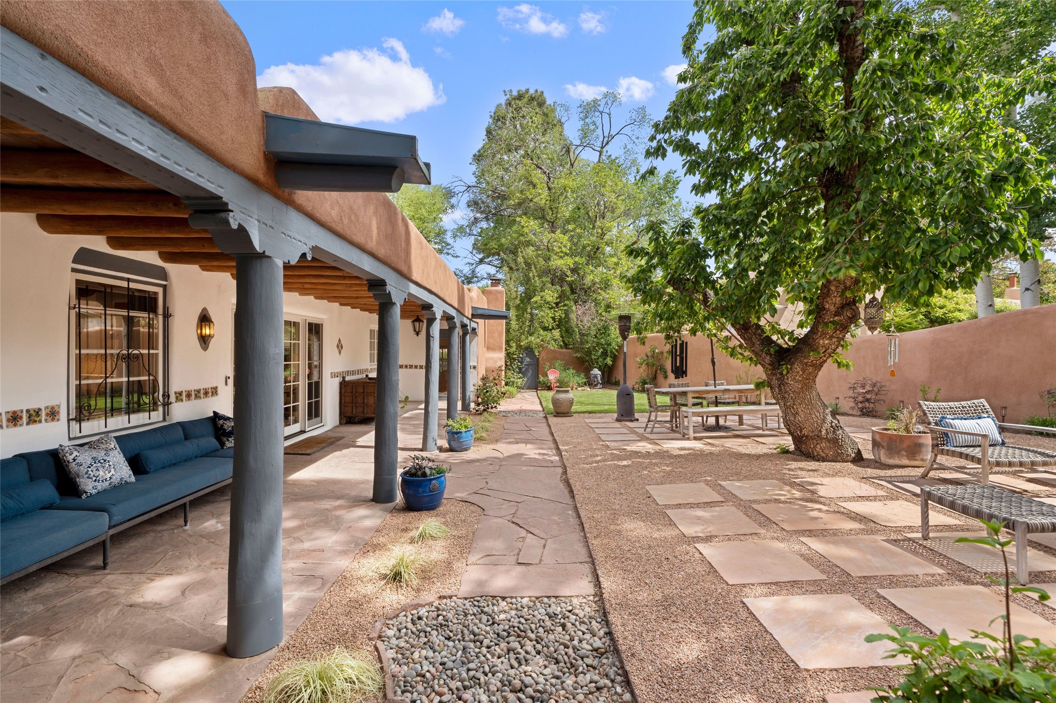 This Historic Eastside 4-bedroom, 4-bath residence fronting the picturesque Acequia Madre de Santa Fe offers a seamless blend of historic character and modern sensibility. Lot extends from Camino del Poniente to Acequia Madre with private access and parking off both streets. As you enter, a generous grand foyer welcomes you, setting the tone for this extraordinary home. With 3 wood-burning fireplaces, the inviting warmth of the living spaces is enhanced by traditional plastered walls, carved doors, exposed vigas and beams. The floors, a blend of wood, flagstone, and brick, tell a story of artisanal craftsmanship, while colorful tiles add character throughout. The formal dining room, equipped with built-in shelving and cabinets, is perfect for hosting elegant dinners, while the spacious kitchen is a culinary haven. Skylights flood the area with natural light, illuminating a center island complete with a wine fridge, a farmhouse sink, and high-end appliances. An informal dining area opens to an outdoor portal and patio, offering an ideal backdrop for al fresco gatherings. Upstairs, a versatile space awaits as a second living area, bedroom, or office. The attached casita is a private one-bedroom suite complete with a kitchen, full bath, washer, dryer, and dedicated parking area. The private wraparound yard, with mature flowering fruit and shade trees, offers a peaceful outdoor retreat in the heart of the city. Recent enhancements include the replacement of majority plumbing pipes, sewer line, and numerous windows. Additionally, leased water rights from the Acequia Madre are available. Located in a coveted area a block away from Canyon Road and a short distance to the Santa Fe Plaza.