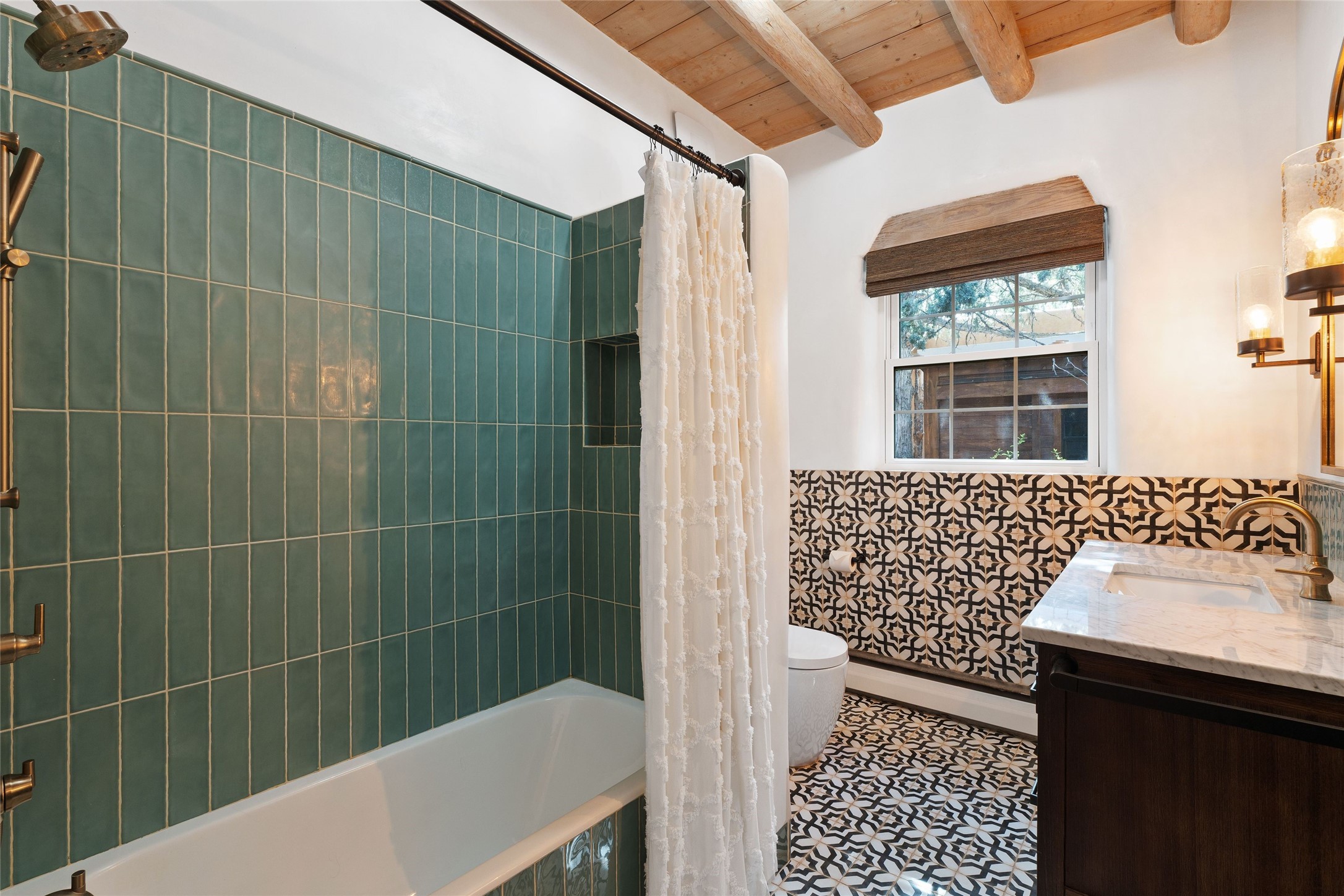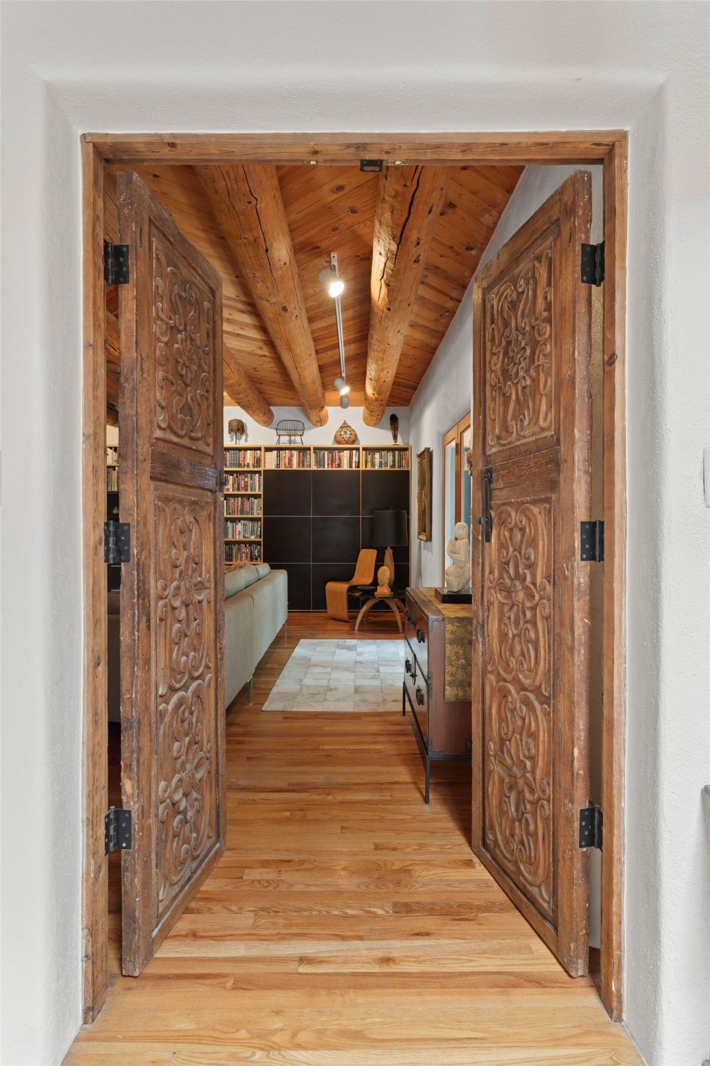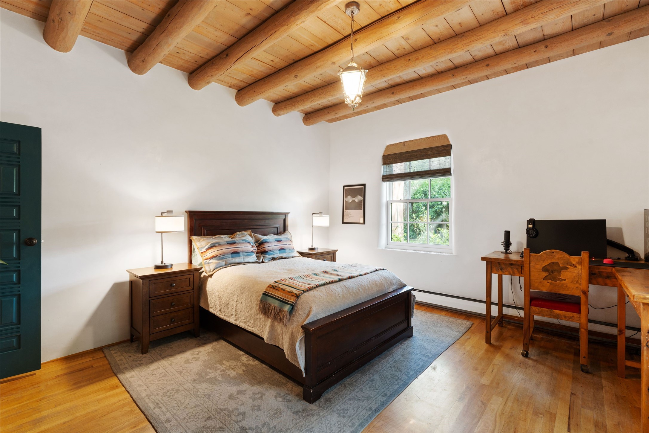 This Historic Eastside 4-bedroom, 4-bath residence fronting the picturesque Acequia Madre de Santa Fe offers a seamless blend of historic character and modern sensibility. Lot extends from Camino del Poniente to Acequia Madre with private access and parking off both streets. As you enter, a generous grand foyer welcomes you, setting the tone for this extraordinary home. With 3 wood-burning fireplaces, the inviting warmth of the living spaces is enhanced by traditional plastered walls, carved doors, exposed vigas and beams. The floors, a blend of wood, flagstone, and brick, tell a story of artisanal craftsmanship, while colorful tiles add character throughout. The formal dining room, equipped with built-in shelving and cabinets, is perfect for hosting elegant dinners, while the spacious kitchen is a culinary haven. Skylights flood the area with natural light, illuminating a center island complete with a wine fridge, a farmhouse sink, and high-end appliances. An informal dining area opens to an outdoor portal and patio, offering an ideal backdrop for al fresco gatherings. Upstairs, a versatile space awaits as a second living area, bedroom, or office. The attached casita is a private one-bedroom suite complete with a kitchen, full bath, washer, dryer, and dedicated parking area. The private wraparound yard, with mature flowering fruit and shade trees, offers a peaceful outdoor retreat in the heart of the city. Recent enhancements include the replacement of majority plumbing pipes, sewer line, and numerous windows. Additionally, leased water rights from the Acequia Madre are available. Located in a coveted area a block away from Canyon Road and a short distance to the Santa Fe Plaza.