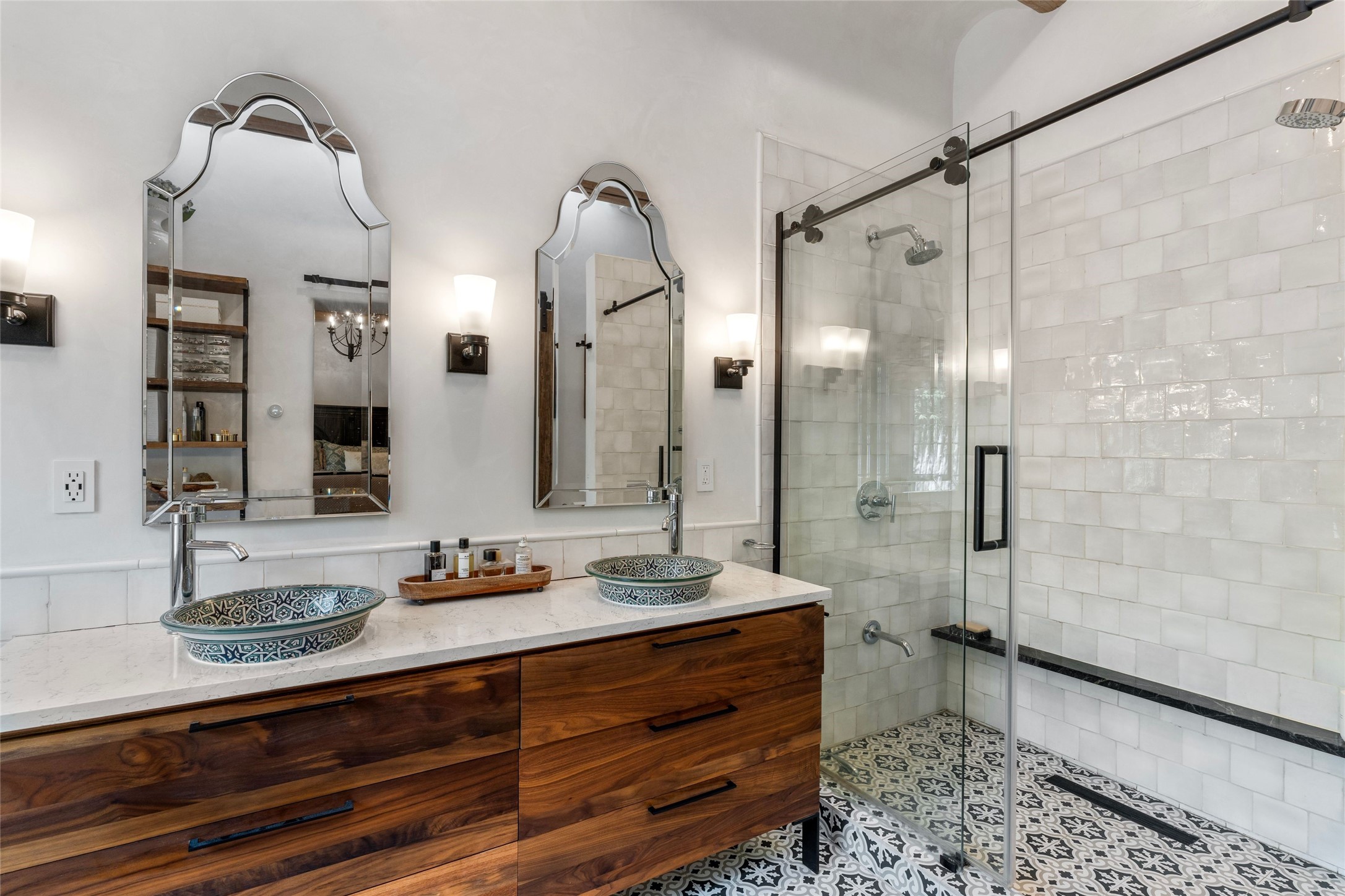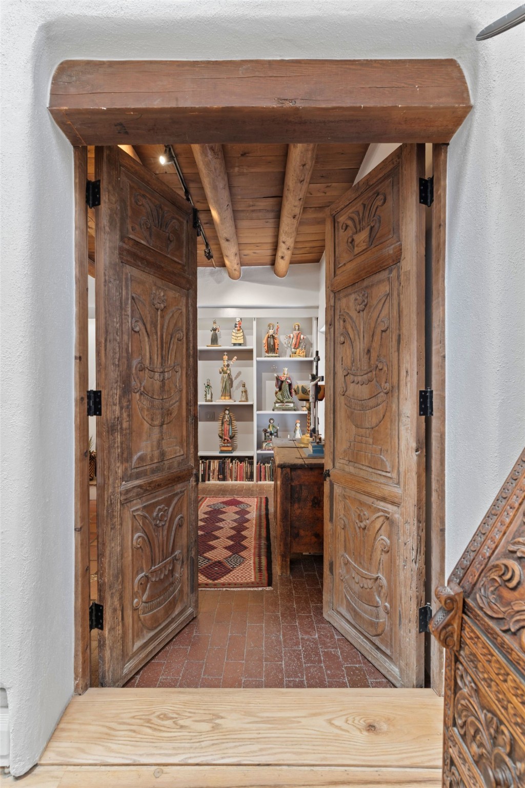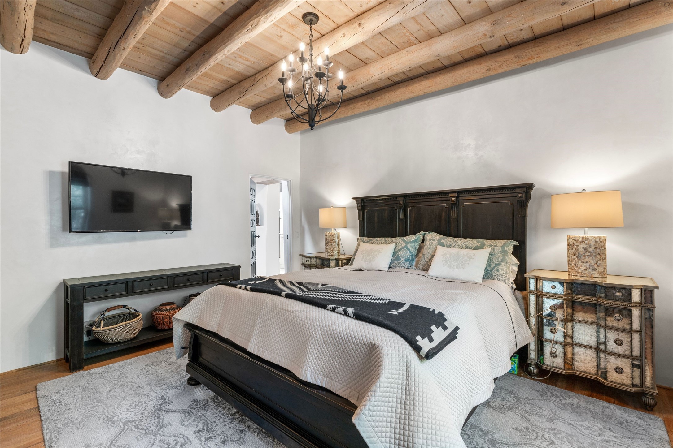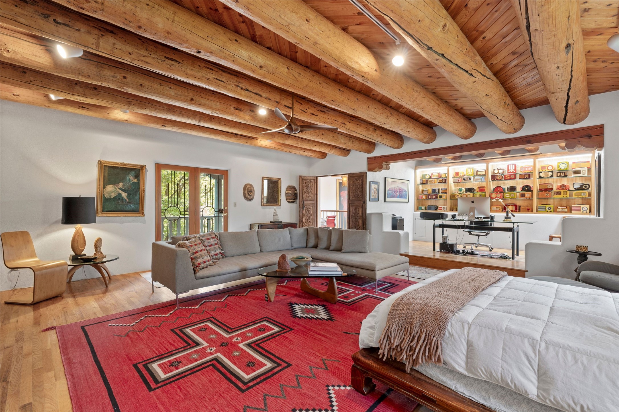 This Historic Eastside 4-bedroom, 4-bath residence fronting the picturesque Acequia Madre de Santa Fe offers a seamless blend of historic character and modern sensibility. Lot extends from Camino del Poniente to Acequia Madre with private access and parking off both streets. As you enter, a generous grand foyer welcomes you, setting the tone for this extraordinary home. With 3 wood-burning fireplaces, the inviting warmth of the living spaces is enhanced by traditional plastered walls, carved doors, exposed vigas and beams. The floors, a blend of wood, flagstone, and brick, tell a story of artisanal craftsmanship, while colorful tiles add character throughout. The formal dining room, equipped with built-in shelving and cabinets, is perfect for hosting elegant dinners, while the spacious kitchen is a culinary haven. Skylights flood the area with natural light, illuminating a center island complete with a wine fridge, a farmhouse sink, and high-end appliances. An informal dining area opens to an outdoor portal and patio, offering an ideal backdrop for al fresco gatherings. Upstairs, a versatile space awaits as a second living area, bedroom, or office. The attached casita is a private one-bedroom suite complete with a kitchen, full bath, washer, dryer, and dedicated parking area. The private wraparound yard, with mature flowering fruit and shade trees, offers a peaceful outdoor retreat in the heart of the city. Recent enhancements include the replacement of majority plumbing pipes, sewer line, and numerous windows. Additionally, leased water rights from the Acequia Madre are available. Located in a coveted area a block away from Canyon Road and a short distance to the Santa Fe Plaza.