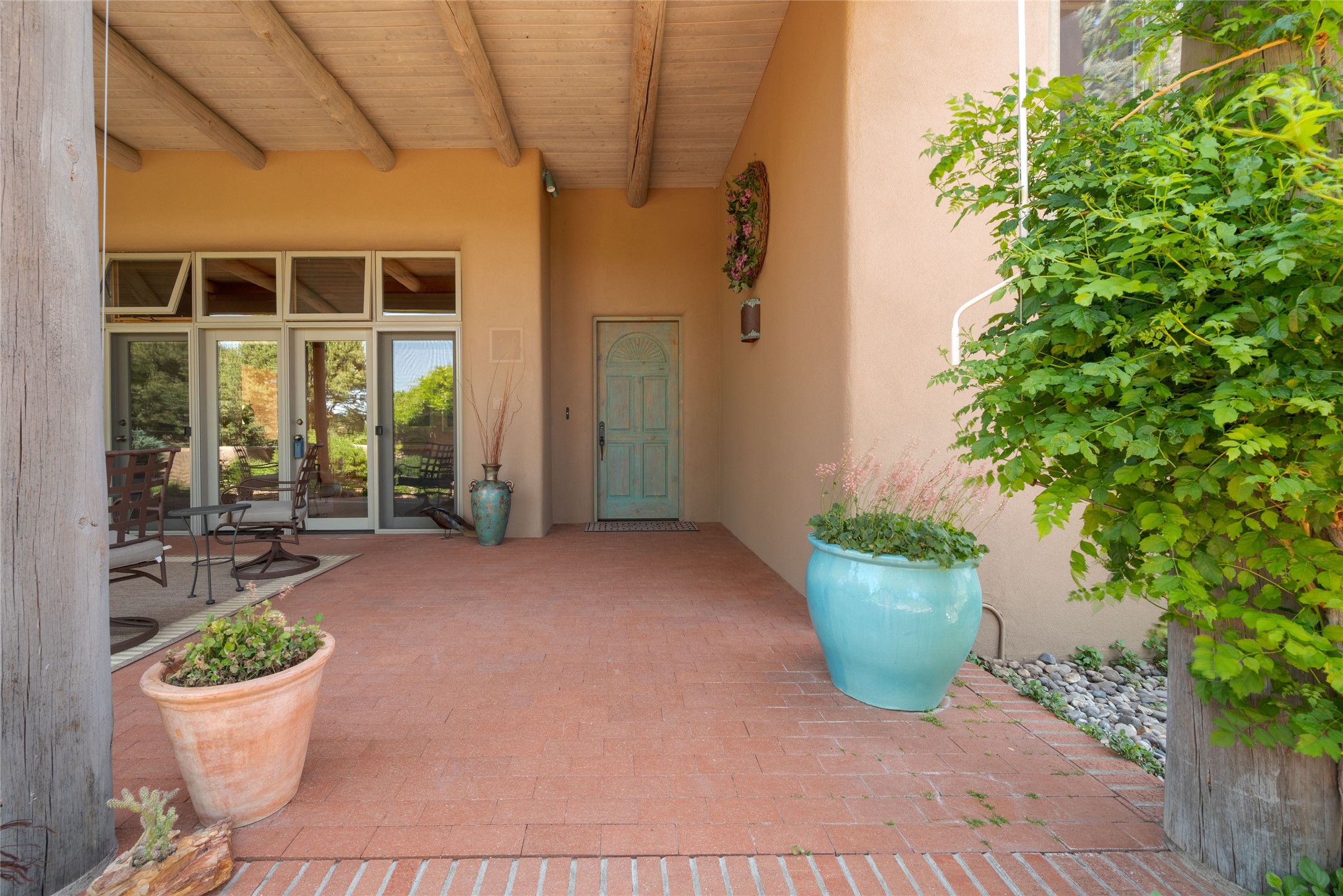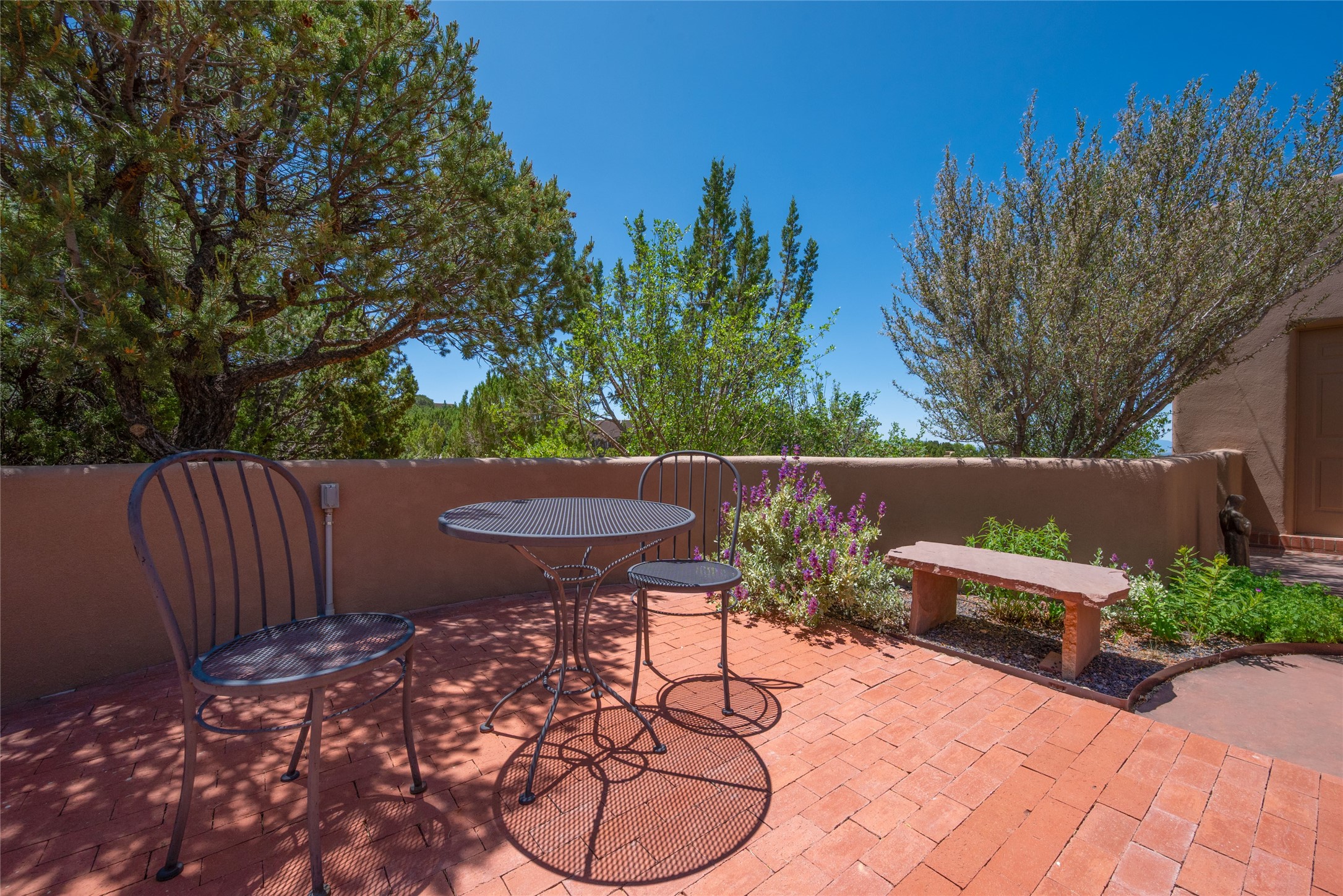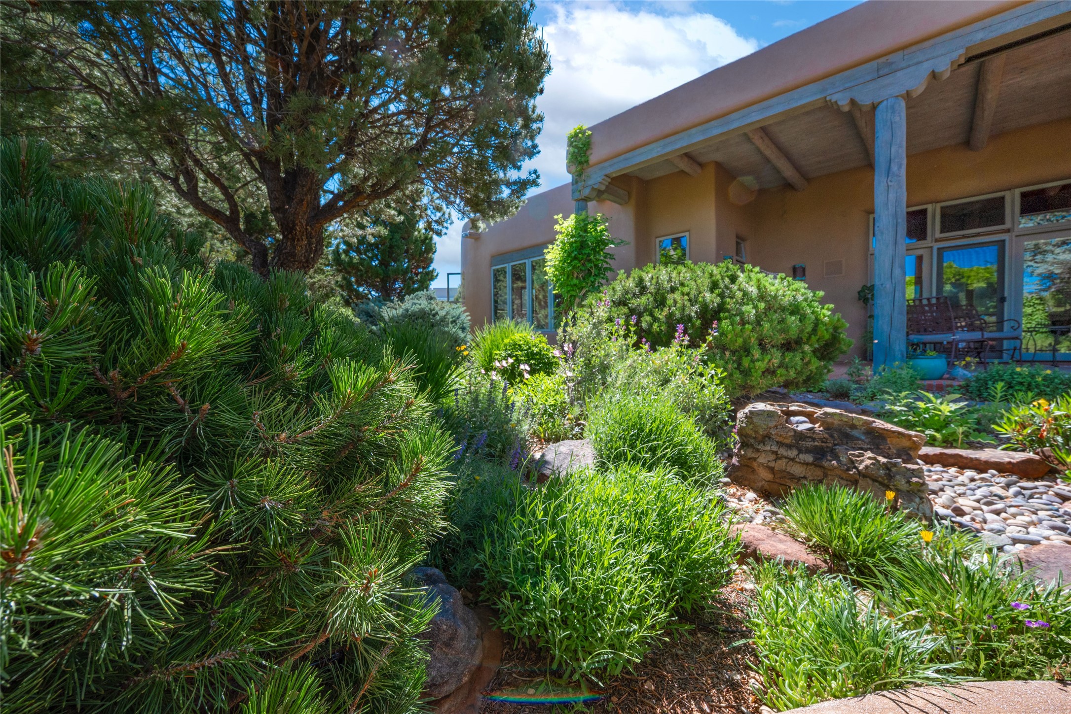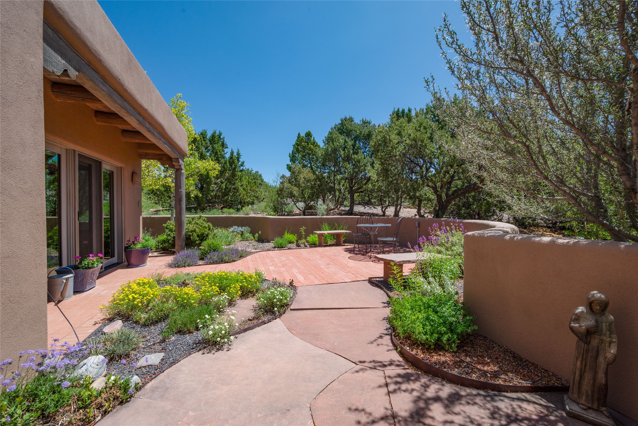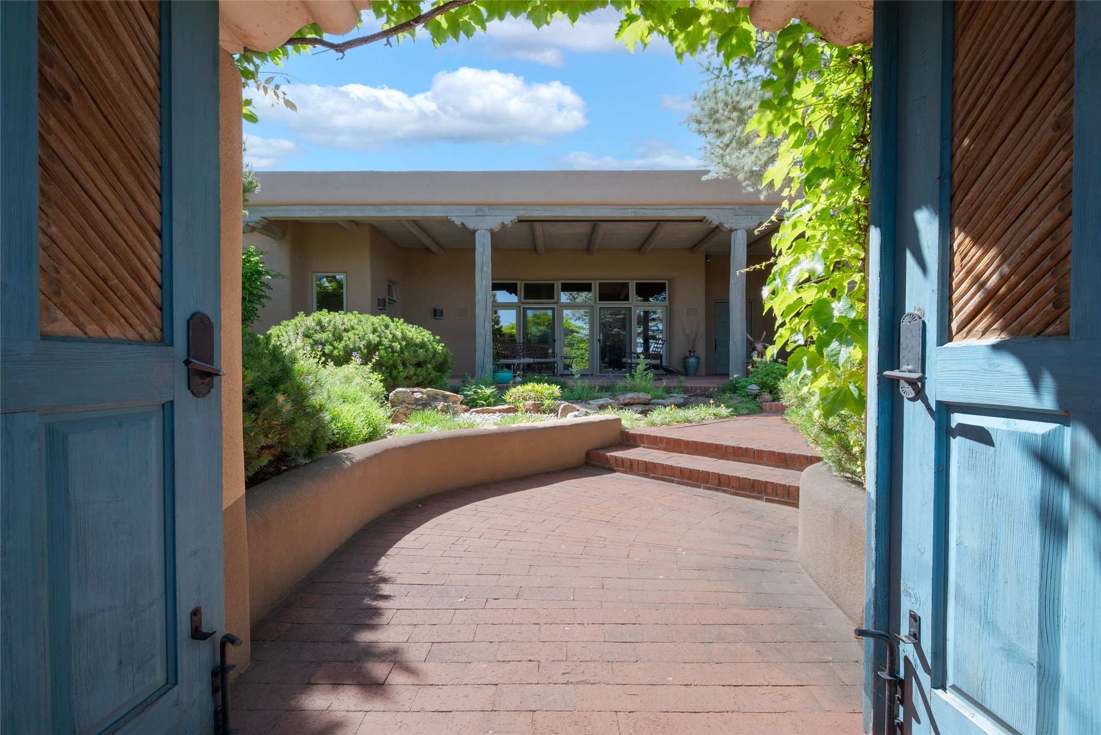 Nestled in a private & beautifully landscaped setting, this 3-bedroom, 2.5-bath custom home offers 3,500 square feet of thoughtfully designed living space. Built with both comfort & style in mind, the residence is set within a master gardener's haven--lushly planted & fully irrigated to maintain the vibrant landscape.You'll appreciate the sense of seclusion & tranquility. This home is essentially single-level, with just 3- interior steps leading to the kitchen & dining area. Inside, Southwest-inspired design elements abound--arched passages & classic kiva fireplaces add character & charm. 9-exterior doors invite natural light & seamless indoor-outdoor living, while Hurd windows frame picturesque garden views from nearly every room.Designed for both everyday living & entertaining, the home features multiple outdoor portals--ideal for gatherings in any season. One portal includes a built-in kiva fireplace & offers a built-in BBQ station--perfect for alfresco dining & sunset cocktails.The spacious kitchen opens to the dining area & includes ample cabinetry, & easy access to outdoor entertaining spaces. A wet bar enhances the flow for hosting, & a dedicated yoga room--complete with direct patio access--invites wellness & retreat.The primary suite & secondary bedrooms offer comfort & privacy, while the two-car garage provides not only vehicle storage but also direct access to mechanicals and additional storage space--ideal for tools, or seasonal items. The home also boasts a fantastic laundry room, built-in cabinetry & counters--yet another area where storage is well-considered.Homeowners enjoy the added benefit of an HOA that includes septic system inspections & scheduled cleanouts.Elegant yet functional, private yet accessible--this timeless home blends Southwestern charm with custom quality, all wrapped in an oasis-like landscape cultivated with care. A rare find for discerning buyers who appreciate craftsmanship, thoughtful details, and the art of outdoor living.