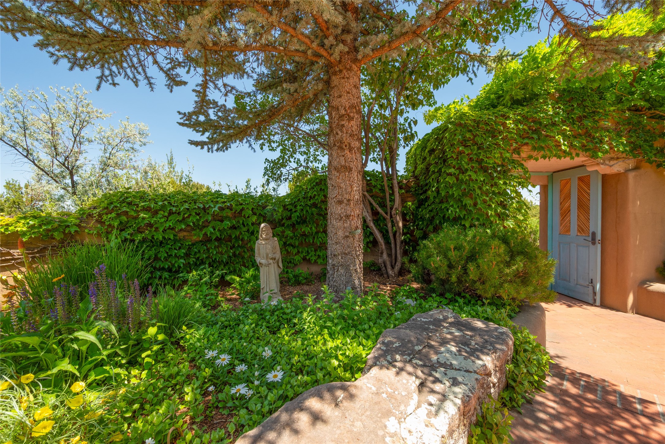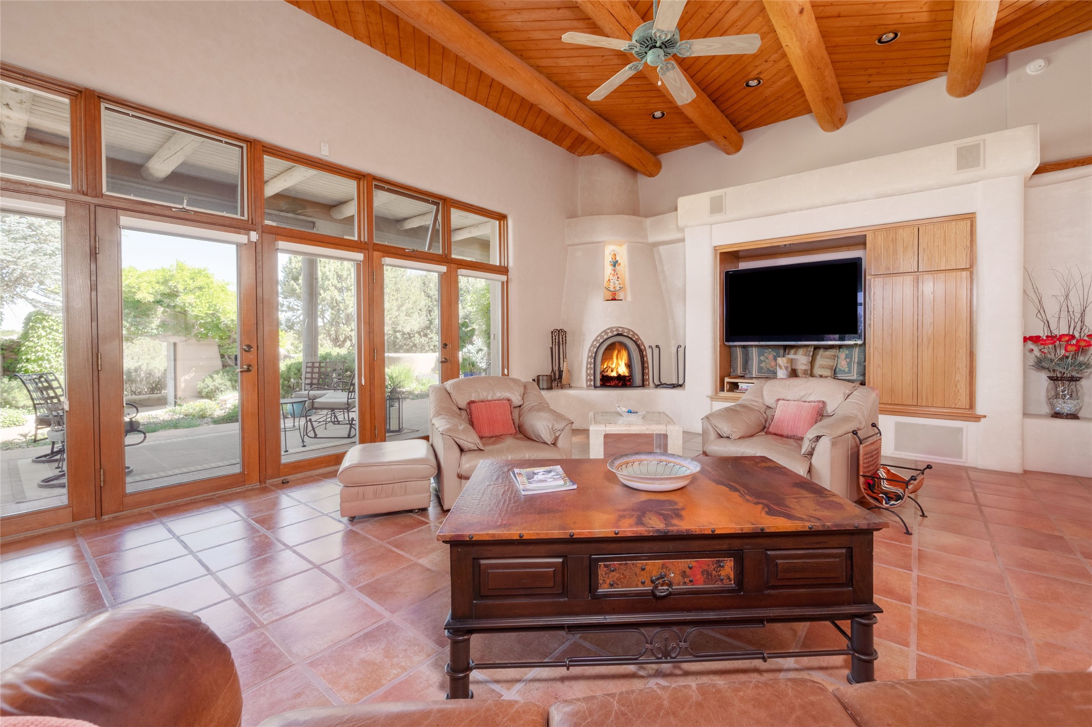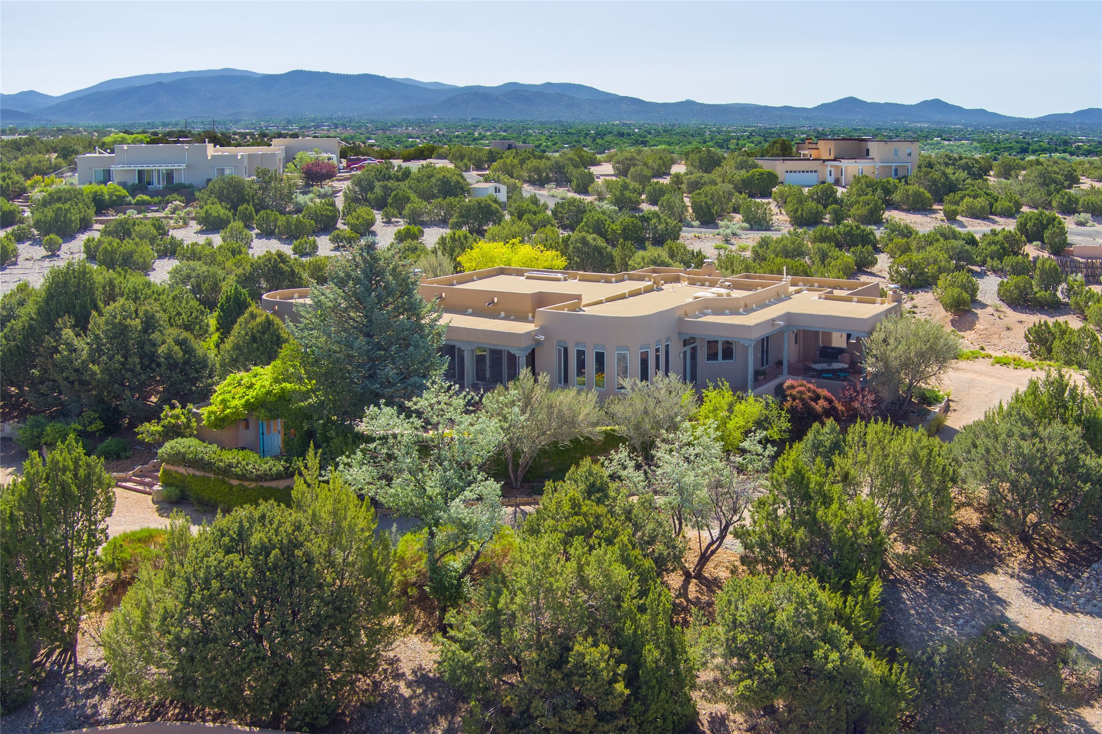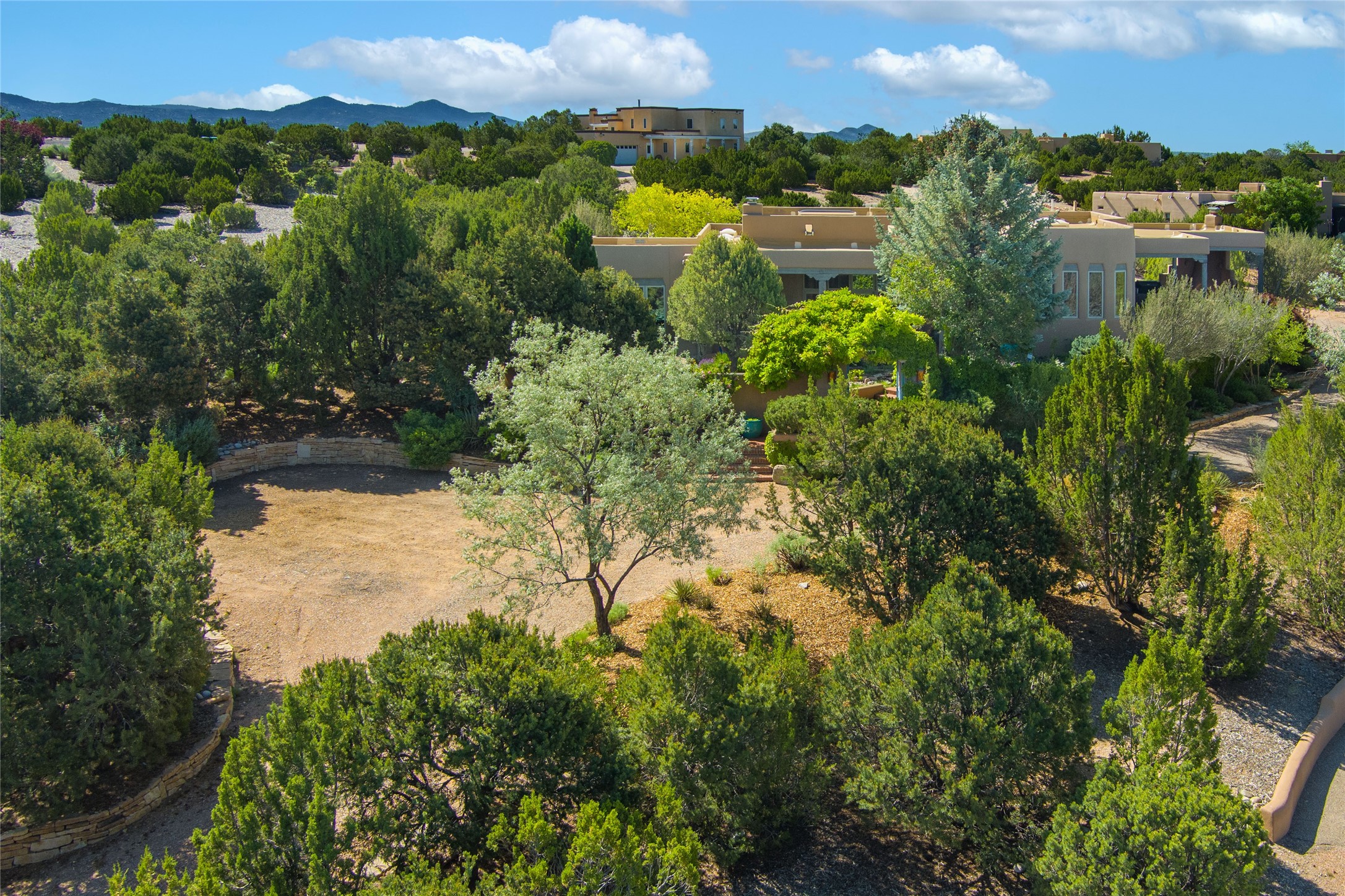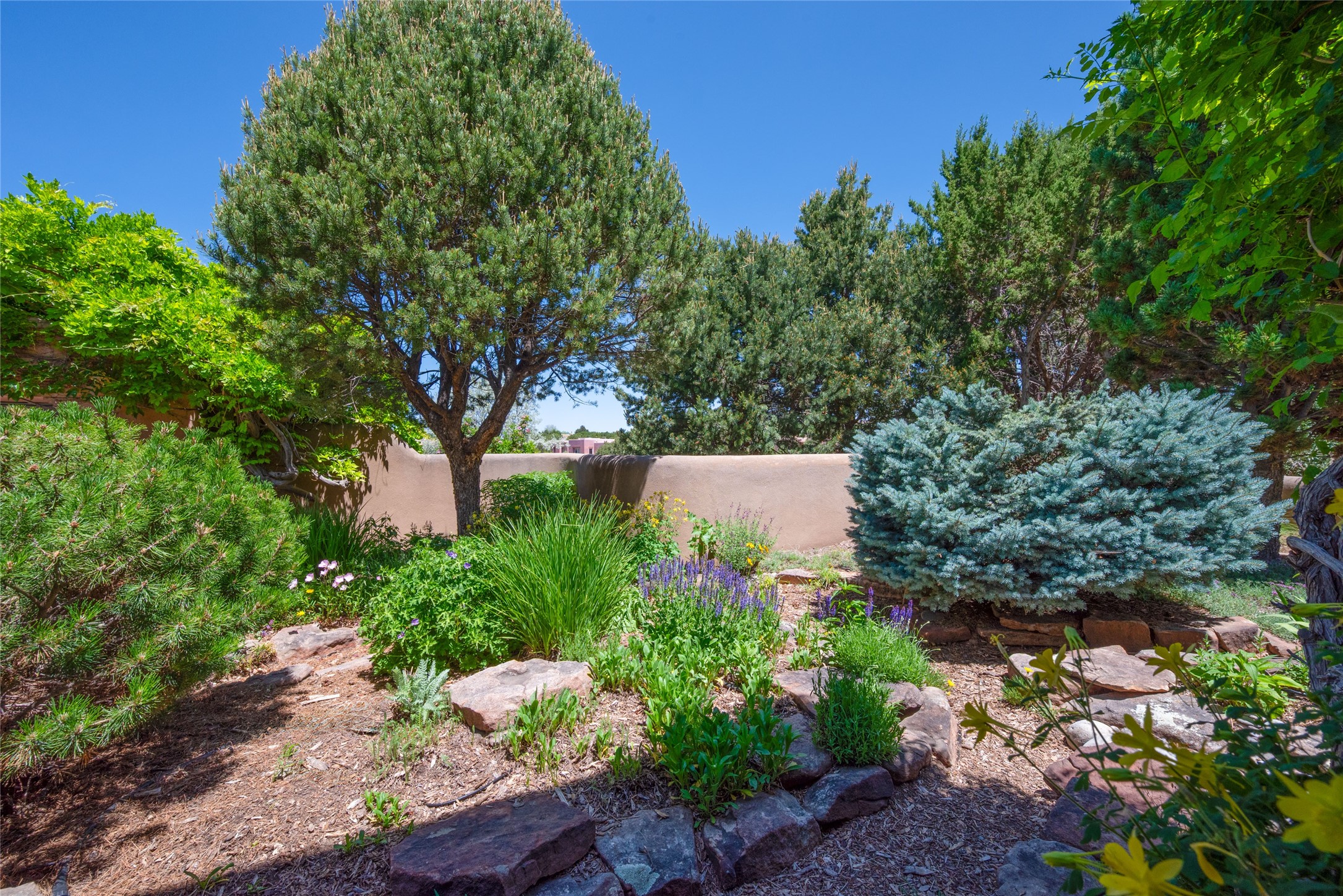 Nestled in a private & beautifully landscaped setting, this 3-bedroom, 2.5-bath custom home offers 3,500 square feet of thoughtfully designed living space. Built with both comfort & style in mind, the residence is set within a master gardener's haven--lushly planted & fully irrigated to maintain the vibrant landscape.You'll appreciate the sense of seclusion & tranquility. This home is essentially single-level, with just 3- interior steps leading to the kitchen & dining area. Inside, Southwest-inspired design elements abound--arched passages & classic kiva fireplaces add character & charm. 9-exterior doors invite natural light & seamless indoor-outdoor living, while Hurd windows frame picturesque garden views from nearly every room.Designed for both everyday living & entertaining, the home features multiple outdoor portals--ideal for gatherings in any season. One portal includes a built-in kiva fireplace & offers a built-in BBQ station--perfect for alfresco dining & sunset cocktails.The spacious kitchen opens to the dining area & includes ample cabinetry, & easy access to outdoor entertaining spaces. A wet bar enhances the flow for hosting, & a dedicated yoga room--complete with direct patio access--invites wellness & retreat.The primary suite & secondary bedrooms offer comfort & privacy, while the two-car garage provides not only vehicle storage but also direct access to mechanicals and additional storage space--ideal for tools, or seasonal items. The home also boasts a fantastic laundry room, built-in cabinetry & counters--yet another area where storage is well-considered.Homeowners enjoy the added benefit of an HOA that includes septic system inspections & scheduled cleanouts.Elegant yet functional, private yet accessible--this timeless home blends Southwestern charm with custom quality, all wrapped in an oasis-like landscape cultivated with care. A rare find for discerning buyers who appreciate craftsmanship, thoughtful details, and the art of outdoor living.