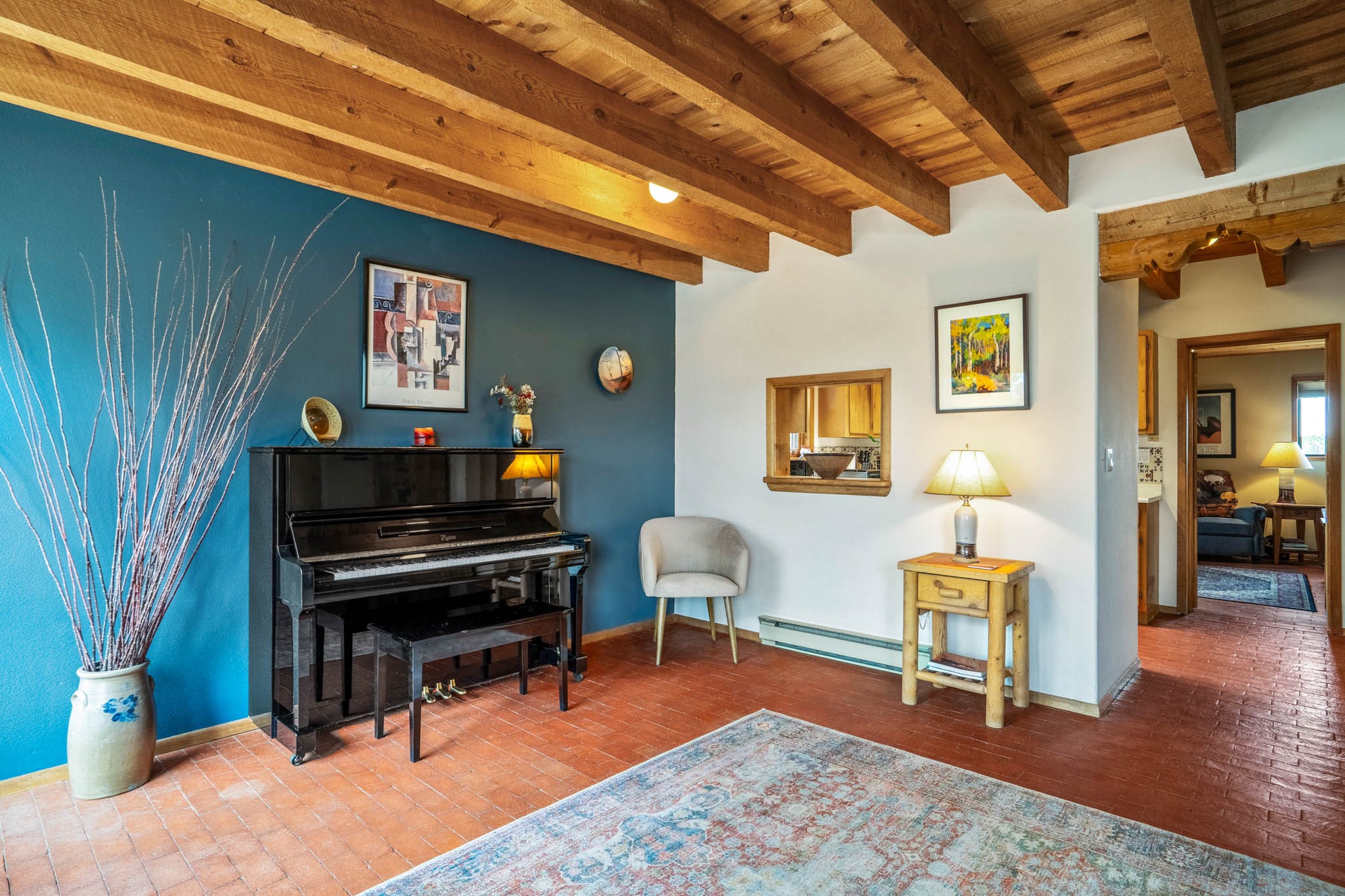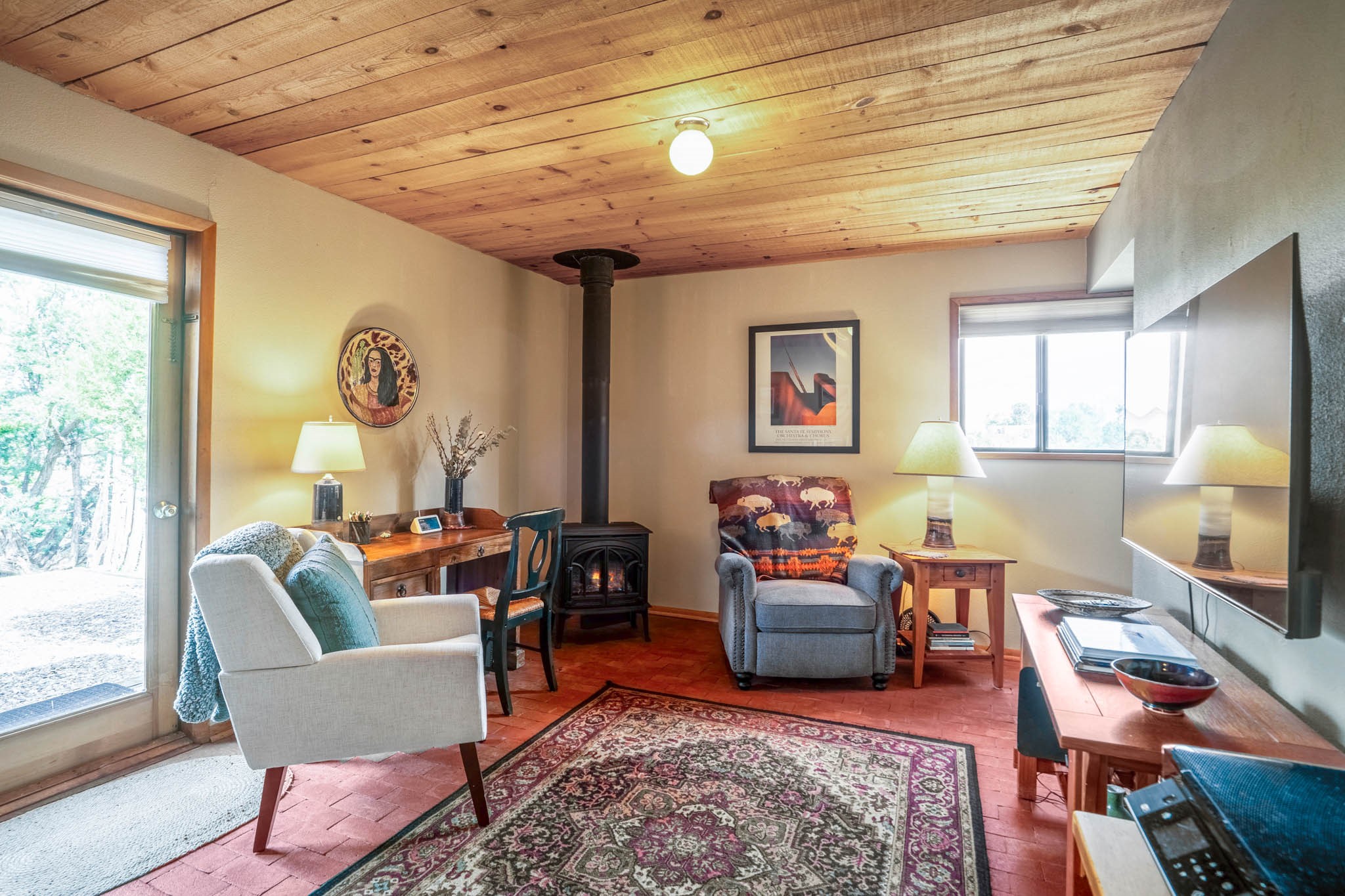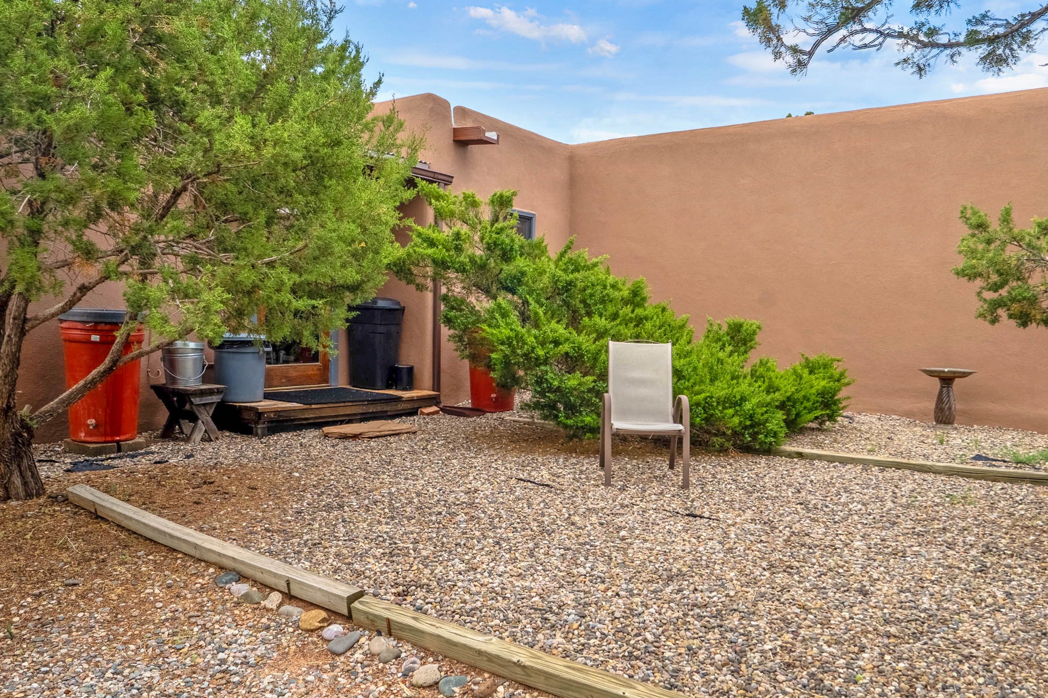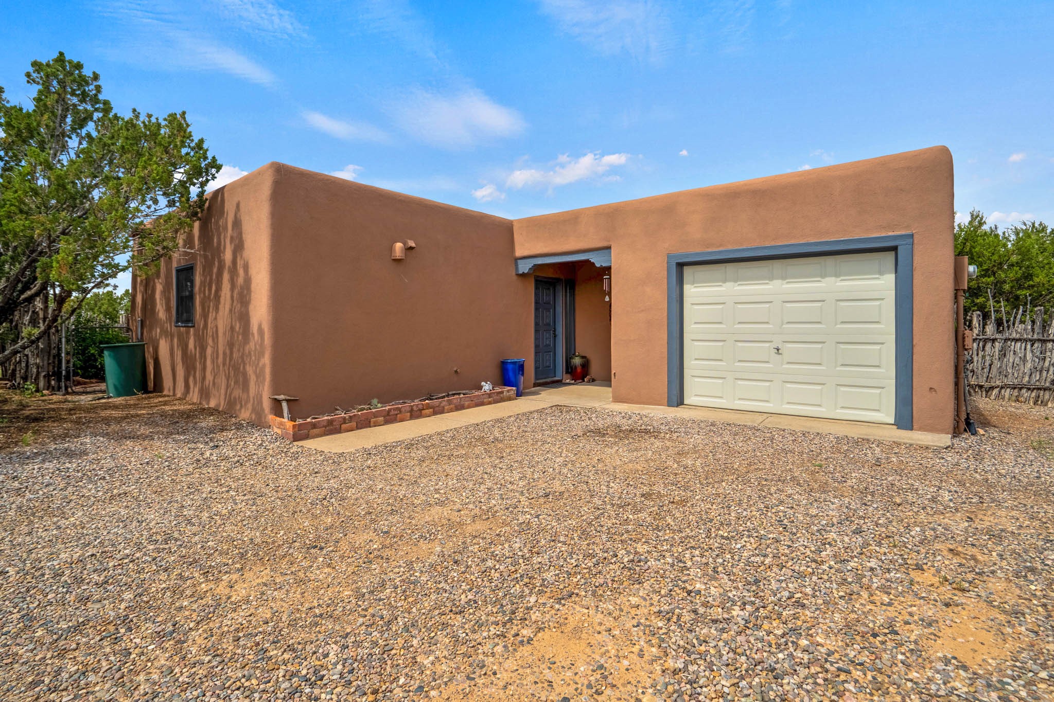Eldorado Living : A Serene RetreatBuilt with care by respected builder Russ McMillan, this residence seamlessly blends modern comfort with classic appeal. Experience the warmth and inherent charm of distinctive brick floors throughout, viga ceilings, and a cozy Kiva fireplace. Designed with sustainability in mind and perched on a tree covered corner lot, it offers both a sense of secluded privacy and a charming presence that invites you in. Abundant pinon and juniper trees offer sanctuary for the many native birds that call NM home. Featuring 2 Bedrooms and 2 baths. it's more than just a house; it's a character-filled haven waiting for you.