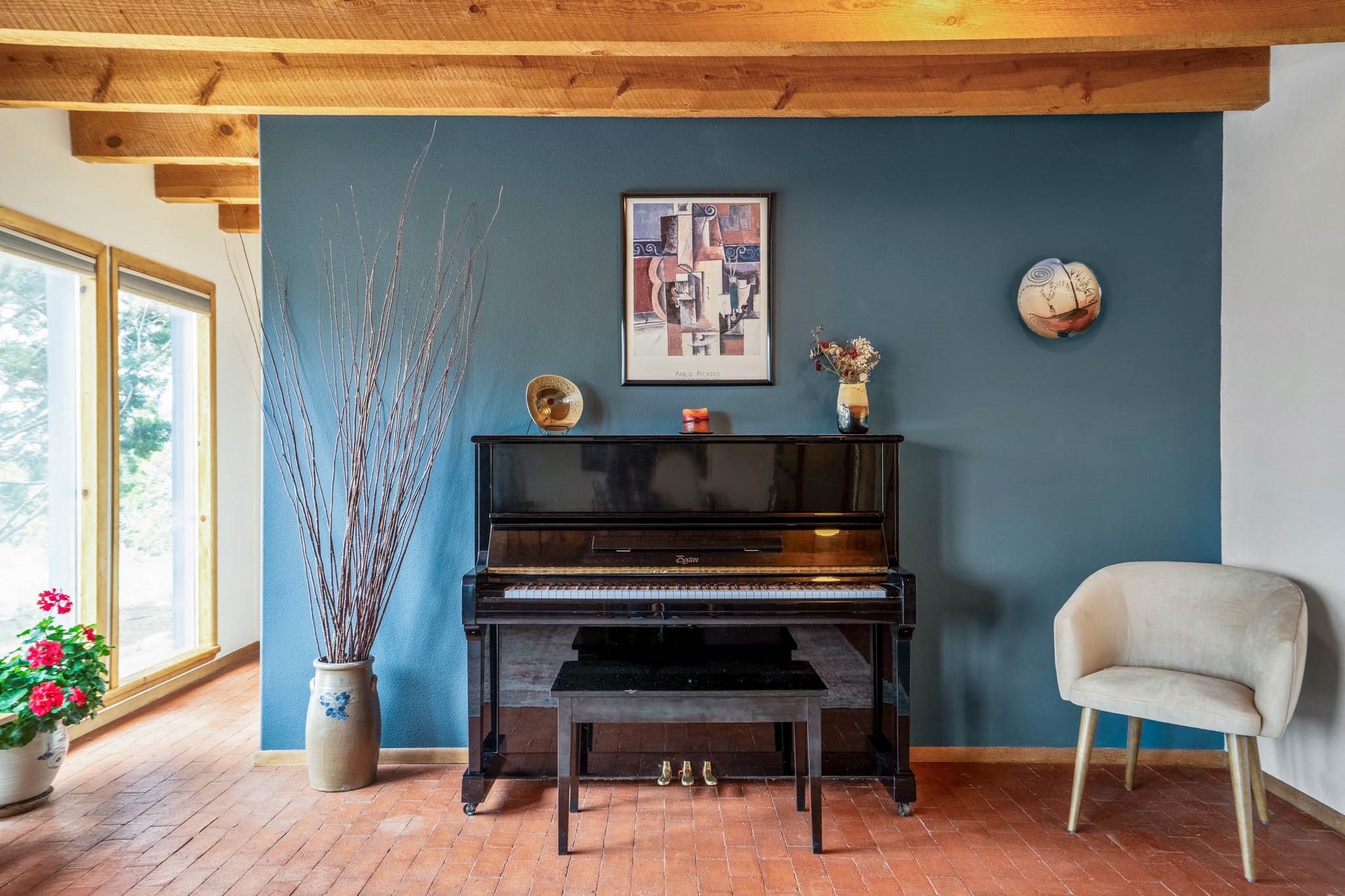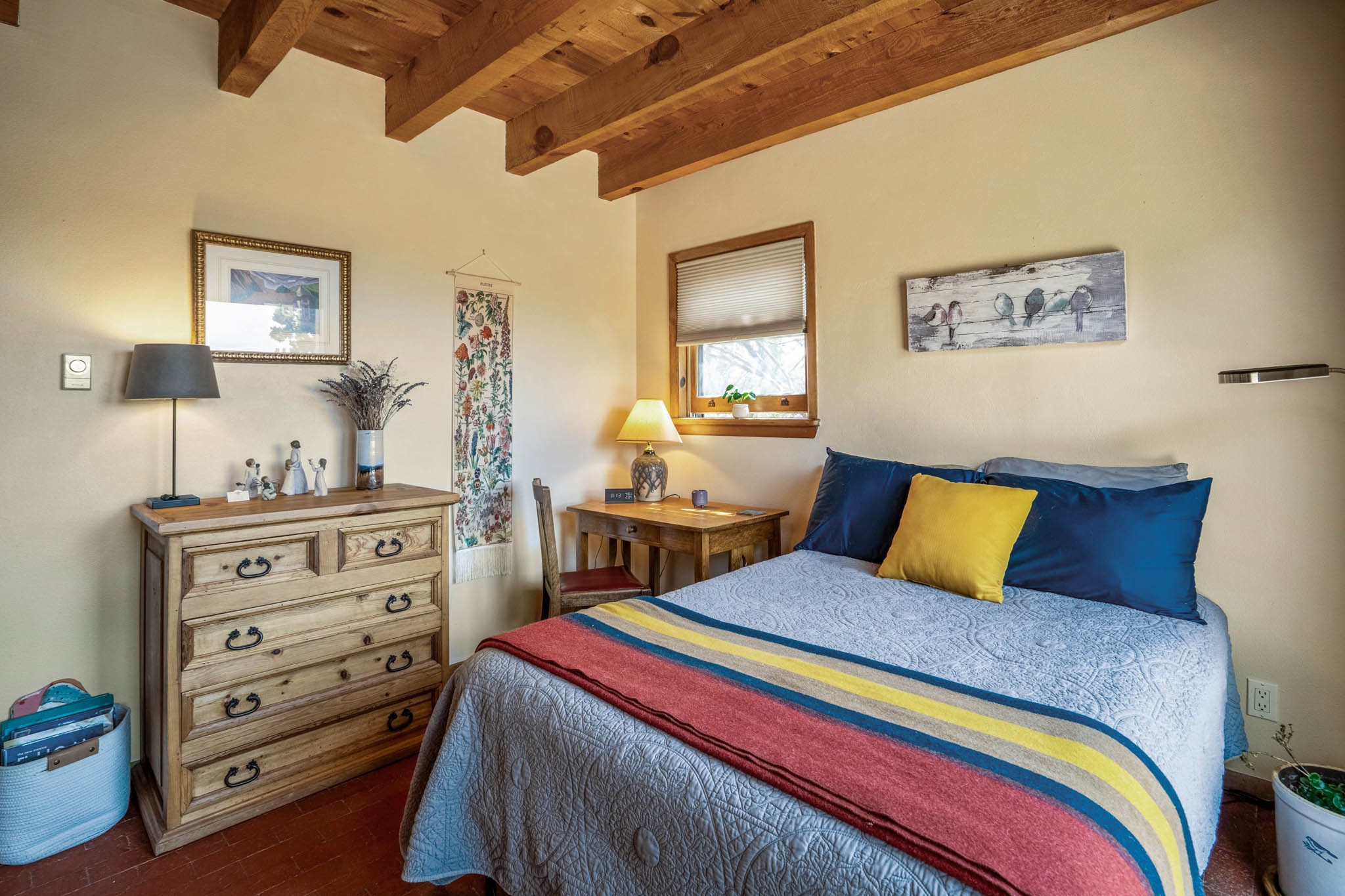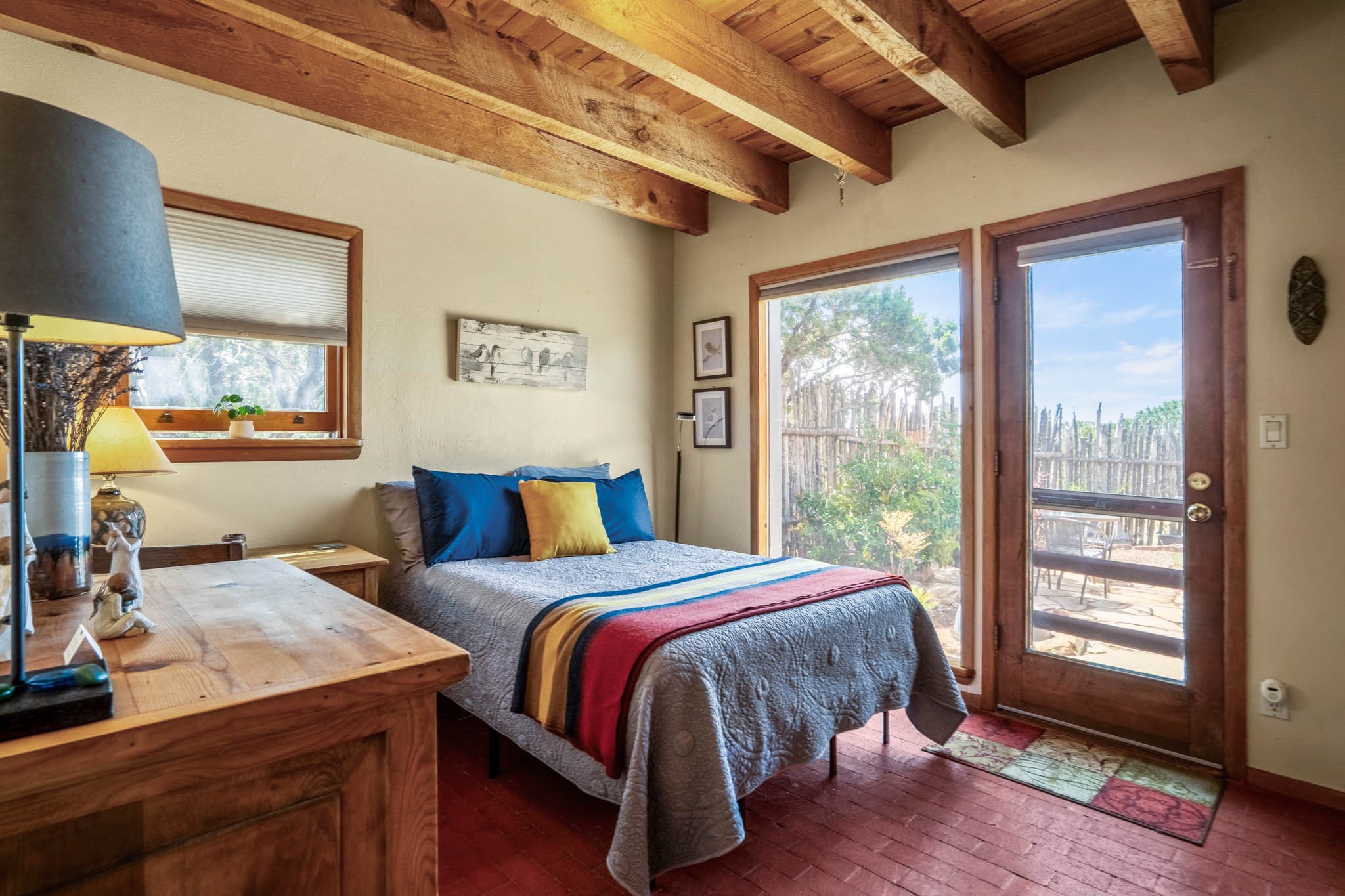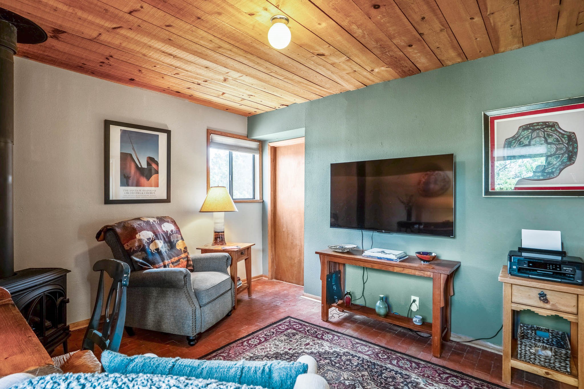 Eldorado Living : A Serene RetreatBuilt with care by respected builder Russ McMillan, this residence seamlessly blends modern comfort with classic appeal. Experience the warmth and inherent charm of distinctive brick floors throughout, viga ceilings, and a cozy Kiva fireplace. Designed with sustainability in mind and perched on a tree covered corner lot, it offers both a sense of secluded privacy and a charming presence that invites you in. Abundant pinon and juniper trees offer sanctuary for the many native birds that call NM home. Featuring 2 Bedrooms and 2 baths. it's more than just a house; it's a character-filled haven waiting for you.