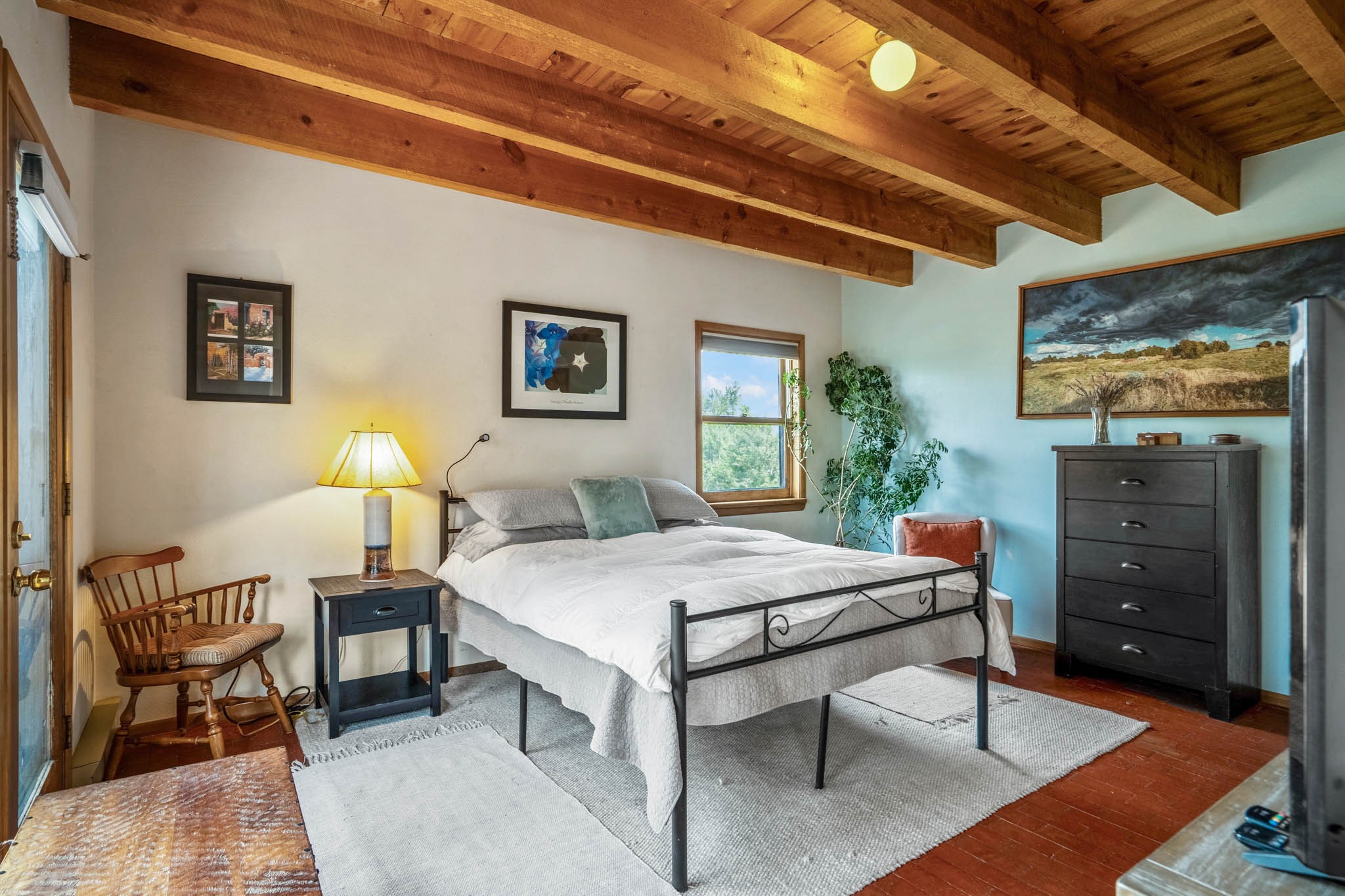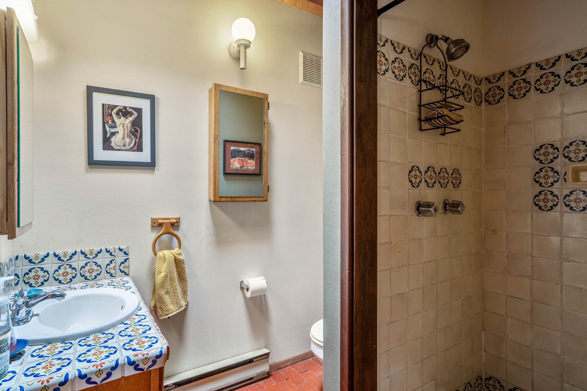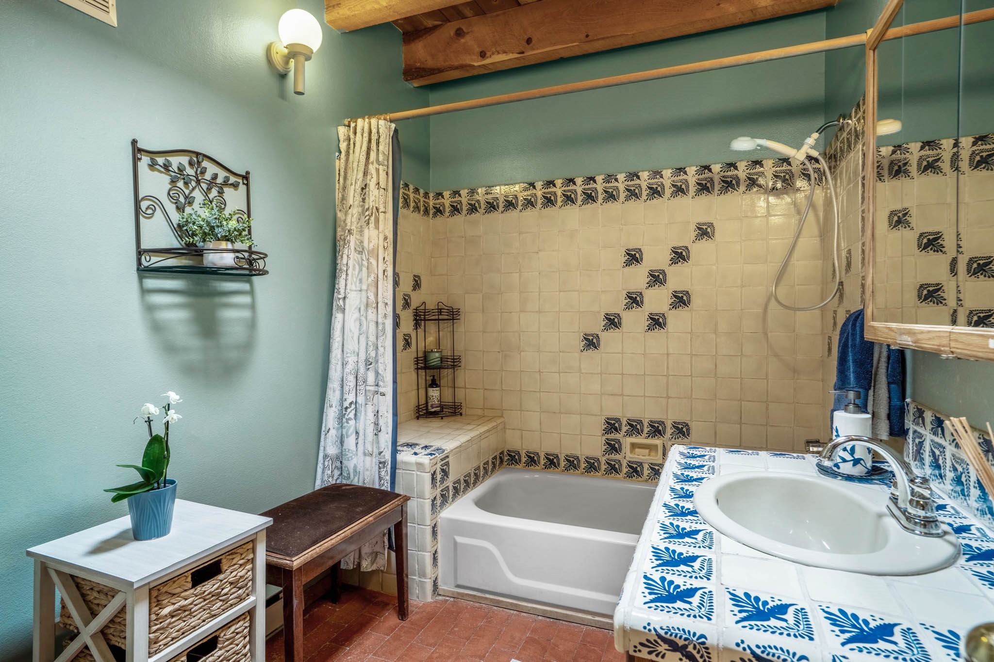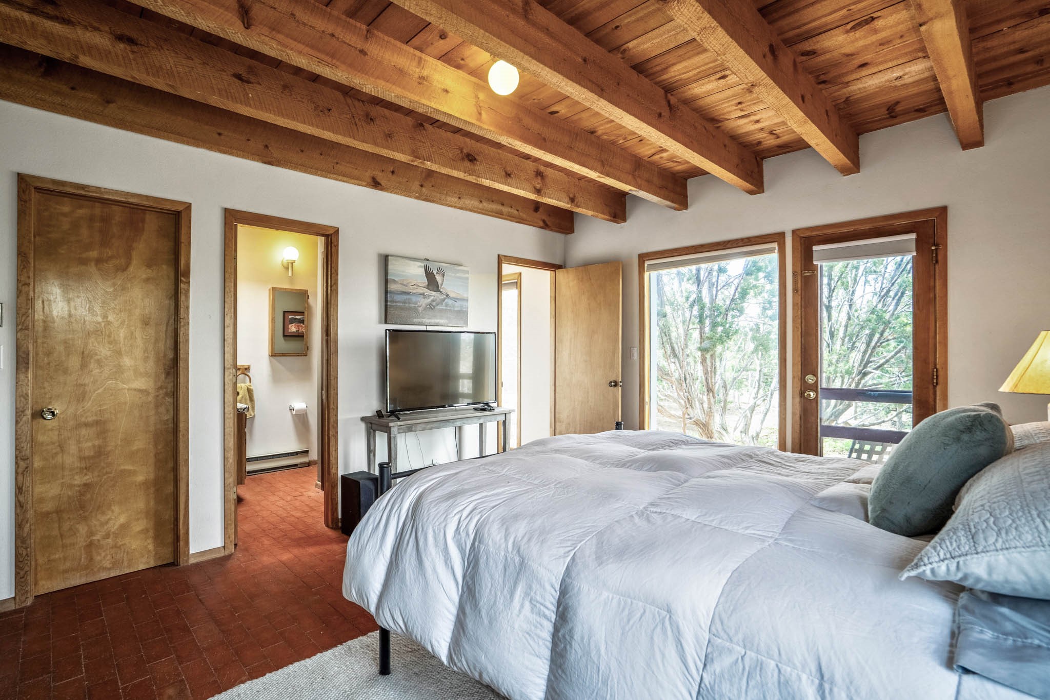 Eldorado Living : A Serene RetreatBuilt with care by respected builder Russ McMillan, this residence seamlessly blends modern comfort with classic appeal. Experience the warmth and inherent charm of distinctive brick floors throughout, viga ceilings, and a cozy Kiva fireplace. Designed with sustainability in mind and perched on a tree covered corner lot, it offers both a sense of secluded privacy and a charming presence that invites you in. Abundant pinon and juniper trees offer sanctuary for the many native birds that call NM home. Featuring 2 Bedrooms and 2 baths. it's more than just a house; it's a character-filled haven waiting for you.