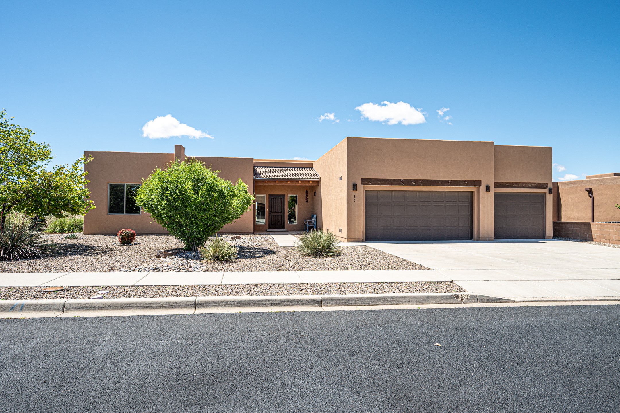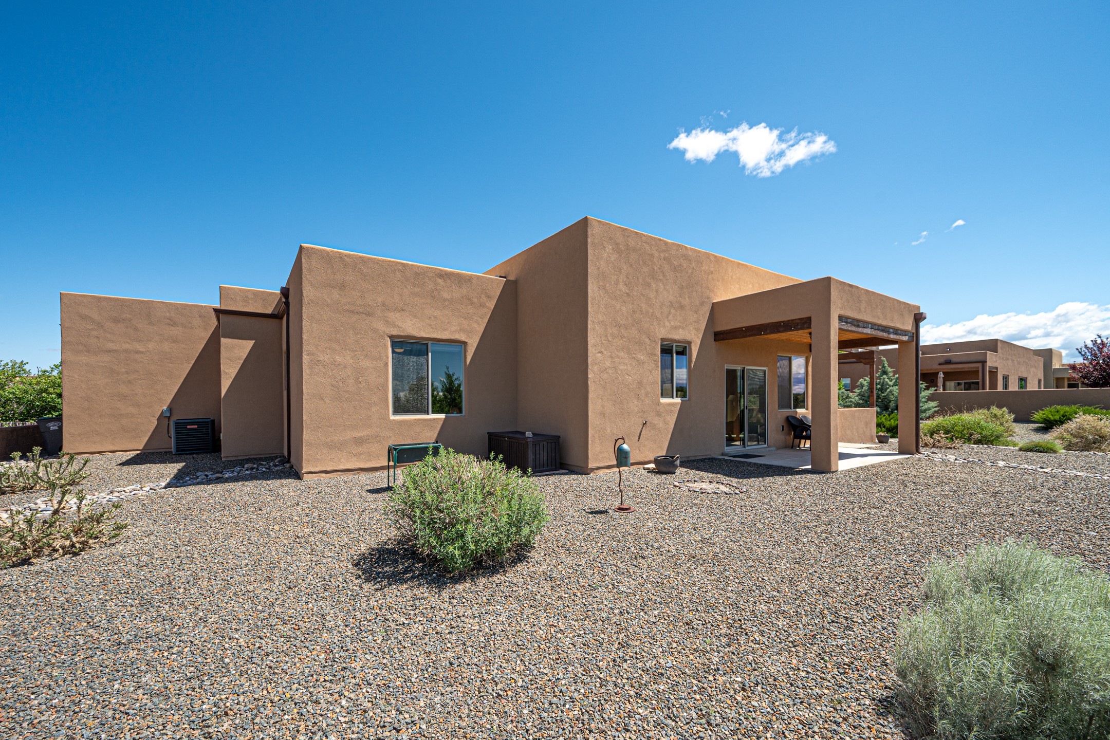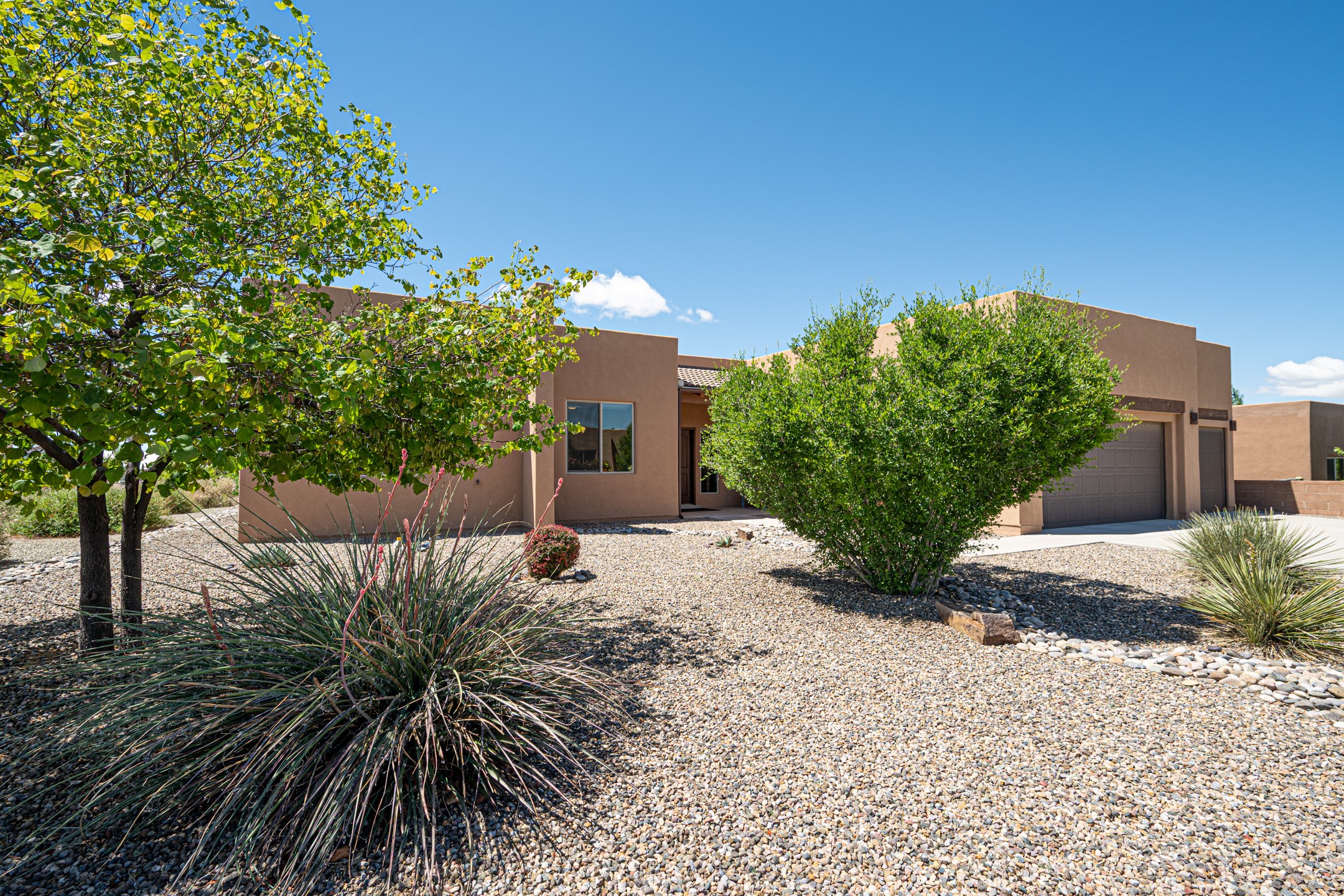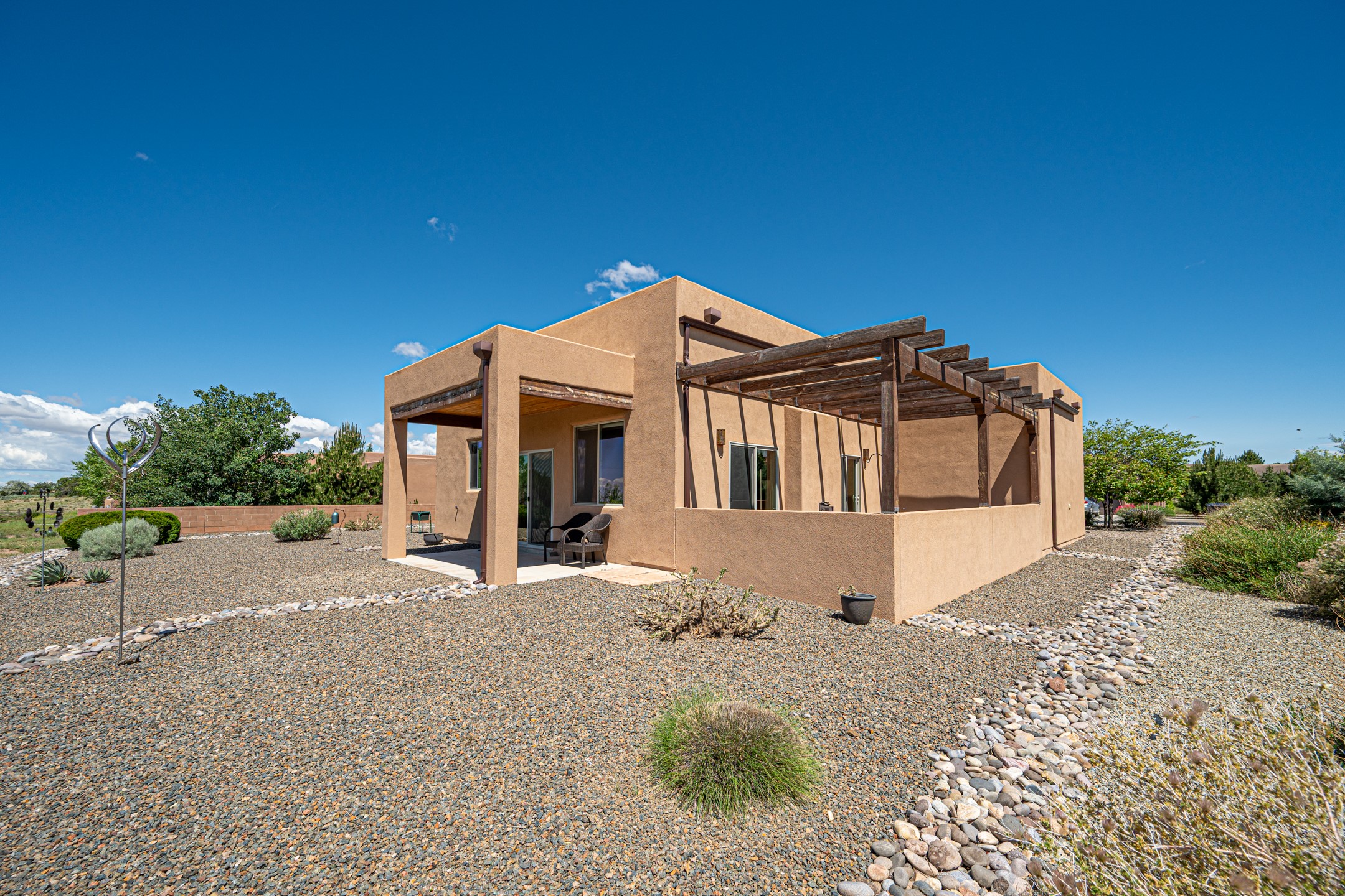 This thoughtfully designed three-bedroom, two-bathroom home offers space, comfort, and elegance in a peaceful neighborhood that is both easy to live in and commute from. The single-level home spans 2,256 square feet and includes a 331-square-foot attached studio (the converted third garage bay)--ideal as a fourth bedroom, office, or creative space. A bright living room with a cozy fireplace invites relaxation, while the modern kitchen features stainless steel appliances, stone counters, and ample space for cooking and entertaining. High ceilings, recessed lighting, and tile flooring enhance the open layout. The primary bedroom is complemented by an en-suite bathroom with double vanities, soaking tub with separate shower, and a generous walk-in closet. Two additional bedrooms provide flexibility for family or remote work. Located in the back of the development with views of green space and close to walking trails, your private outdoor space will feel limitless. Mature landscaping, the covered back portal and large side pergola combine to offer space for gatherings, gardening, or quiet moments. Other features include an attached 2-car garage, central AC and heat, and a roof with transferable warranty. Located near the Dinosaur Trail Trailhead and close to local supermarkets and healthcare, this home combines practical living with Santa Fe charm.