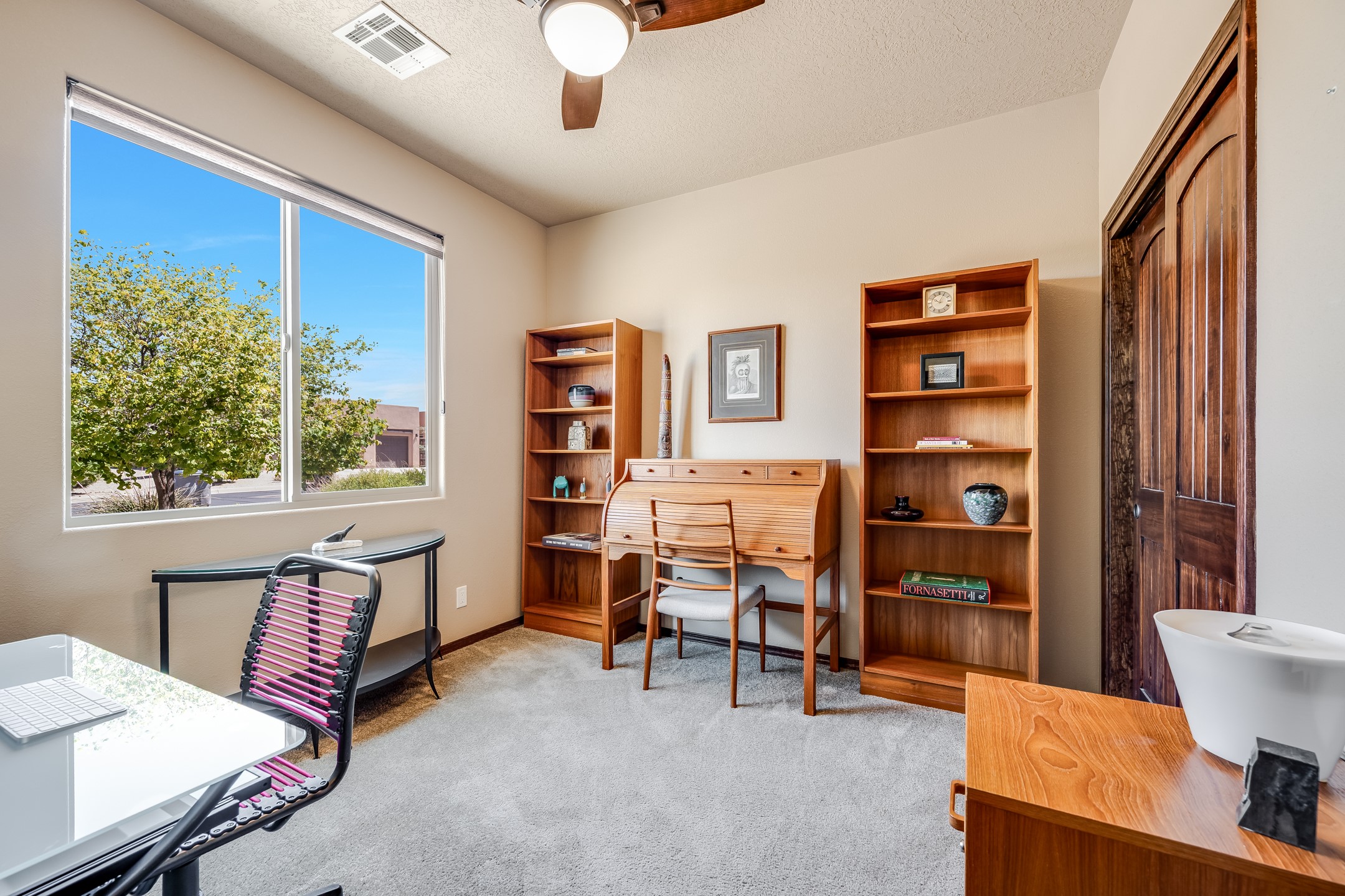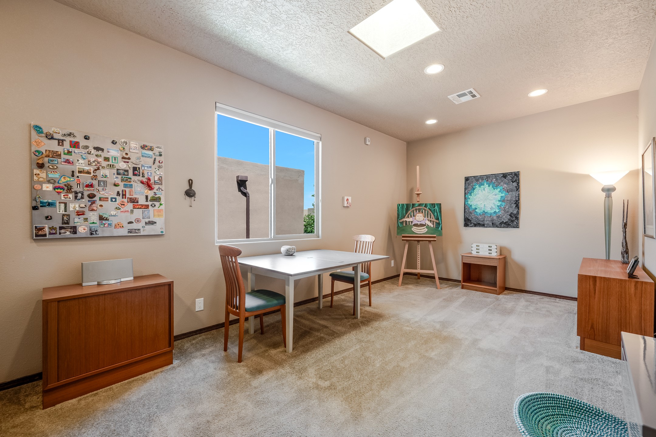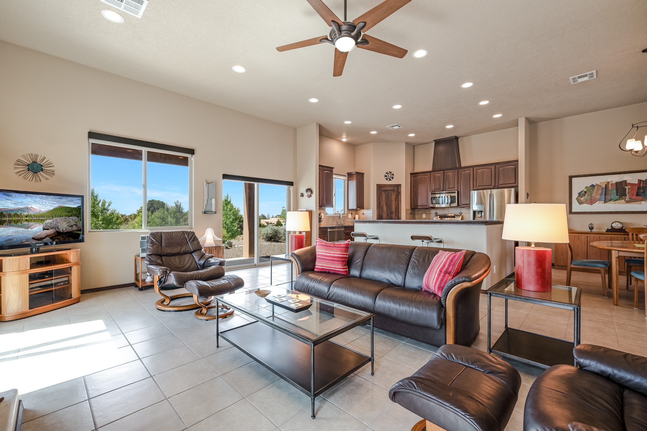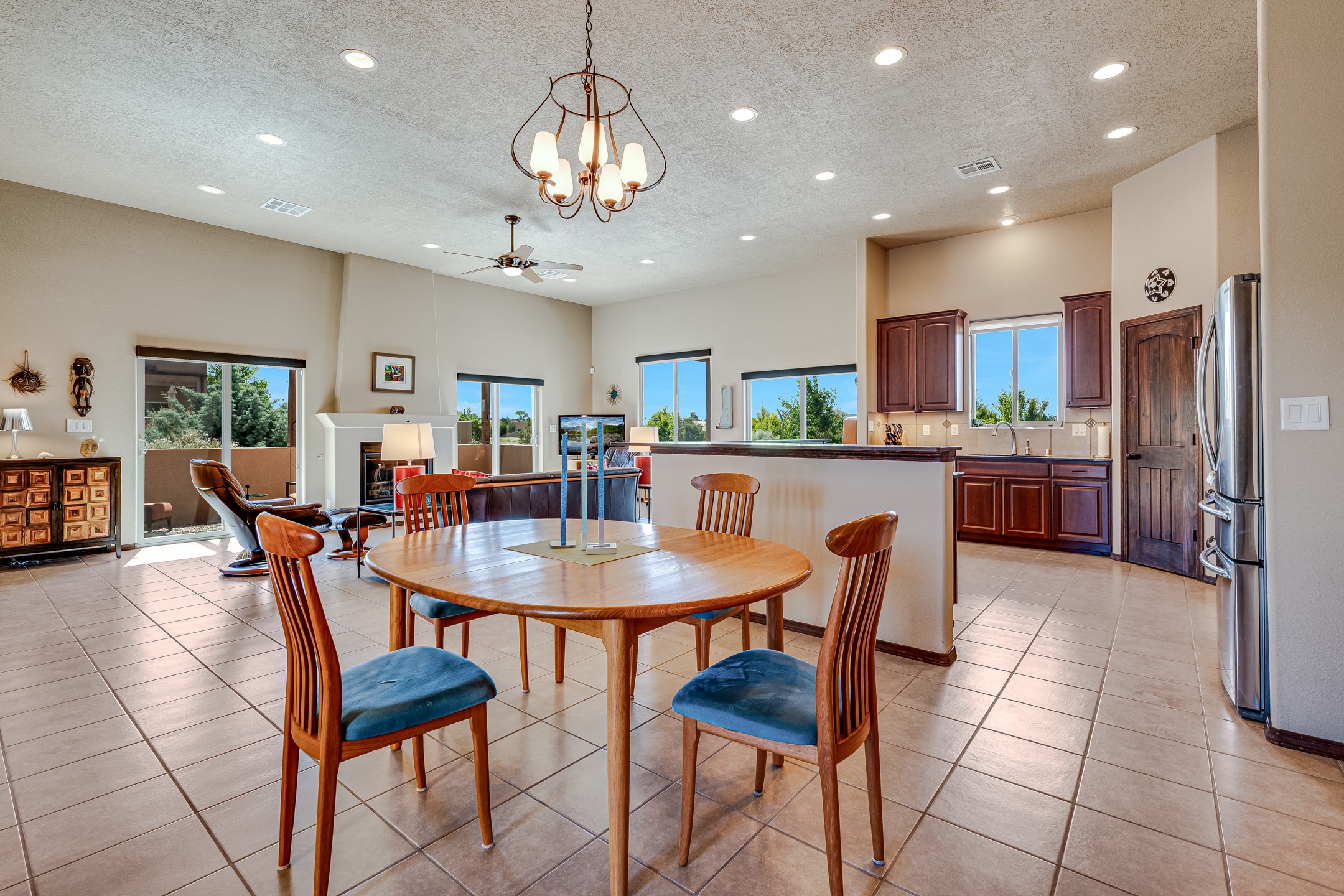 This thoughtfully designed three-bedroom, two-bathroom home offers space, comfort, and elegance in a peaceful neighborhood that is both easy to live in and commute from. The single-level home spans 2,256 square feet and includes a 331-square-foot attached studio (the converted third garage bay)--ideal as a fourth bedroom, office, or creative space. A bright living room with a cozy fireplace invites relaxation, while the modern kitchen features stainless steel appliances, stone counters, and ample space for cooking and entertaining. High ceilings, recessed lighting, and tile flooring enhance the open layout. The primary bedroom is complemented by an en-suite bathroom with double vanities, soaking tub with separate shower, and a generous walk-in closet. Two additional bedrooms provide flexibility for family or remote work. Located in the back of the development with views of green space and close to walking trails, your private outdoor space will feel limitless. Mature landscaping, the covered back portal and large side pergola combine to offer space for gatherings, gardening, or quiet moments. Other features include an attached 2-car garage, central AC and heat, and a roof with transferable warranty. Located near the Dinosaur Trail Trailhead and close to local supermarkets and healthcare, this home combines practical living with Santa Fe charm.
