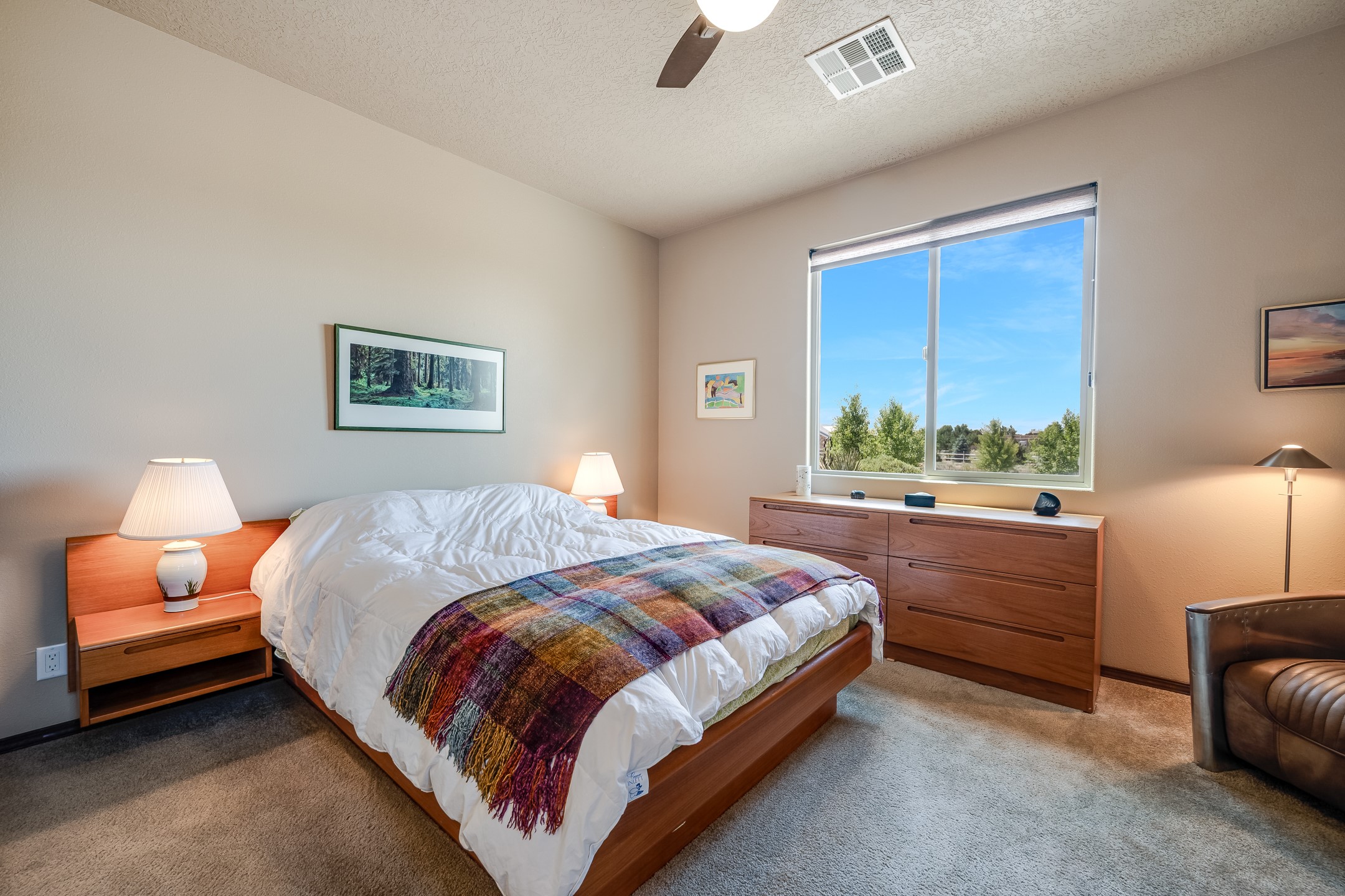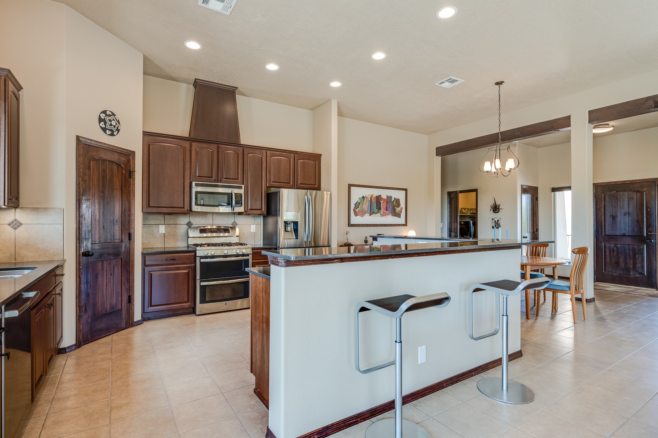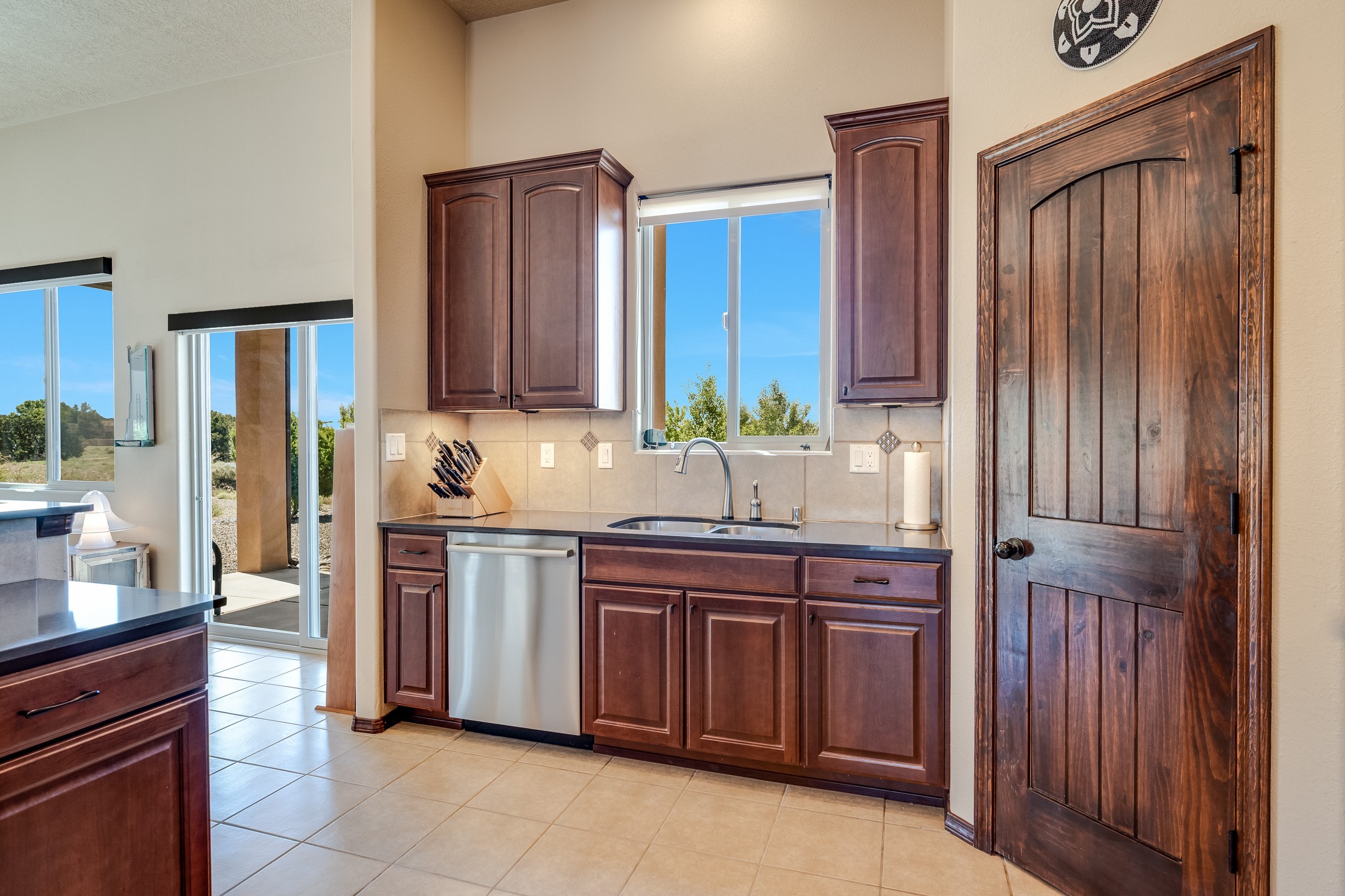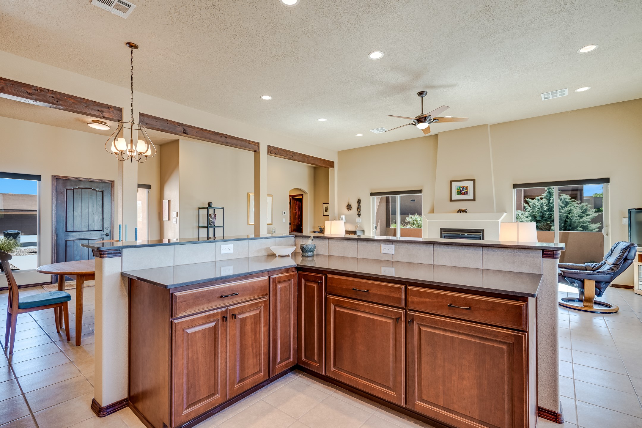 This thoughtfully designed three-bedroom, two-bathroom home offers space, comfort, and elegance in a peaceful neighborhood that is both easy to live in and commute from. The single-level home spans 2,256 square feet and includes a 331-square-foot attached studio (the converted third garage bay)--ideal as a fourth bedroom, office, or creative space. A bright living room with a cozy fireplace invites relaxation, while the modern kitchen features stainless steel appliances, stone counters, and ample space for cooking and entertaining. High ceilings, recessed lighting, and tile flooring enhance the open layout. The primary bedroom is complemented by an en-suite bathroom with double vanities, soaking tub with separate shower, and a generous walk-in closet. Two additional bedrooms provide flexibility for family or remote work. Located in the back of the development with views of green space and close to walking trails, your private outdoor space will feel limitless. Mature landscaping, the covered back portal and large side pergola combine to offer space for gatherings, gardening, or quiet moments. Other features include an attached 2-car garage, central AC and heat, and a roof with transferable warranty. Located near the Dinosaur Trail Trailhead and close to local supermarkets and healthcare, this home combines practical living with Santa Fe charm.