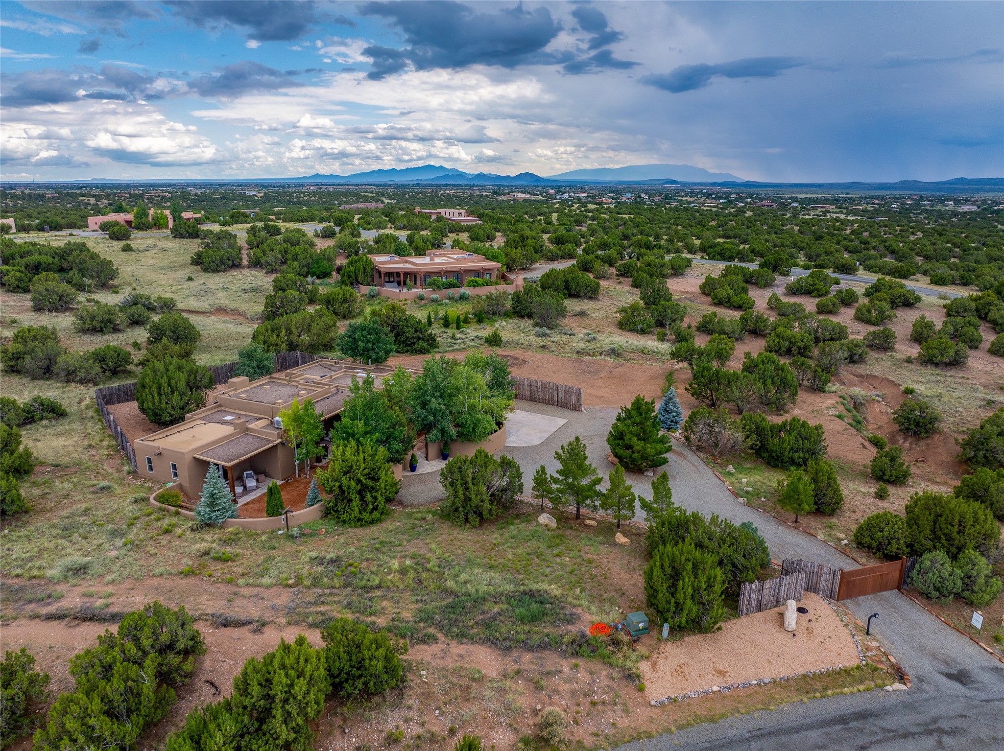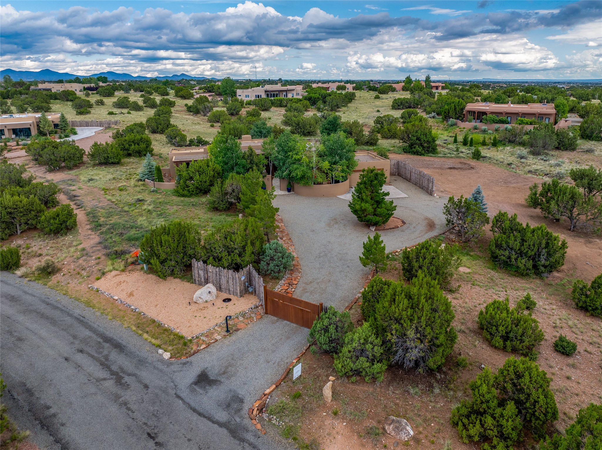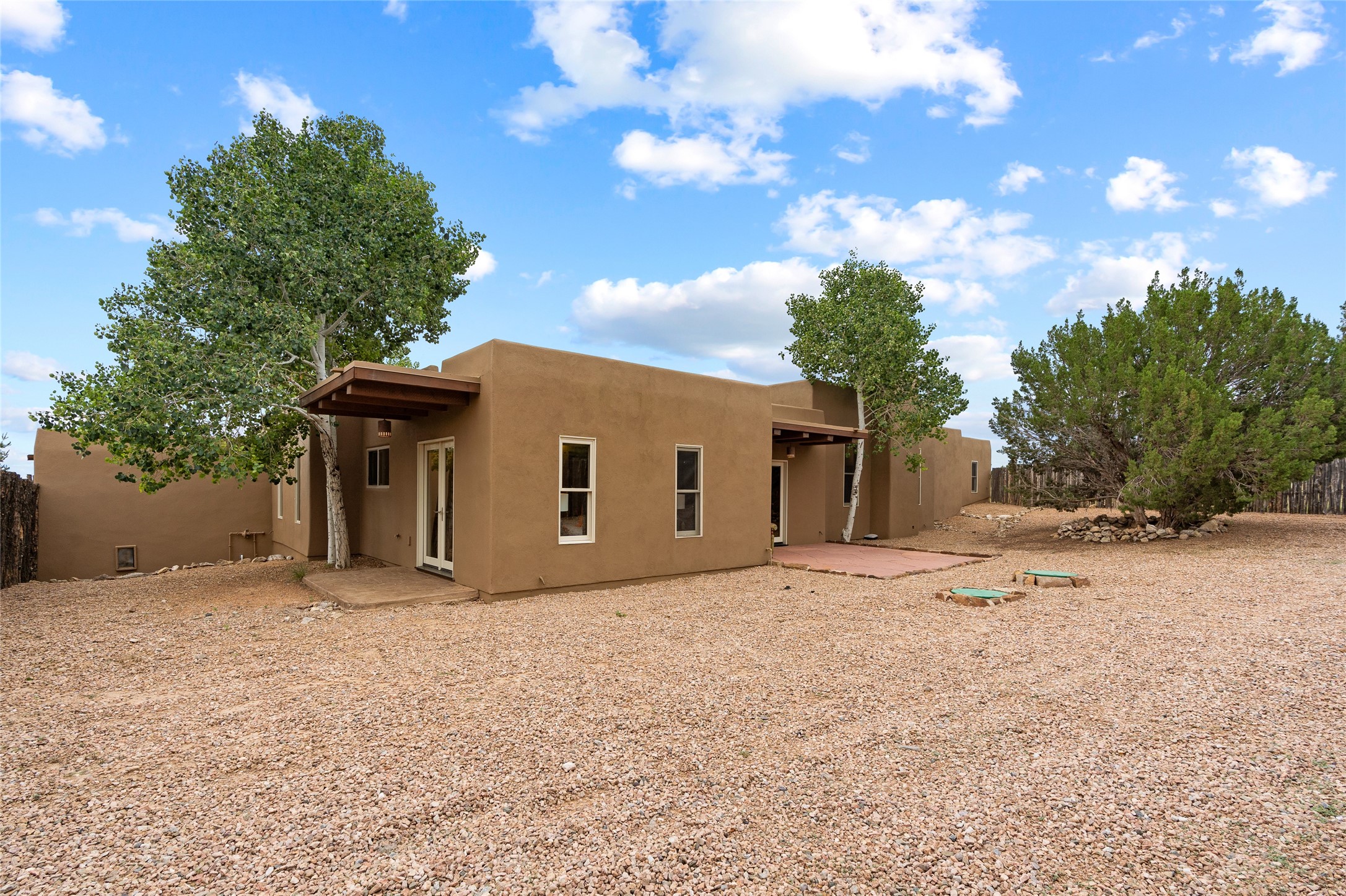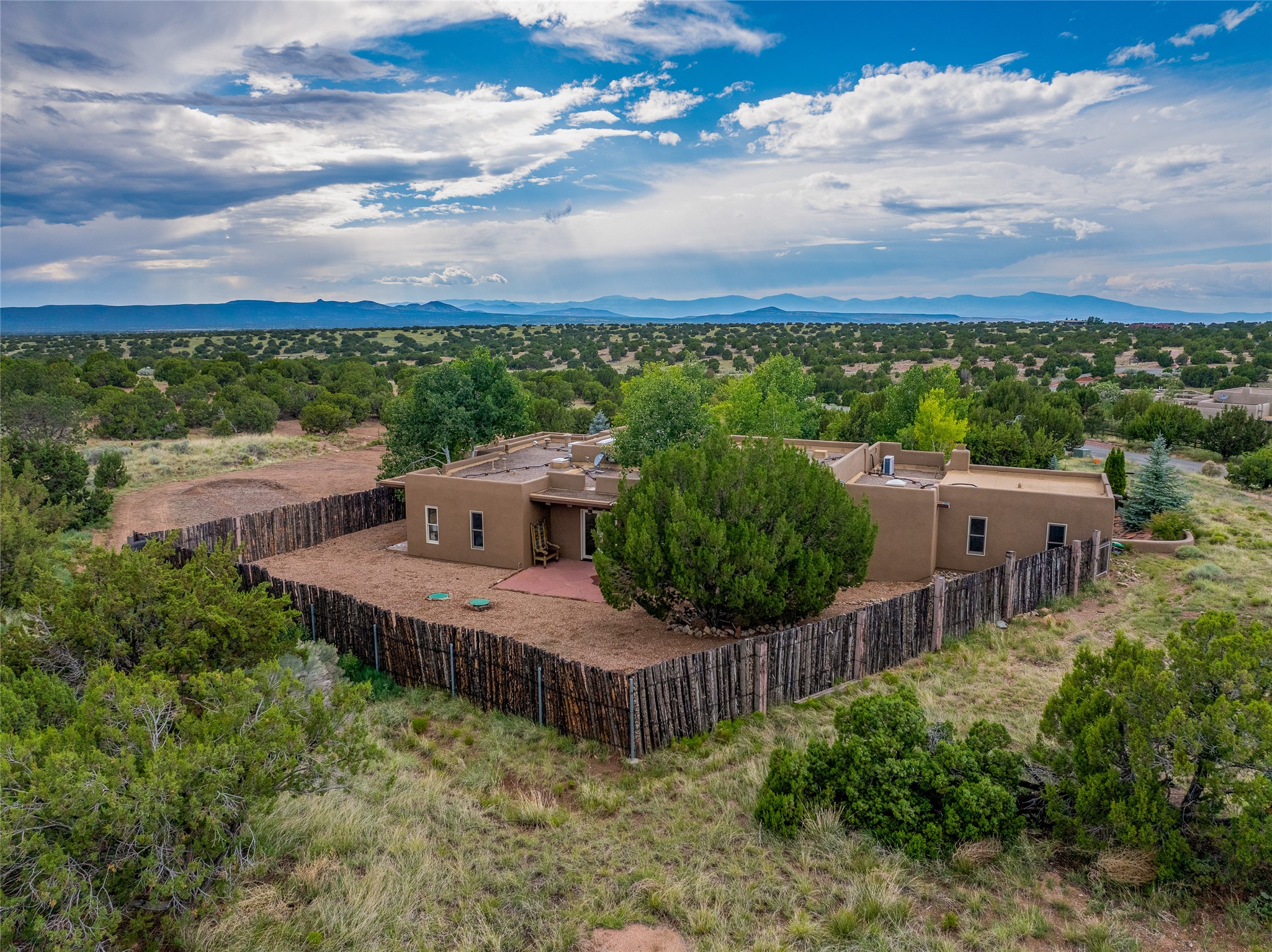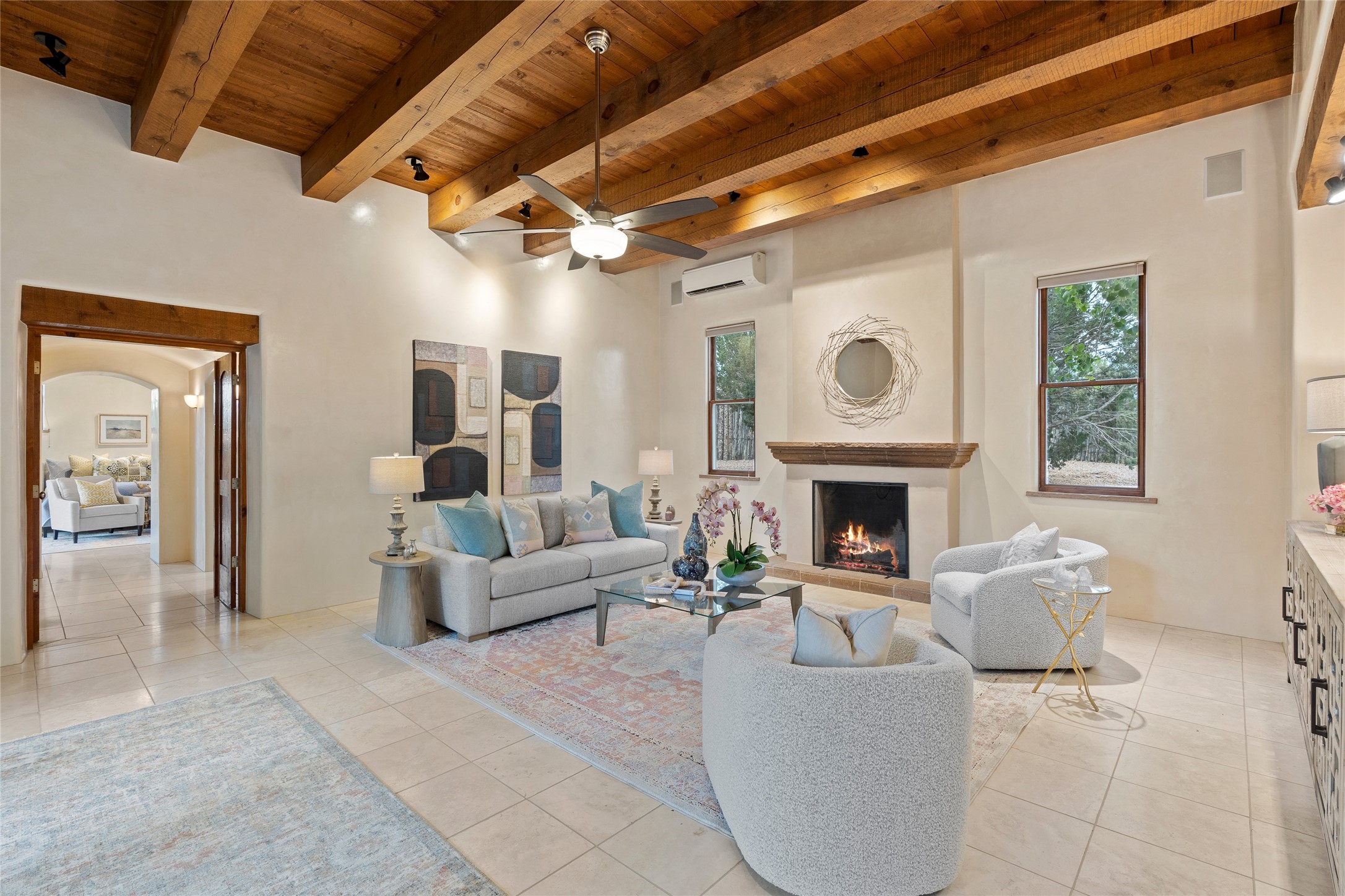 A Soulful Retreat 20 Minutes from the PlazaThrough the gate that offers privacy and safety lies a property that speaks to the soul. This exquisite 2,686-square-foot custom home by Artesanos is more than a residence--it's a refined expression of Santa Fe living, artfully sited on 3 pristine acres with views of Jemez Mountain sunsets. Mature aspens shade the stone path that leads to the front portal. In addition to the entry portal, a separate outdoor dining portal provides the perfect place to enjoy breathtaking sunsets and al fresco gatherings. Inside, soaring ceilings with hand-hewn wood beams, smooth plaster walls, and travertine floors evoke a timeless, grounded elegance. The light-filled living room is an inviting space with a Rumford fireplace serving as a cozy focal point. Patio doors extend the living space into the outdoors, seamlessly blending interior and exterior living.The spacious floor plan includes three generous bedrooms, plus a dedicated at-home office/media room with its own private patio--ideal for work, creativity, or retreat. The primary suite offers a serene sanctuary with its own private outdoor space for morning coffee or quiet reflection. Here you will also find an extra-large two-sided closet. Outfitted with travertine tile throughout, the bath features a large tub and separate shower, and two sinks. The large chef's kitchen is built for both entertaining and everyday inspiration, with custom cabinetry, stainless steel appliances, and high-end finishes. Off the kitchen is the spacious laundry room and pantry. Additional features include a two-car garage with epoxied floor, a new boiler, radiant in-floor heating, and six mini-splits for personalized air conditioning. This meticulously maintained property is located in an HOA and it has a shared well. The septic system was recently inspected and pumped and the entire house was re-stuccoed. This is a home where architecture, landscape, and lifestyle exist in perfect harmony.