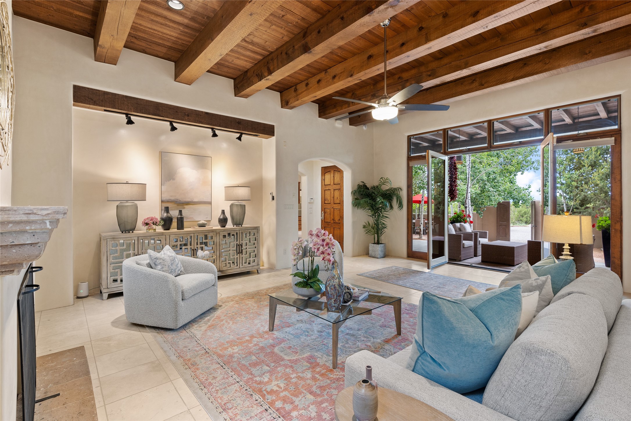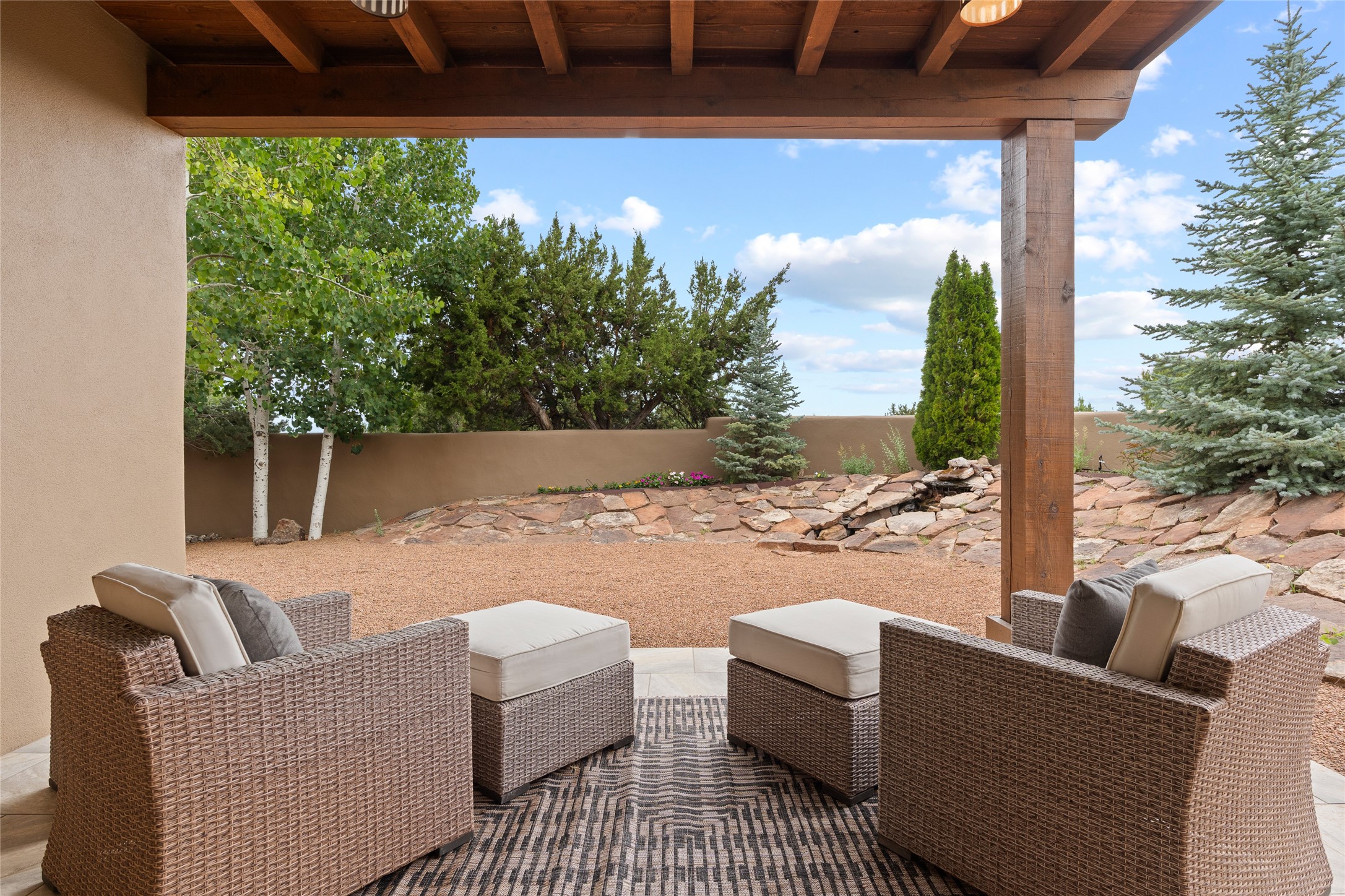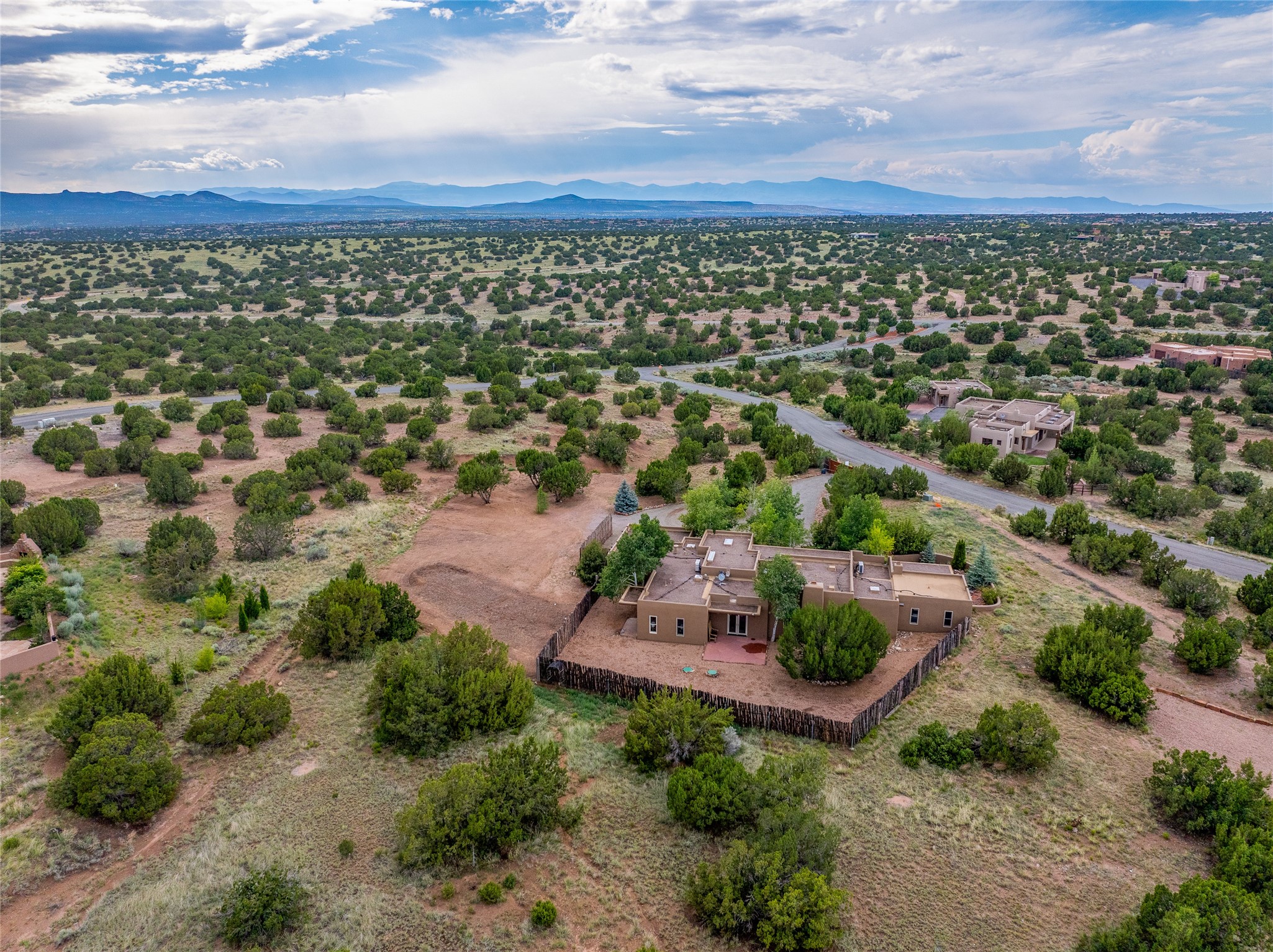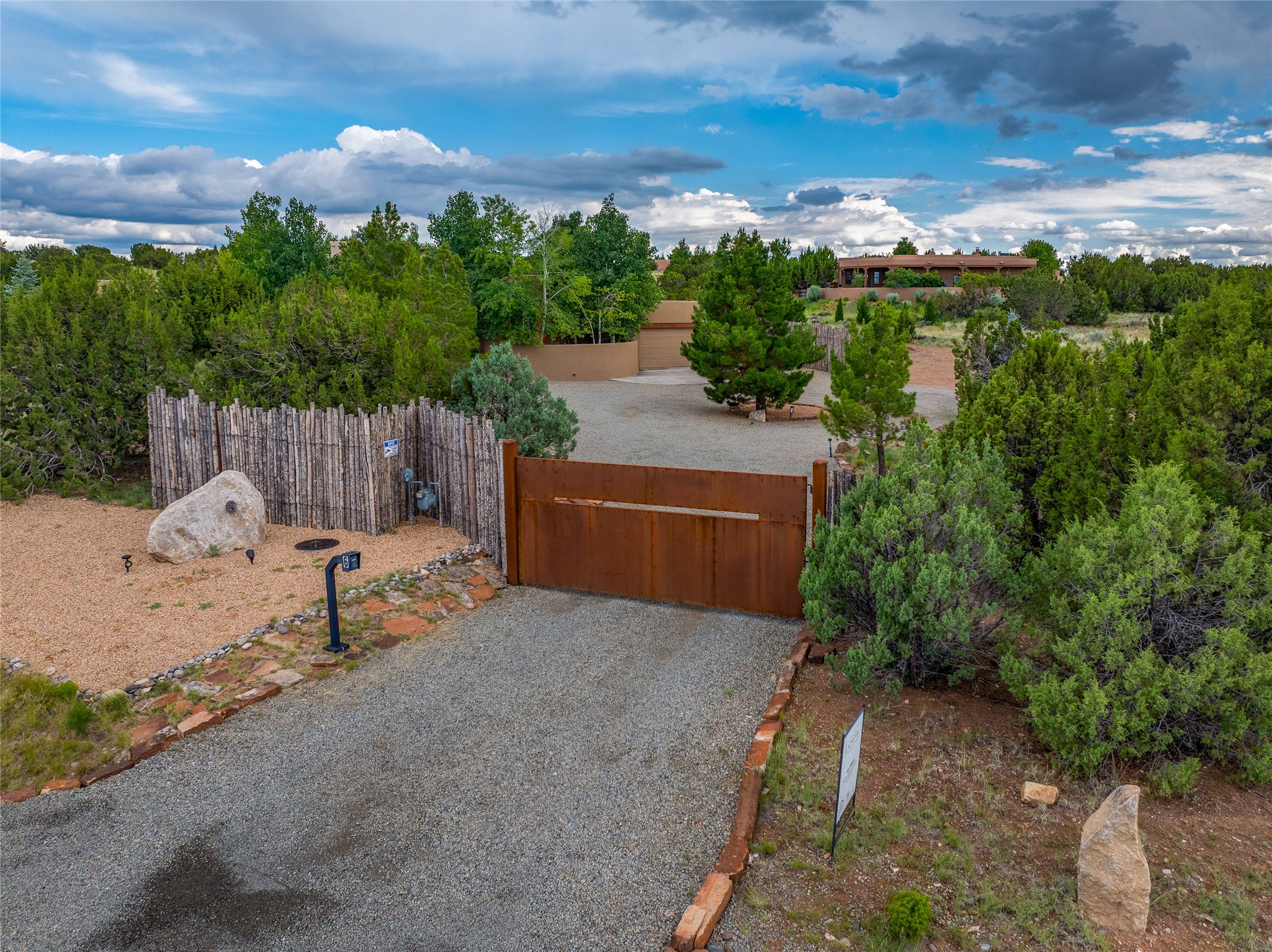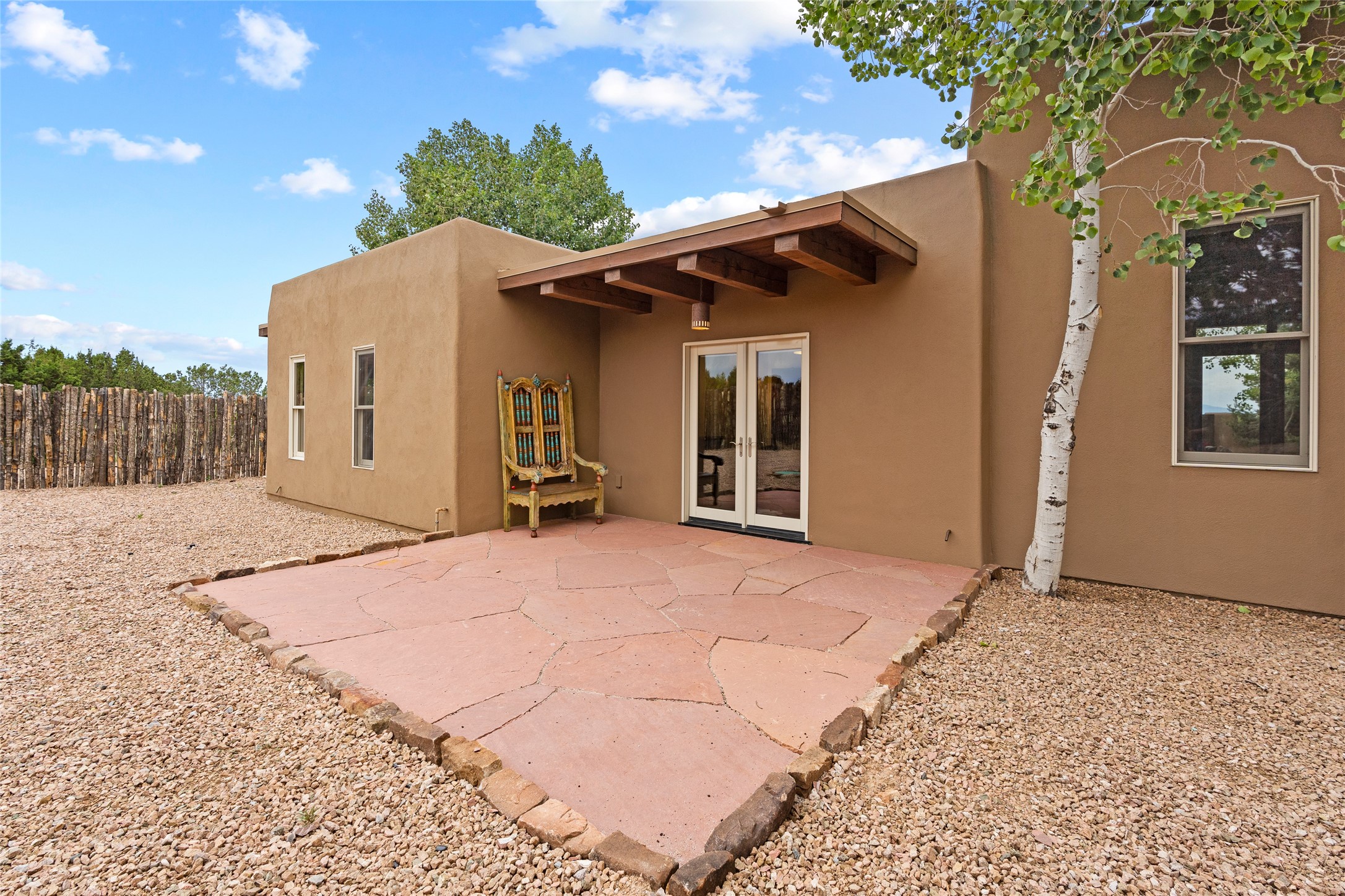 A Soulful Retreat 20 Minutes from the PlazaThrough the gate that offers privacy and safety lies a property that speaks to the soul. This exquisite 2,686-square-foot custom home by Artesanos is more than a residence--it's a refined expression of Santa Fe living, artfully sited on 3 pristine acres with views of Jemez Mountain sunsets. Mature aspens shade the stone path that leads to the front portal. In addition to the entry portal, a separate outdoor dining portal provides the perfect place to enjoy breathtaking sunsets and al fresco gatherings. Inside, soaring ceilings with hand-hewn wood beams, smooth plaster walls, and travertine floors evoke a timeless, grounded elegance. The light-filled living room is an inviting space with a Rumford fireplace serving as a cozy focal point. Patio doors extend the living space into the outdoors, seamlessly blending interior and exterior living.The spacious floor plan includes three generous bedrooms, plus a dedicated at-home office/media room with its own private patio--ideal for work, creativity, or retreat. The primary suite offers a serene sanctuary with its own private outdoor space for morning coffee or quiet reflection. Here you will also find an extra-large two-sided closet. Outfitted with travertine tile throughout, the bath features a large tub and separate shower, and two sinks. The large chef's kitchen is built for both entertaining and everyday inspiration, with custom cabinetry, stainless steel appliances, and high-end finishes. Off the kitchen is the spacious laundry room and pantry. Additional features include a two-car garage with epoxied floor, a new boiler, radiant in-floor heating, and six mini-splits for personalized air conditioning. This meticulously maintained property is located in an HOA and it has a shared well. The septic system was recently inspected and pumped and the entire house was re-stuccoed. This is a home where architecture, landscape, and lifestyle exist in perfect harmony.