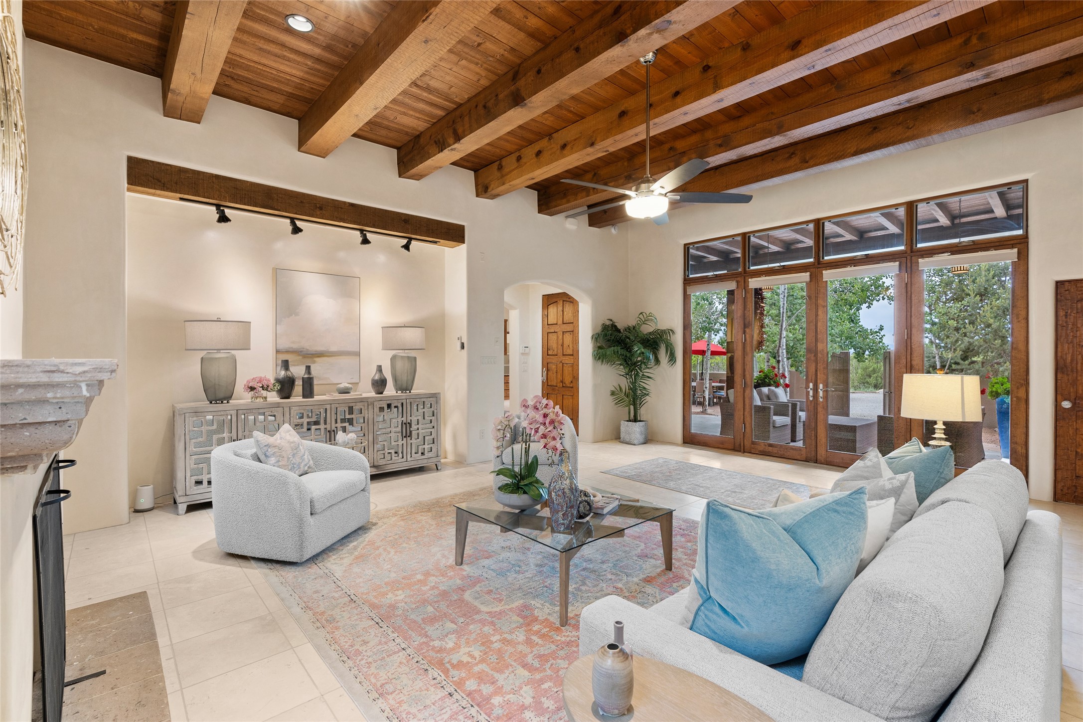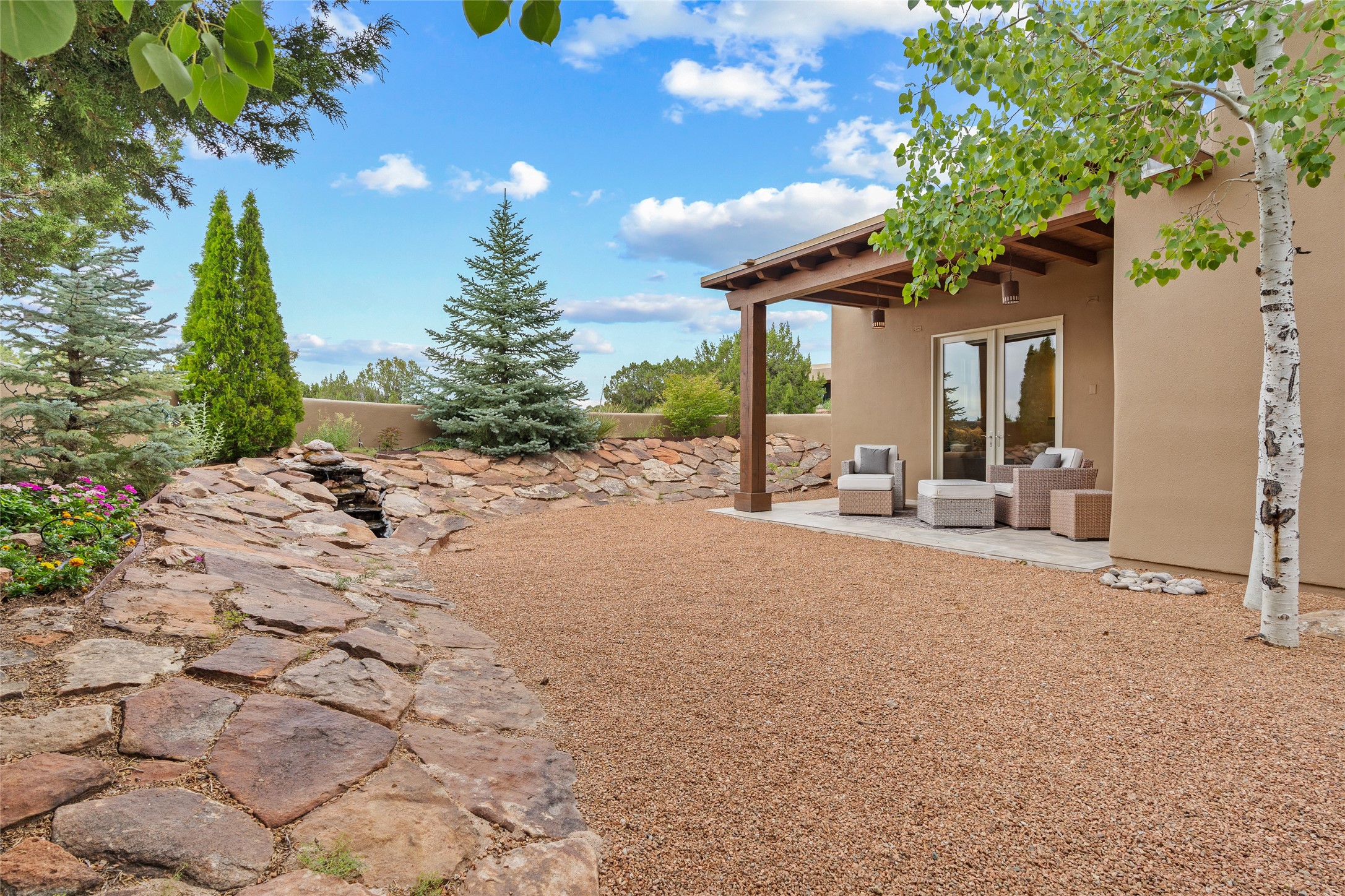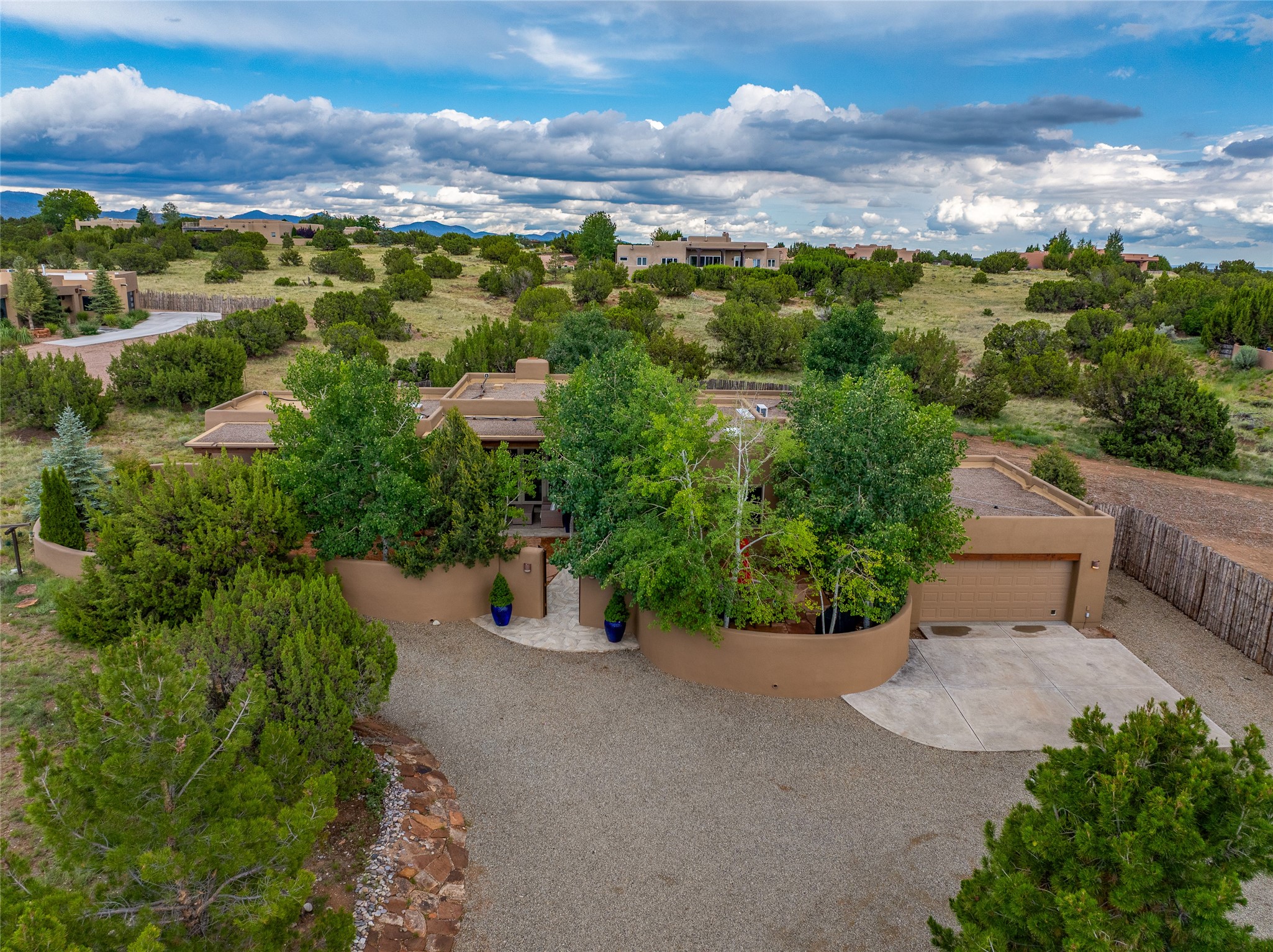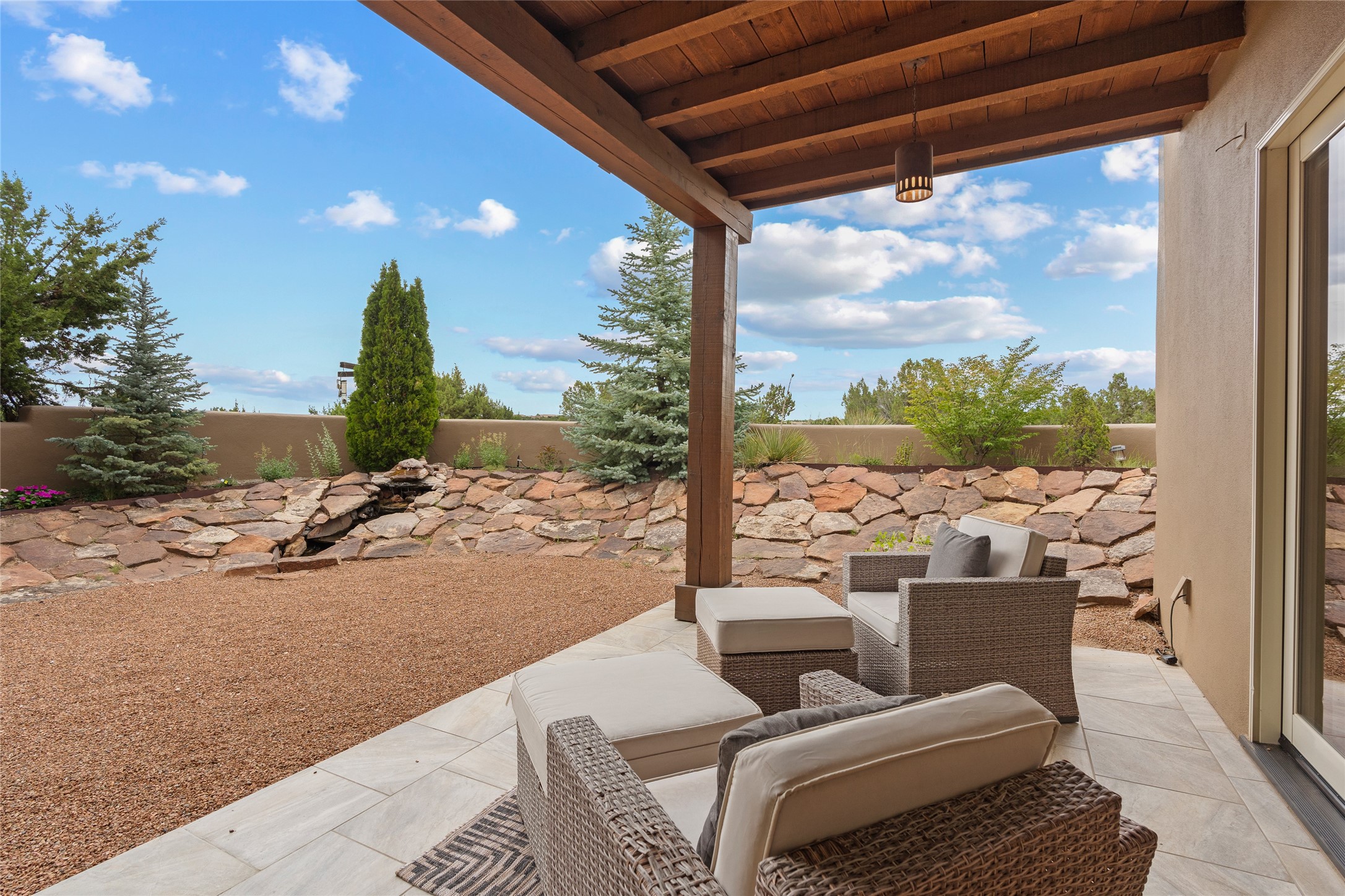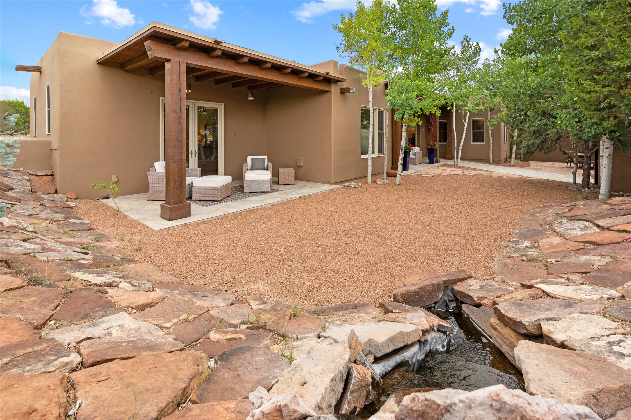 A Soulful Retreat 20 Minutes from the PlazaThrough the gate that offers privacy and safety lies a property that speaks to the soul. This exquisite 2,686-square-foot custom home by Artesanos is more than a residence--it's a refined expression of Santa Fe living, artfully sited on 3 pristine acres with views of Jemez Mountain sunsets. Mature aspens shade the stone path that leads to the front portal. In addition to the entry portal, a separate outdoor dining portal provides the perfect place to enjoy breathtaking sunsets and al fresco gatherings. Inside, soaring ceilings with hand-hewn wood beams, smooth plaster walls, and travertine floors evoke a timeless, grounded elegance. The light-filled living room is an inviting space with a Rumford fireplace serving as a cozy focal point. Patio doors extend the living space into the outdoors, seamlessly blending interior and exterior living.The spacious floor plan includes three generous bedrooms, plus a dedicated at-home office/media room with its own private patio--ideal for work, creativity, or retreat. The primary suite offers a serene sanctuary with its own private outdoor space for morning coffee or quiet reflection. Here you will also find an extra-large two-sided closet. Outfitted with travertine tile throughout, the bath features a large tub and separate shower, and two sinks. The large chef's kitchen is built for both entertaining and everyday inspiration, with custom cabinetry, stainless steel appliances, and high-end finishes. Off the kitchen is the spacious laundry room and pantry. Additional features include a two-car garage with epoxied floor, a new boiler, radiant in-floor heating, and six mini-splits for personalized air conditioning. This meticulously maintained property is located in an HOA and it has a shared well. The septic system was recently inspected and pumped and the entire house was re-stuccoed. This is a home where architecture, landscape, and lifestyle exist in perfect harmony.