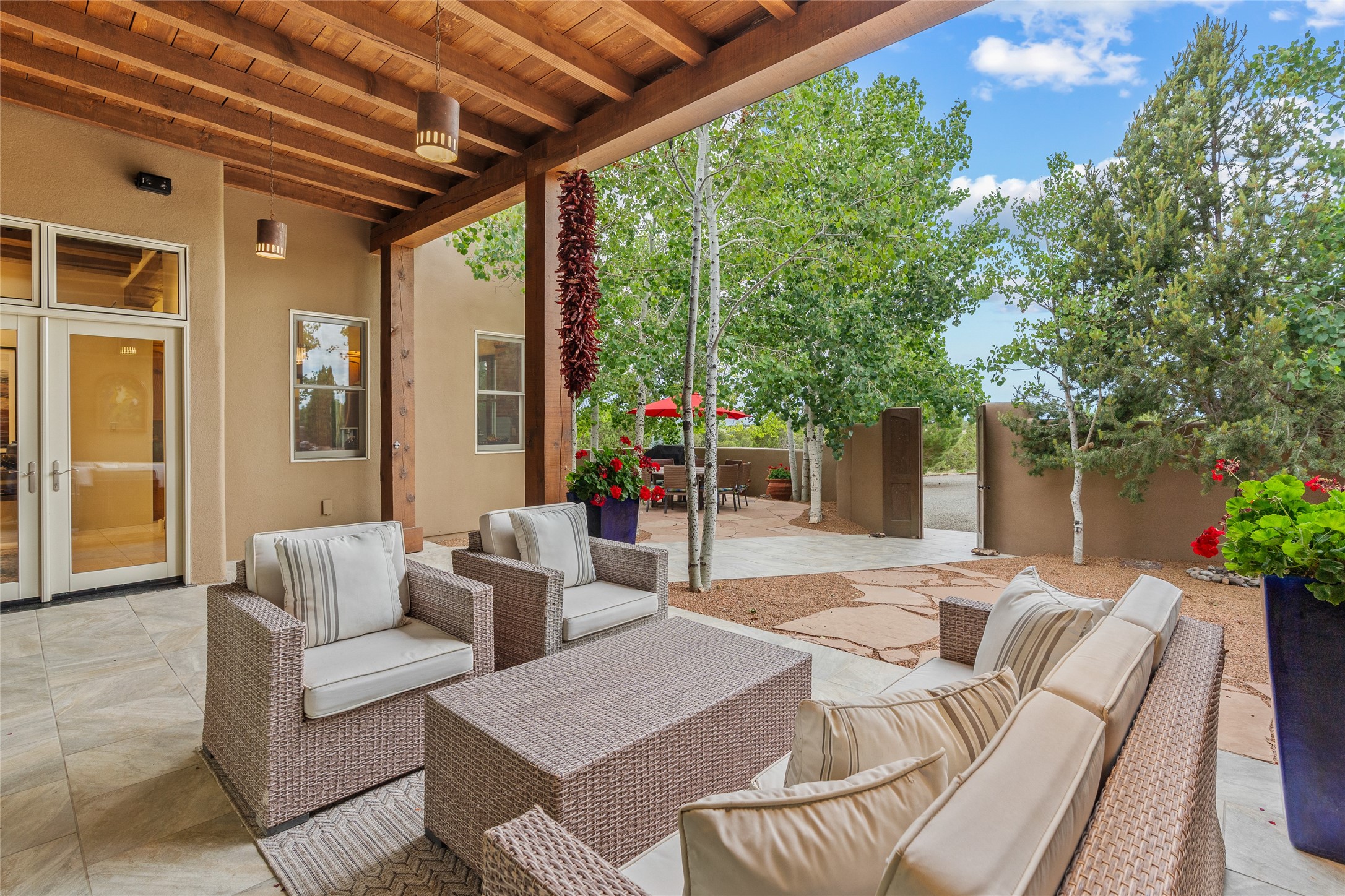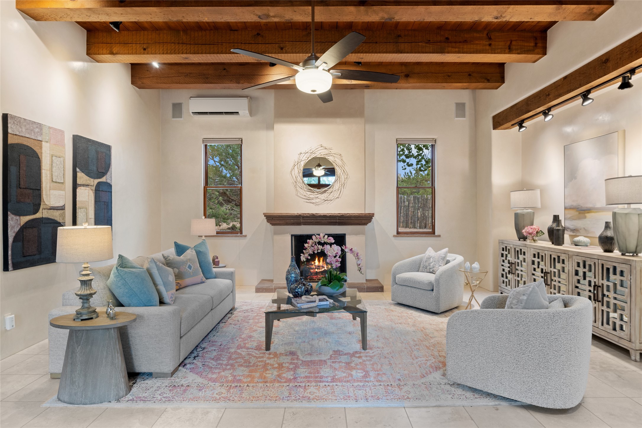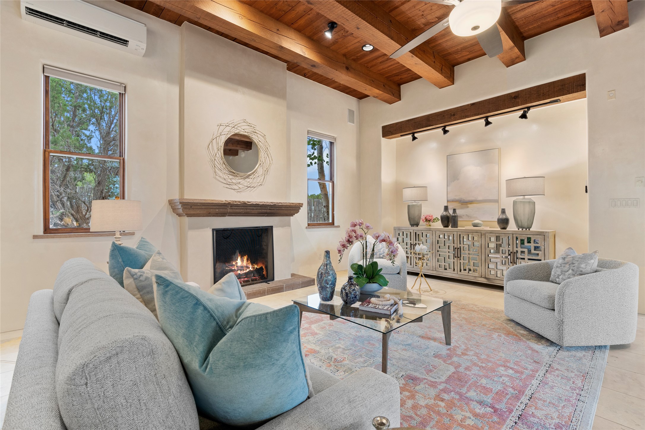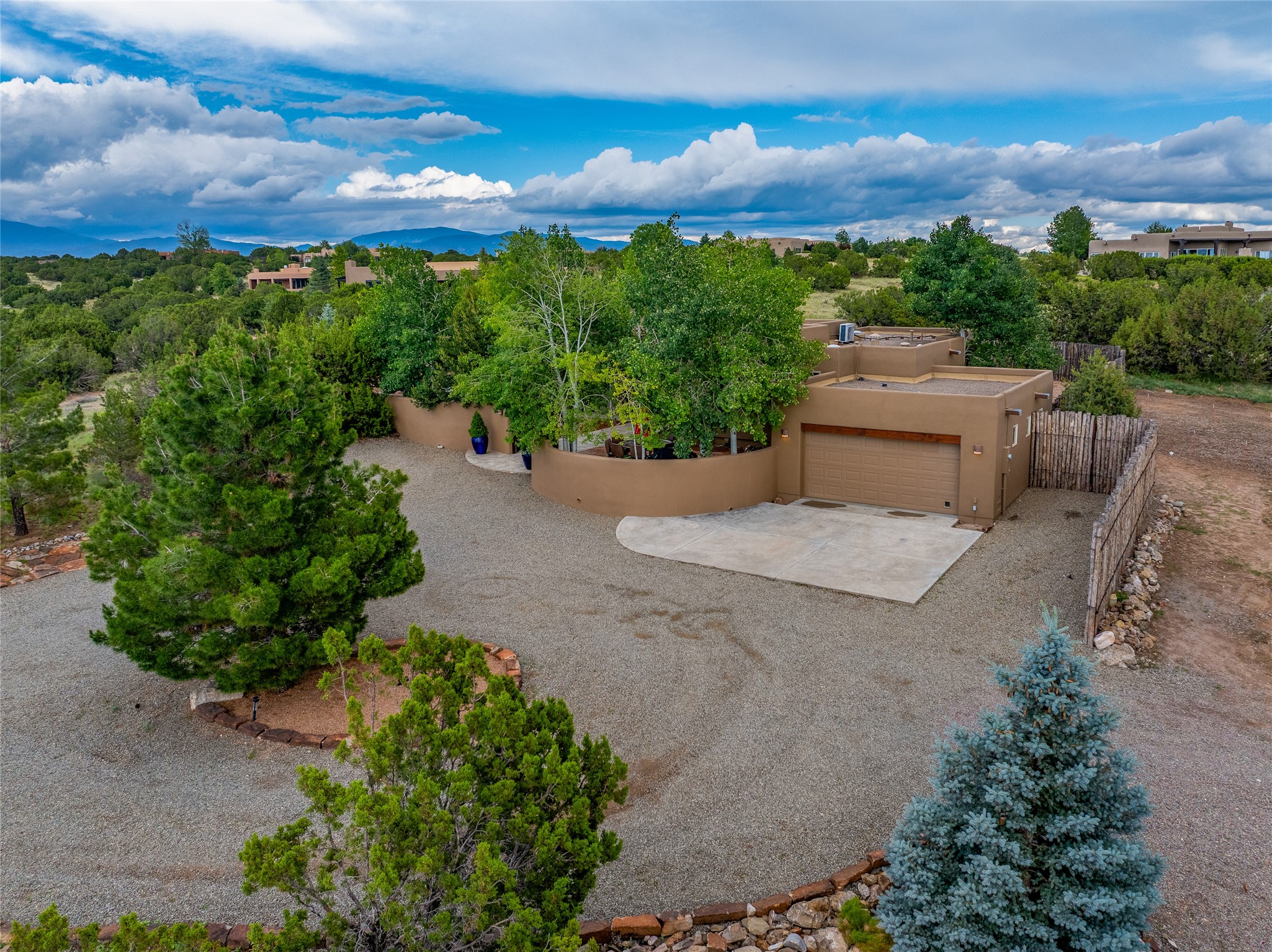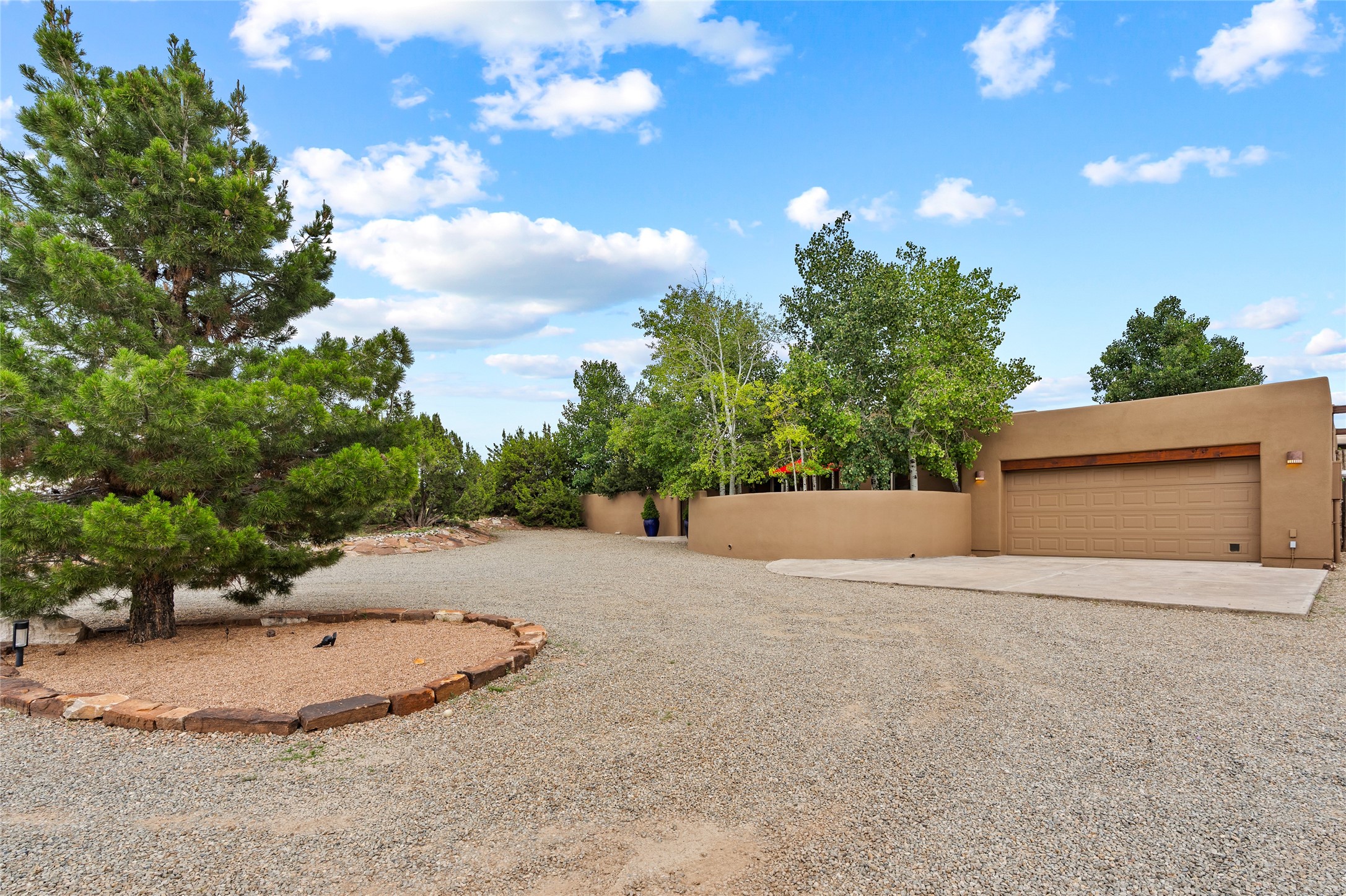 A Soulful Retreat 20 Minutes from the PlazaThrough the gate that offers privacy and safety lies a property that speaks to the soul. This exquisite 2,686-square-foot custom home by Artesanos is more than a residence--it's a refined expression of Santa Fe living, artfully sited on 3 pristine acres with views of Jemez Mountain sunsets. Mature aspens shade the stone path that leads to the front portal. In addition to the entry portal, a separate outdoor dining portal provides the perfect place to enjoy breathtaking sunsets and al fresco gatherings. Inside, soaring ceilings with hand-hewn wood beams, smooth plaster walls, and travertine floors evoke a timeless, grounded elegance. The light-filled living room is an inviting space with a Rumford fireplace serving as a cozy focal point. Patio doors extend the living space into the outdoors, seamlessly blending interior and exterior living.The spacious floor plan includes three generous bedrooms, plus a dedicated at-home office/media room with its own private patio--ideal for work, creativity, or retreat. The primary suite offers a serene sanctuary with its own private outdoor space for morning coffee or quiet reflection. Here you will also find an extra-large two-sided closet. Outfitted with travertine tile throughout, the bath features a large tub and separate shower, and two sinks. The large chef's kitchen is built for both entertaining and everyday inspiration, with custom cabinetry, stainless steel appliances, and high-end finishes. Off the kitchen is the spacious laundry room and pantry. Additional features include a two-car garage with epoxied floor, a new boiler, radiant in-floor heating, and six mini-splits for personalized air conditioning. This meticulously maintained property is located in an HOA and it has a shared well. The septic system was recently inspected and pumped and the entire house was re-stuccoed. This is a home where architecture, landscape, and lifestyle exist in perfect harmony.