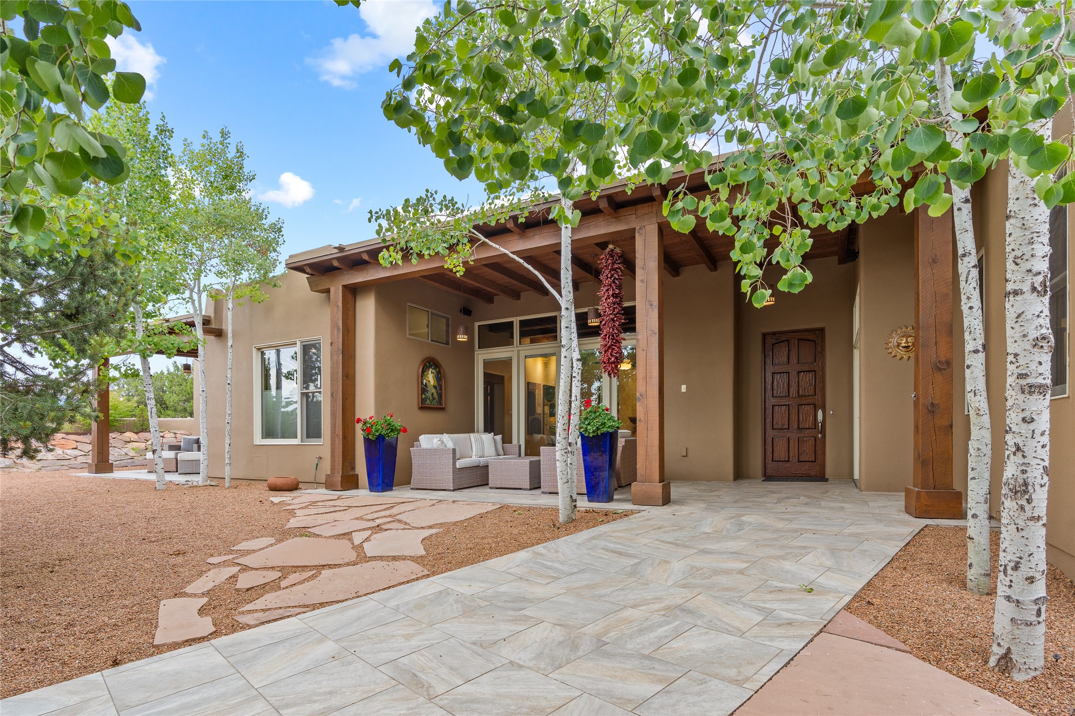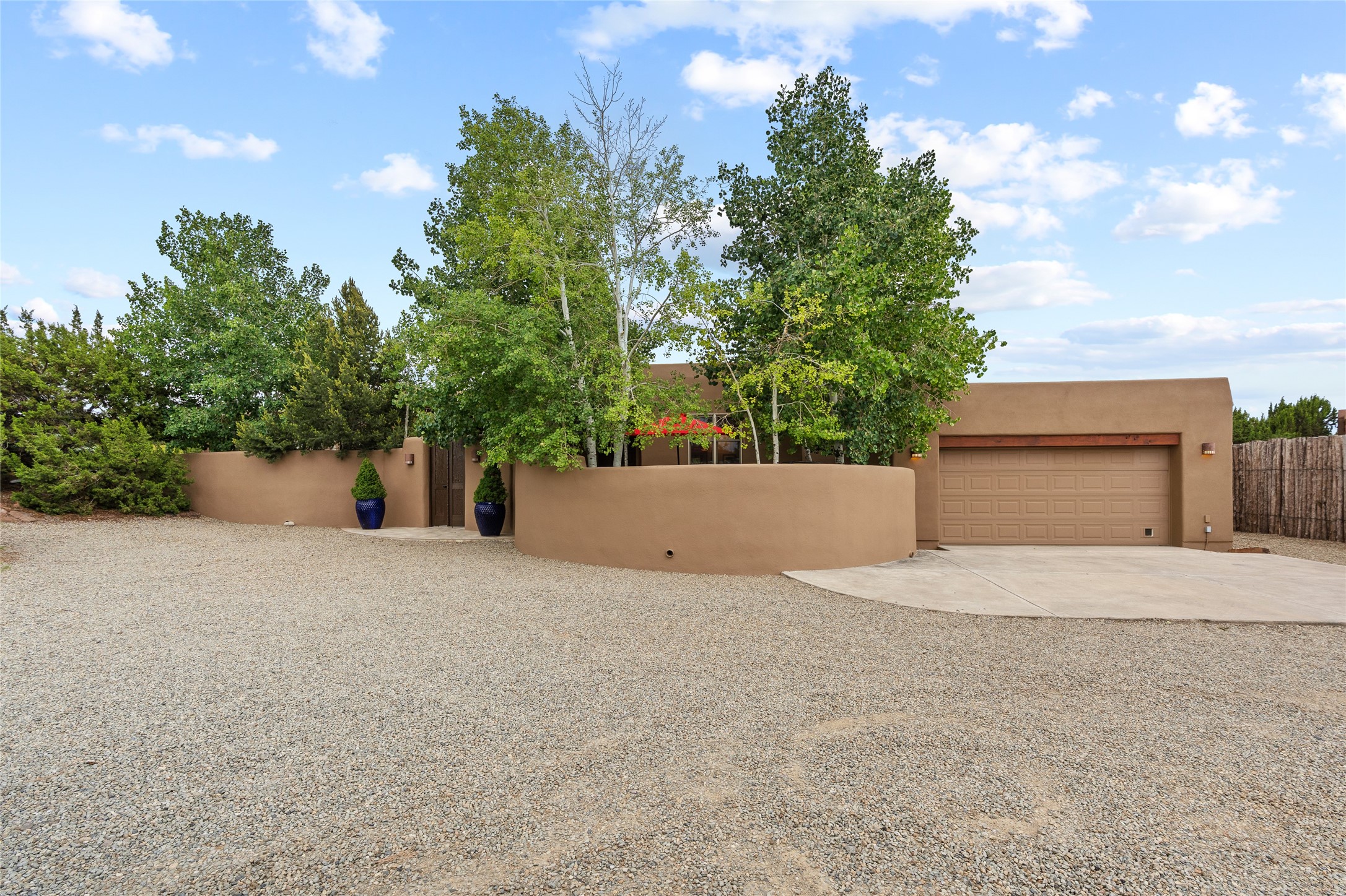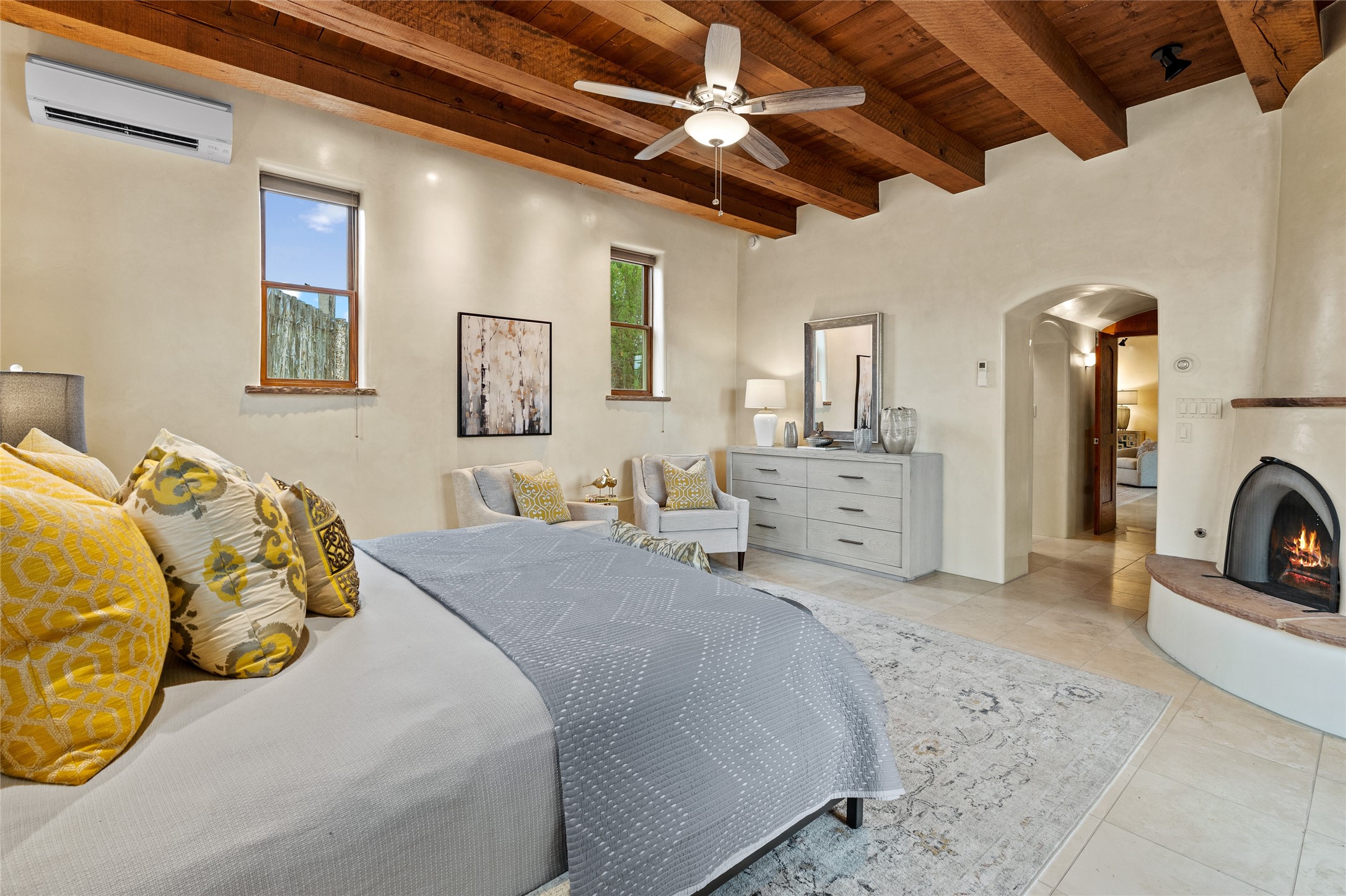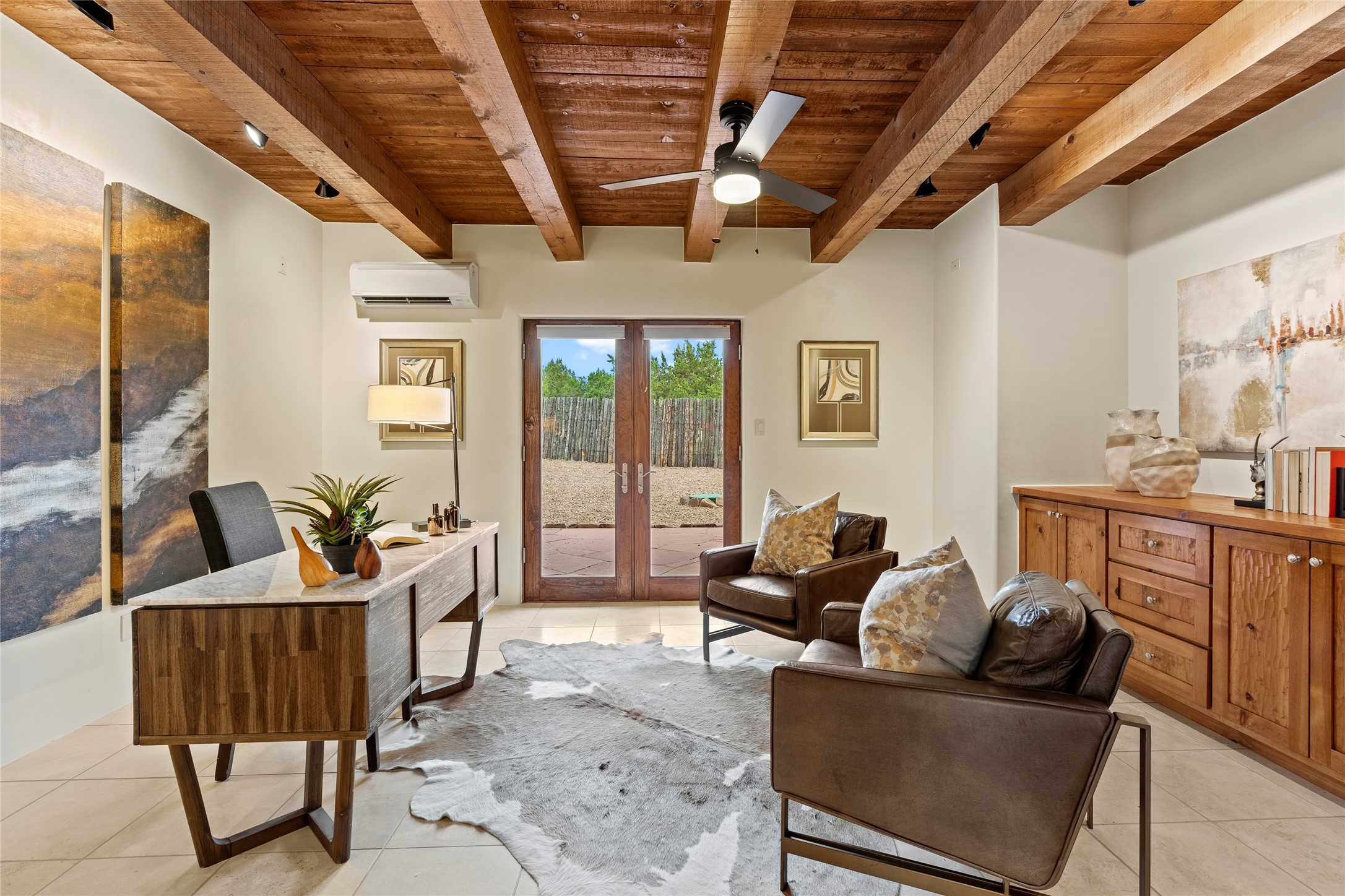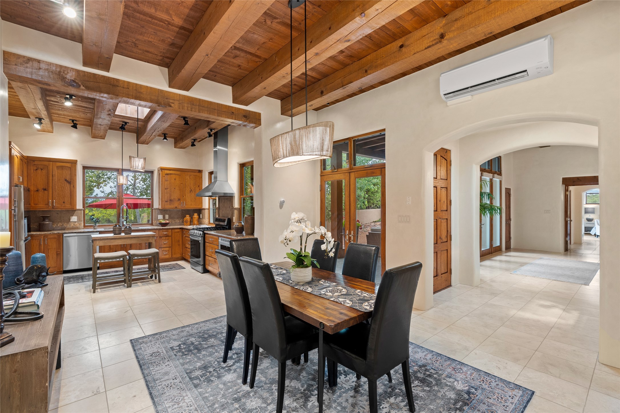 A Soulful Retreat 20 Minutes from the PlazaThrough the gate that offers privacy and safety lies a property that speaks to the soul. This exquisite 2,686-square-foot custom home by Artesanos is more than a residence--it's a refined expression of Santa Fe living, artfully sited on 3 pristine acres with views of Jemez Mountain sunsets. Mature aspens shade the stone path that leads to the front portal. In addition to the entry portal, a separate outdoor dining portal provides the perfect place to enjoy breathtaking sunsets and al fresco gatherings. Inside, soaring ceilings with hand-hewn wood beams, smooth plaster walls, and travertine floors evoke a timeless, grounded elegance. The light-filled living room is an inviting space with a Rumford fireplace serving as a cozy focal point. Patio doors extend the living space into the outdoors, seamlessly blending interior and exterior living.The spacious floor plan includes three generous bedrooms, plus a dedicated at-home office/media room with its own private patio--ideal for work, creativity, or retreat. The primary suite offers a serene sanctuary with its own private outdoor space for morning coffee or quiet reflection. Here you will also find an extra-large two-sided closet. Outfitted with travertine tile throughout, the bath features a large tub and separate shower, and two sinks. The large chef's kitchen is built for both entertaining and everyday inspiration, with custom cabinetry, stainless steel appliances, and high-end finishes. Off the kitchen is the spacious laundry room and pantry. Additional features include a two-car garage with epoxied floor, a new boiler, radiant in-floor heating, and six mini-splits for personalized air conditioning. This meticulously maintained property is located in an HOA and it has a shared well. The septic system was recently inspected and pumped and the entire house was re-stuccoed. This is a home where architecture, landscape, and lifestyle exist in perfect harmony.