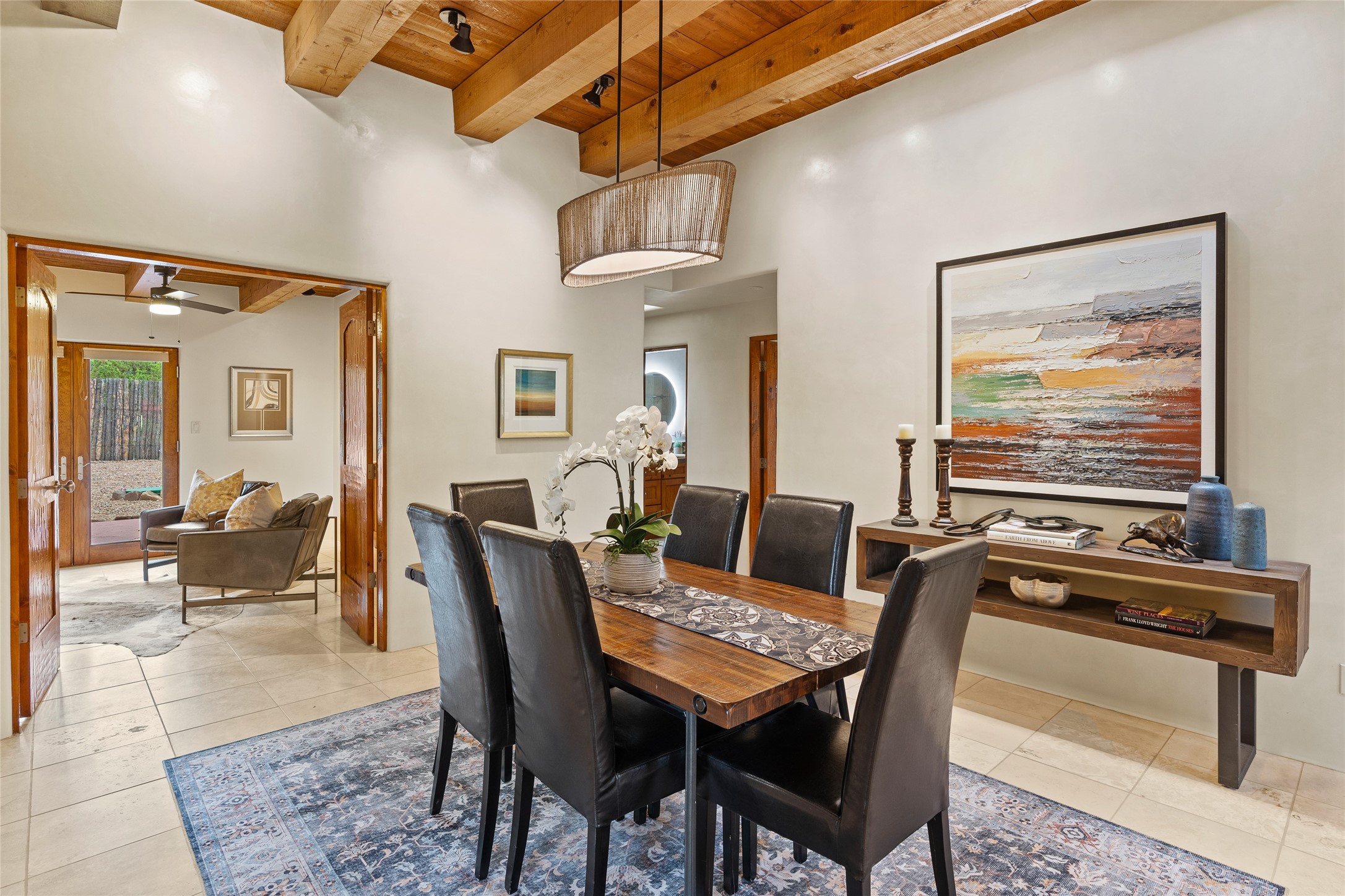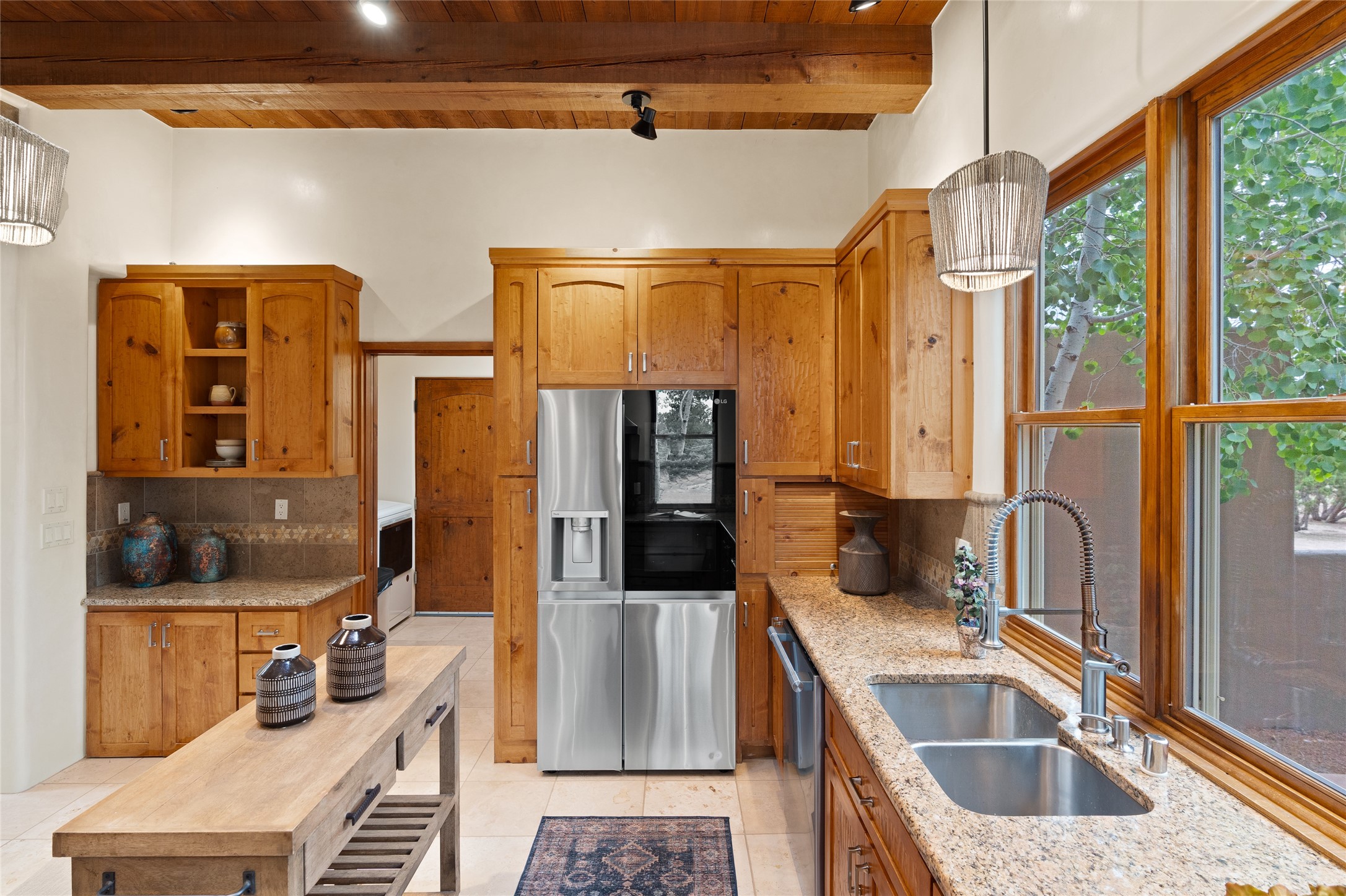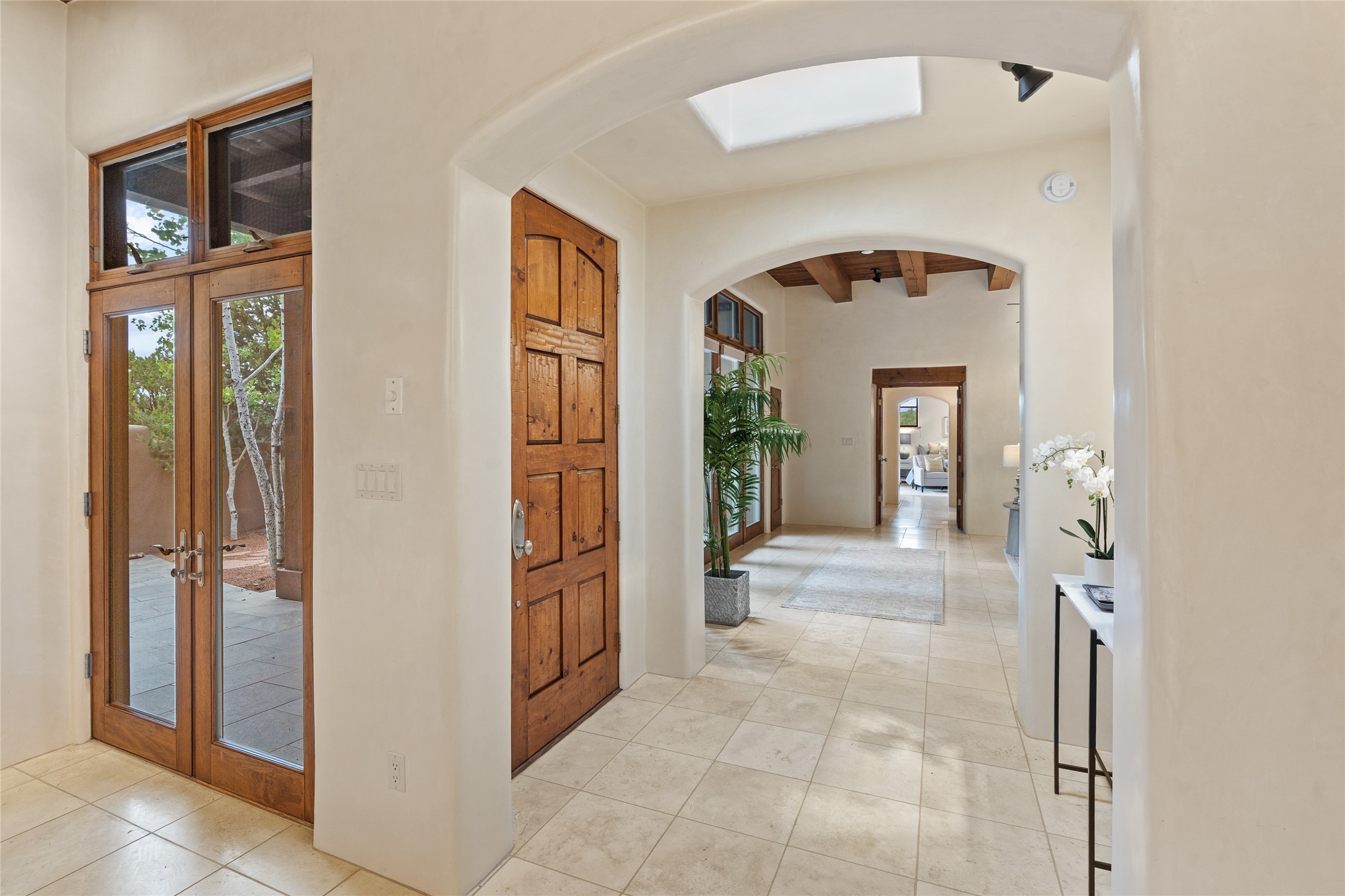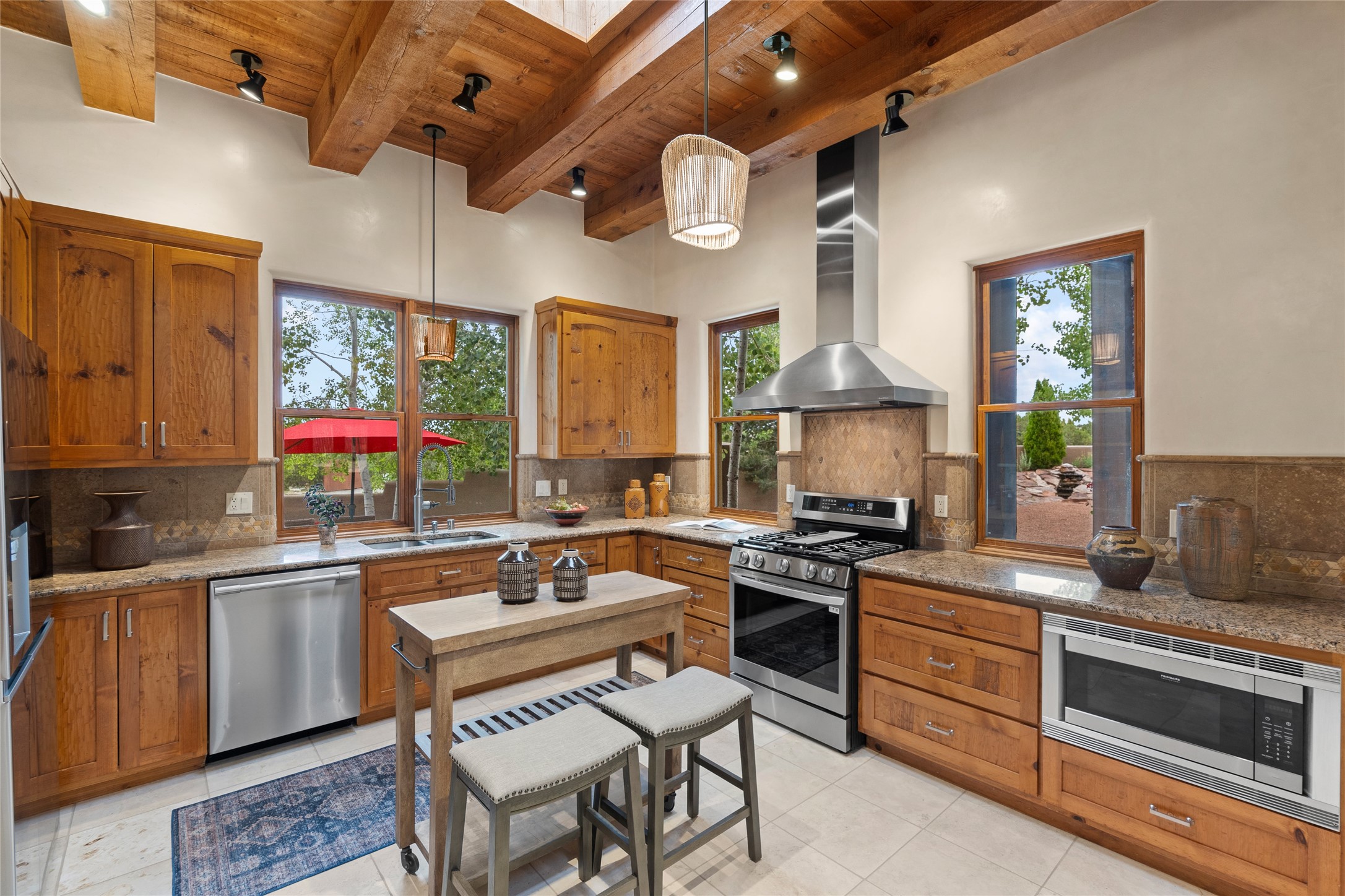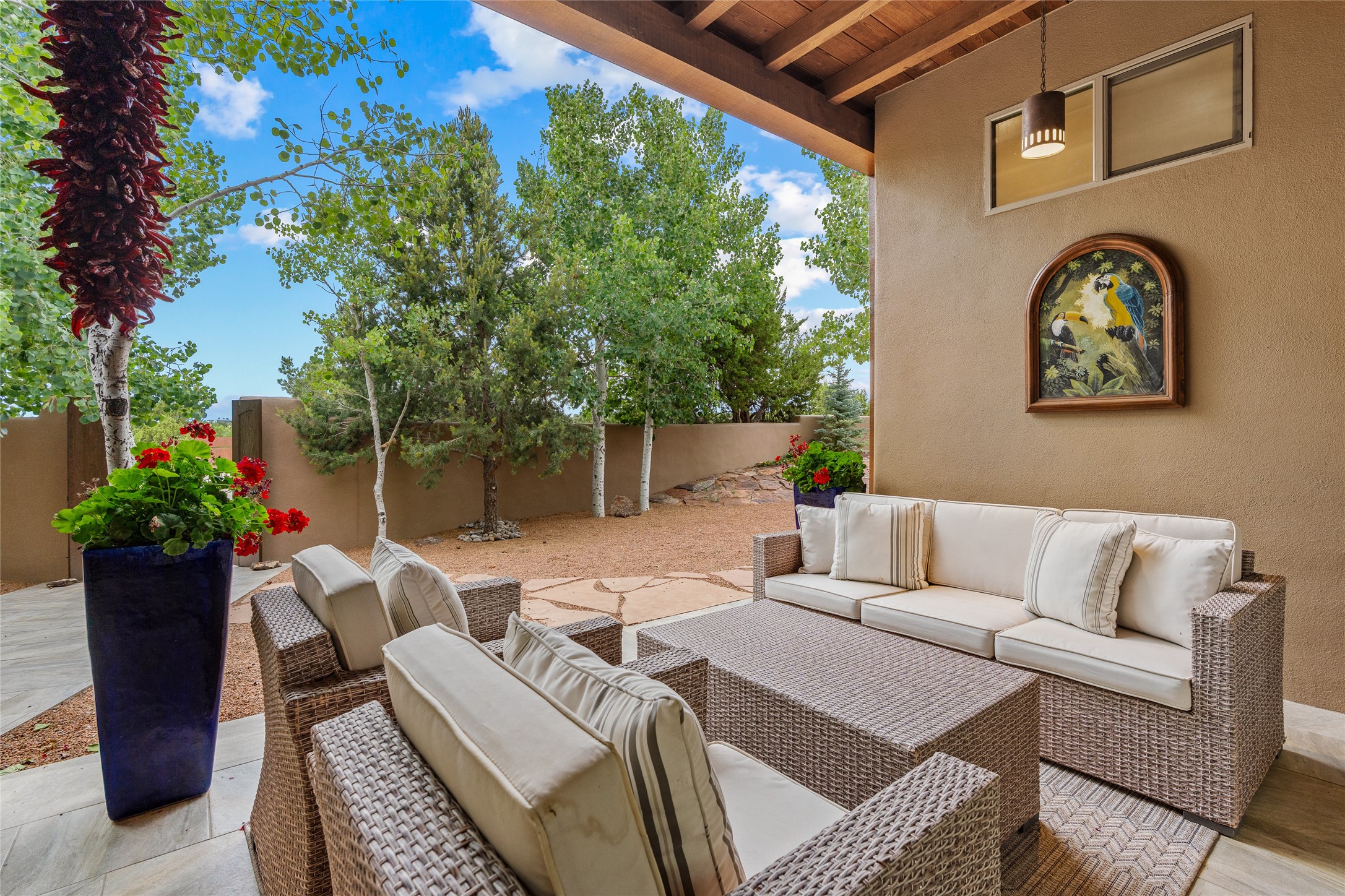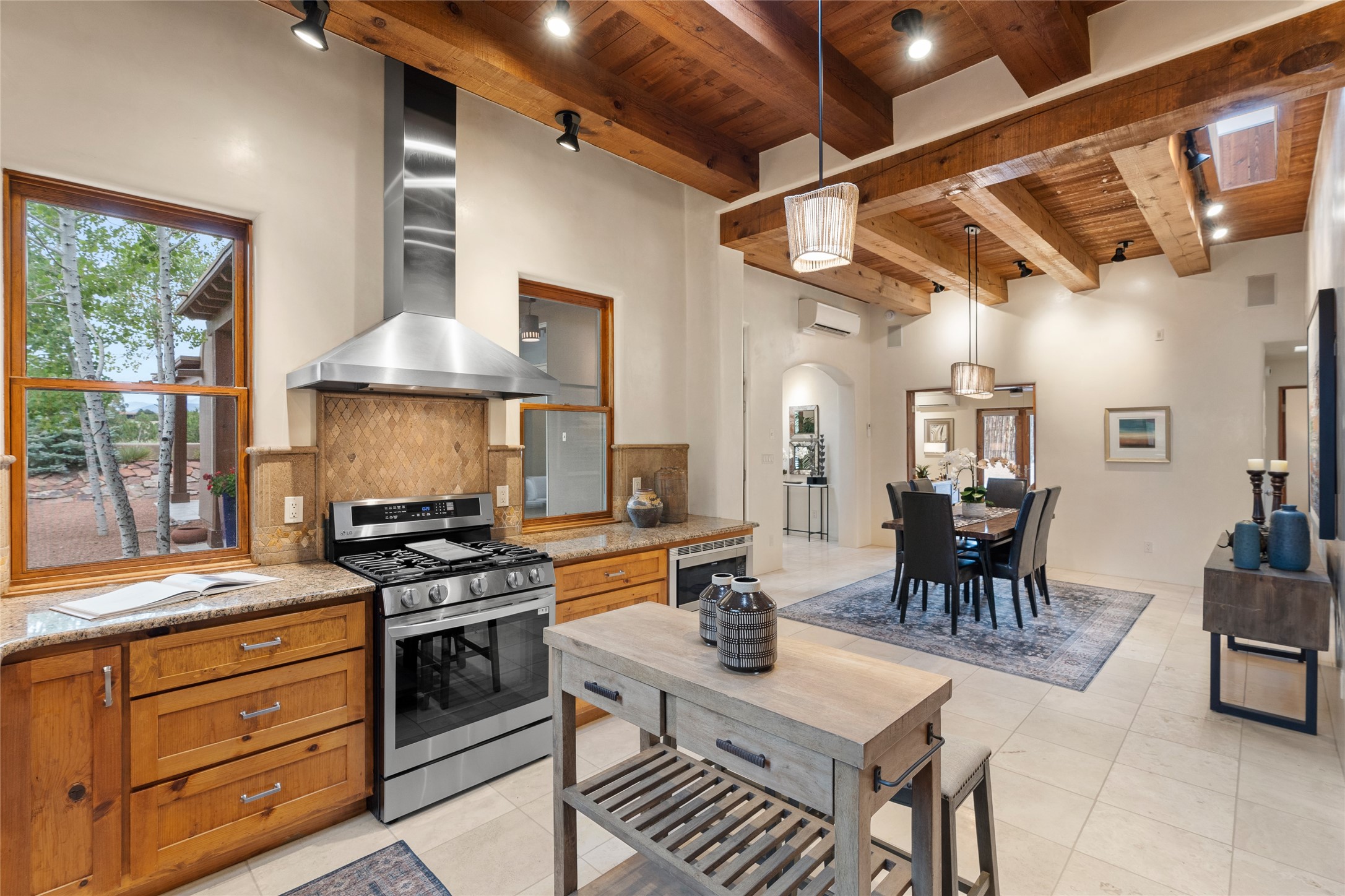 A Soulful Retreat 20 Minutes from the PlazaThrough the gate that offers privacy and safety lies a property that speaks to the soul. This exquisite 2,686-square-foot custom home by Artesanos is more than a residence--it's a refined expression of Santa Fe living, artfully sited on 3 pristine acres with views of Jemez Mountain sunsets. Mature aspens shade the stone path that leads to the front portal. In addition to the entry portal, a separate outdoor dining portal provides the perfect place to enjoy breathtaking sunsets and al fresco gatherings. Inside, soaring ceilings with hand-hewn wood beams, smooth plaster walls, and travertine floors evoke a timeless, grounded elegance. The light-filled living room is an inviting space with a Rumford fireplace serving as a cozy focal point. Patio doors extend the living space into the outdoors, seamlessly blending interior and exterior living.The spacious floor plan includes three generous bedrooms, plus a dedicated at-home office/media room with its own private patio--ideal for work, creativity, or retreat. The primary suite offers a serene sanctuary with its own private outdoor space for morning coffee or quiet reflection. Here you will also find an extra-large two-sided closet. Outfitted with travertine tile throughout, the bath features a large tub and separate shower, and two sinks. The large chef's kitchen is built for both entertaining and everyday inspiration, with custom cabinetry, stainless steel appliances, and high-end finishes. Off the kitchen is the spacious laundry room and pantry. Additional features include a two-car garage with epoxied floor, a new boiler, radiant in-floor heating, and six mini-splits for personalized air conditioning. This meticulously maintained property is located in an HOA and it has a shared well. The septic system was recently inspected and pumped and the entire house was re-stuccoed. This is a home where architecture, landscape, and lifestyle exist in perfect harmony.