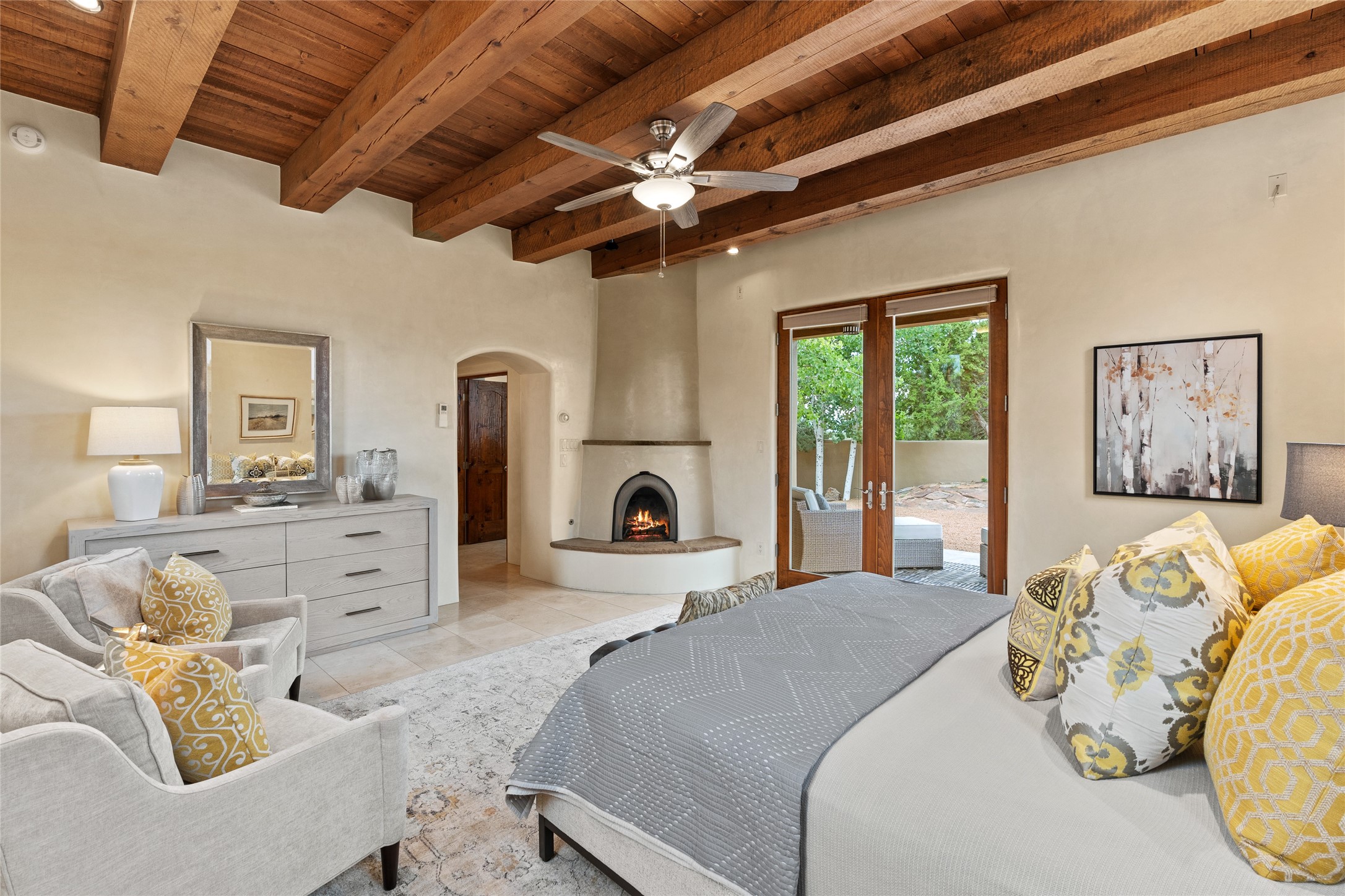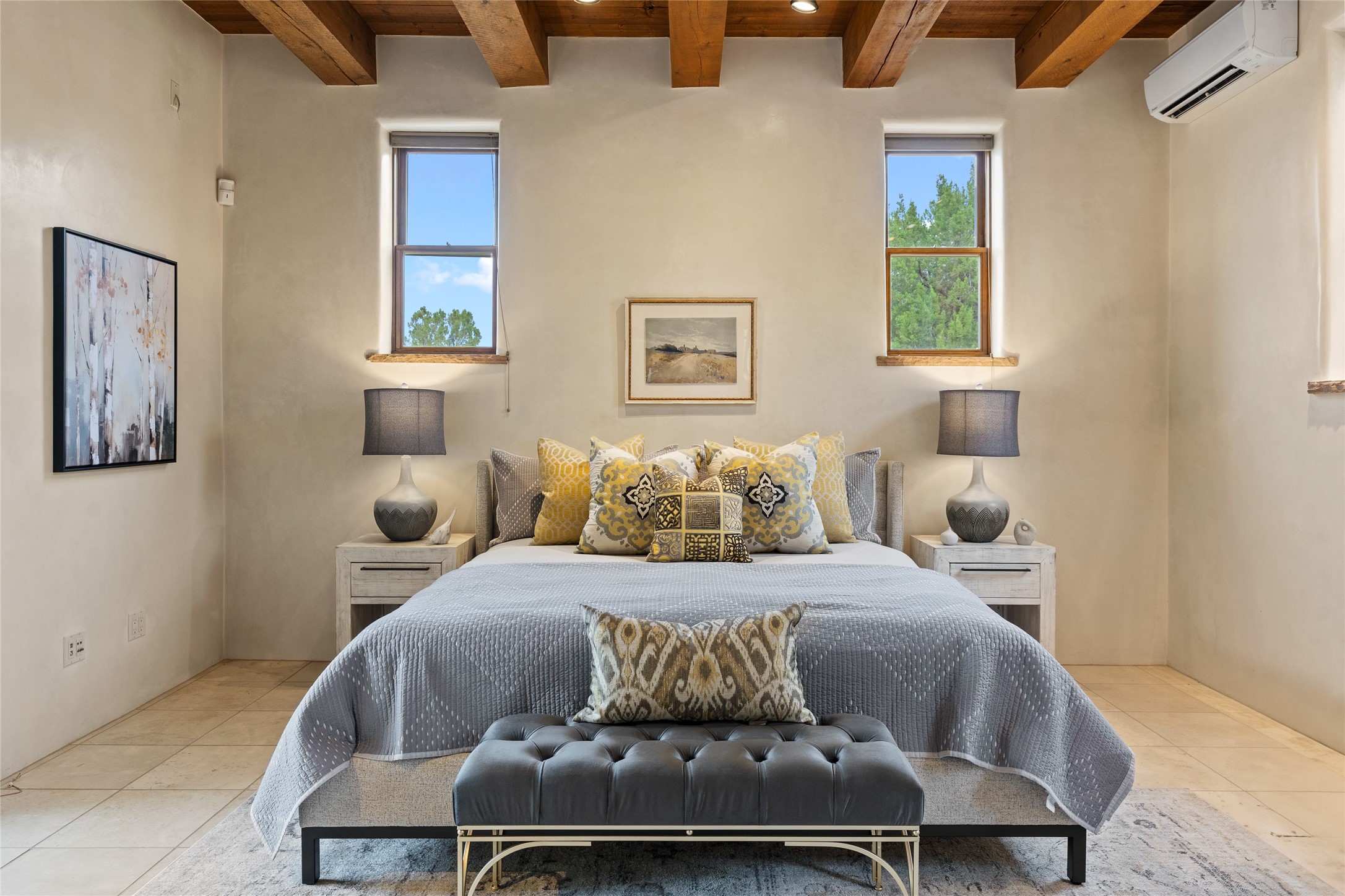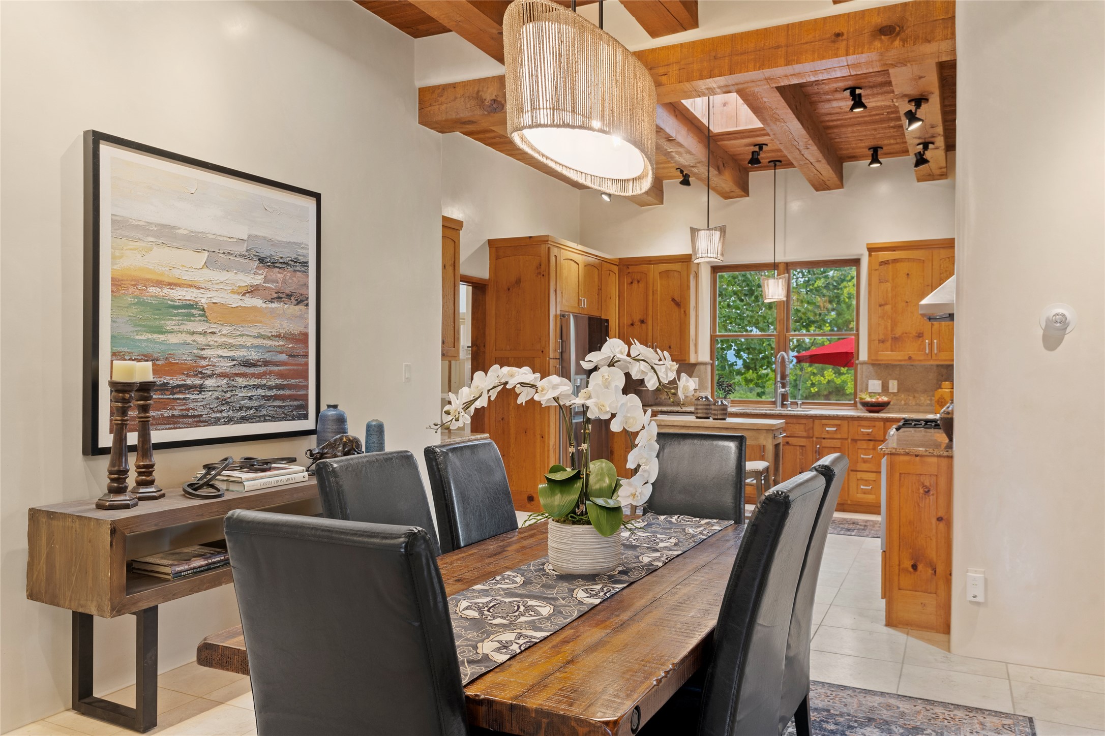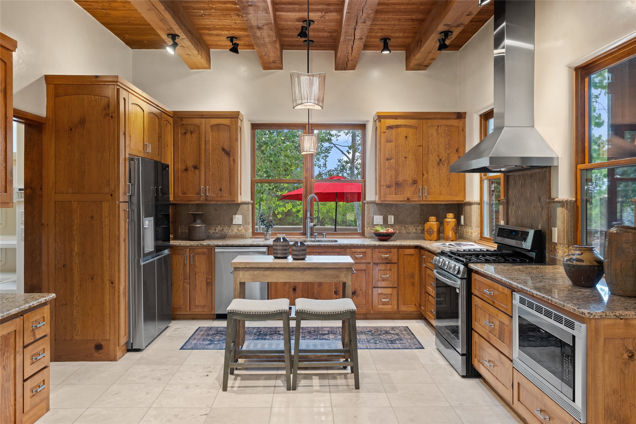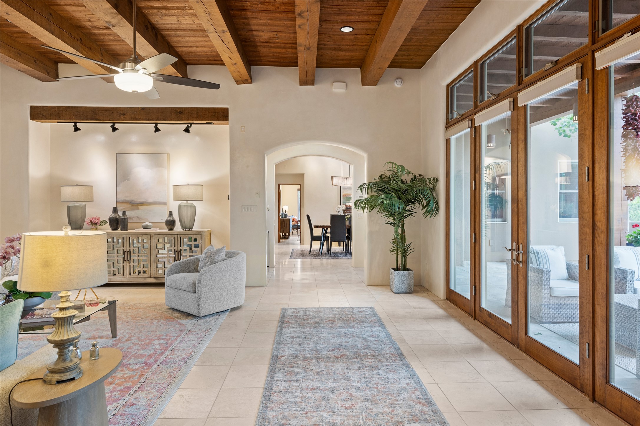 A Soulful Retreat 20 Minutes from the PlazaThrough the gate that offers privacy and safety lies a property that speaks to the soul. This exquisite 2,686-square-foot custom home by Artesanos is more than a residence--it's a refined expression of Santa Fe living, artfully sited on 3 pristine acres with views of Jemez Mountain sunsets. Mature aspens shade the stone path that leads to the front portal. In addition to the entry portal, a separate outdoor dining portal provides the perfect place to enjoy breathtaking sunsets and al fresco gatherings. Inside, soaring ceilings with hand-hewn wood beams, smooth plaster walls, and travertine floors evoke a timeless, grounded elegance. The light-filled living room is an inviting space with a Rumford fireplace serving as a cozy focal point. Patio doors extend the living space into the outdoors, seamlessly blending interior and exterior living.The spacious floor plan includes three generous bedrooms, plus a dedicated at-home office/media room with its own private patio--ideal for work, creativity, or retreat. The primary suite offers a serene sanctuary with its own private outdoor space for morning coffee or quiet reflection. Here you will also find an extra-large two-sided closet. Outfitted with travertine tile throughout, the bath features a large tub and separate shower, and two sinks. The large chef's kitchen is built for both entertaining and everyday inspiration, with custom cabinetry, stainless steel appliances, and high-end finishes. Off the kitchen is the spacious laundry room and pantry. Additional features include a two-car garage with epoxied floor, a new boiler, radiant in-floor heating, and six mini-splits for personalized air conditioning. This meticulously maintained property is located in an HOA and it has a shared well. The septic system was recently inspected and pumped and the entire house was re-stuccoed. This is a home where architecture, landscape, and lifestyle exist in perfect harmony.