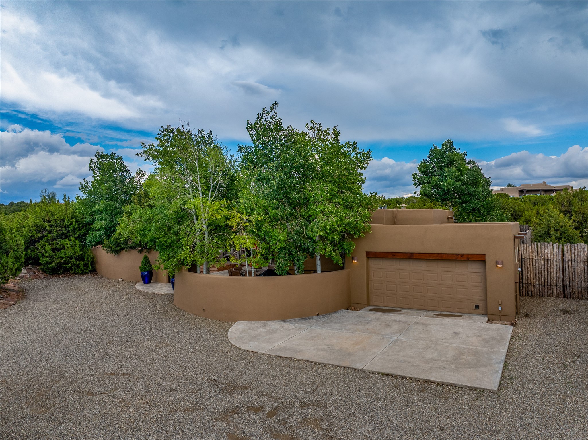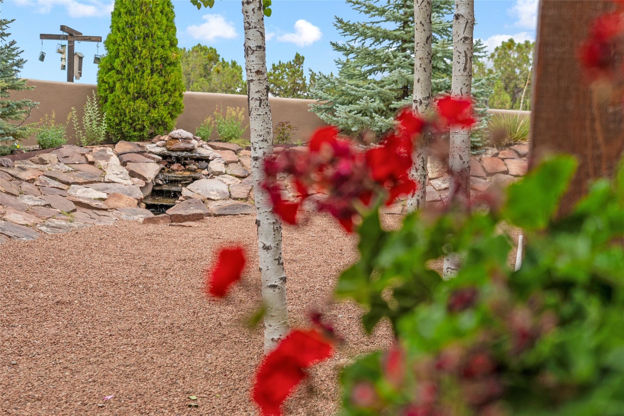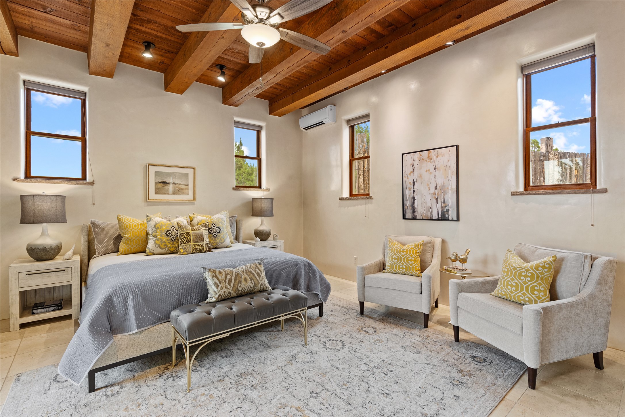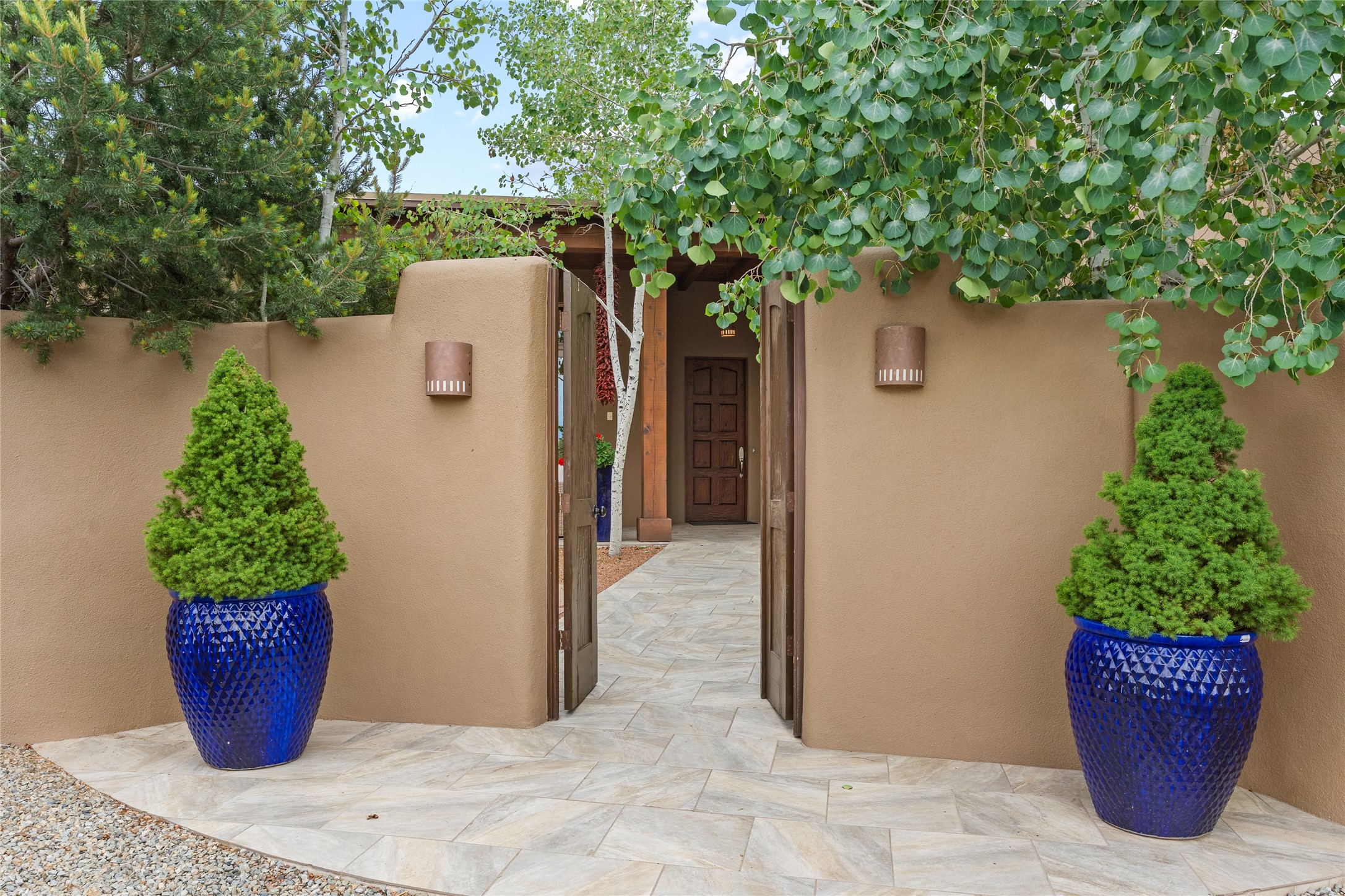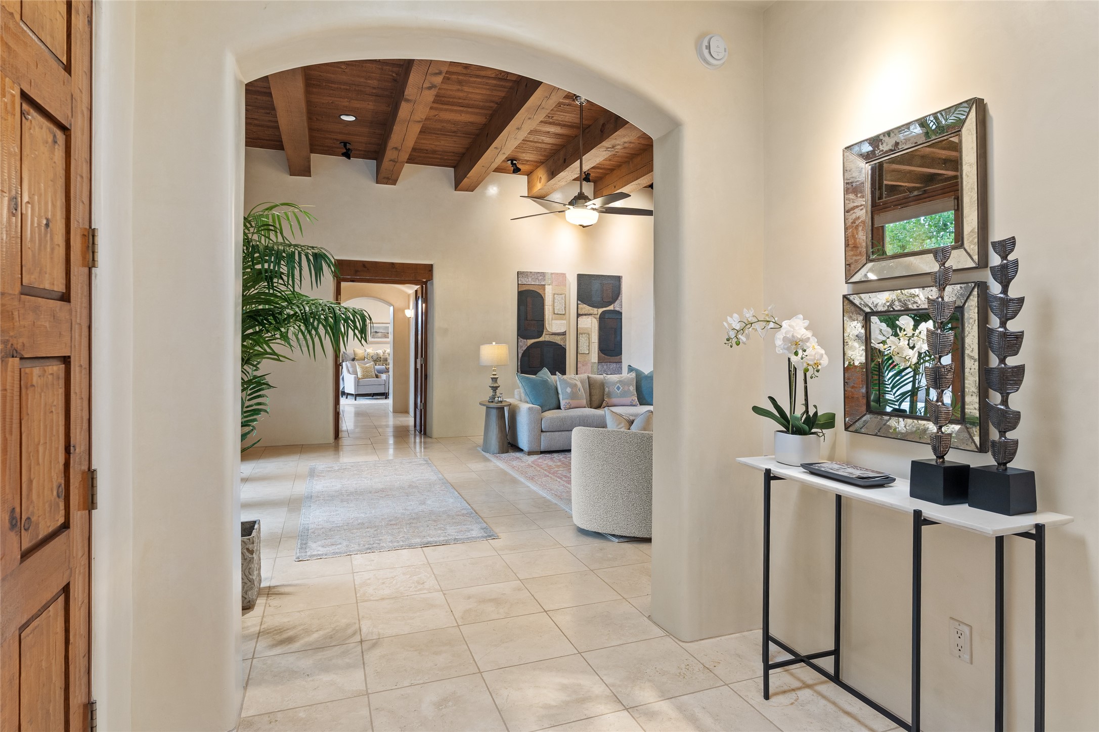 A Soulful Retreat 20 Minutes from the PlazaThrough the gate that offers privacy and safety lies a property that speaks to the soul. This exquisite 2,686-square-foot custom home by Artesanos is more than a residence--it's a refined expression of Santa Fe living, artfully sited on 3 pristine acres with views of Jemez Mountain sunsets. Mature aspens shade the stone path that leads to the front portal. In addition to the entry portal, a separate outdoor dining portal provides the perfect place to enjoy breathtaking sunsets and al fresco gatherings. Inside, soaring ceilings with hand-hewn wood beams, smooth plaster walls, and travertine floors evoke a timeless, grounded elegance. The light-filled living room is an inviting space with a Rumford fireplace serving as a cozy focal point. Patio doors extend the living space into the outdoors, seamlessly blending interior and exterior living.The spacious floor plan includes three generous bedrooms, plus a dedicated at-home office/media room with its own private patio--ideal for work, creativity, or retreat. The primary suite offers a serene sanctuary with its own private outdoor space for morning coffee or quiet reflection. Here you will also find an extra-large two-sided closet. Outfitted with travertine tile throughout, the bath features a large tub and separate shower, and two sinks. The large chef's kitchen is built for both entertaining and everyday inspiration, with custom cabinetry, stainless steel appliances, and high-end finishes. Off the kitchen is the spacious laundry room and pantry. Additional features include a two-car garage with epoxied floor, a new boiler, radiant in-floor heating, and six mini-splits for personalized air conditioning. This meticulously maintained property is located in an HOA and it has a shared well. The septic system was recently inspected and pumped and the entire house was re-stuccoed. This is a home where architecture, landscape, and lifestyle exist in perfect harmony.