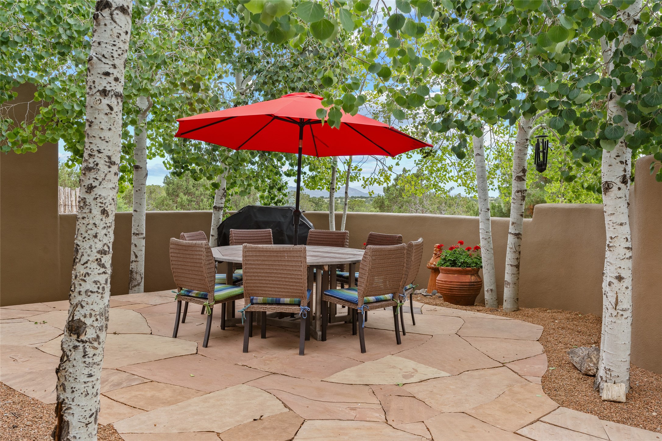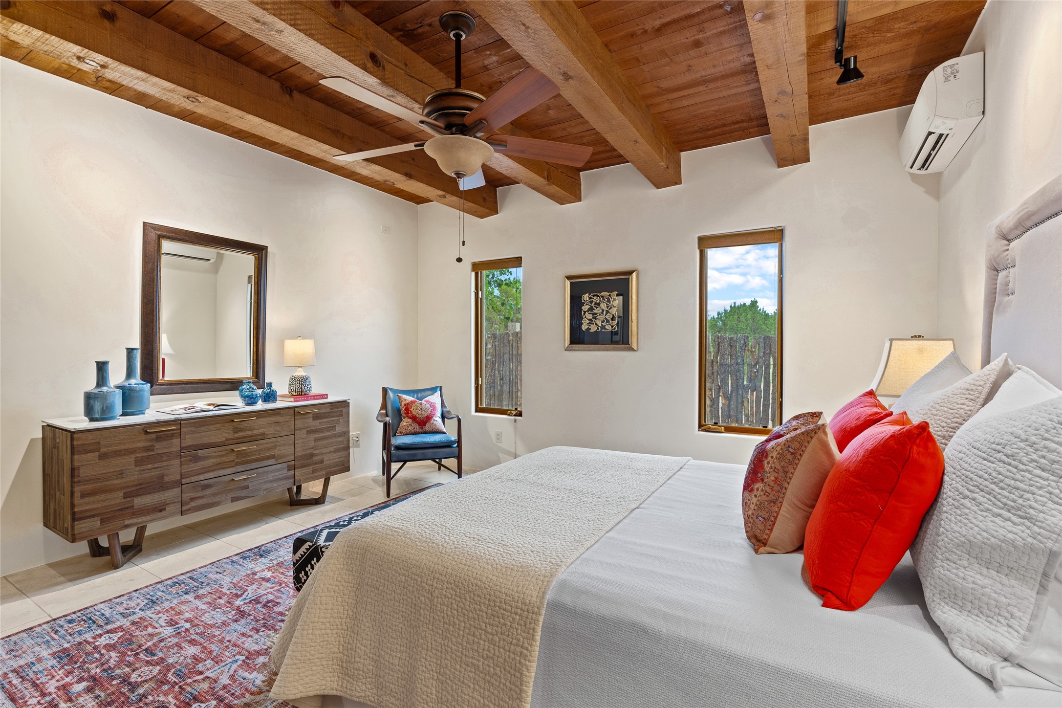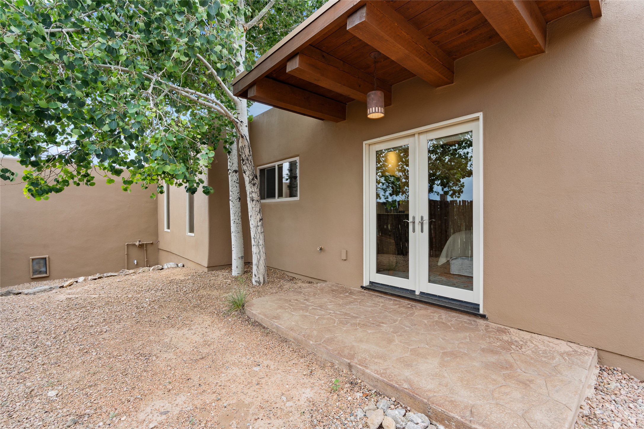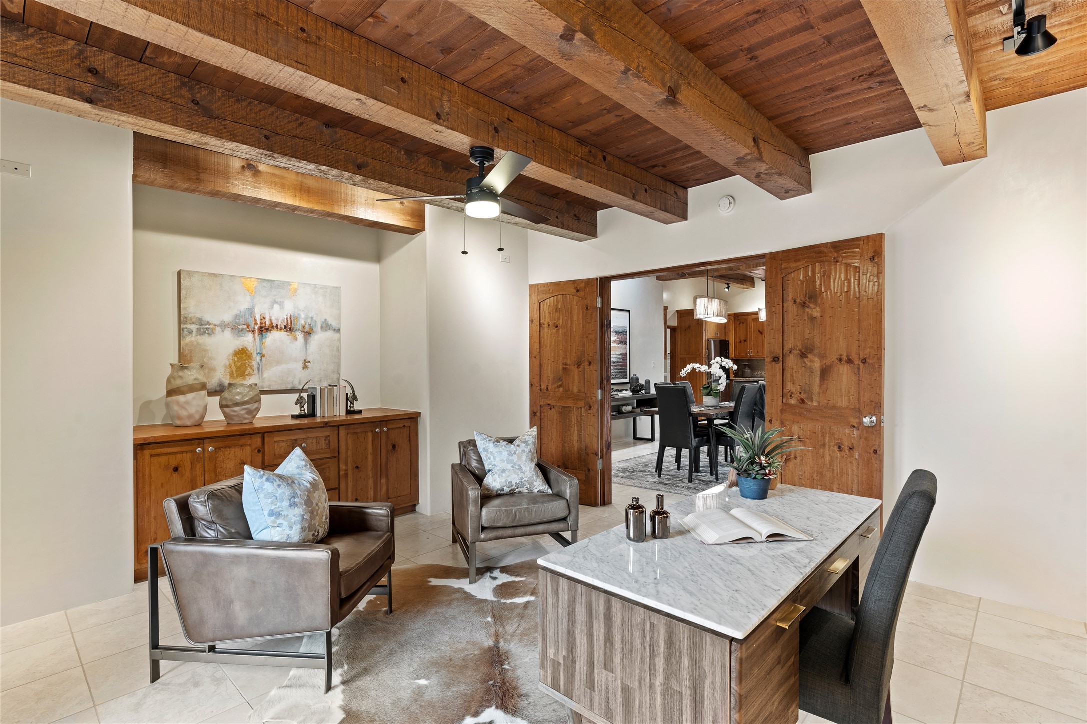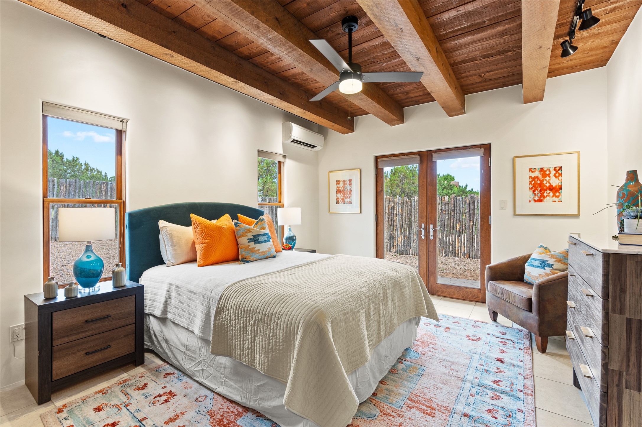 A Soulful Retreat 20 Minutes from the PlazaThrough the gate that offers privacy and safety lies a property that speaks to the soul. This exquisite 2,686-square-foot custom home by Artesanos is more than a residence--it's a refined expression of Santa Fe living, artfully sited on 3 pristine acres with views of Jemez Mountain sunsets. Mature aspens shade the stone path that leads to the front portal. In addition to the entry portal, a separate outdoor dining portal provides the perfect place to enjoy breathtaking sunsets and al fresco gatherings. Inside, soaring ceilings with hand-hewn wood beams, smooth plaster walls, and travertine floors evoke a timeless, grounded elegance. The light-filled living room is an inviting space with a Rumford fireplace serving as a cozy focal point. Patio doors extend the living space into the outdoors, seamlessly blending interior and exterior living.The spacious floor plan includes three generous bedrooms, plus a dedicated at-home office/media room with its own private patio--ideal for work, creativity, or retreat. The primary suite offers a serene sanctuary with its own private outdoor space for morning coffee or quiet reflection. Here you will also find an extra-large two-sided closet. Outfitted with travertine tile throughout, the bath features a large tub and separate shower, and two sinks. The large chef's kitchen is built for both entertaining and everyday inspiration, with custom cabinetry, stainless steel appliances, and high-end finishes. Off the kitchen is the spacious laundry room and pantry. Additional features include a two-car garage with epoxied floor, a new boiler, radiant in-floor heating, and six mini-splits for personalized air conditioning. This meticulously maintained property is located in an HOA and it has a shared well. The septic system was recently inspected and pumped and the entire house was re-stuccoed. This is a home where architecture, landscape, and lifestyle exist in perfect harmony.
