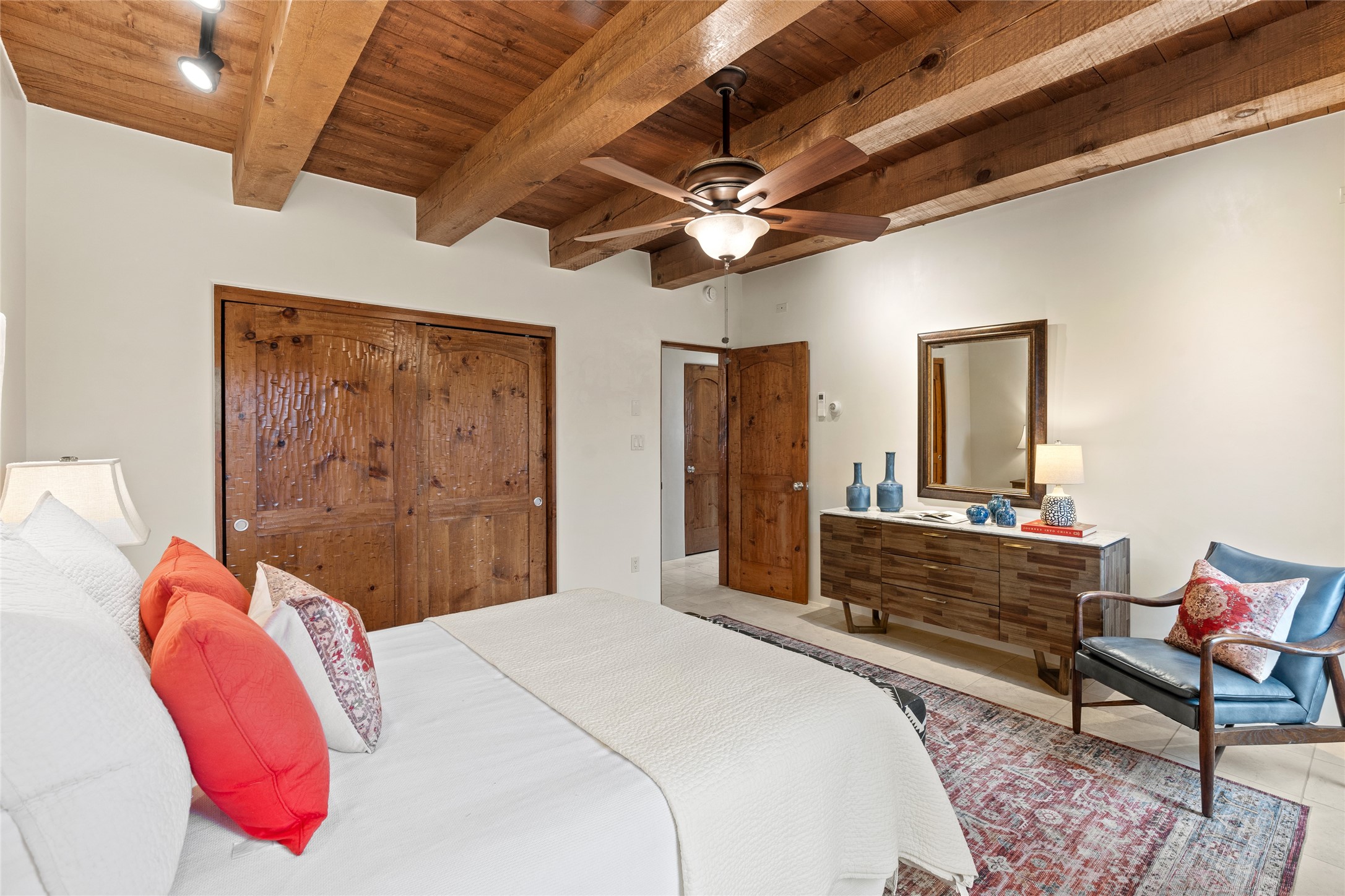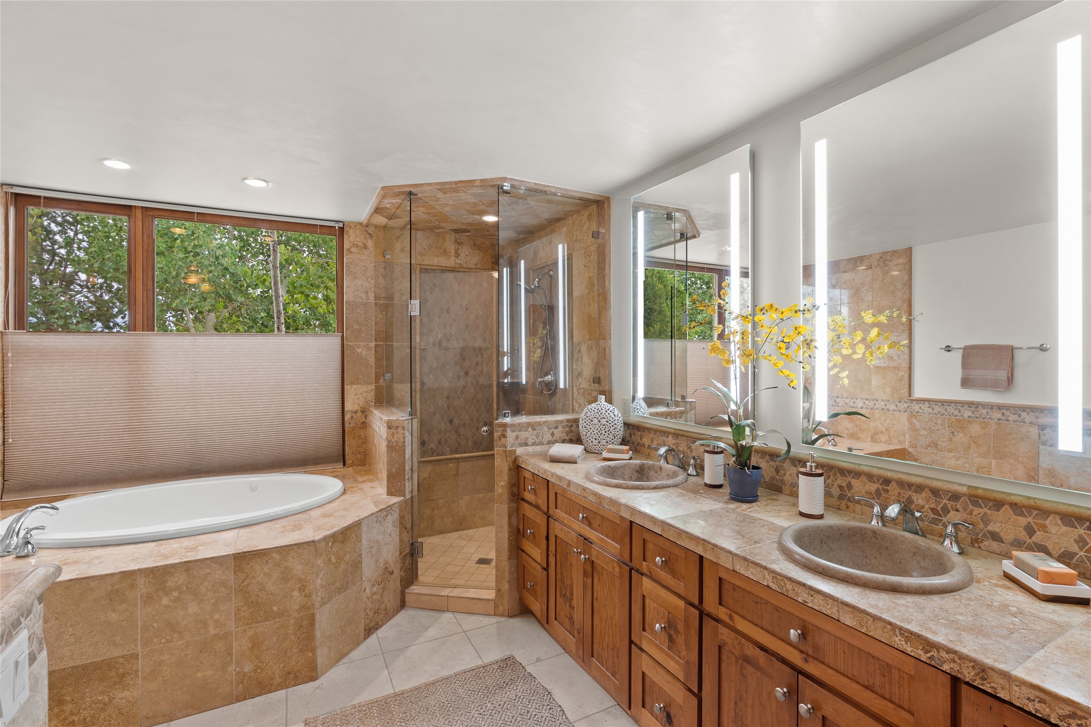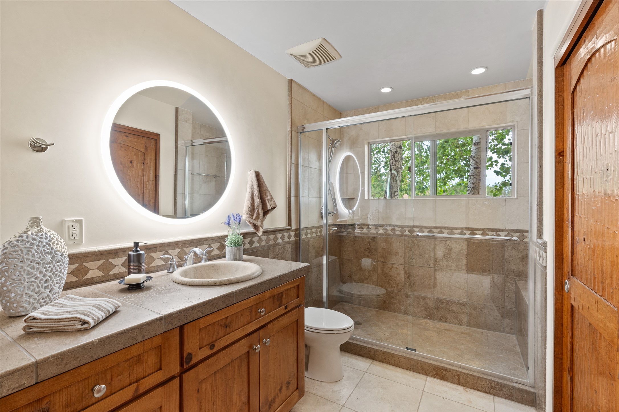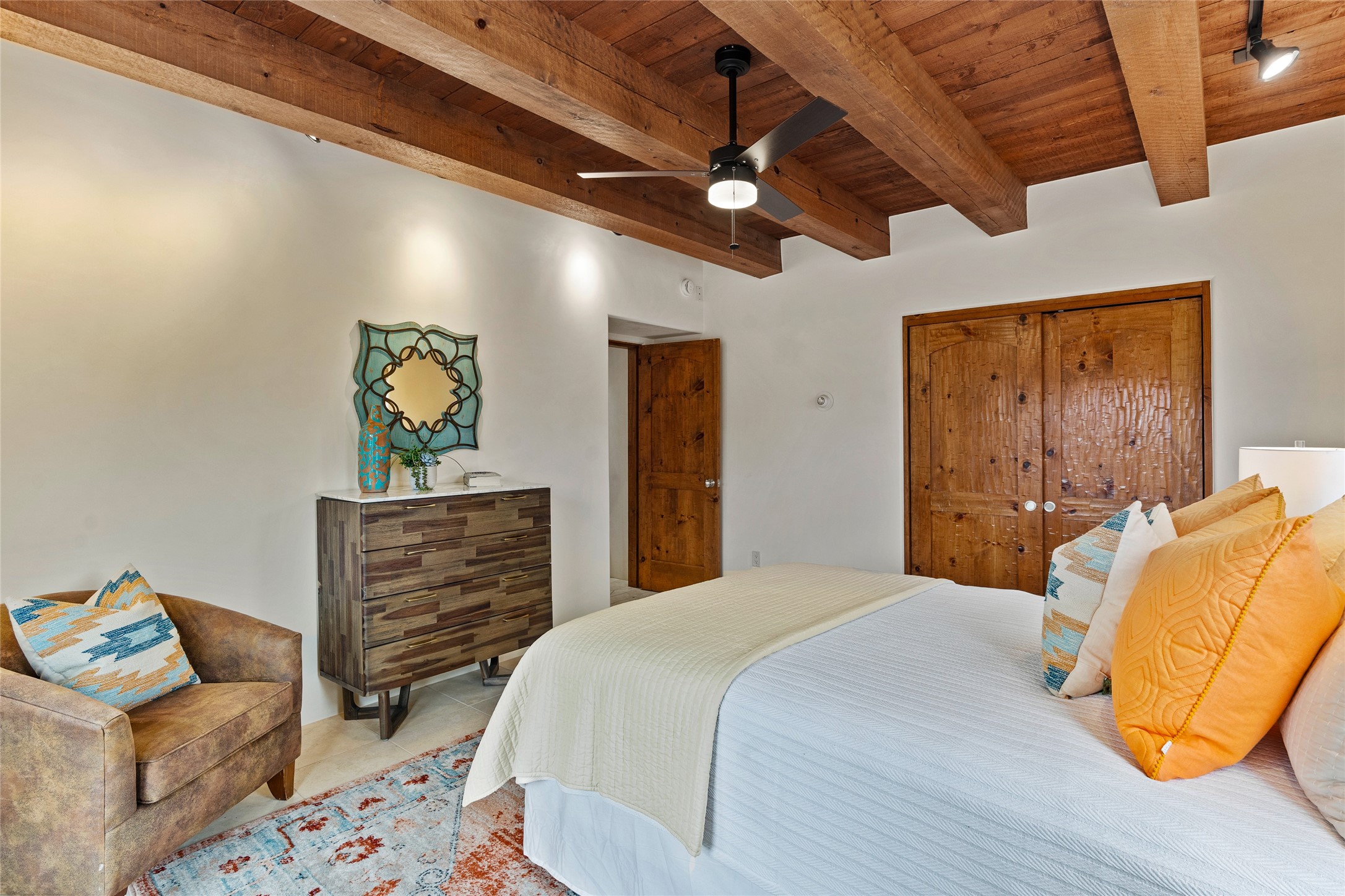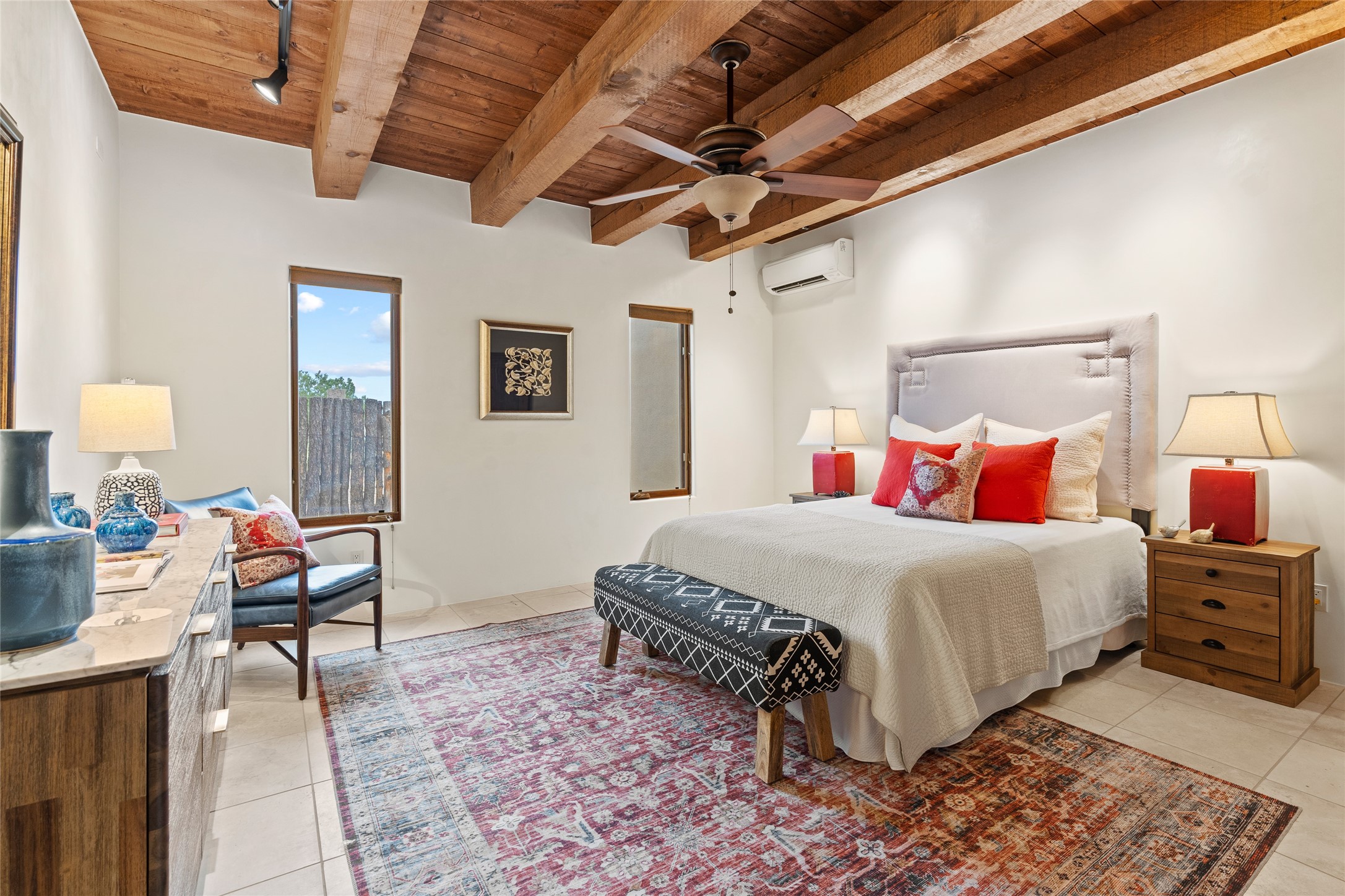 A Soulful Retreat 20 Minutes from the PlazaThrough the gate that offers privacy and safety lies a property that speaks to the soul. This exquisite 2,686-square-foot custom home by Artesanos is more than a residence--it's a refined expression of Santa Fe living, artfully sited on 3 pristine acres with views of Jemez Mountain sunsets. Mature aspens shade the stone path that leads to the front portal. In addition to the entry portal, a separate outdoor dining portal provides the perfect place to enjoy breathtaking sunsets and al fresco gatherings. Inside, soaring ceilings with hand-hewn wood beams, smooth plaster walls, and travertine floors evoke a timeless, grounded elegance. The light-filled living room is an inviting space with a Rumford fireplace serving as a cozy focal point. Patio doors extend the living space into the outdoors, seamlessly blending interior and exterior living.The spacious floor plan includes three generous bedrooms, plus a dedicated at-home office/media room with its own private patio--ideal for work, creativity, or retreat. The primary suite offers a serene sanctuary with its own private outdoor space for morning coffee or quiet reflection. Here you will also find an extra-large two-sided closet. Outfitted with travertine tile throughout, the bath features a large tub and separate shower, and two sinks. The large chef's kitchen is built for both entertaining and everyday inspiration, with custom cabinetry, stainless steel appliances, and high-end finishes. Off the kitchen is the spacious laundry room and pantry. Additional features include a two-car garage with epoxied floor, a new boiler, radiant in-floor heating, and six mini-splits for personalized air conditioning. This meticulously maintained property is located in an HOA and it has a shared well. The septic system was recently inspected and pumped and the entire house was re-stuccoed. This is a home where architecture, landscape, and lifestyle exist in perfect harmony.