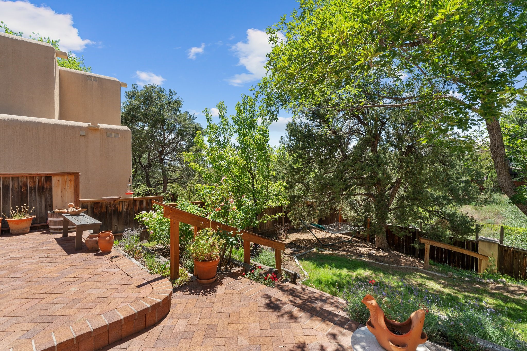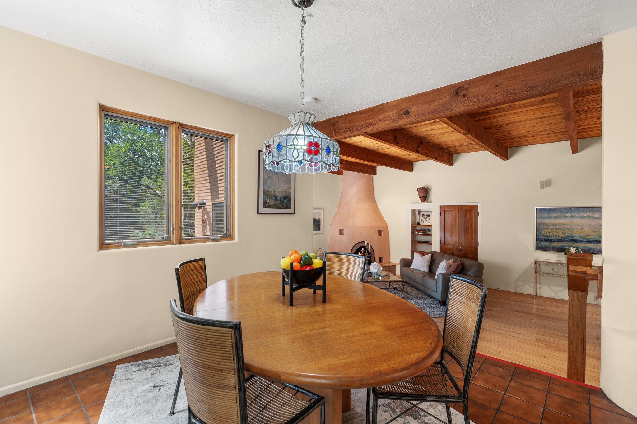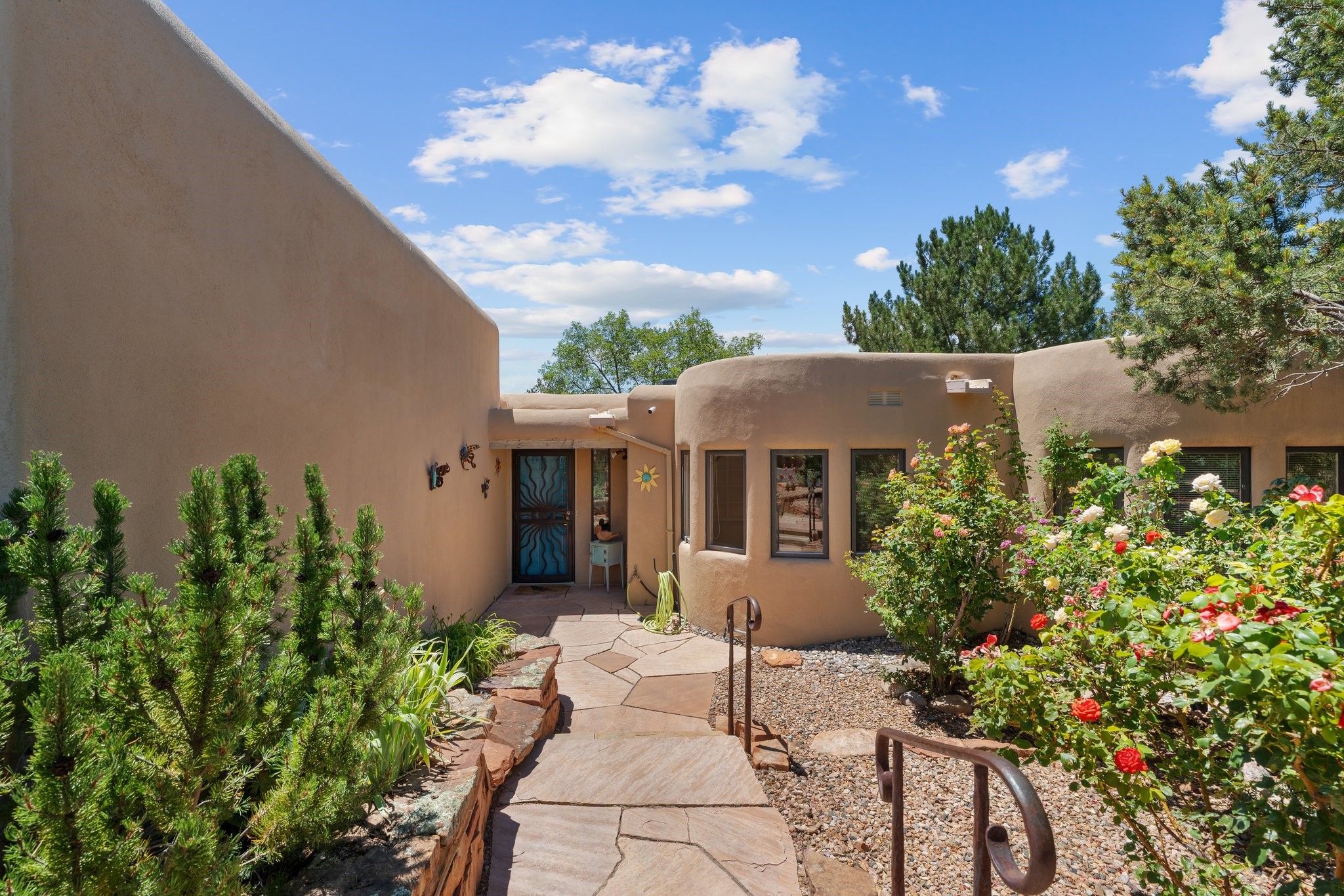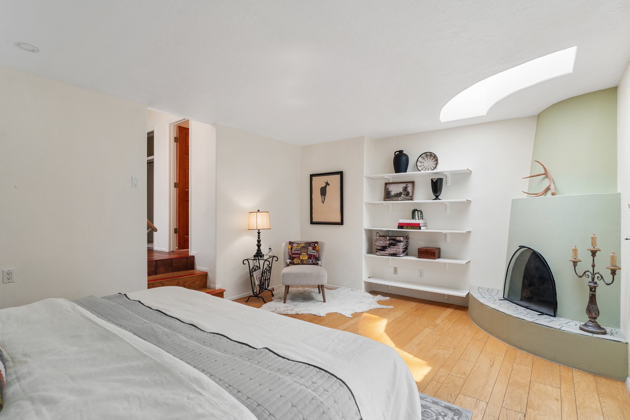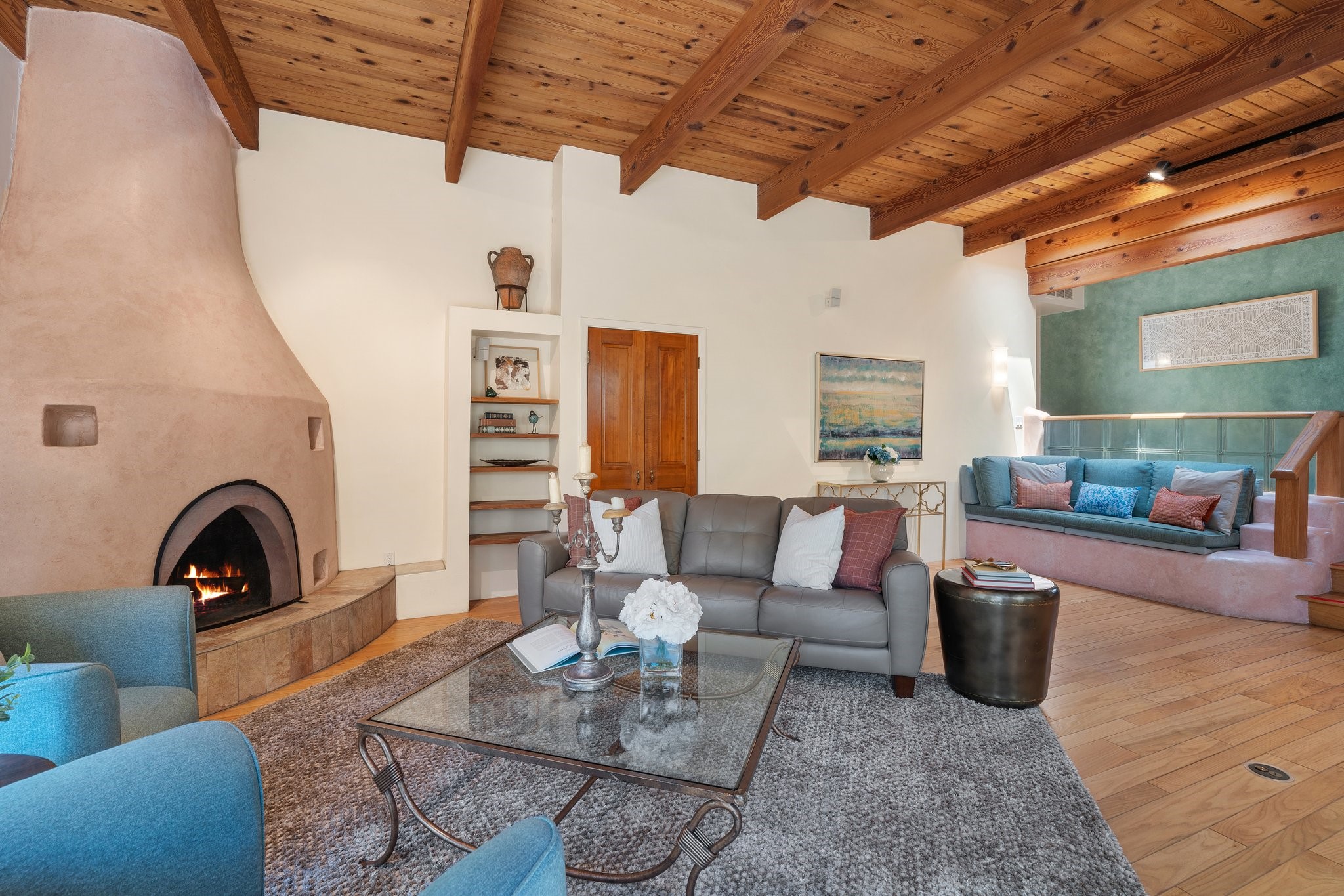 One-of-a-kind custom residence blends timeless Southwestern charm, thoughtful design, and modern comfort. Curved walls and abundant windows bathe every room in natural light, spotlighting fine craftsmanship.The expansive living room showcases a high tongue-and-groove beamed ceiling, dramatic corner kiva fireplace with a built-in banco, rich wood floors, built-in shelving, graceful china cabinet, and sliding doors to a private brick patio and beautifully terraced garden for seamless indoor-outdoor living. A built-in banco at one end of the living room creates an inviting nook for intimate conversation or peaceful reading.The chef-friendly kitchen offers sleek Corian countertops, newer appliances, classic tile floors, and an adjacent dining area that makes entertaining stylish and easy.Three versatile bedrooms provide comfort and flexibility: one is fitted as a home office with built-in shelving and counters; the spacious second bedroom boasts a gracefully rounded front wall framed by four large windows, two closets, and luxury vinyl flooring--ideal for guests or family.The private primary suite is a true sanctuary with its own corner kiva fireplace beneath a skylight, generous closets, and a spa-style bath with dual sinks and a sunken tub. French doors lead to a light-filled sunroom with cedar-lined closet; the sunroom opens onto the serene patio and terraced garden.Additional highlights include a large laundry room with extensive cabinetry, decorative glass block and skylight, plus an oversized two-car garage with abundant shelving for storage. Three rose bushes grace the front yard, adding a burst of color and charm.Not just a place to live--this residence is a work of art crafted for comfort, beauty, and inspired living. Come experience its magic for yourself.Park Plazas is a centrally located neighborhood with miles of walking trails, an off-leash dog park, tennis and pickle ball courts a community garden and much more.