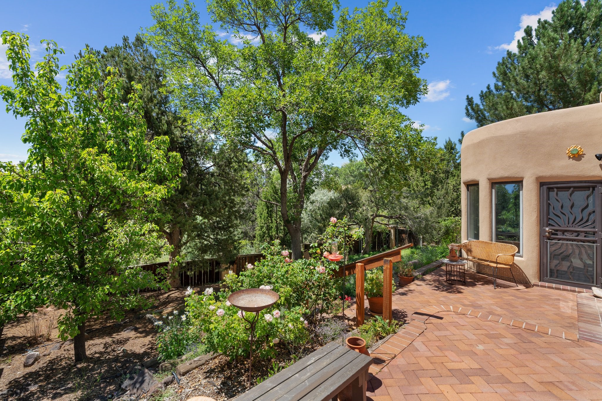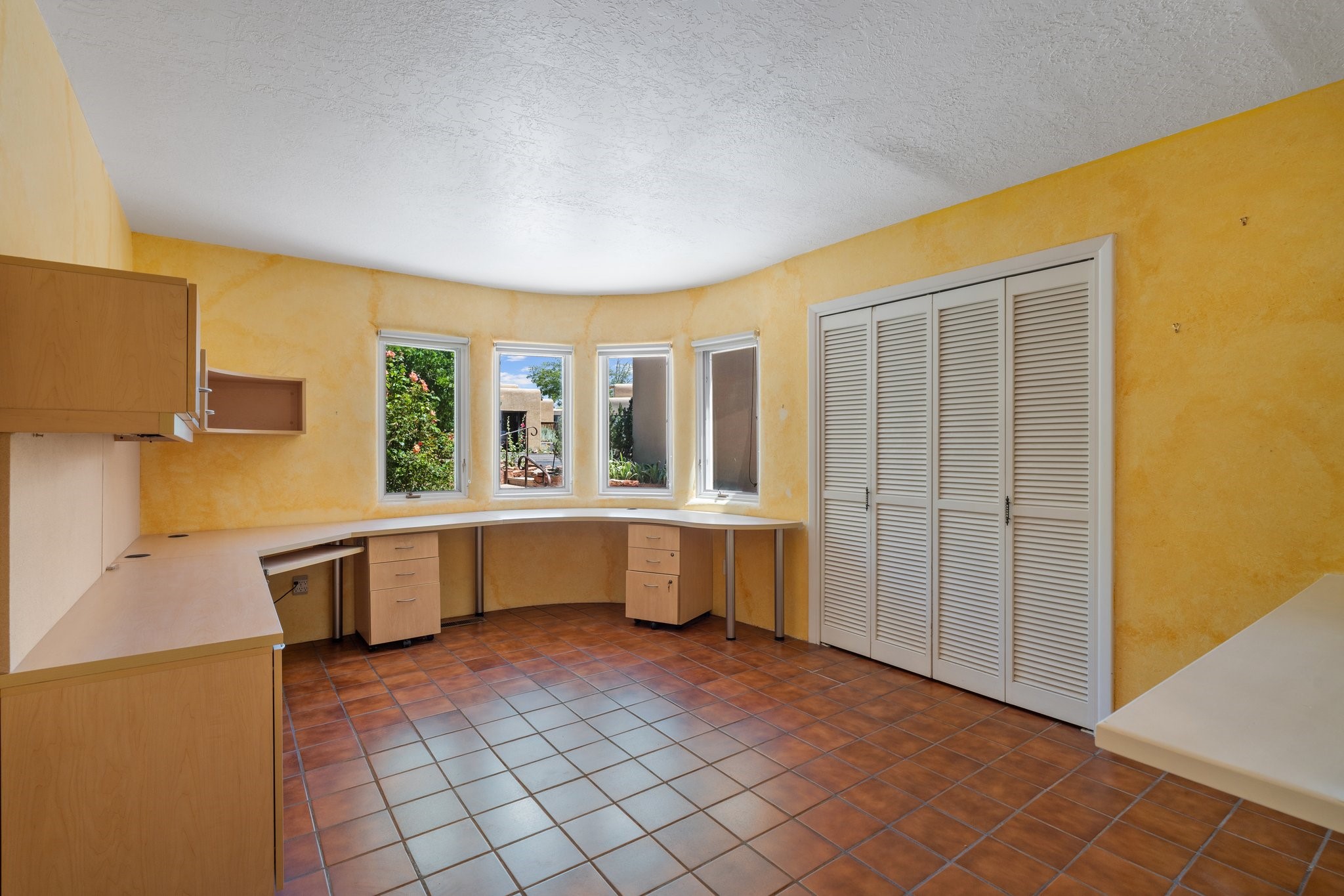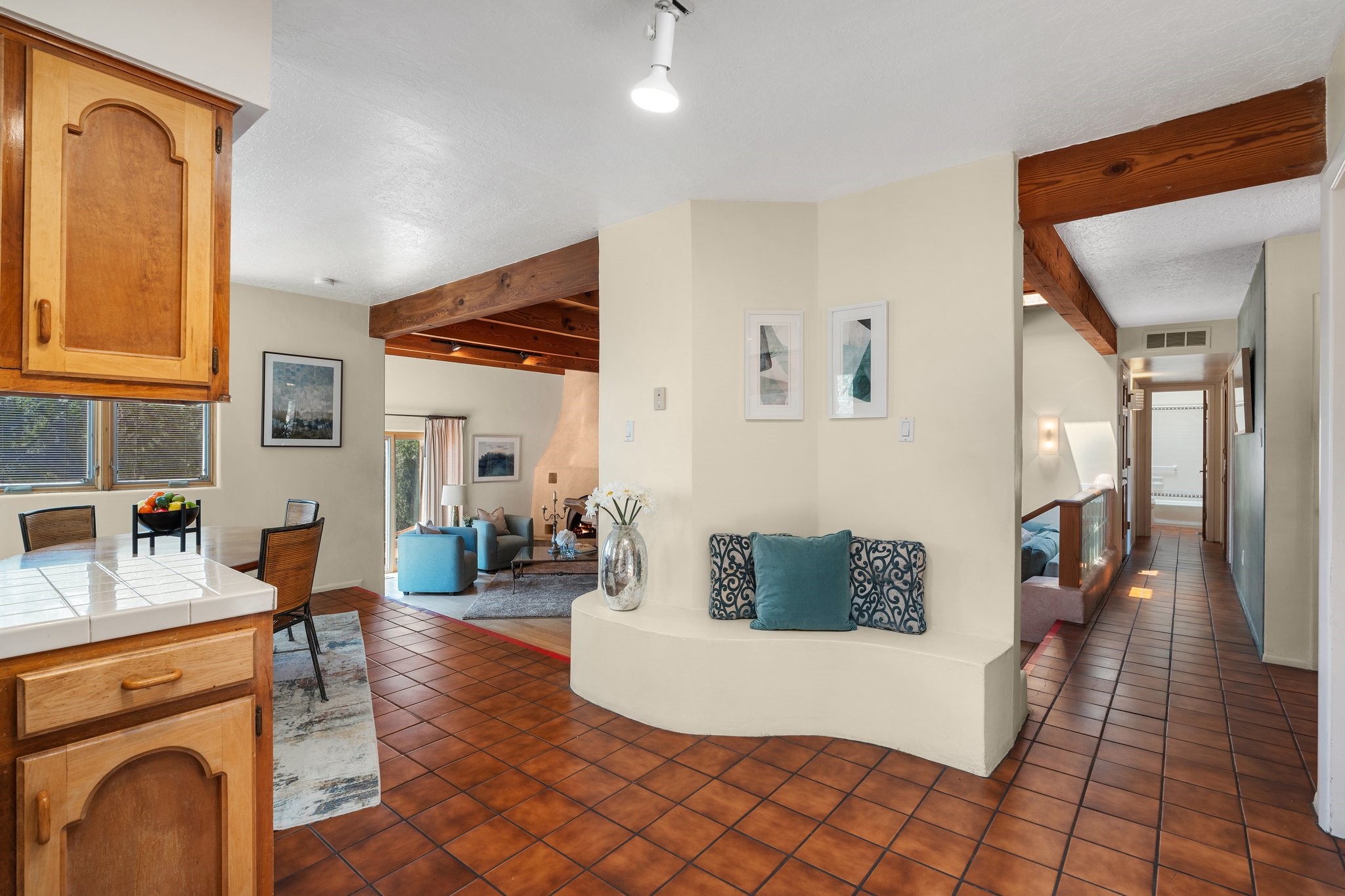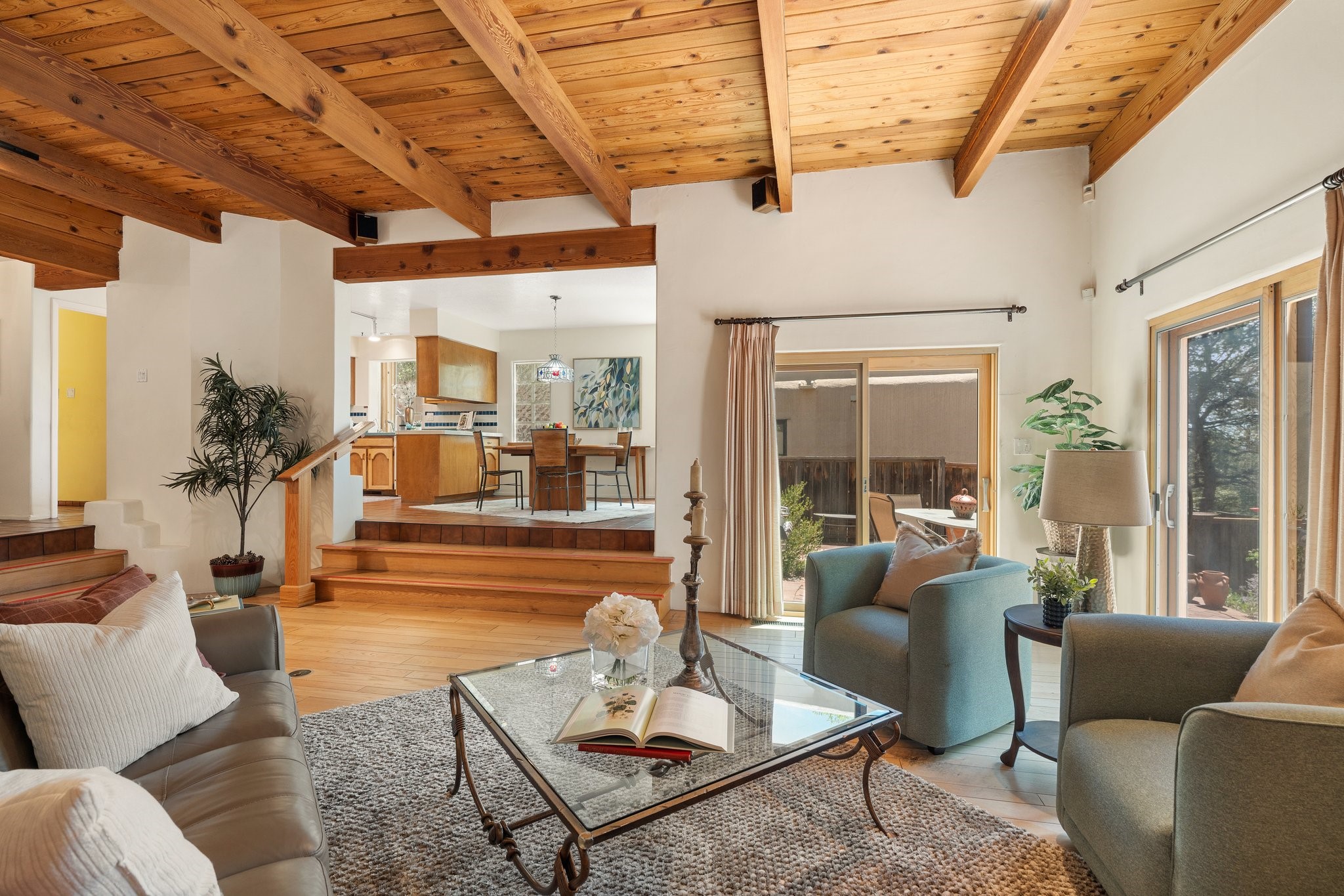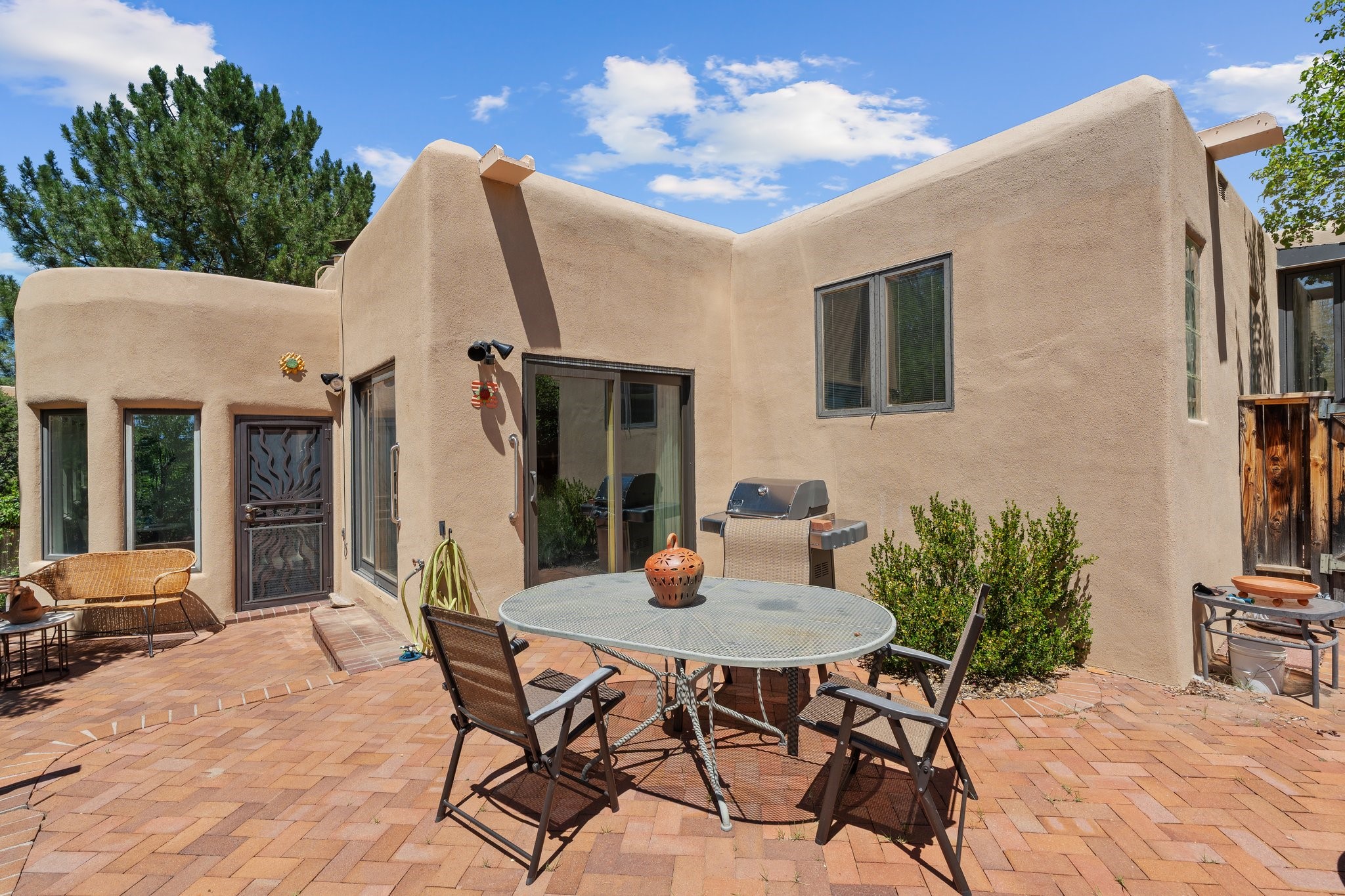One-of-a-kind custom residence blends timeless Southwestern charm, thoughtful design, and modern comfort. Curved walls and abundant windows bathe every room in natural light, spotlighting fine craftsmanship.The expansive living room showcases a high tongue-and-groove beamed ceiling, dramatic corner kiva fireplace with a built-in banco, rich wood floors, built-in shelving, graceful china cabinet, and sliding doors to a private brick patio and beautifully terraced garden for seamless indoor-outdoor living. A built-in banco at one end of the living room creates an inviting nook for intimate conversation or peaceful reading.The chef-friendly kitchen offers sleek Corian countertops, newer appliances, classic tile floors, and an adjacent dining area that makes entertaining stylish and easy.Three versatile bedrooms provide comfort and flexibility: one is fitted as a home office with built-in shelving and counters; the spacious second bedroom boasts a gracefully rounded front wall framed by four large windows, two closets, and luxury vinyl flooring--ideal for guests or family.The private primary suite is a true sanctuary with its own corner kiva fireplace beneath a skylight, generous closets, and a spa-style bath with dual sinks and a sunken tub. French doors lead to a light-filled sunroom with cedar-lined closet; the sunroom opens onto the serene patio and terraced garden.Additional highlights include a large laundry room with extensive cabinetry, decorative glass block and skylight, plus an oversized two-car garage with abundant shelving for storage. Three rose bushes grace the front yard, adding a burst of color and charm.Not just a place to live--this residence is a work of art crafted for comfort, beauty, and inspired living. Come experience its magic for yourself.Park Plazas is a centrally located neighborhood with miles of walking trails, an off-leash dog park, tennis and pickle ball courts a community garden and much more.