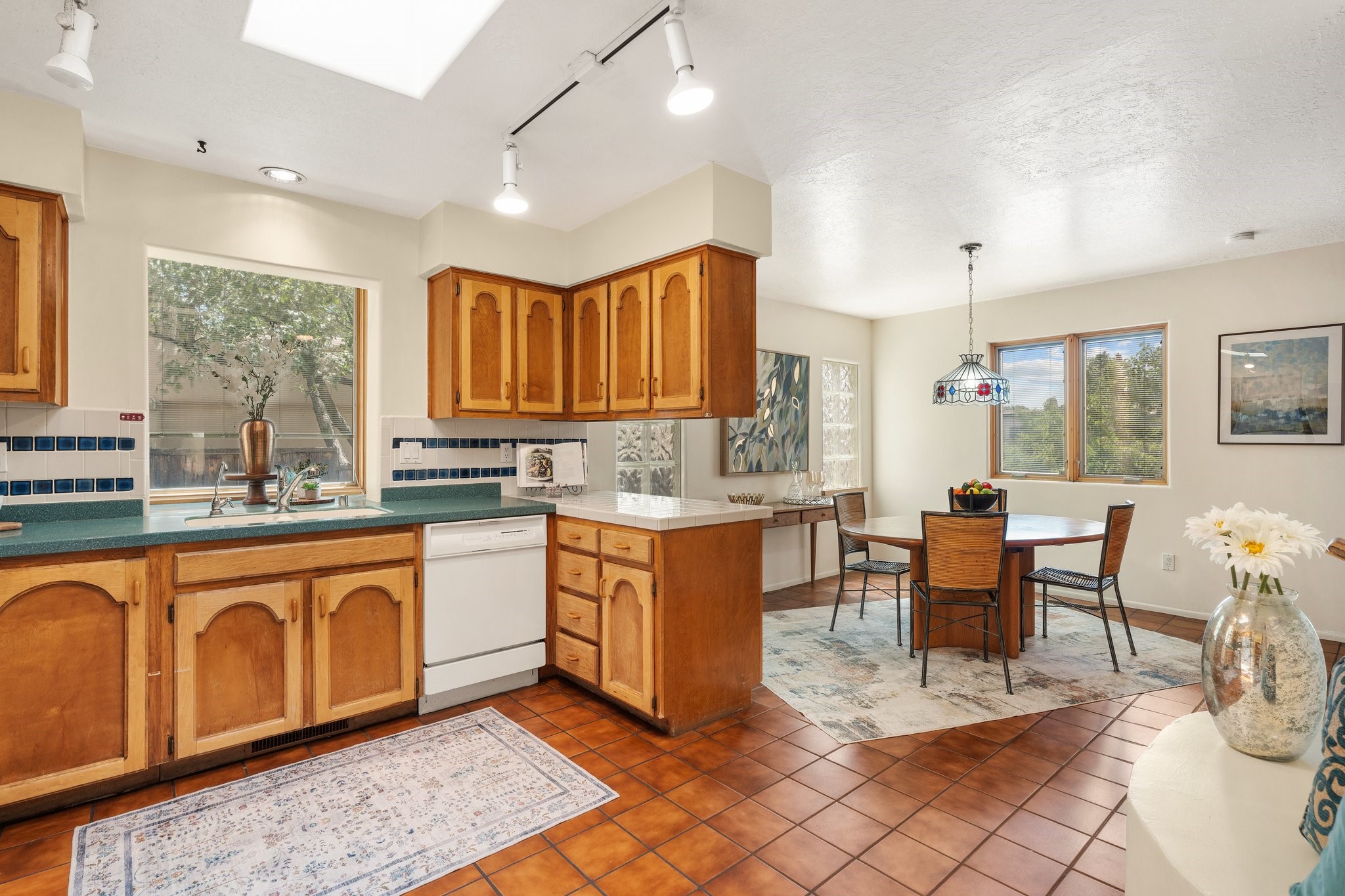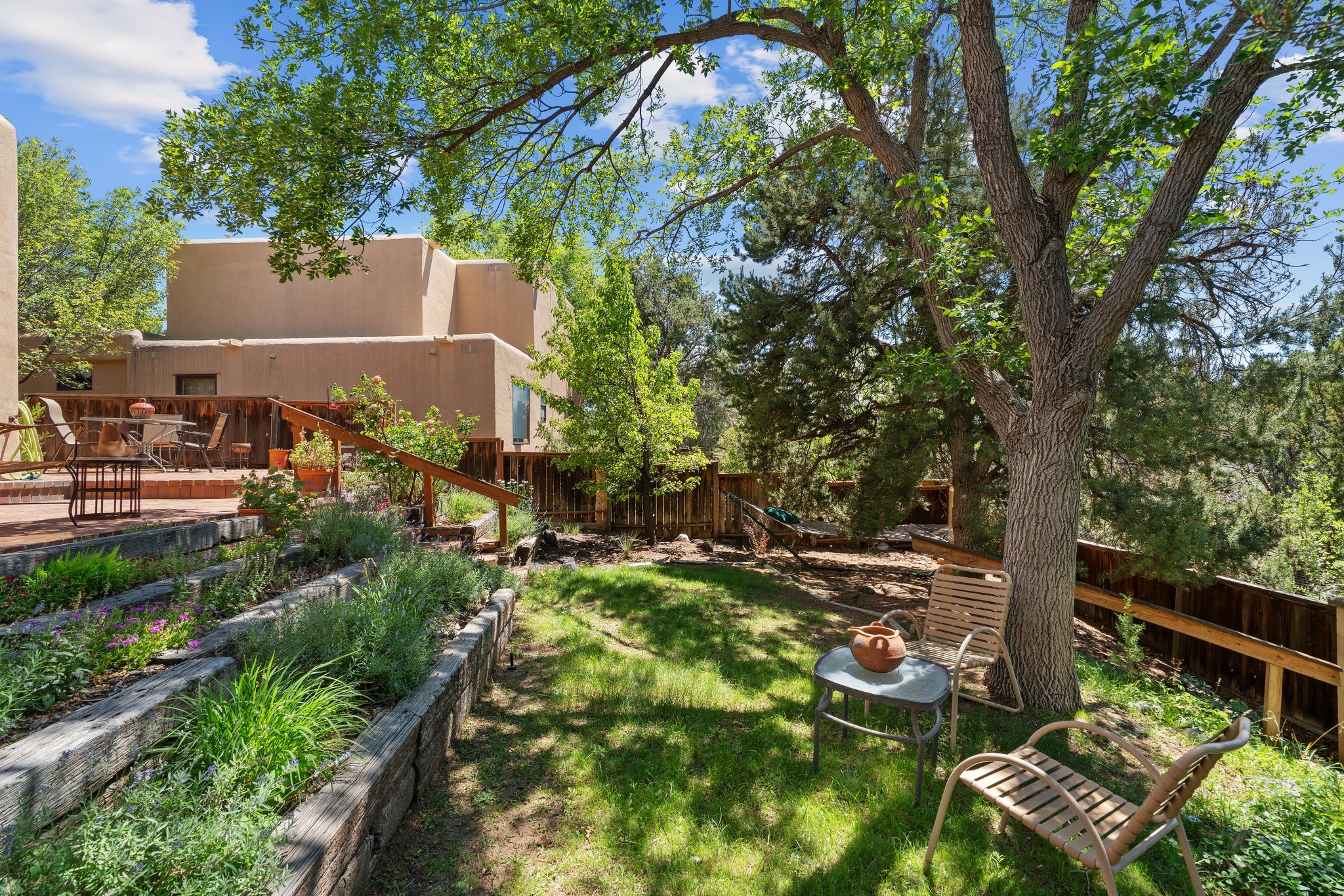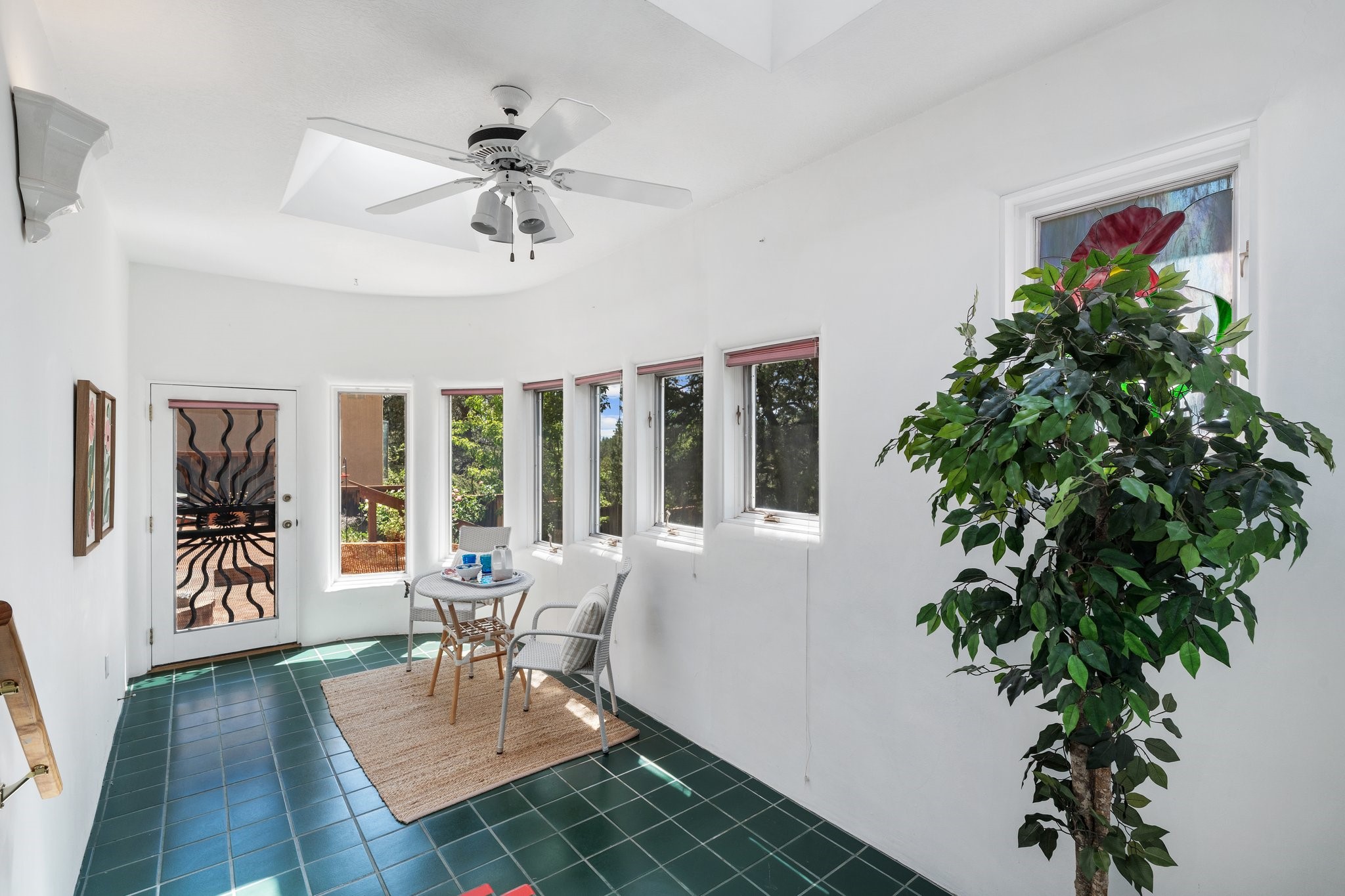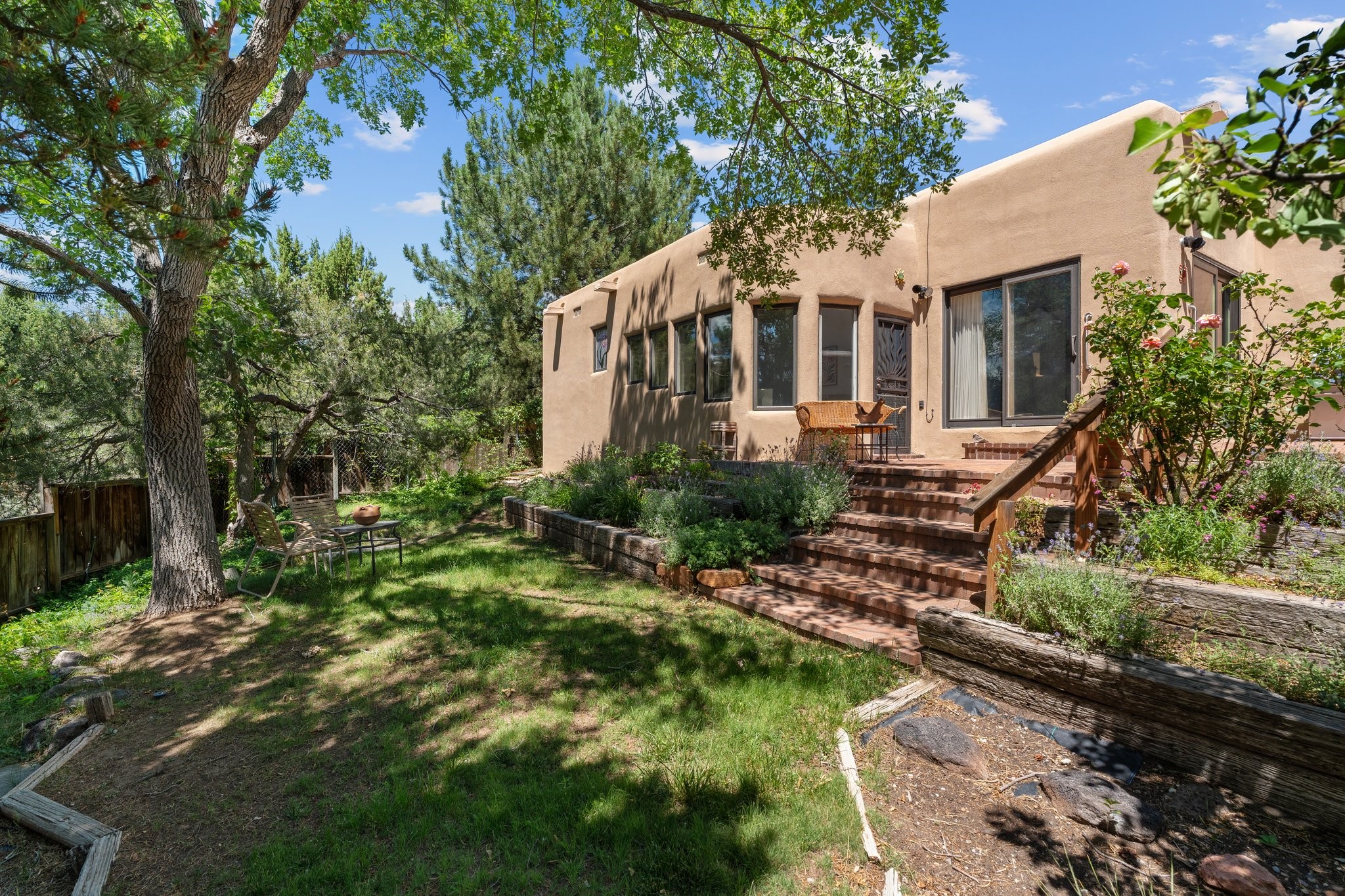 One-of-a-kind custom residence blends timeless Southwestern charm, thoughtful design, and modern comfort. Curved walls and abundant windows bathe every room in natural light, spotlighting fine craftsmanship.The expansive living room showcases a high tongue-and-groove beamed ceiling, dramatic corner kiva fireplace with a built-in banco, rich wood floors, built-in shelving, graceful china cabinet, and sliding doors to a private brick patio and beautifully terraced garden for seamless indoor-outdoor living. A built-in banco at one end of the living room creates an inviting nook for intimate conversation or peaceful reading.The chef-friendly kitchen offers sleek Corian countertops, newer appliances, classic tile floors, and an adjacent dining area that makes entertaining stylish and easy.Three versatile bedrooms provide comfort and flexibility: one is fitted as a home office with built-in shelving and counters; the spacious second bedroom boasts a gracefully rounded front wall framed by four large windows, two closets, and luxury vinyl flooring--ideal for guests or family.The private primary suite is a true sanctuary with its own corner kiva fireplace beneath a skylight, generous closets, and a spa-style bath with dual sinks and a sunken tub. French doors lead to a light-filled sunroom with cedar-lined closet; the sunroom opens onto the serene patio and terraced garden.Additional highlights include a large laundry room with extensive cabinetry, decorative glass block and skylight, plus an oversized two-car garage with abundant shelving for storage. Three rose bushes grace the front yard, adding a burst of color and charm.Not just a place to live--this residence is a work of art crafted for comfort, beauty, and inspired living. Come experience its magic for yourself.Park Plazas is a centrally located neighborhood with miles of walking trails, an off-leash dog park, tennis and pickle ball courts a community garden and much more.