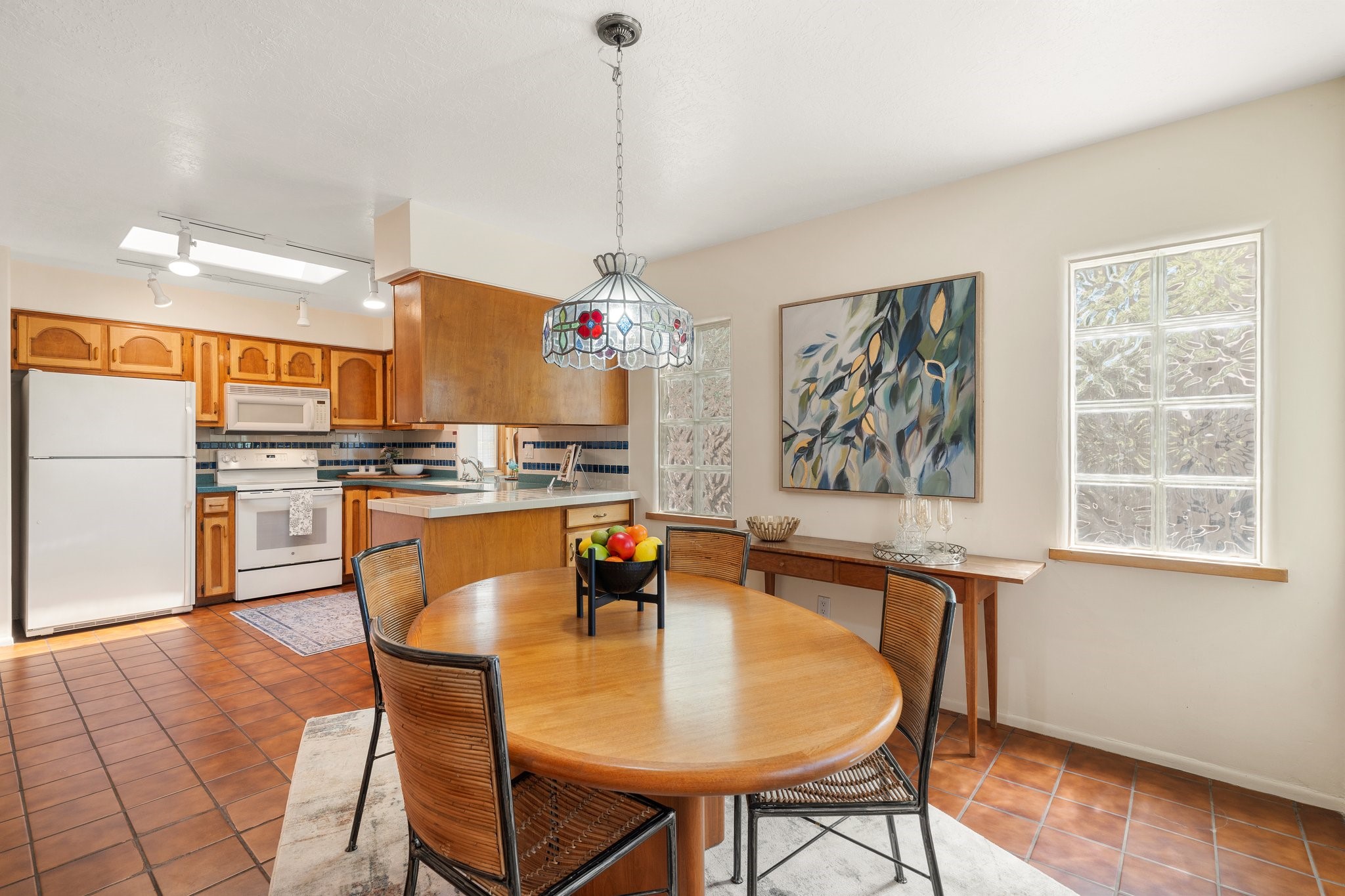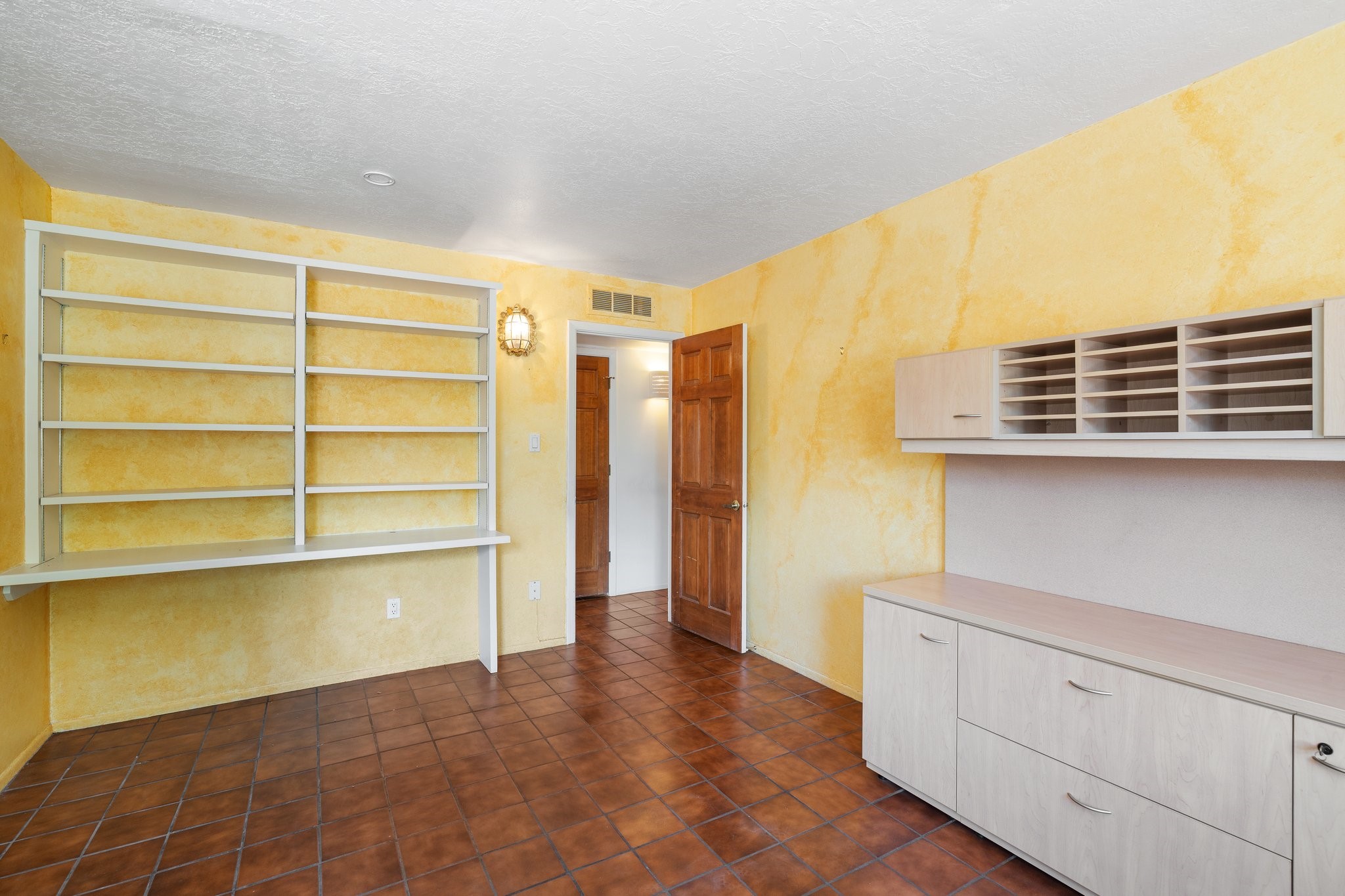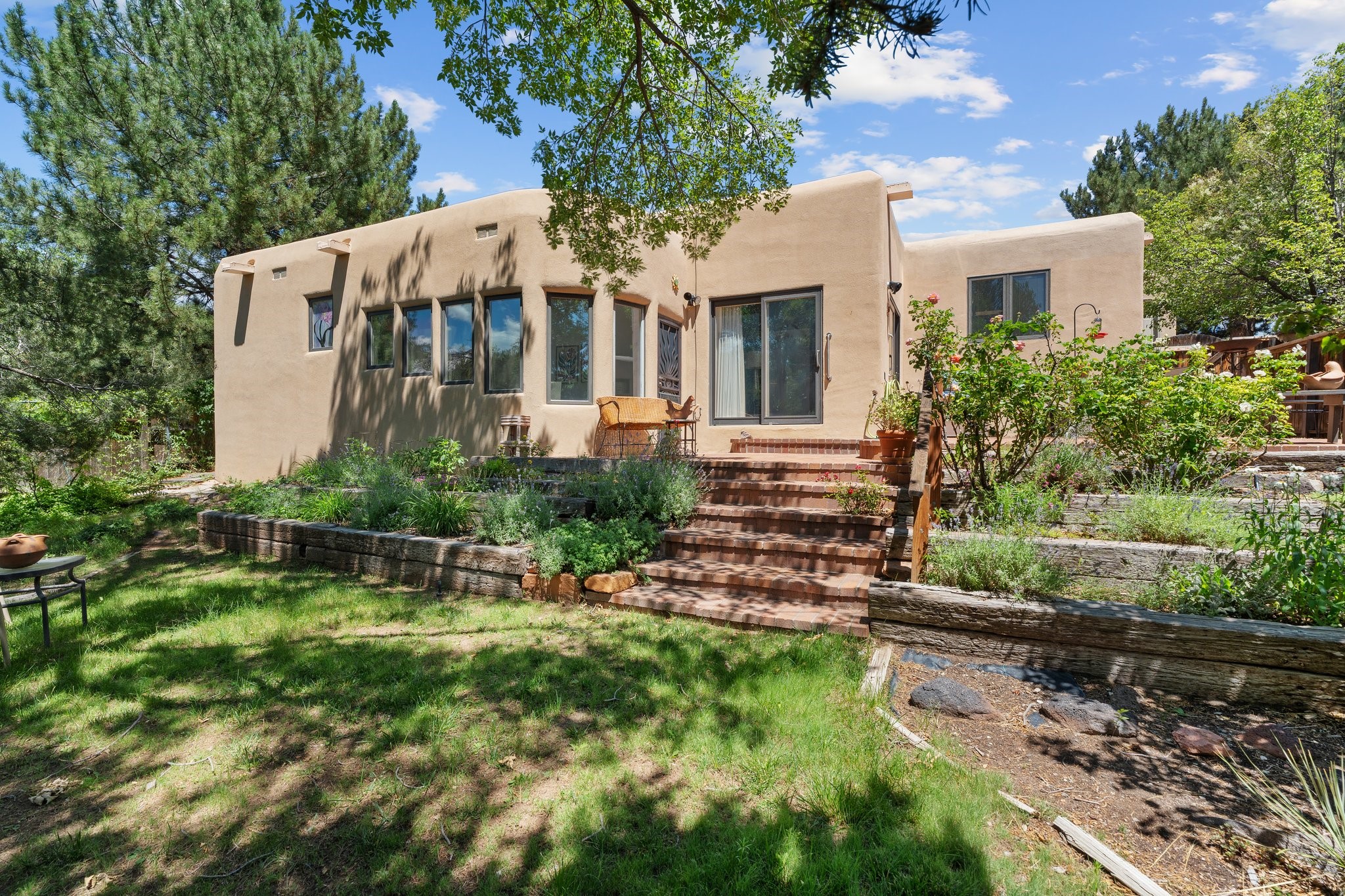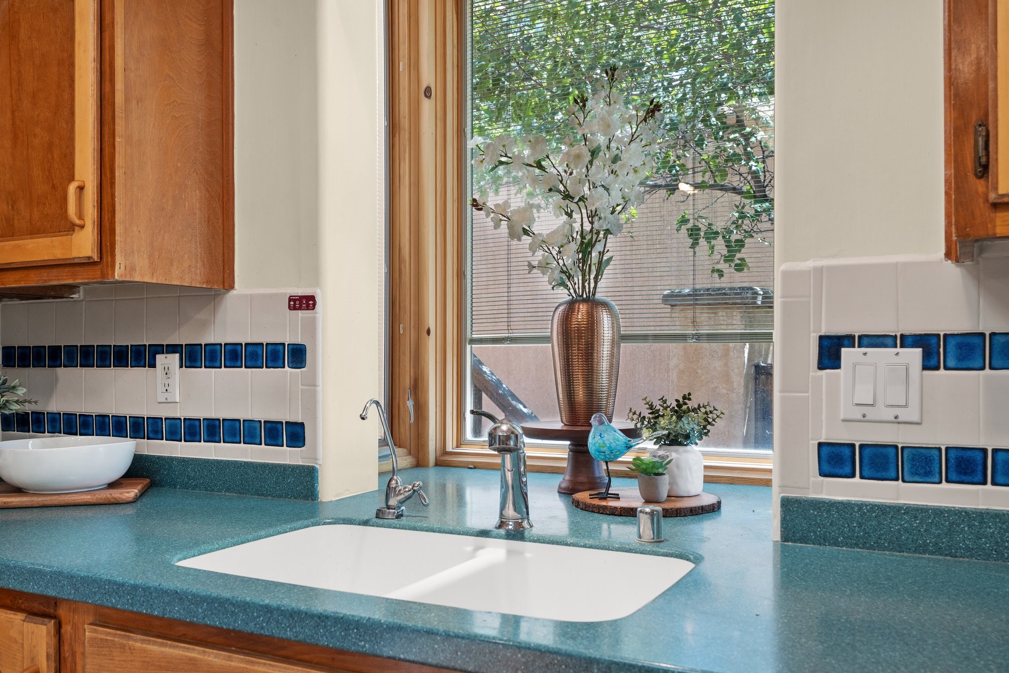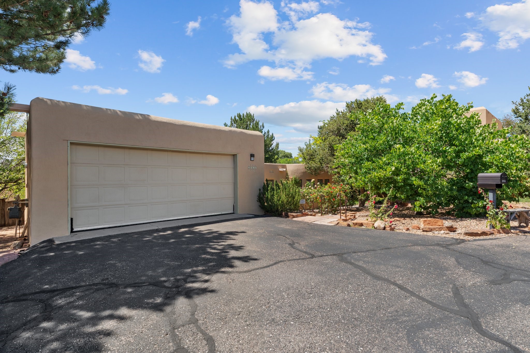 One-of-a-kind custom residence blends timeless Southwestern charm, thoughtful design, and modern comfort. Curved walls and abundant windows bathe every room in natural light, spotlighting fine craftsmanship.The expansive living room showcases a high tongue-and-groove beamed ceiling, dramatic corner kiva fireplace with a built-in banco, rich wood floors, built-in shelving, graceful china cabinet, and sliding doors to a private brick patio and beautifully terraced garden for seamless indoor-outdoor living. A built-in banco at one end of the living room creates an inviting nook for intimate conversation or peaceful reading.The chef-friendly kitchen offers sleek Corian countertops, newer appliances, classic tile floors, and an adjacent dining area that makes entertaining stylish and easy.Three versatile bedrooms provide comfort and flexibility: one is fitted as a home office with built-in shelving and counters; the spacious second bedroom boasts a gracefully rounded front wall framed by four large windows, two closets, and luxury vinyl flooring--ideal for guests or family.The private primary suite is a true sanctuary with its own corner kiva fireplace beneath a skylight, generous closets, and a spa-style bath with dual sinks and a sunken tub. French doors lead to a light-filled sunroom with cedar-lined closet; the sunroom opens onto the serene patio and terraced garden.Additional highlights include a large laundry room with extensive cabinetry, decorative glass block and skylight, plus an oversized two-car garage with abundant shelving for storage. Three rose bushes grace the front yard, adding a burst of color and charm.Not just a place to live--this residence is a work of art crafted for comfort, beauty, and inspired living. Come experience its magic for yourself.Park Plazas is a centrally located neighborhood with miles of walking trails, an off-leash dog park, tennis and pickle ball courts a community garden and much more.