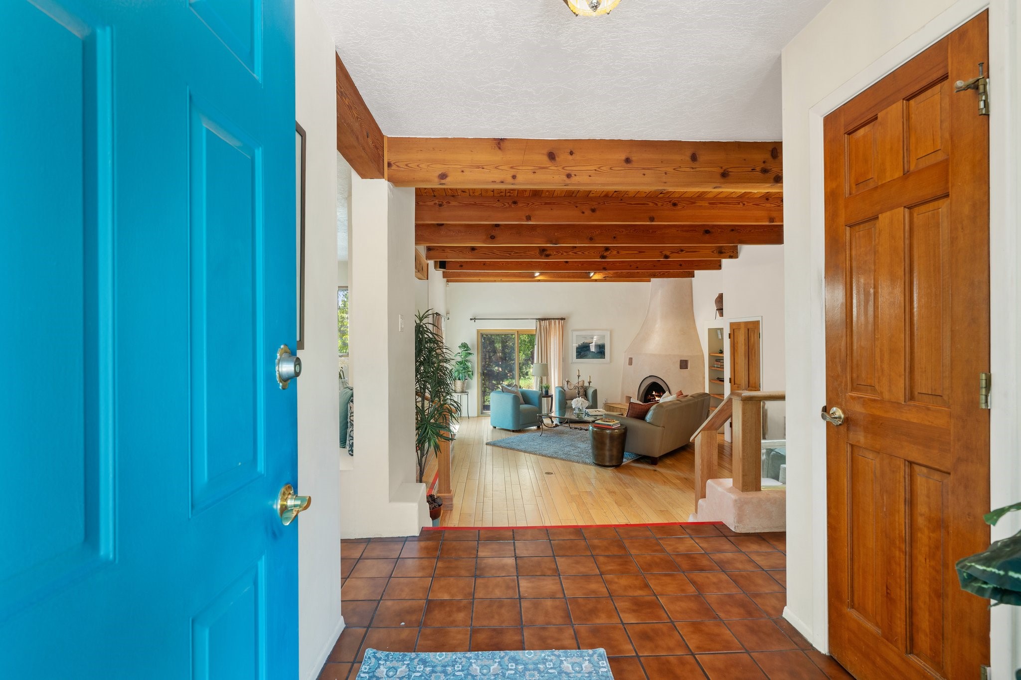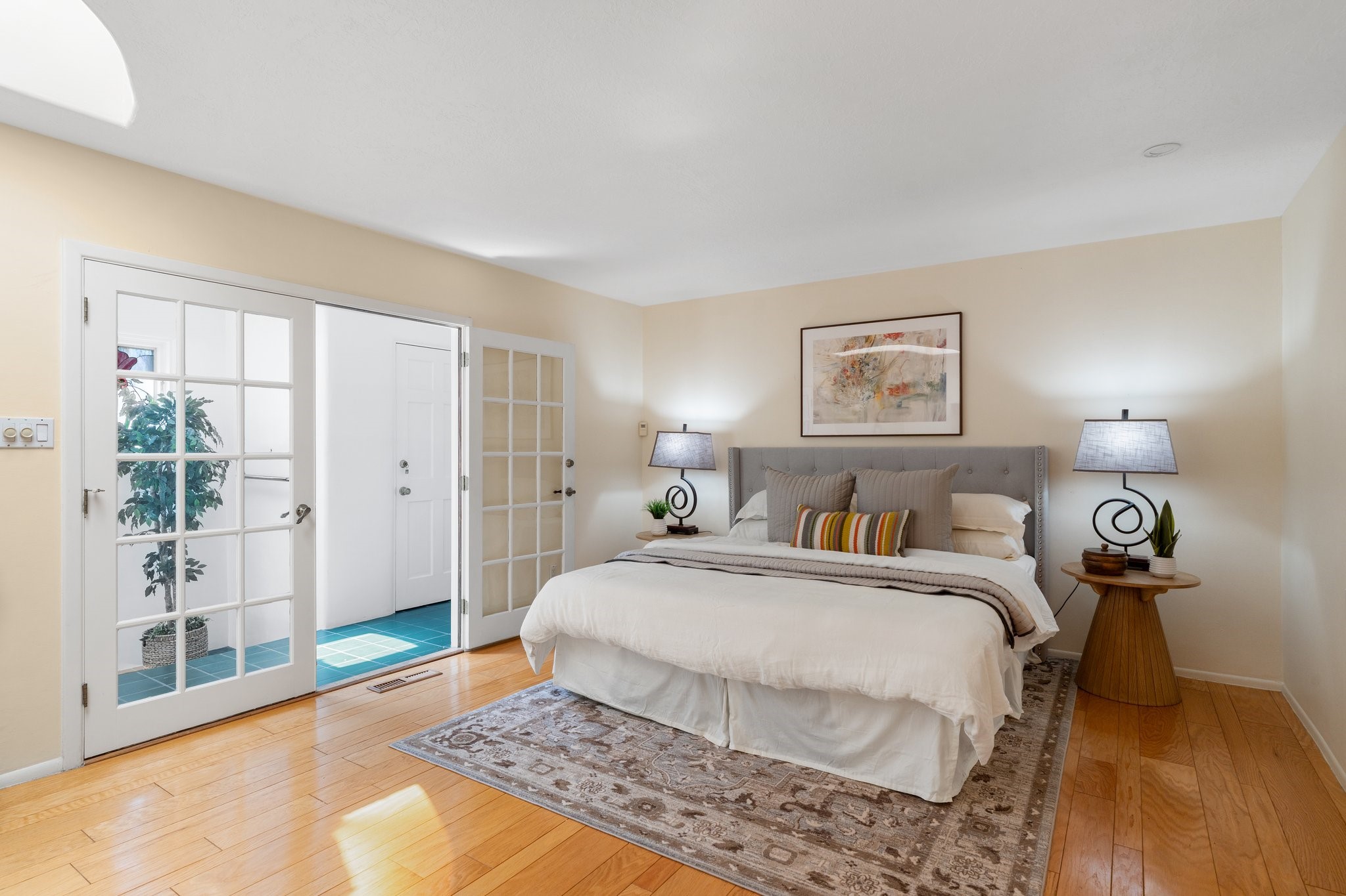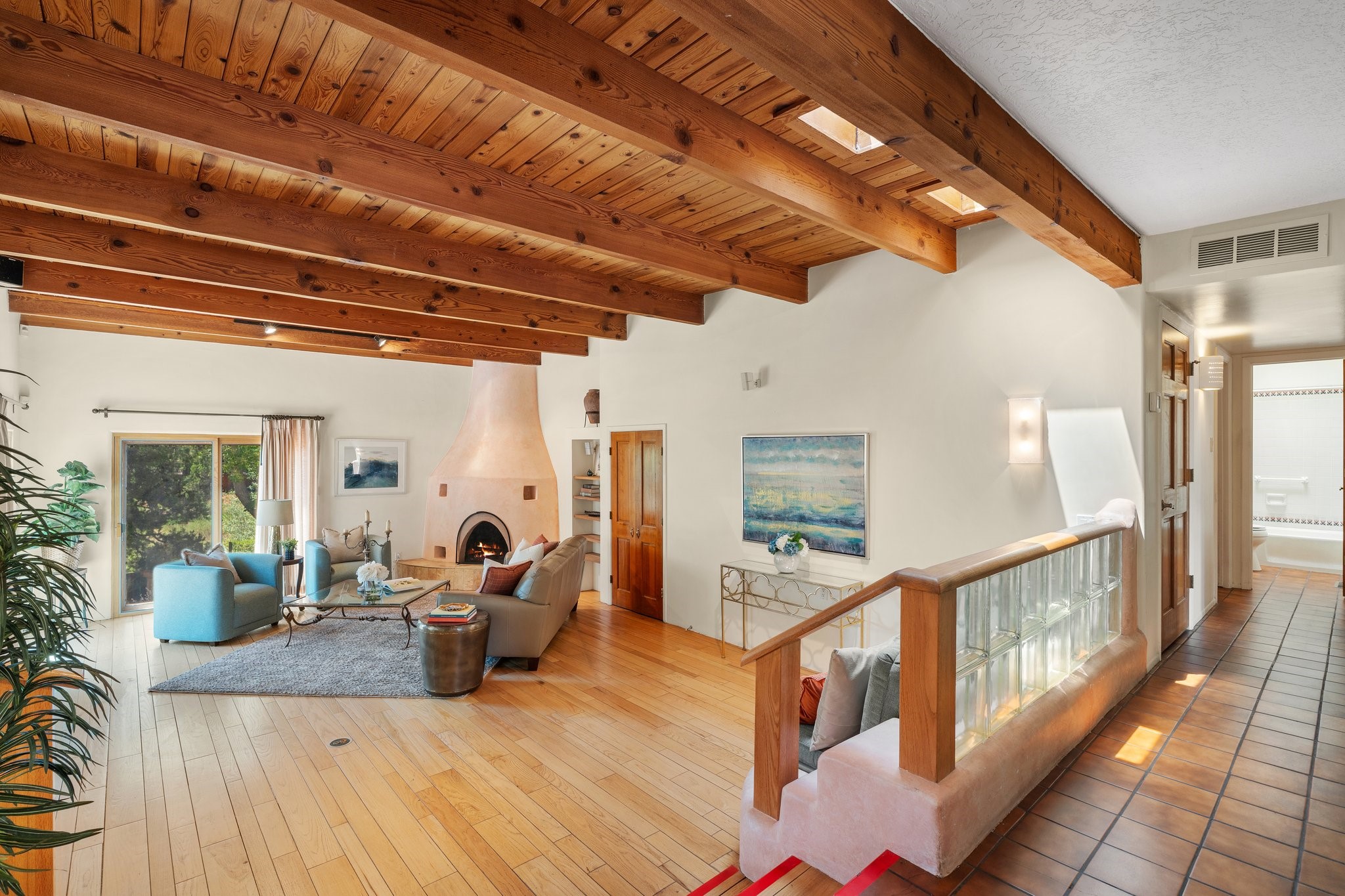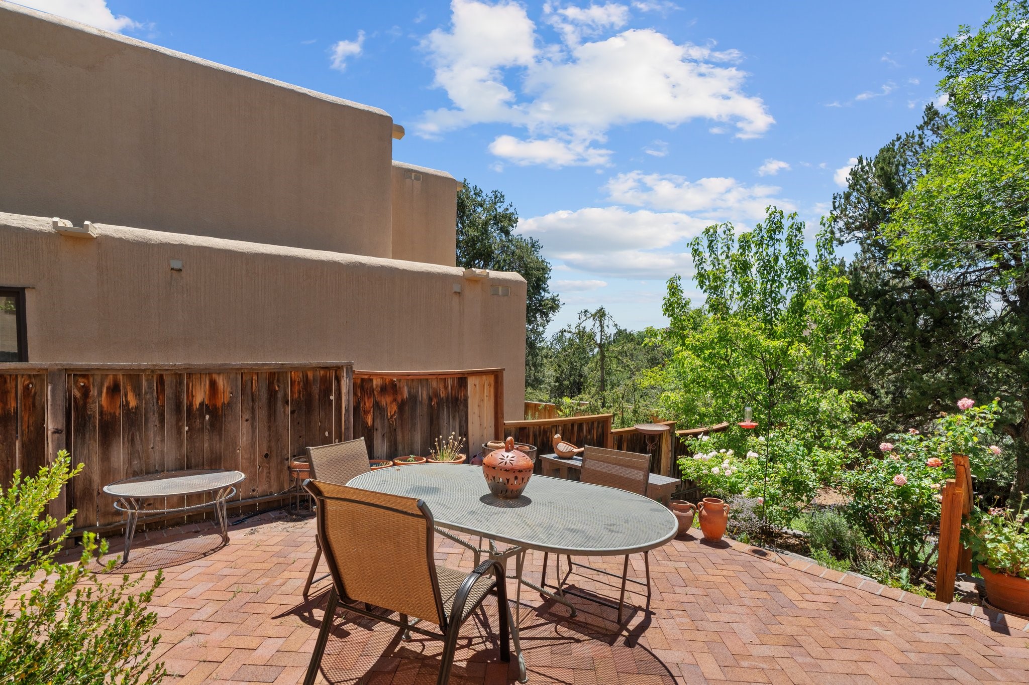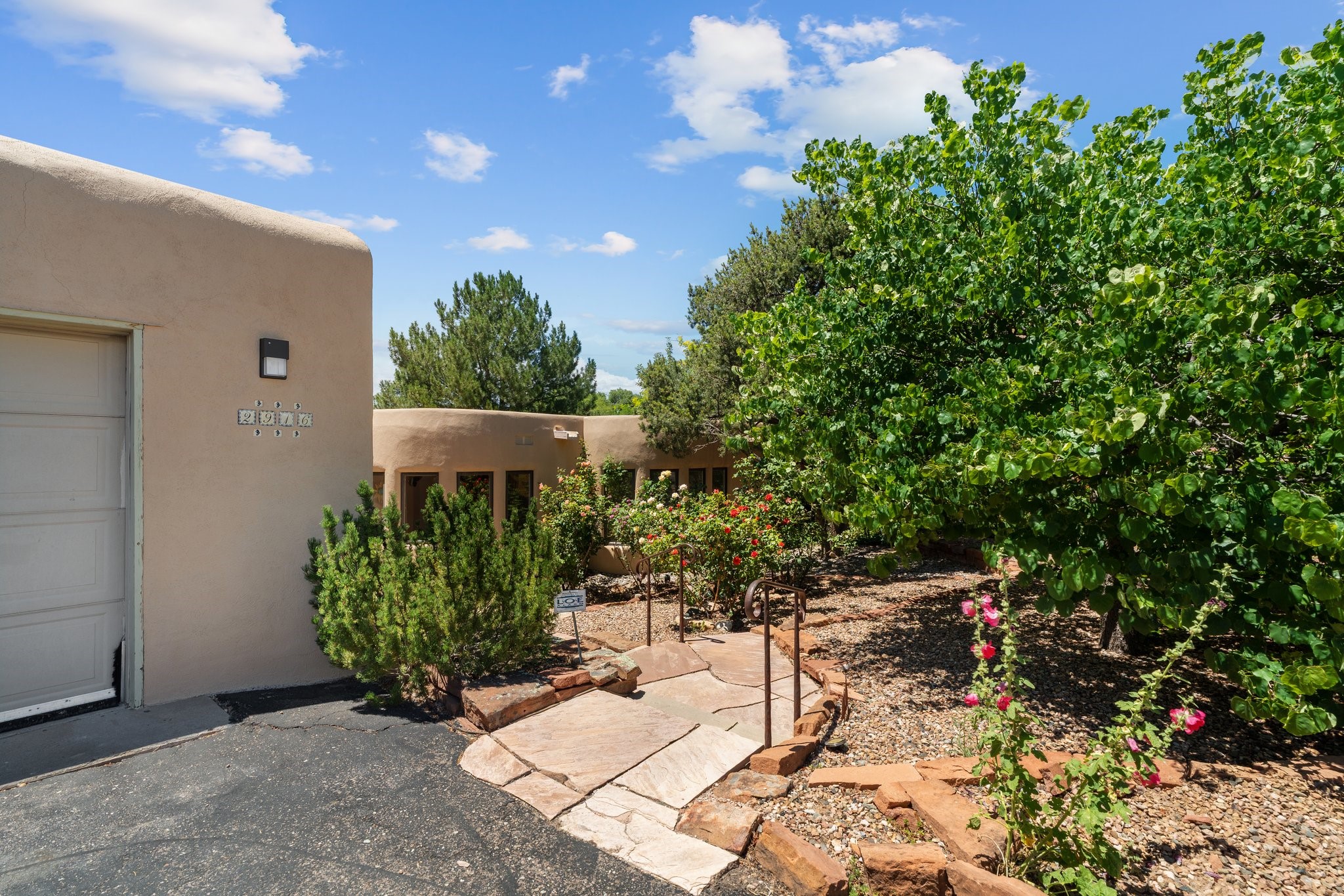 One-of-a-kind custom residence blends timeless Southwestern charm, thoughtful design, and modern comfort. Curved walls and abundant windows bathe every room in natural light, spotlighting fine craftsmanship.The expansive living room showcases a high tongue-and-groove beamed ceiling, dramatic corner kiva fireplace with a built-in banco, rich wood floors, built-in shelving, graceful china cabinet, and sliding doors to a private brick patio and beautifully terraced garden for seamless indoor-outdoor living. A built-in banco at one end of the living room creates an inviting nook for intimate conversation or peaceful reading.The chef-friendly kitchen offers sleek Corian countertops, newer appliances, classic tile floors, and an adjacent dining area that makes entertaining stylish and easy.Three versatile bedrooms provide comfort and flexibility: one is fitted as a home office with built-in shelving and counters; the spacious second bedroom boasts a gracefully rounded front wall framed by four large windows, two closets, and luxury vinyl flooring--ideal for guests or family.The private primary suite is a true sanctuary with its own corner kiva fireplace beneath a skylight, generous closets, and a spa-style bath with dual sinks and a sunken tub. French doors lead to a light-filled sunroom with cedar-lined closet; the sunroom opens onto the serene patio and terraced garden.Additional highlights include a large laundry room with extensive cabinetry, decorative glass block and skylight, plus an oversized two-car garage with abundant shelving for storage. Three rose bushes grace the front yard, adding a burst of color and charm.Not just a place to live--this residence is a work of art crafted for comfort, beauty, and inspired living. Come experience its magic for yourself.Park Plazas is a centrally located neighborhood with miles of walking trails, an off-leash dog park, tennis and pickle ball courts a community garden and much more.